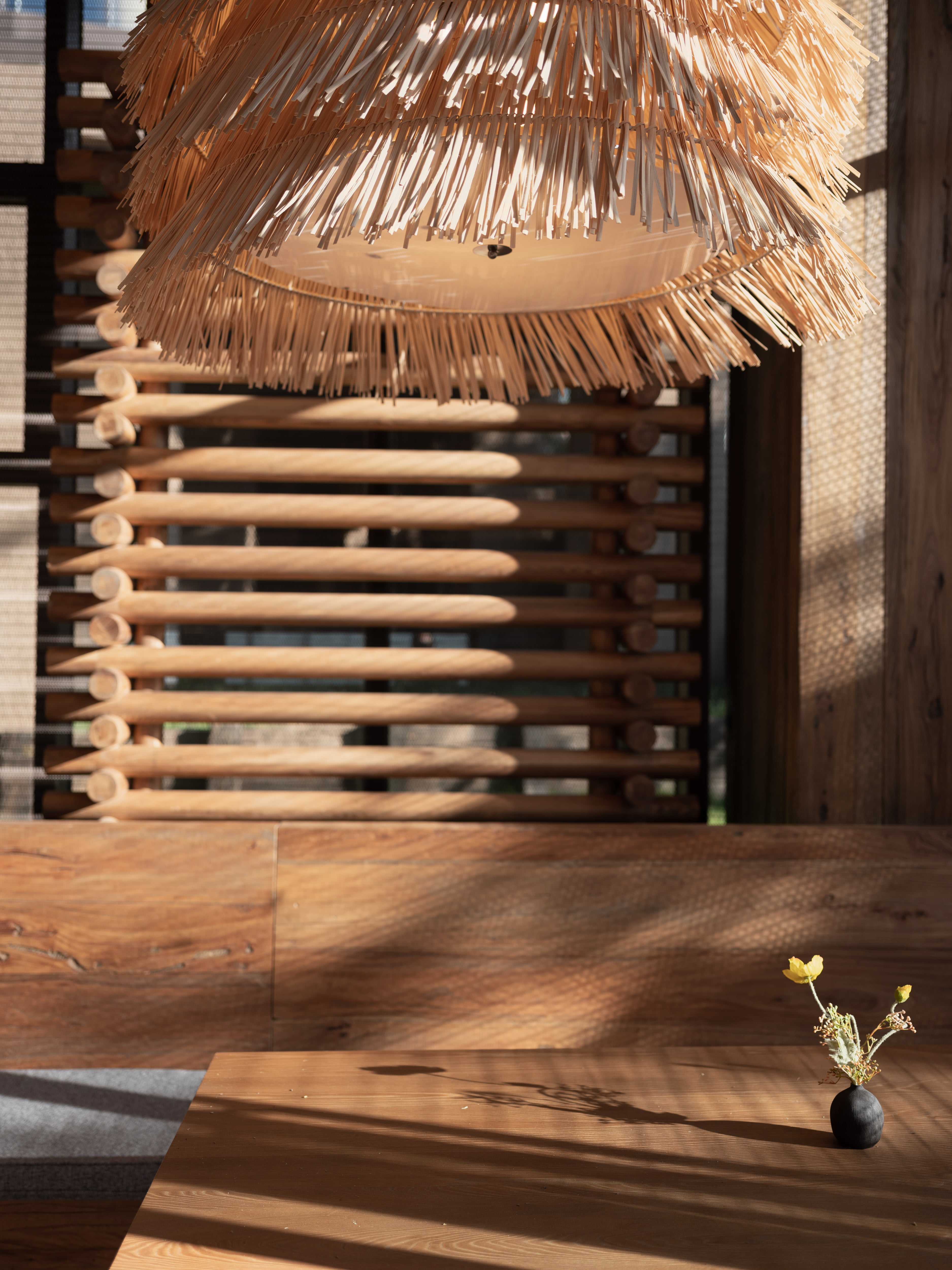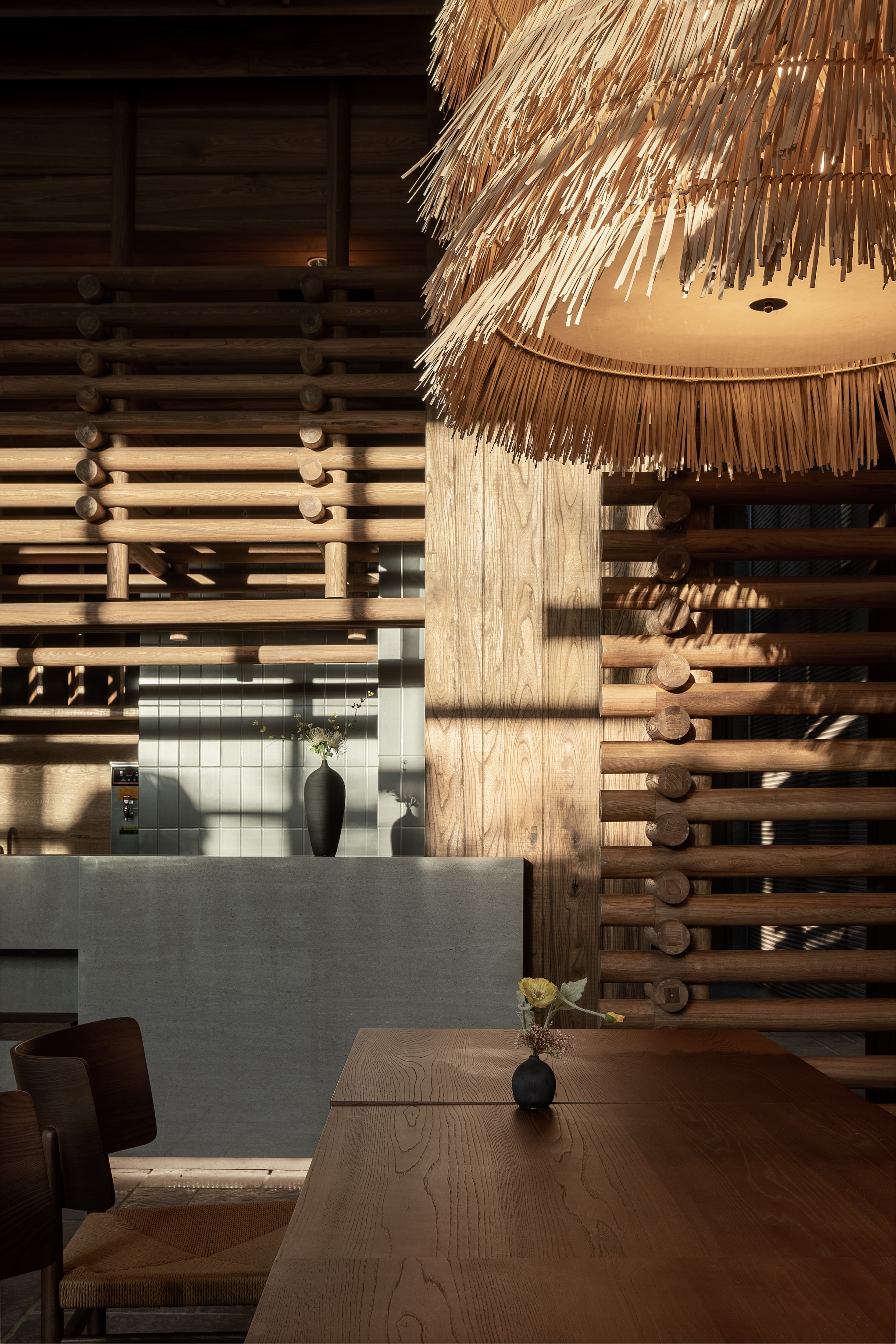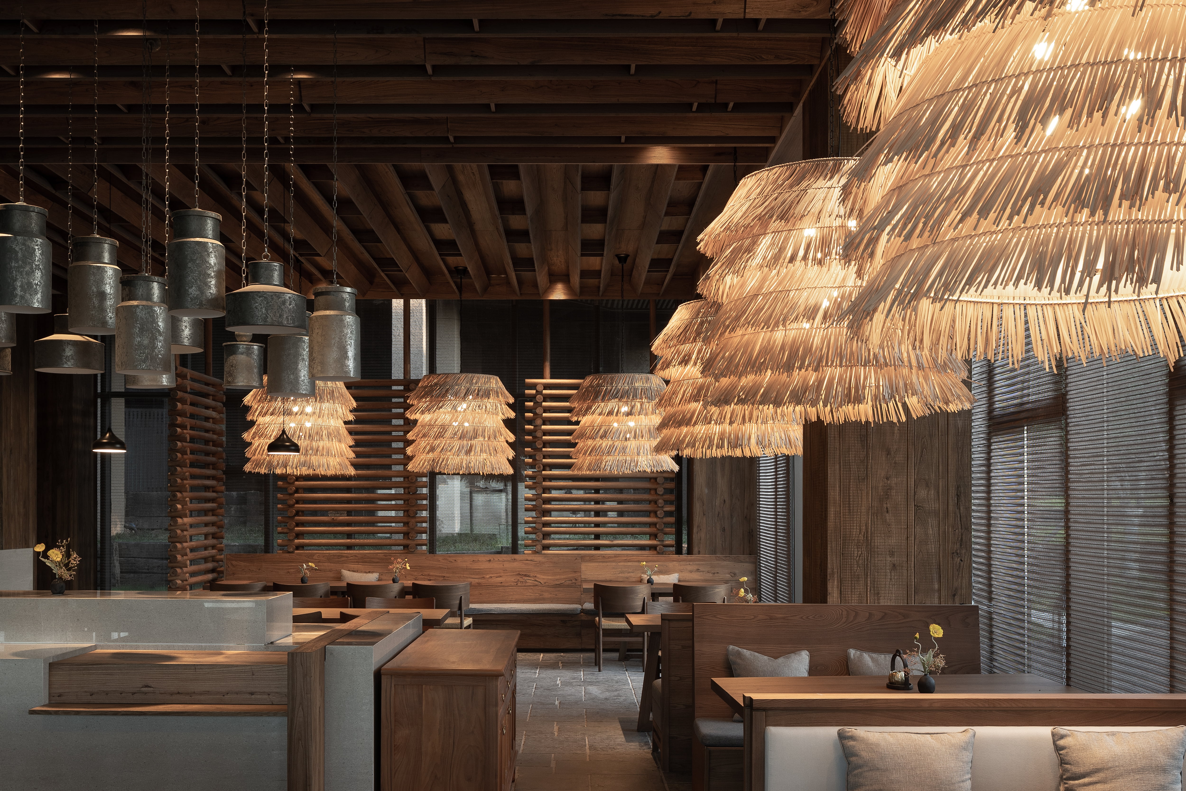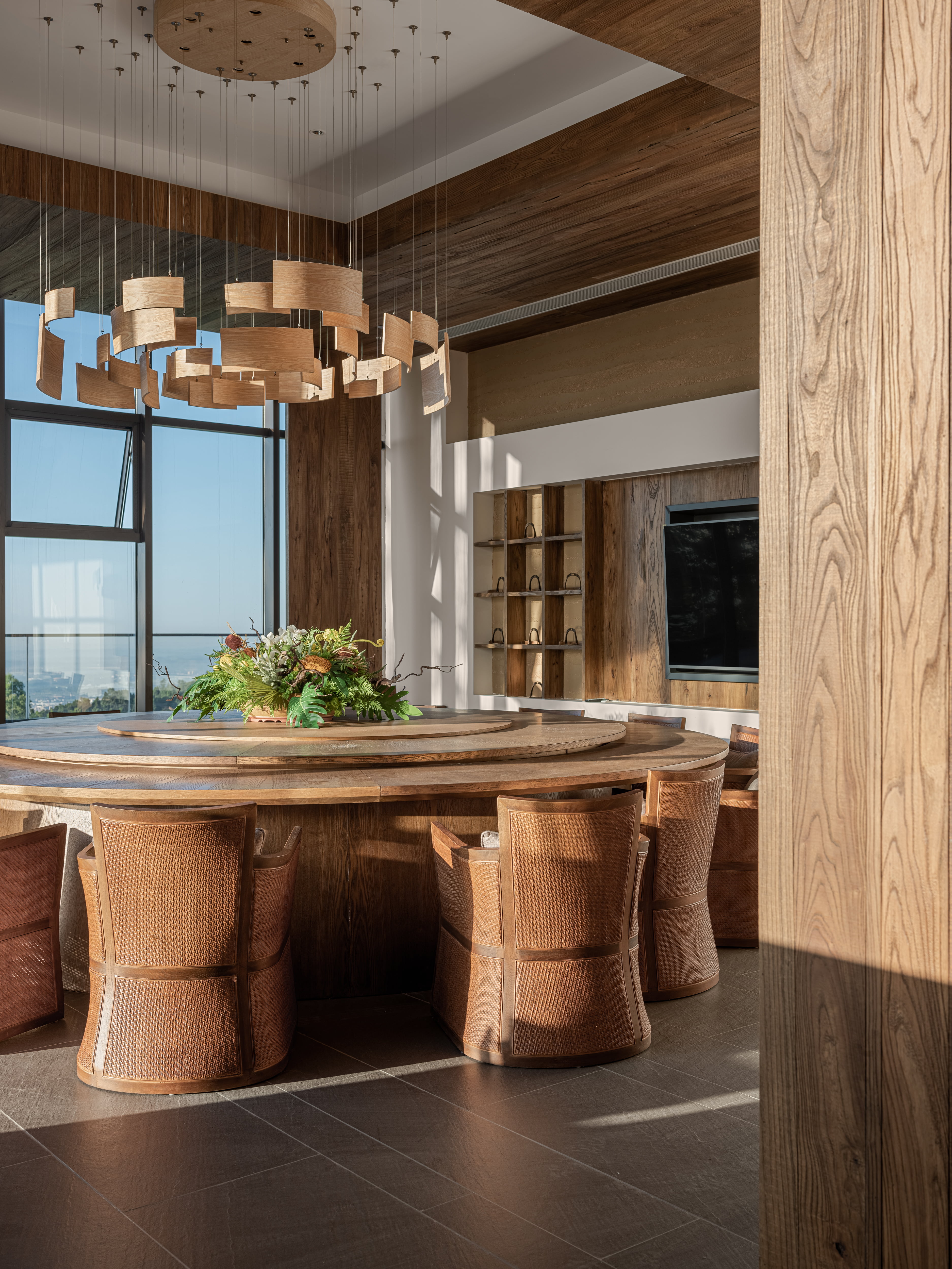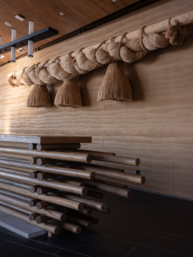 空间布局:“笙美木屋”采用双层菱形结构,大堂则延续了度假殿堂的打开方式与木门的本质呼应,为了更贴近自然,融合了石材、瓦片、藤编等天然材质