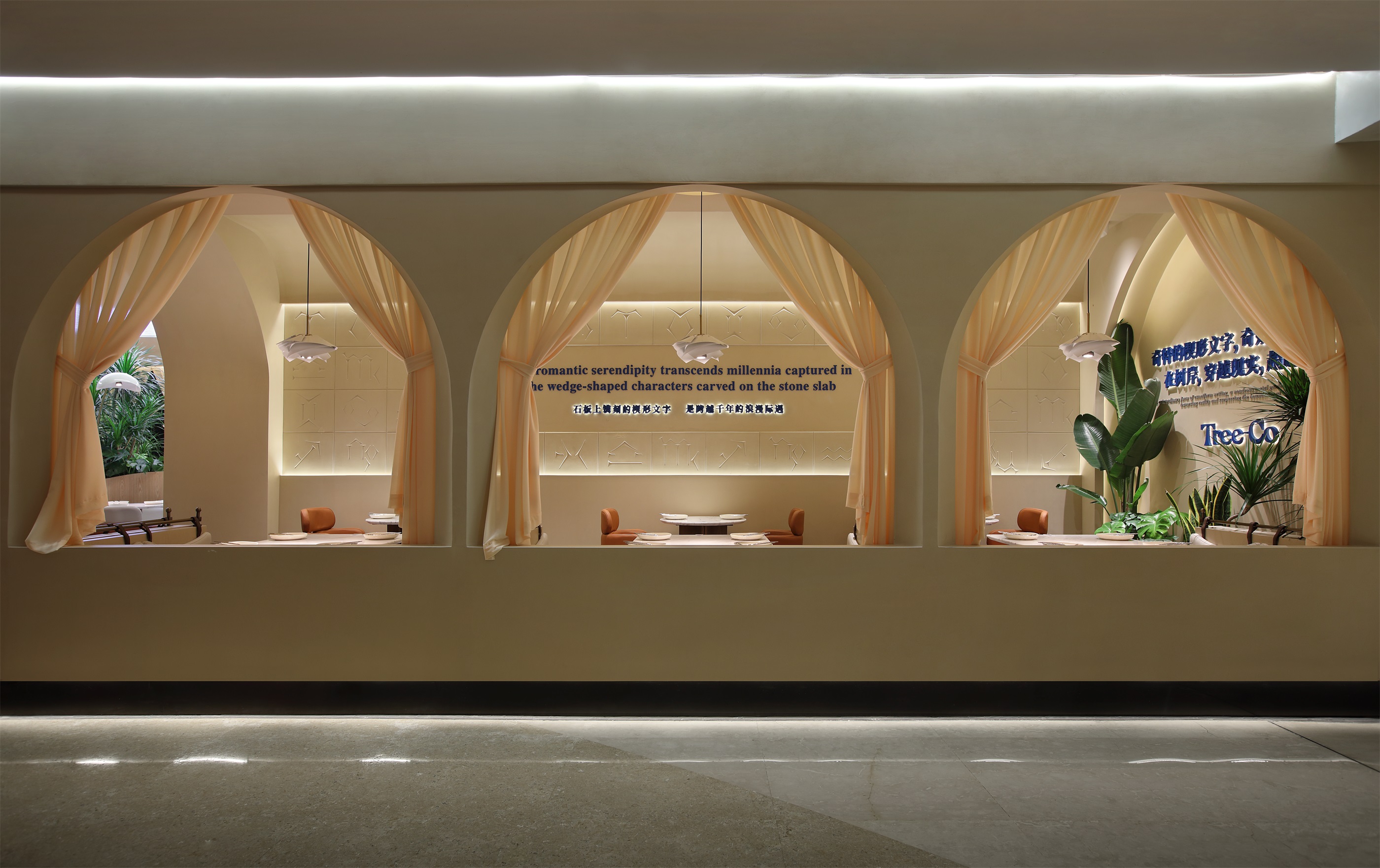 选用肌理漆、木饰面,整体散发出复古、质朴的独特气质,穿插棕榈树及楔形文字做纹样点缀,旨在反映巴比伦充满艺术的城市景观。