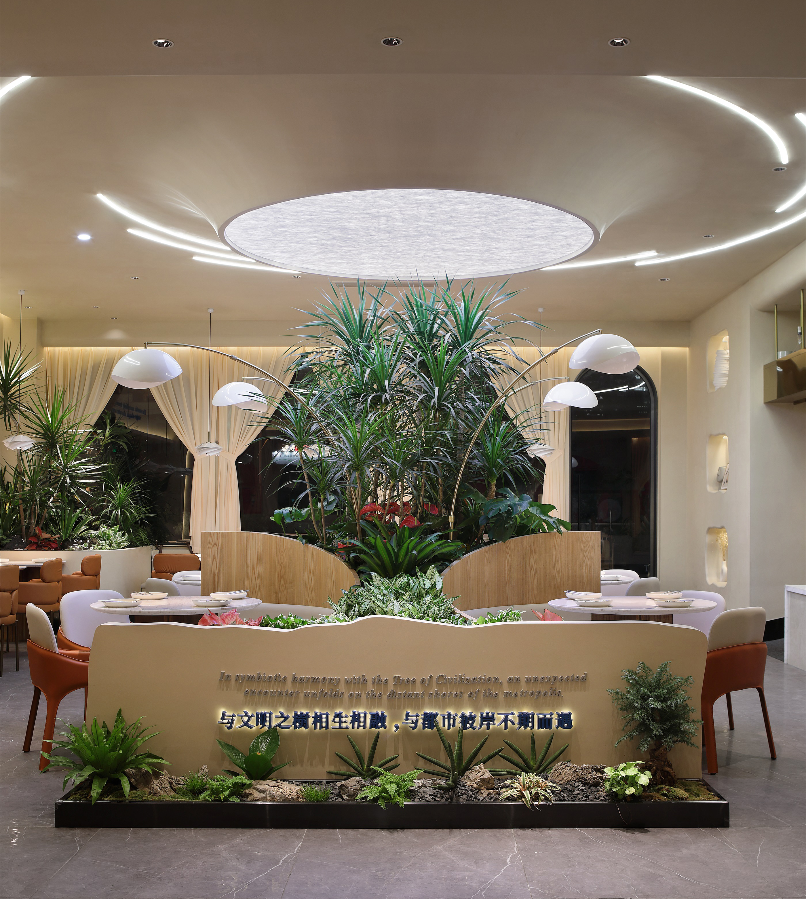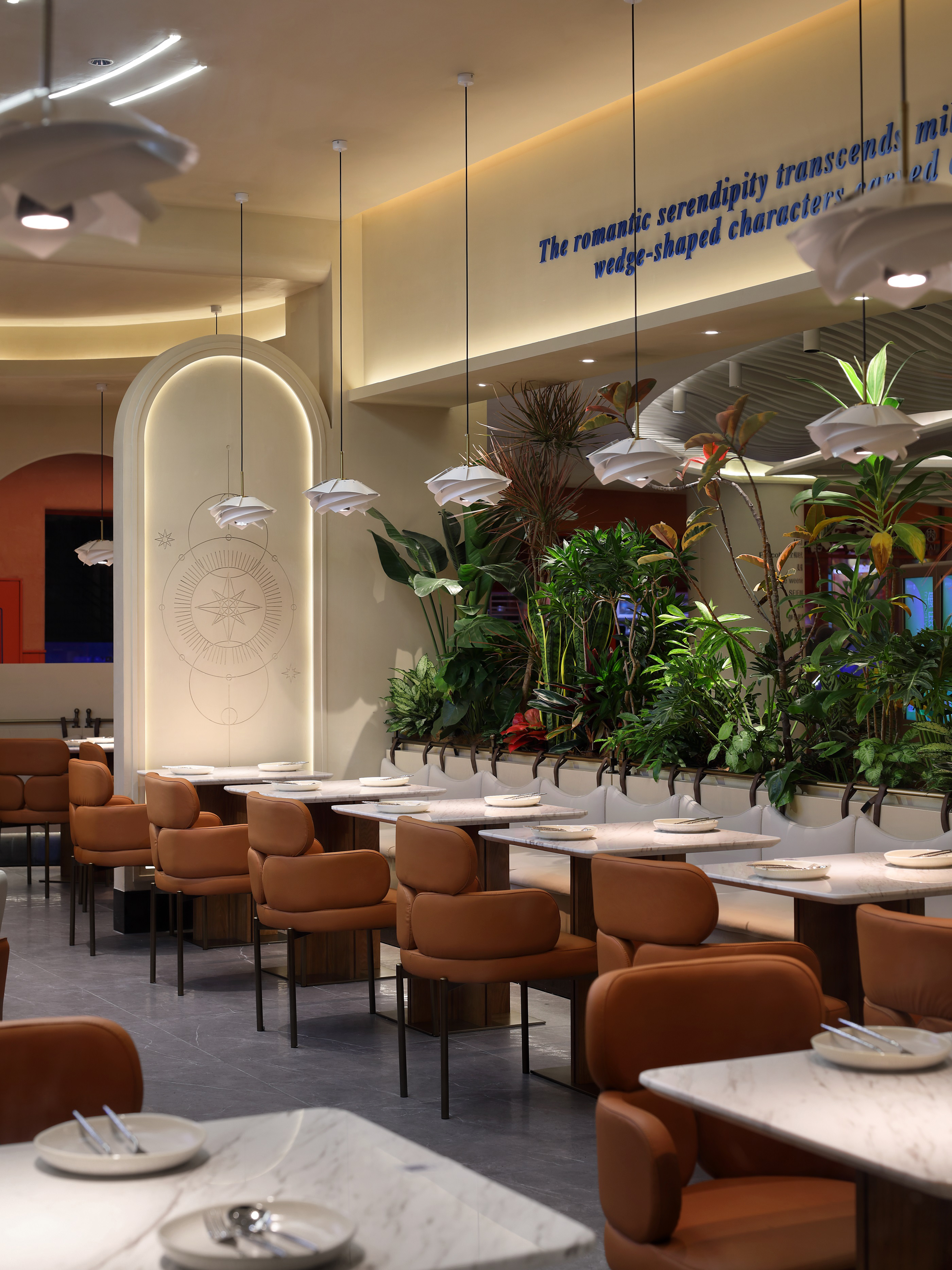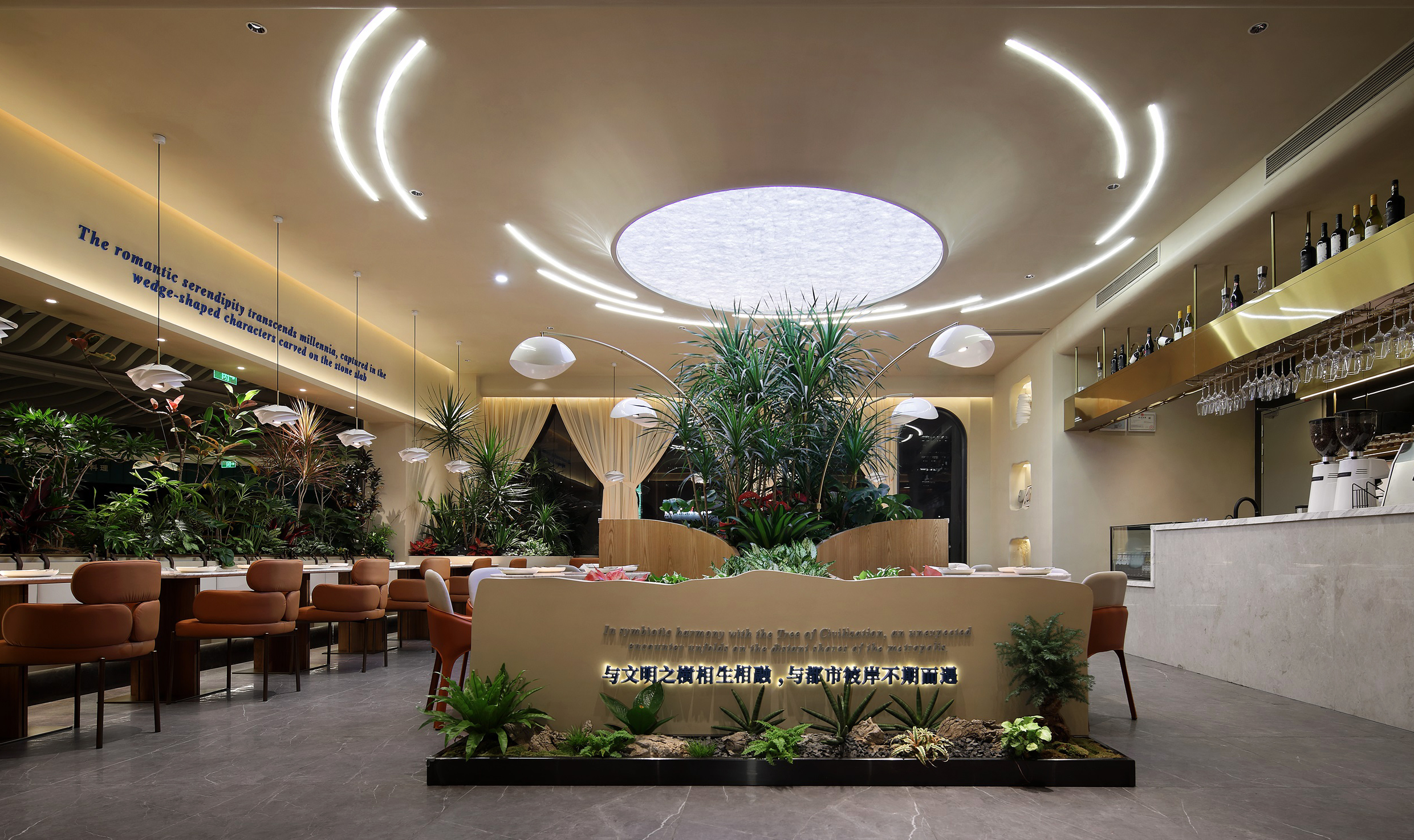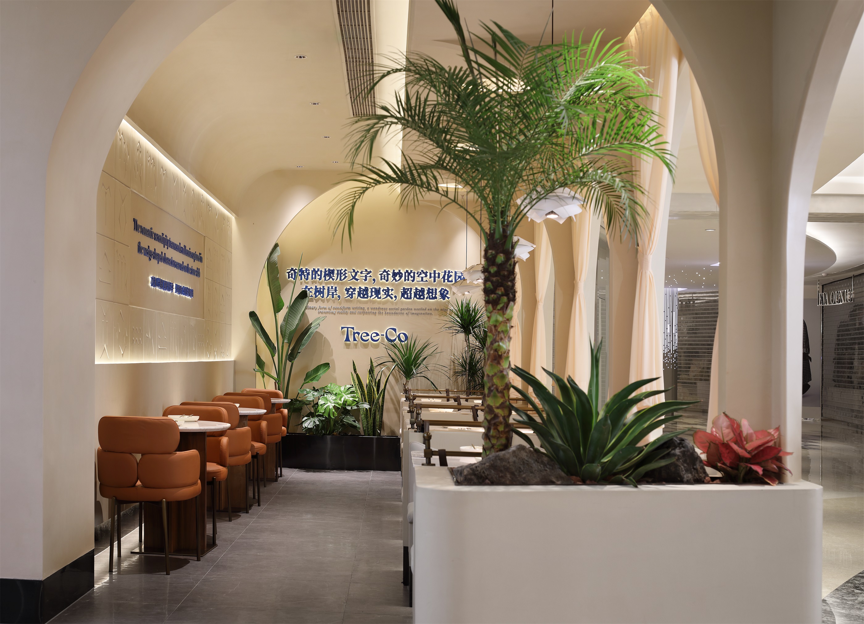 为了更契合樹岸“全时段休闲餐吧”的定位,以及满足消费者对于“樹岸”的一切想象,花万里设计团队有机结合了新巴比伦主题与各种优雅奢华的装饰,打造一场视觉和食欲的盛宴,让都市人拥抱一场“从都市逃离,做一天巴比伦人”的奇妙之旅。