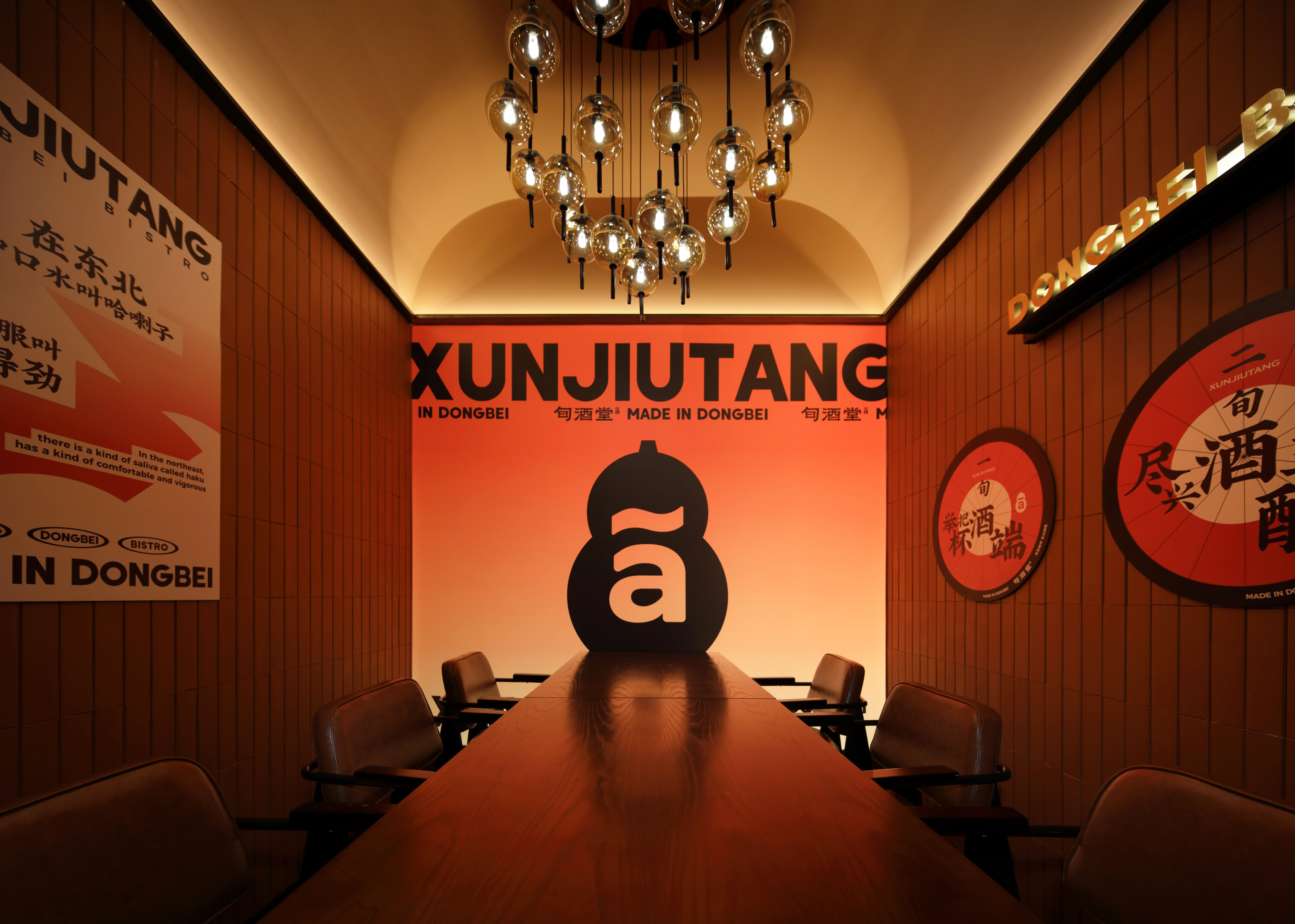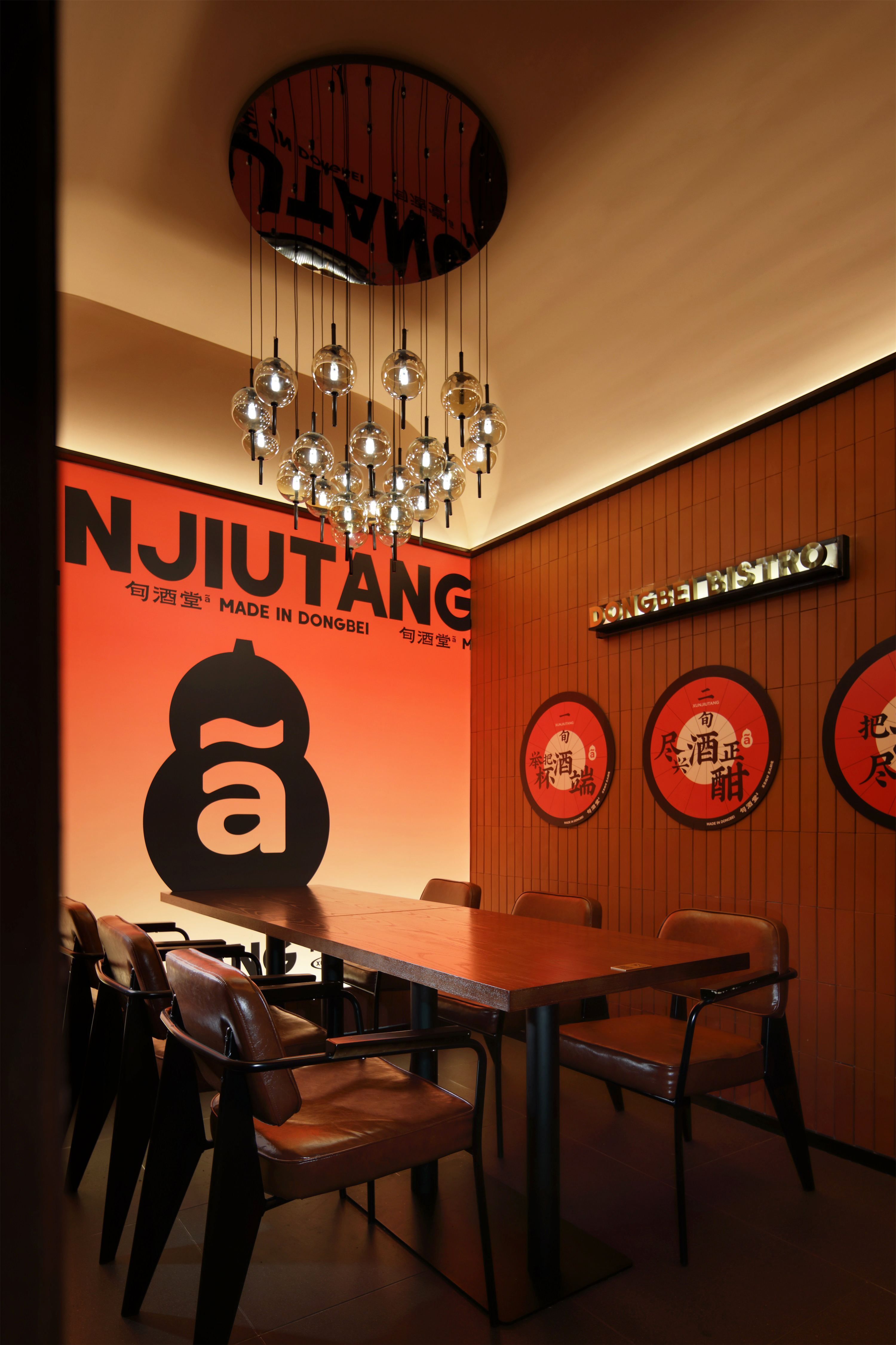 空间意境:旬酒堂的空间场景创新之处在于将现代元素与东北传统风情融为一体。现代的家具、灯具和装饰品与东北的朴实、自然的元素相结合,创造出一种独特而具有鲜明地域特色的环境风格。以暖色的红色为主色调,搭配有质感且厚重的做旧木料,细节上以雪花、大花布元素作为点缀,各元素巧妙结合运用,实现了现代、新潮与中国东北特色的碰撞。旨在打造一处舒适温馨、热闹又有格调的空间环境,让所有人在这方天地里,欢聚一堂,从陌生到熟悉,畅聊生活。