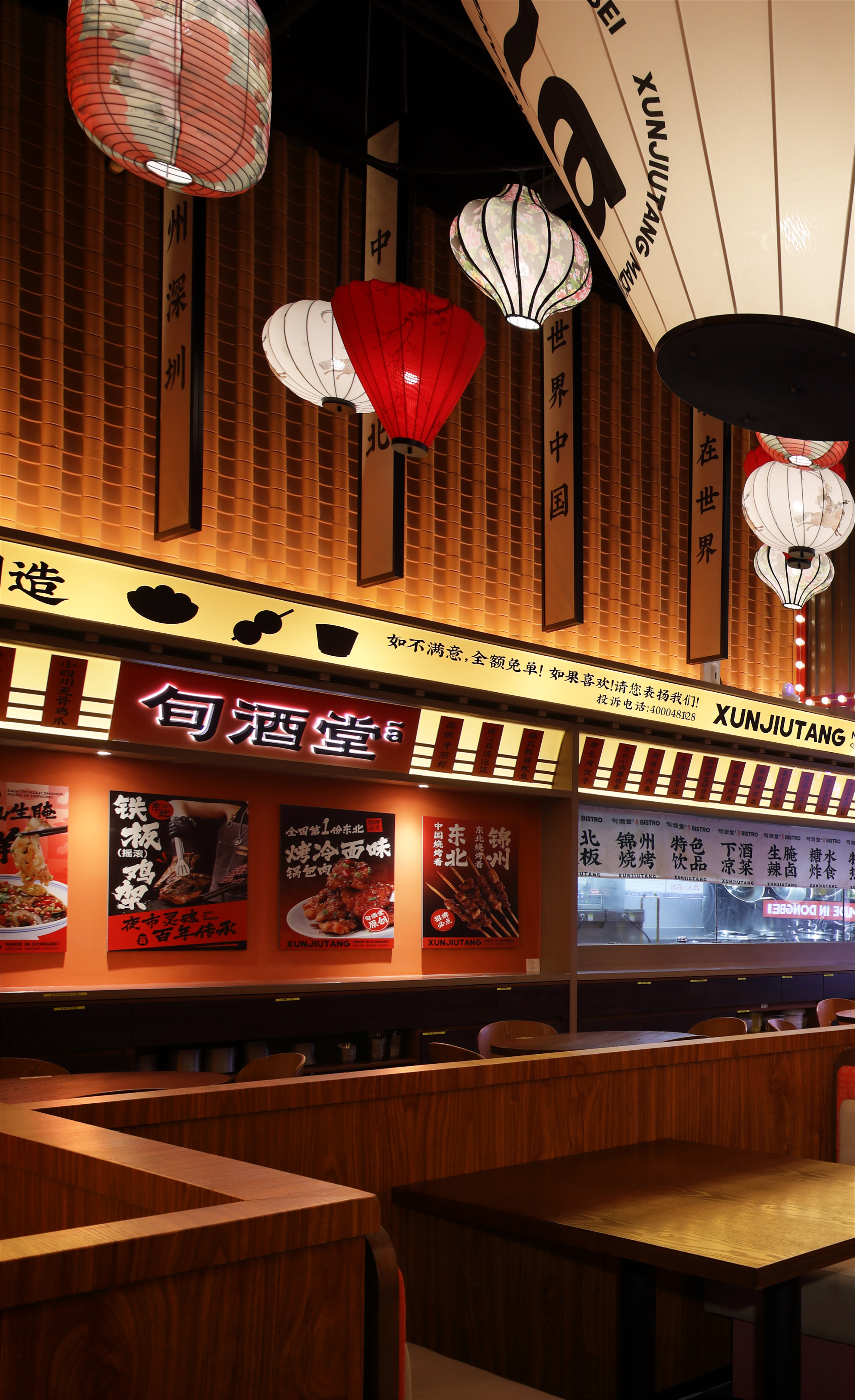 用户体验:从南到北,从锦州到深圳,跨越2000多公里的距离,不走寻常路的旬酒堂把东北特色餐饮、特色文化和锦州烧烤带到了深圳。旬酒堂自投入使用以来,成为了深受顾客喜爱的餐饮场所。其独特的设计理念和空间布局创新为用户带来了极致的用餐体验。文化交融的情感体验:用户对于旬酒堂将现代与传统、文化与设计相融合的设计理念反响强烈。装饰艺术墙、以及主题装饰让顾客在用餐的同时沉浸于一种东北式的情感体验,让用餐不再仅仅是填饱肚子,更是一场现代东北文化之旅。