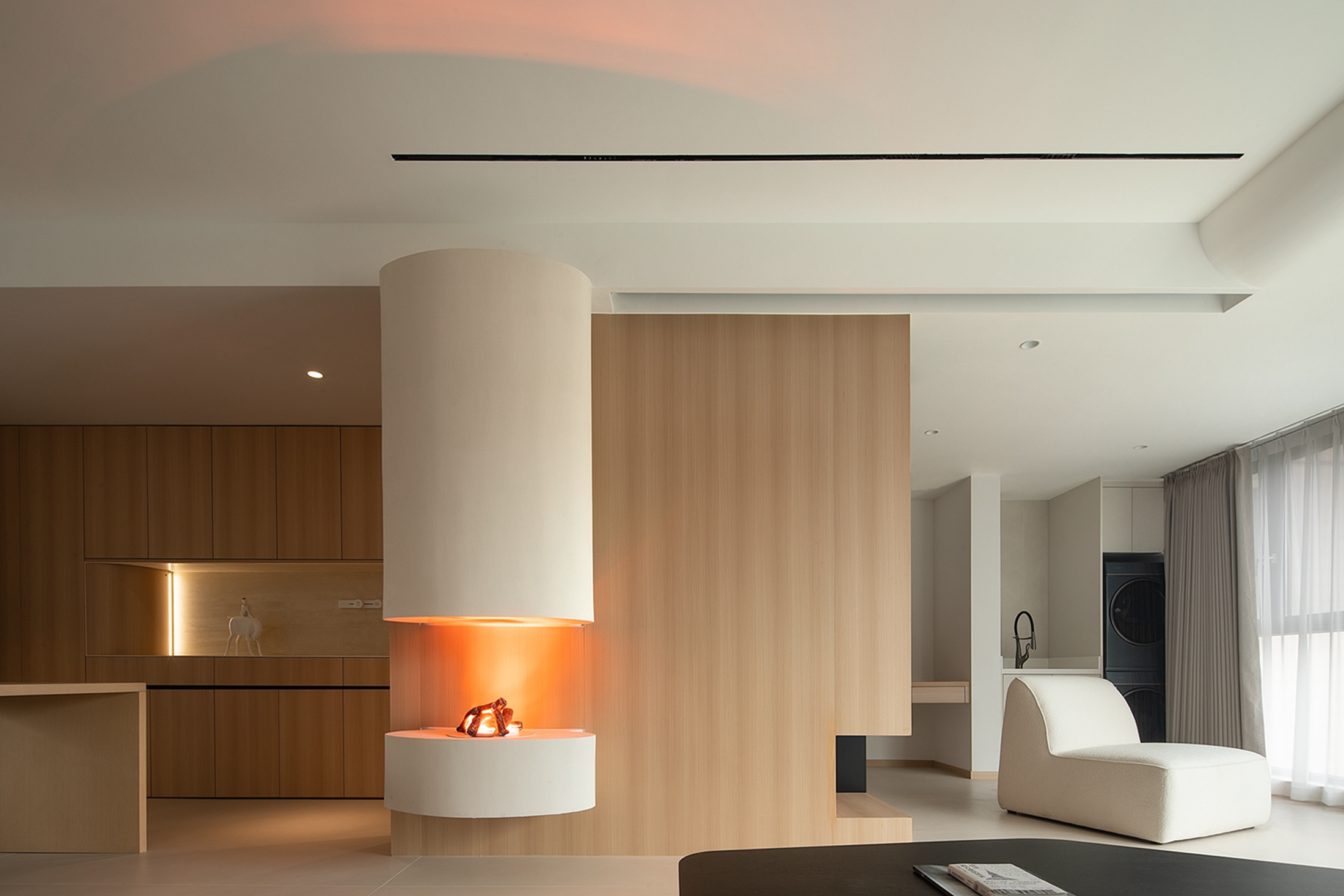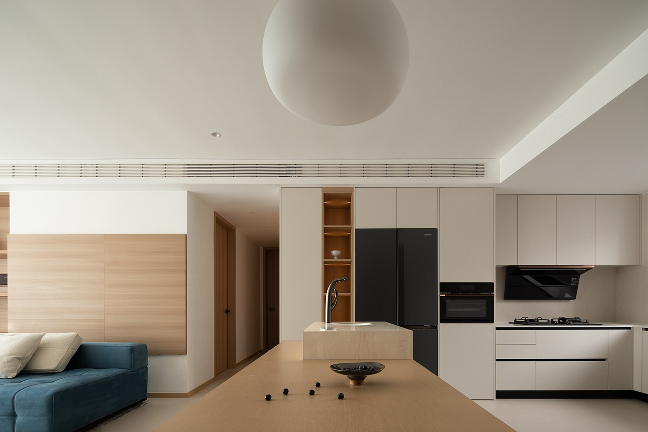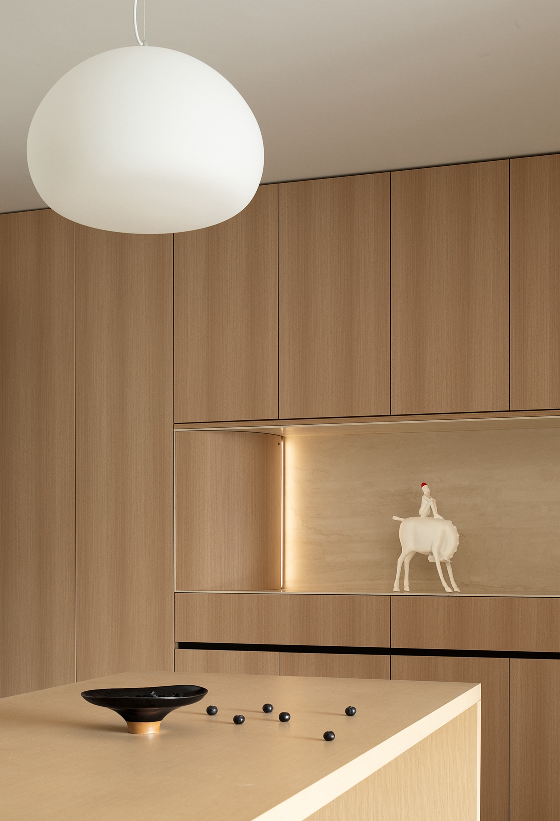 用户体验:运用原木色的中性模糊黑与白的边界,柔和的灯光低调而优雅地介入其中,在极简的空间风格里,凸显有质感的生活“痕迹”。浸润在烟火气里的厨房,有着几分寻常人家的温婉与热闹,待香气散尽,空间再次重归静谧与舒缓。