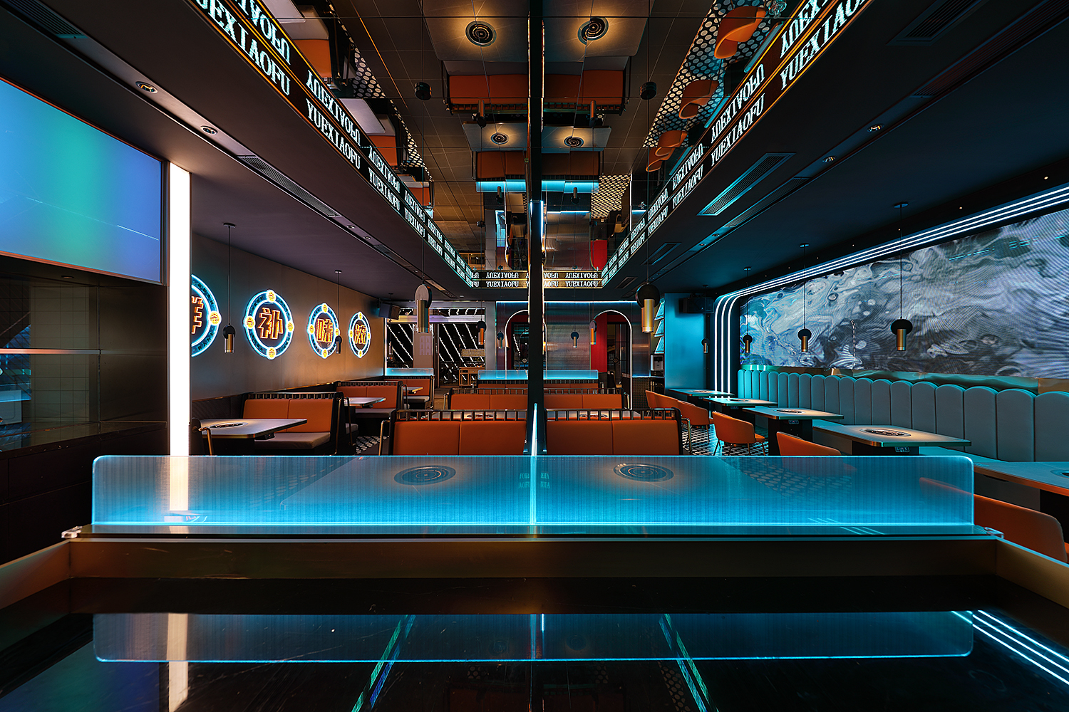 场地的局限性并没有困住设计师的思维,原有的墙面为通透的玻璃墙,为了白天也能满足完美的灯光展示,设计师将玻璃幕墙打造成主题冰屏,在灯光效果上达到双重满足。