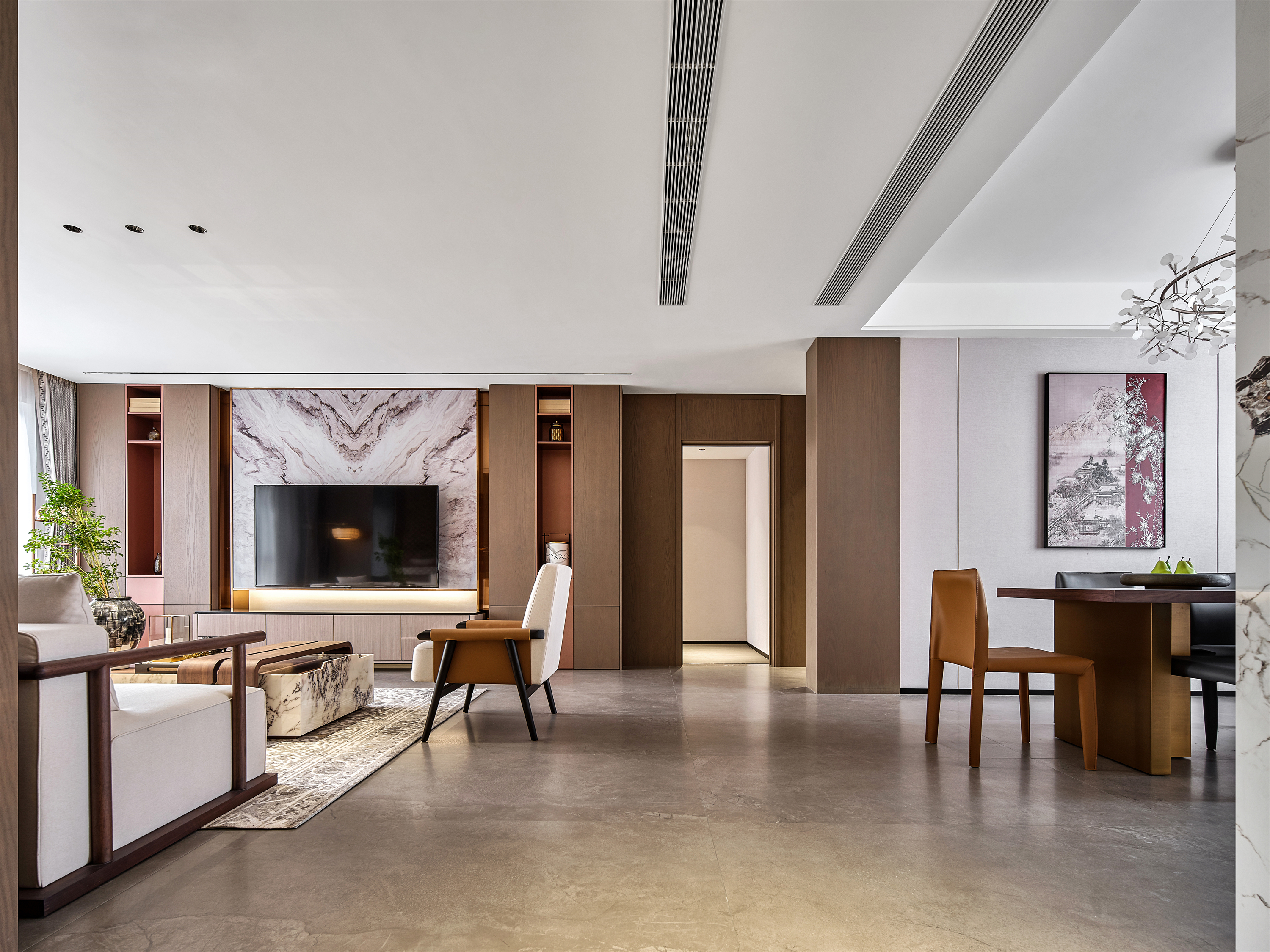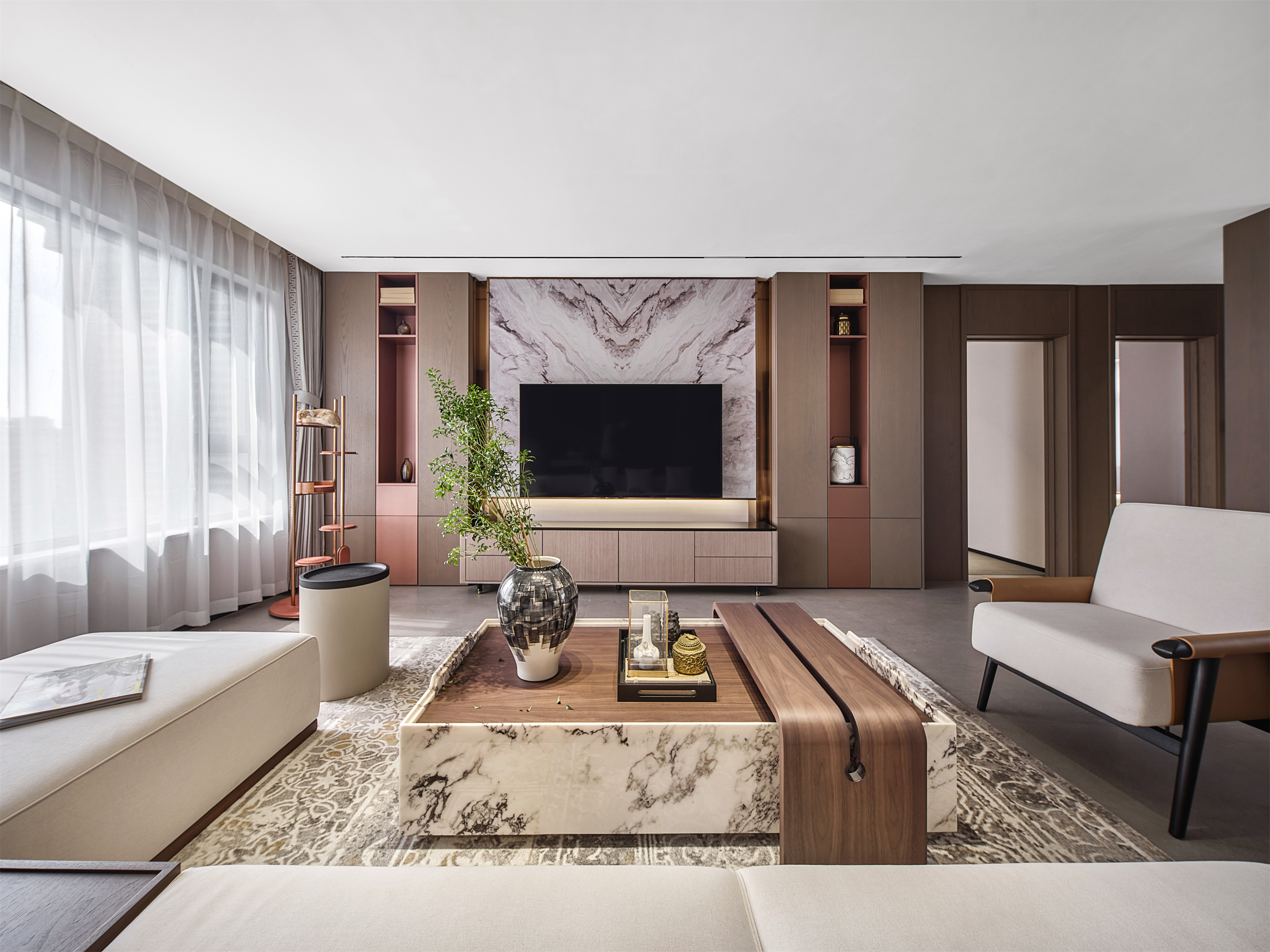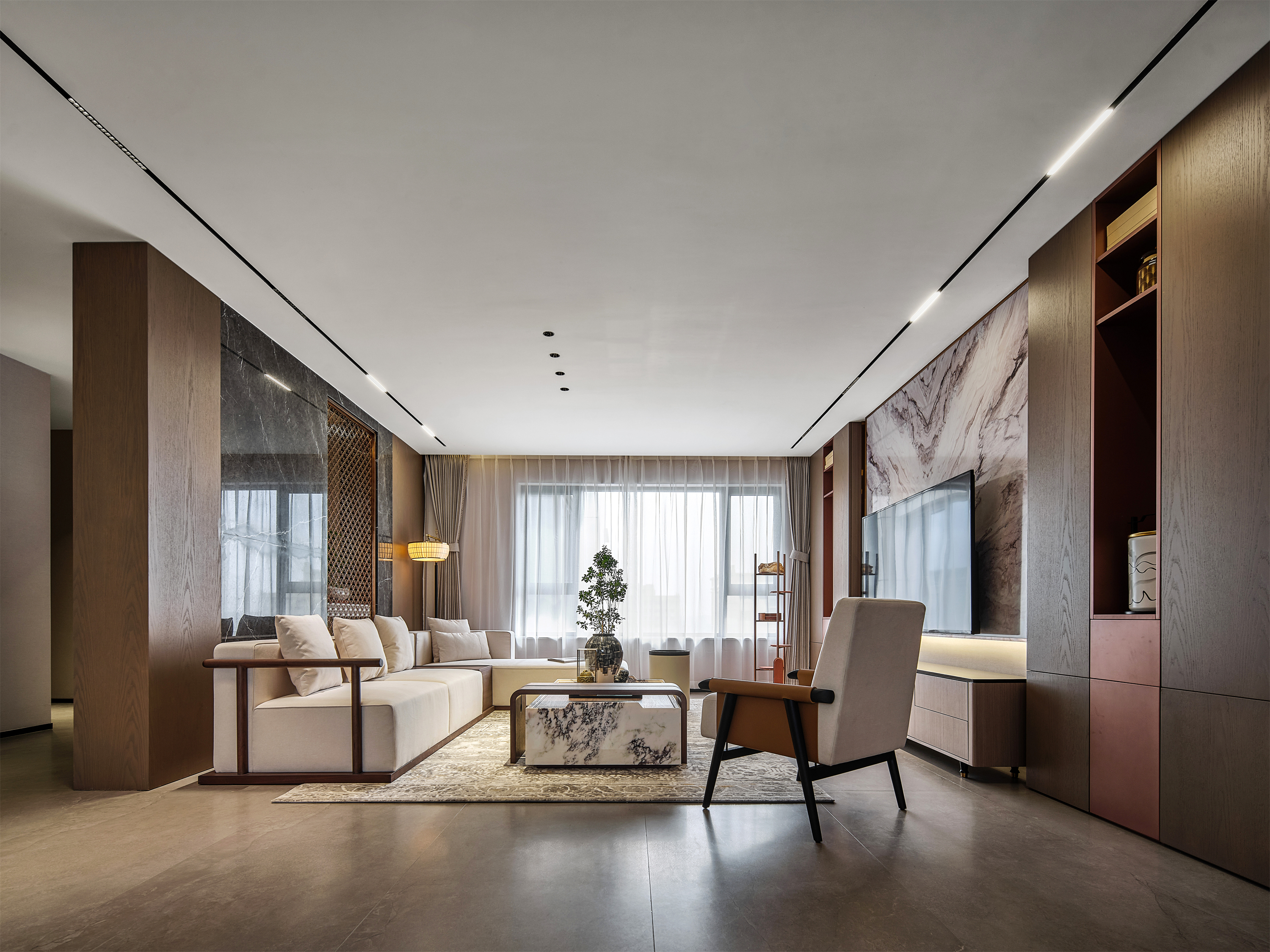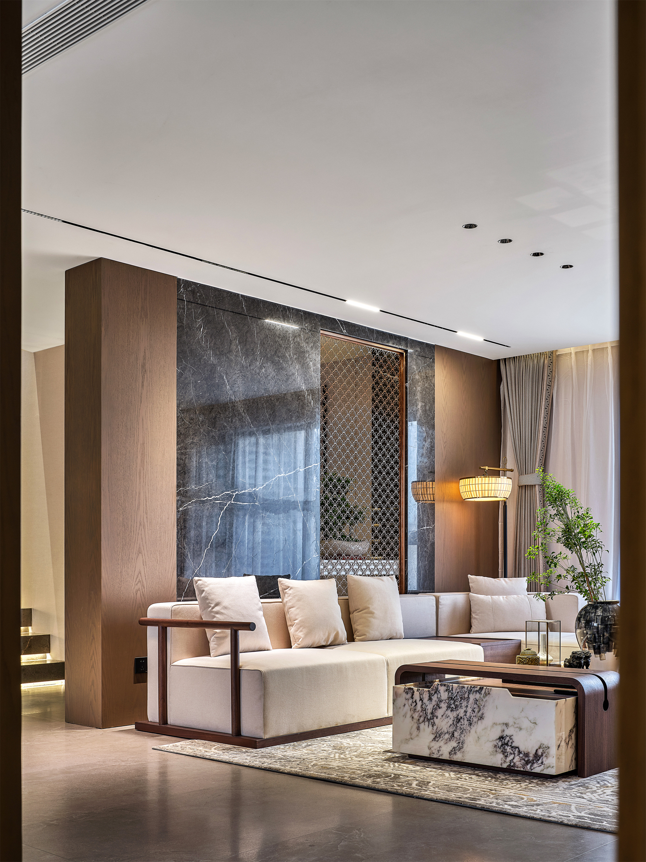 (4)以最大的平静去爱我们笃定的生活,透景的玄关墙将分隔出门厅和客厅空间,化繁为简的极简新中式,线条简洁,中式古典的精髓和现代艺术的审美结合进行空间应用,自然纹理的石材与木质寓意山水之境,阳光浅浅,那些细节和形态影影绰绰的“洒在”家具上,小小的调色过渡,让空间稳重又不失活力。