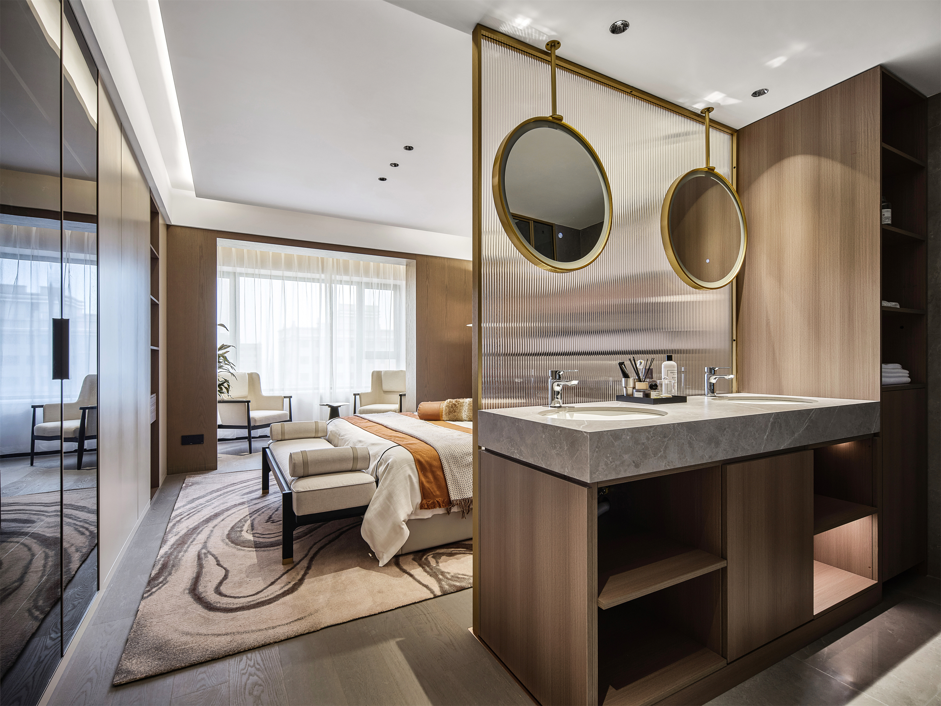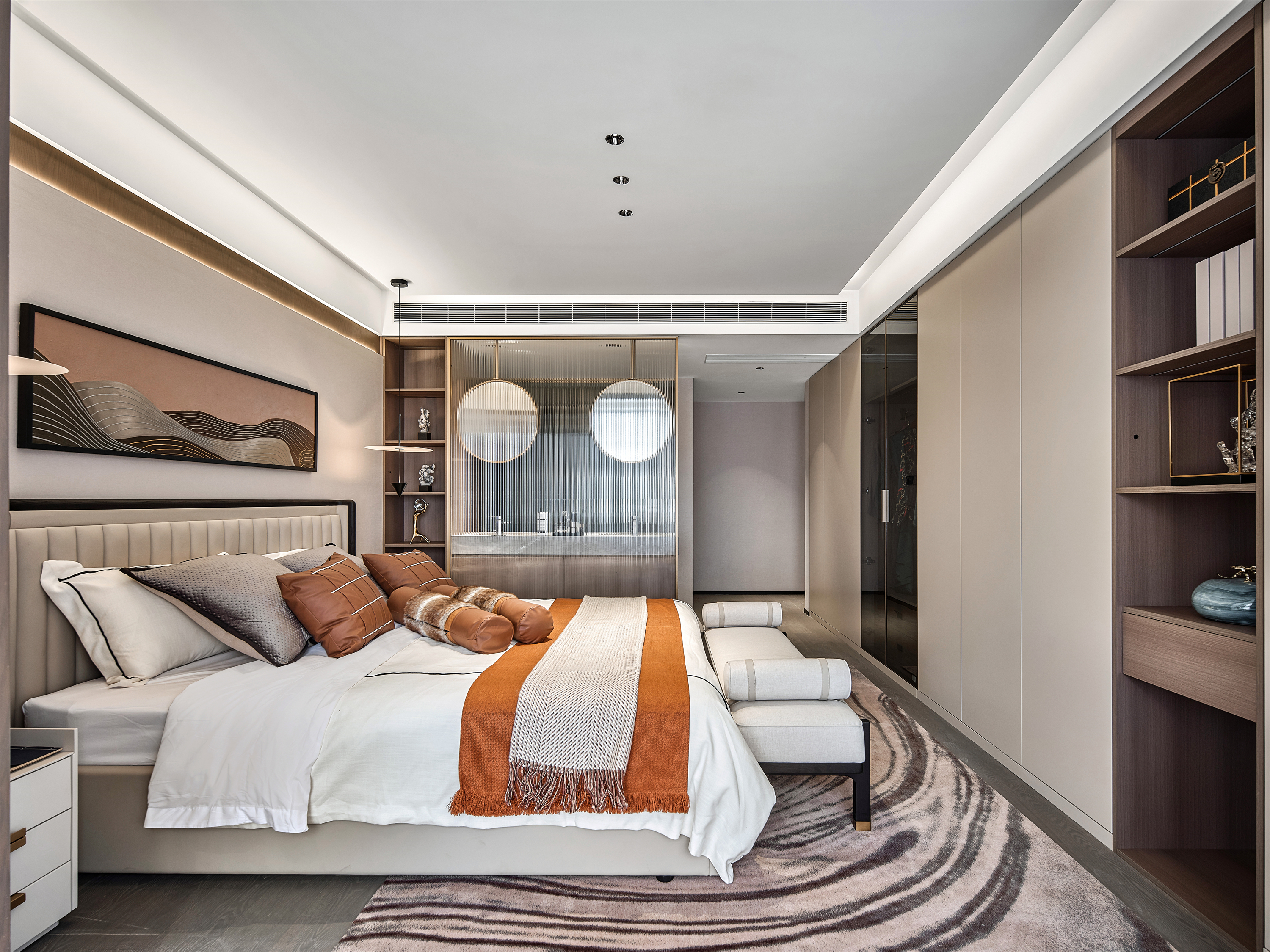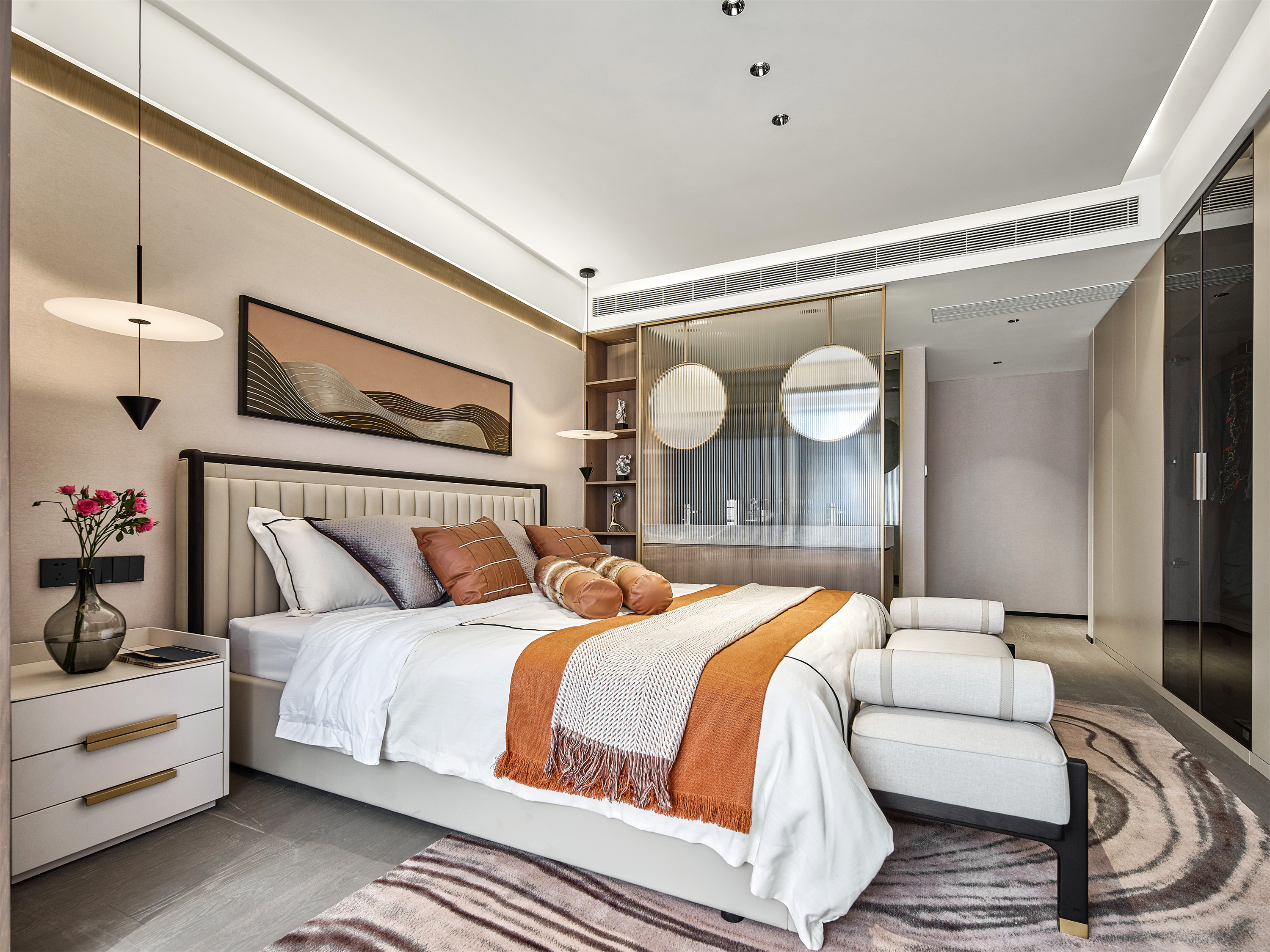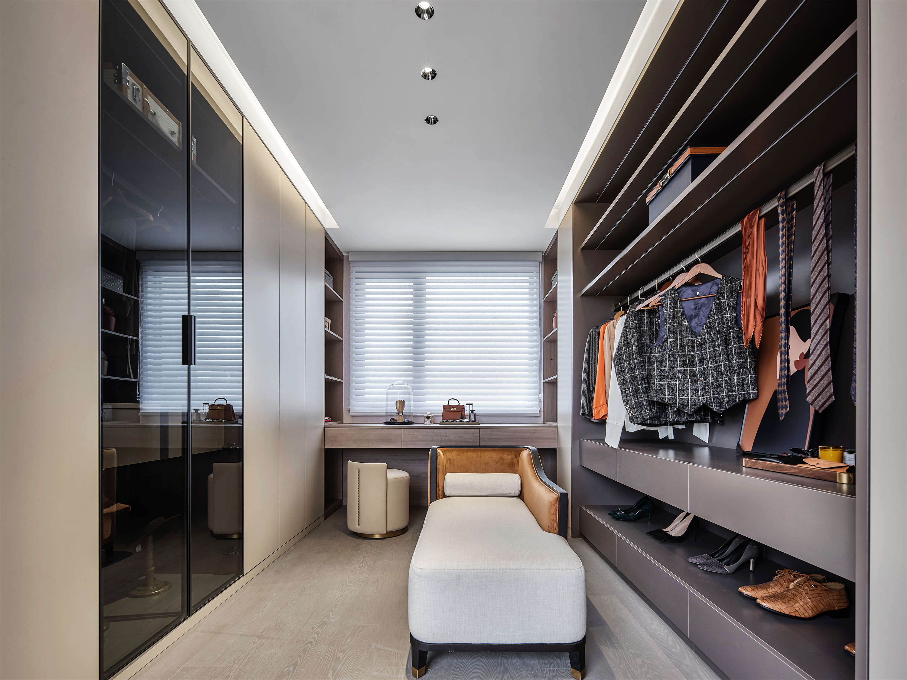 (9)主卧是居住值得更重视的空间之一,决定着睡眠品质和居住品质,在本案中,设计师设计了双主卧,分别位于一层和二层,一层的主卧套进行空间更多有趣的改造,设计希望集梳妆、衣帽、卫浴、休闲于一体;