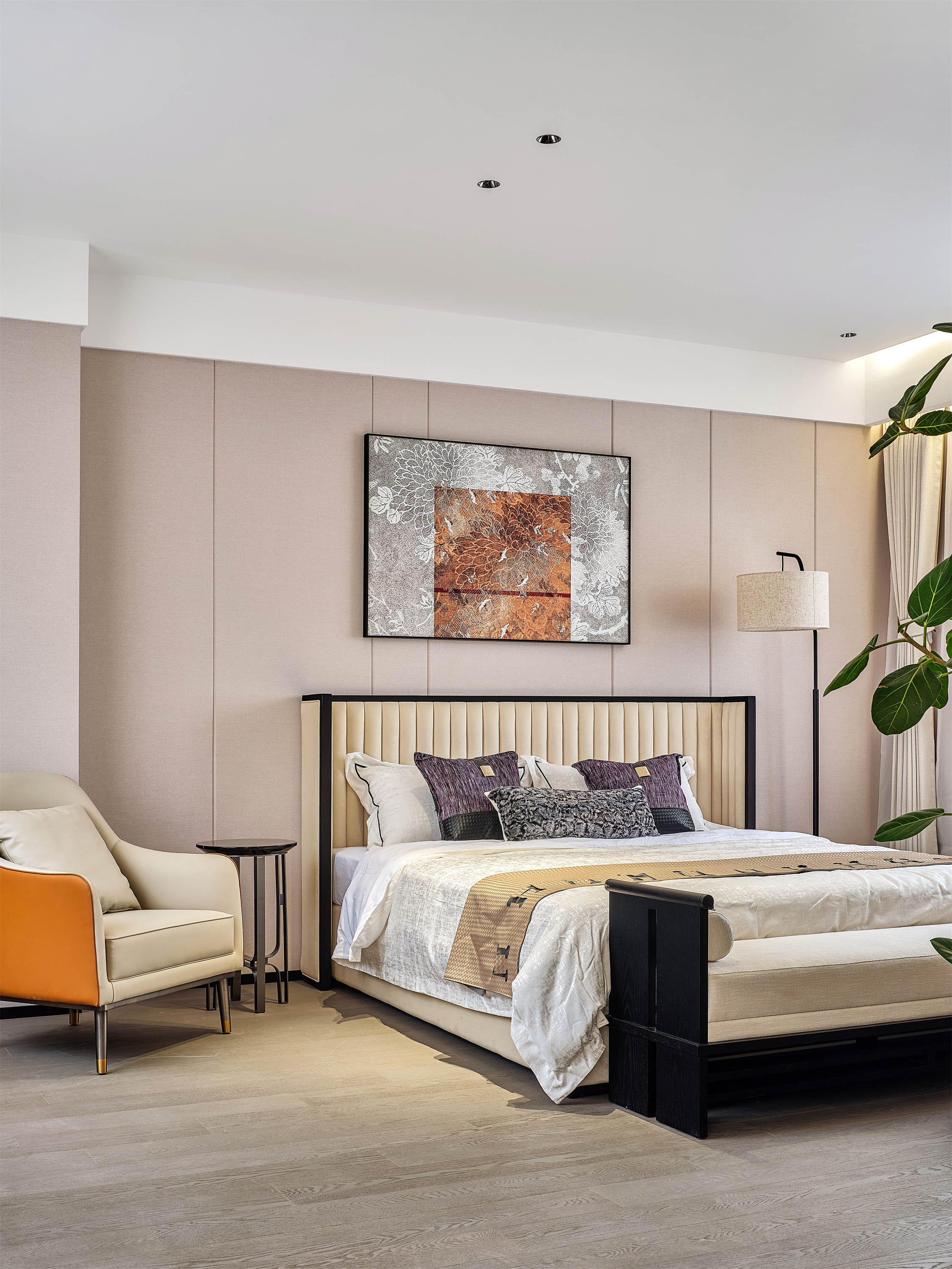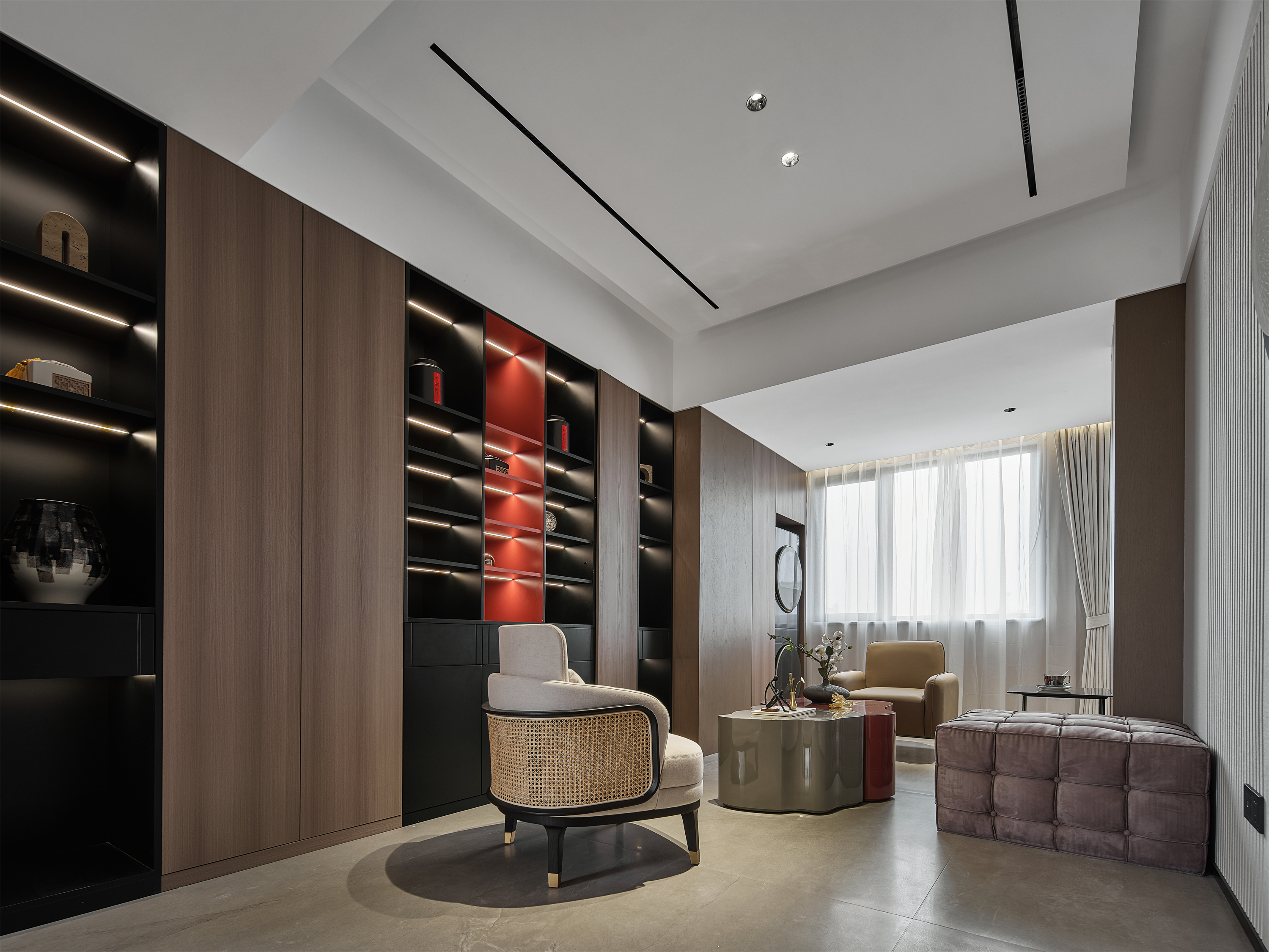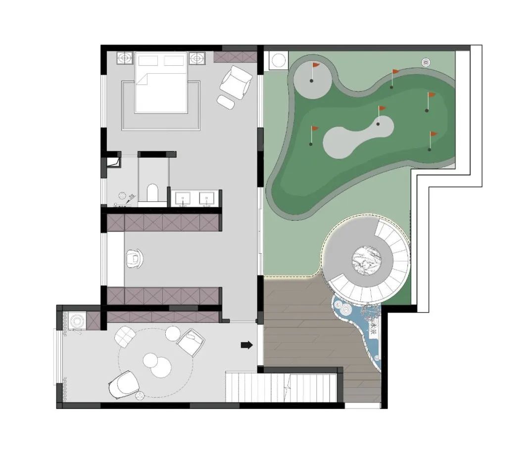 (9)主卧是居住值得更重视的空间之一,决定着睡眠品质和居住品质,在本案中,设计师设计了双主卧,分别位于一层和二层,一层的主卧套进行空间更多有趣的改造,设计希望集梳妆、衣帽、卫浴、休闲于一体;