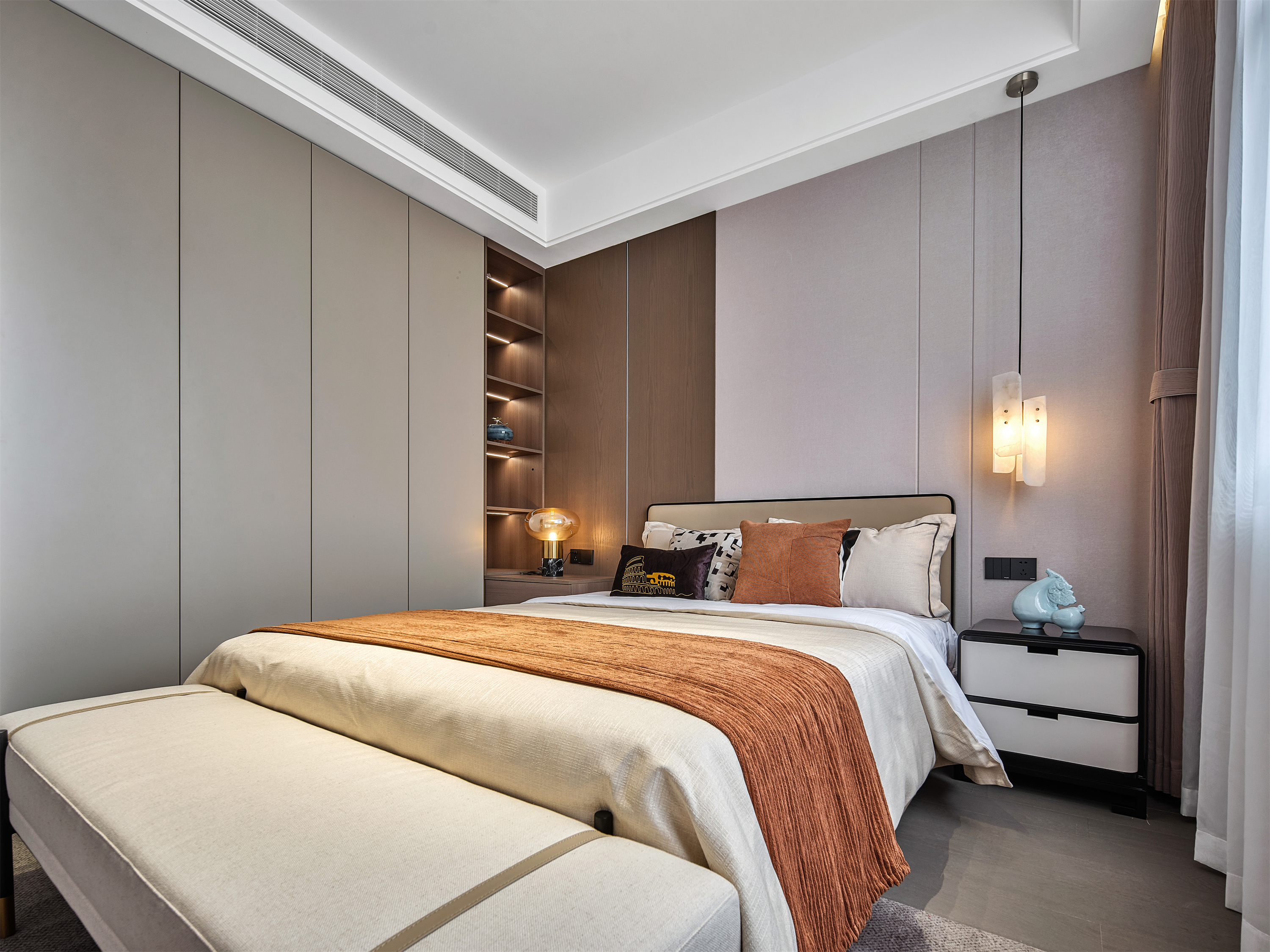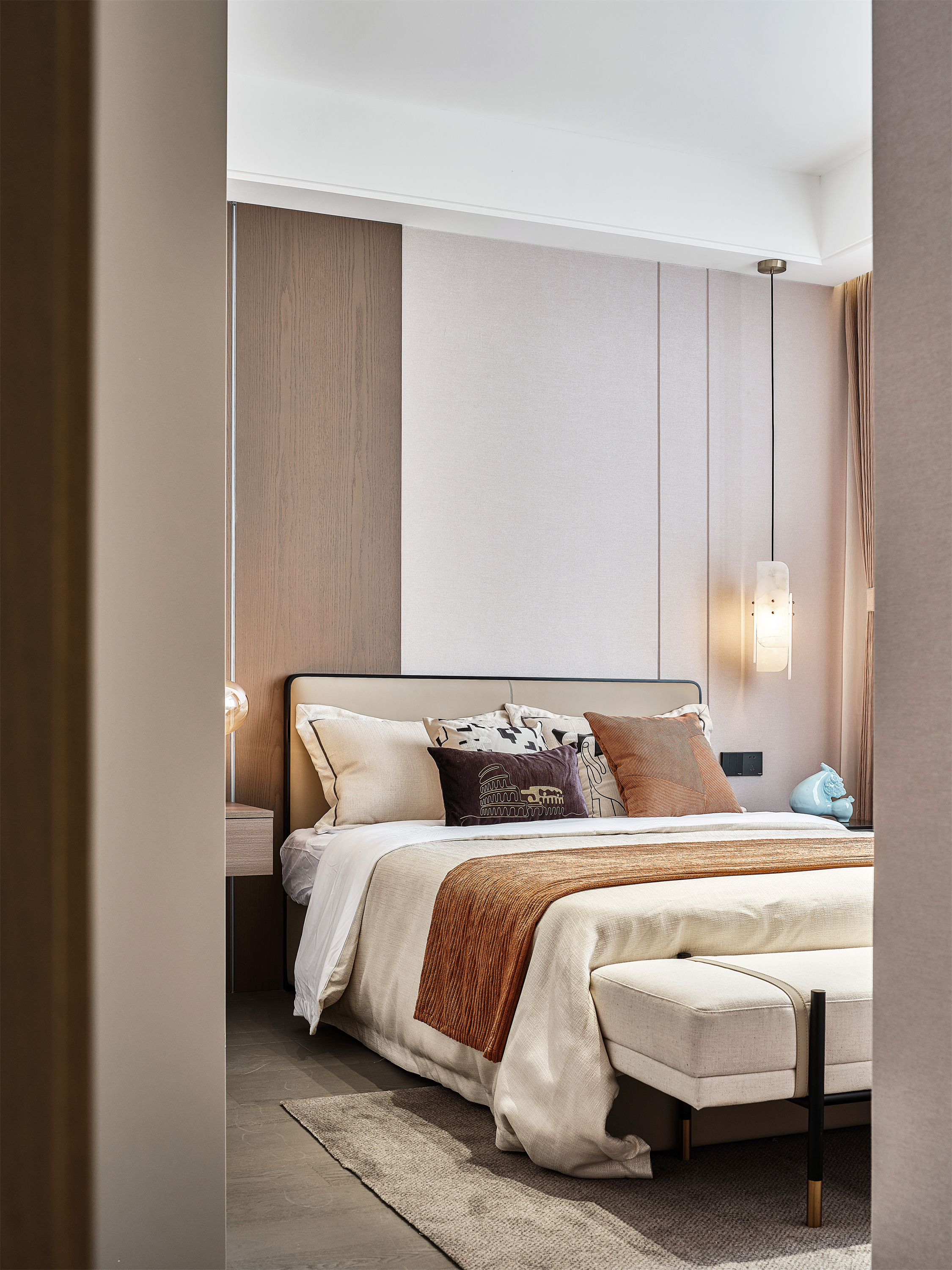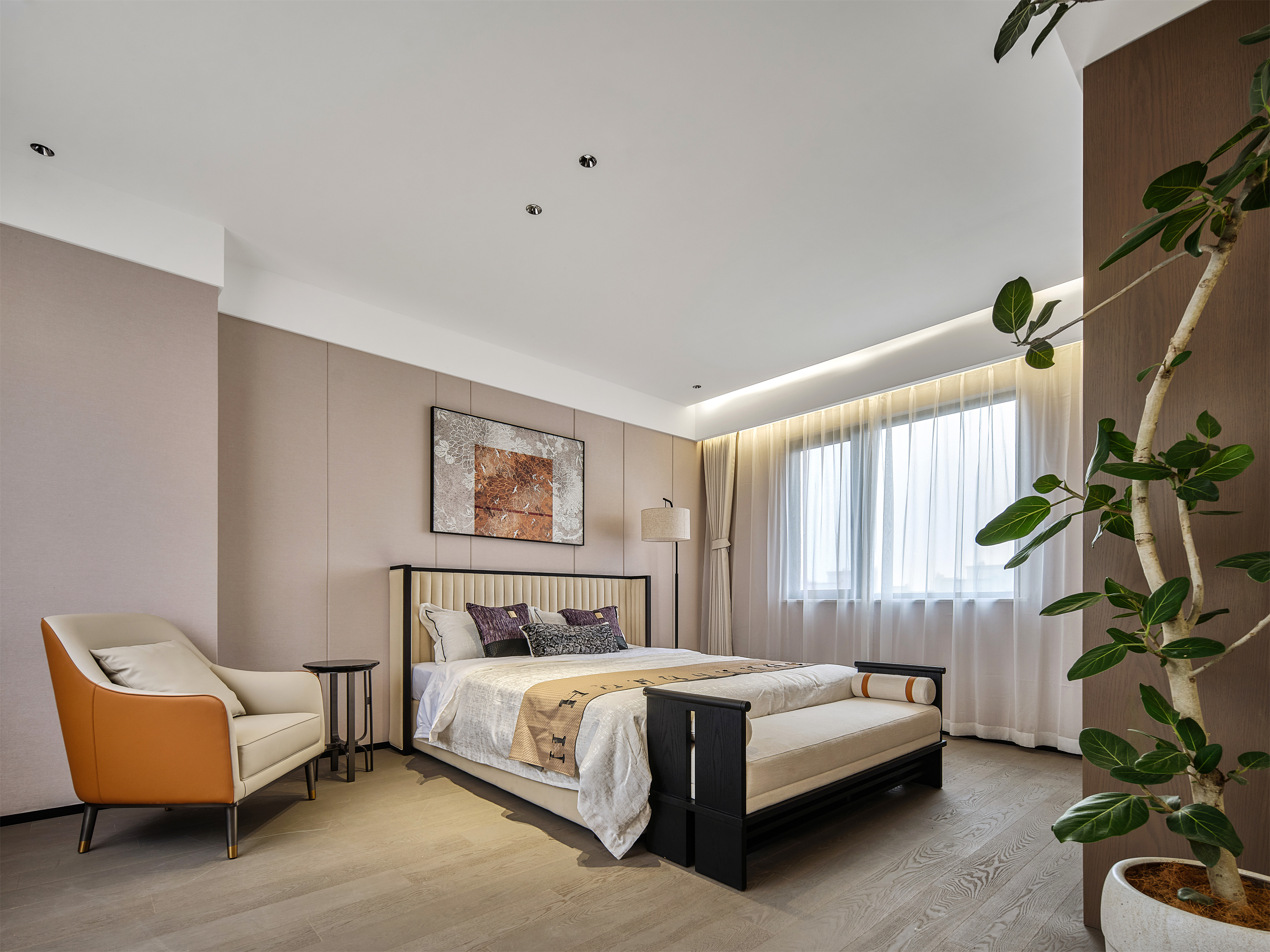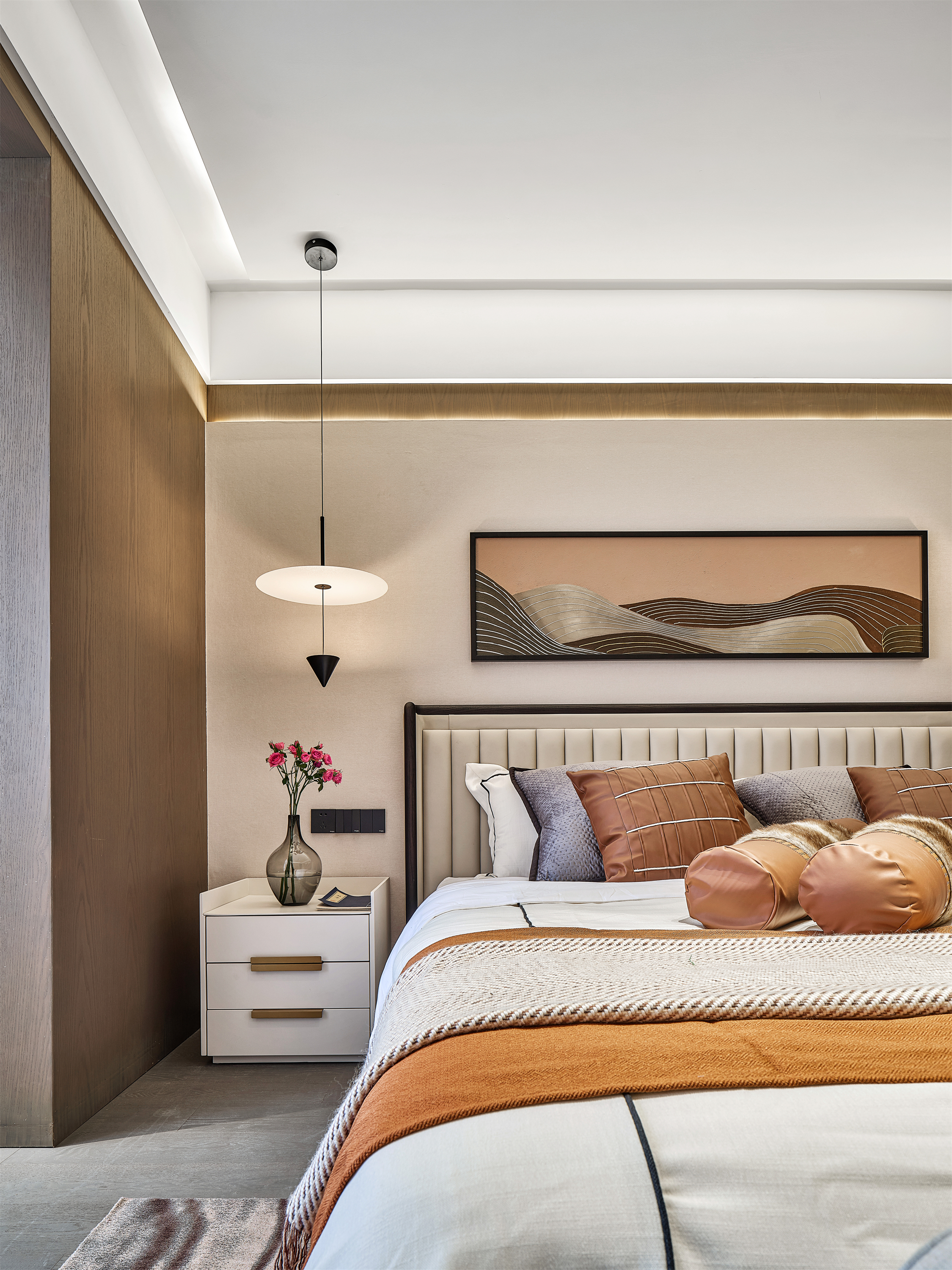 (9)主卧是居住值得更重视的空间之一,决定着睡眠品质和居住品质,在本案中,设计师设计了双主卧,分别位于一层和二层,一层的主卧套进行空间更多有趣的改造,设计希望集梳妆、衣帽、卫浴、休闲于一体;