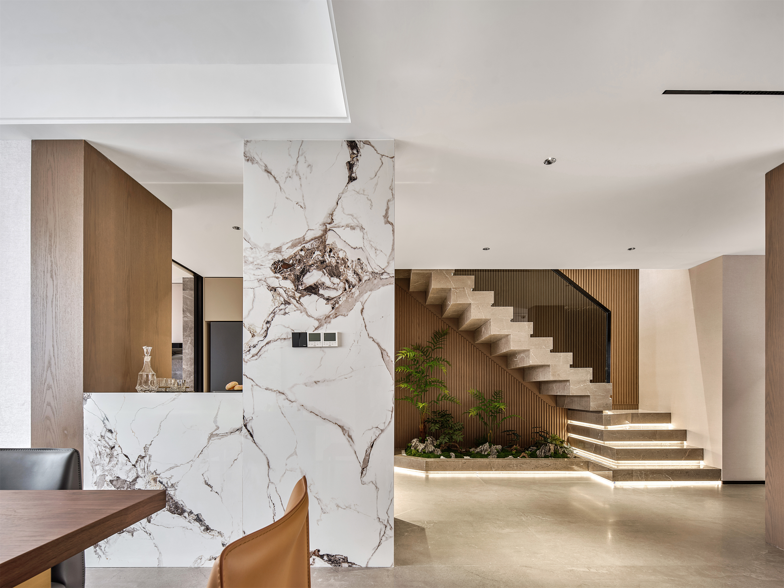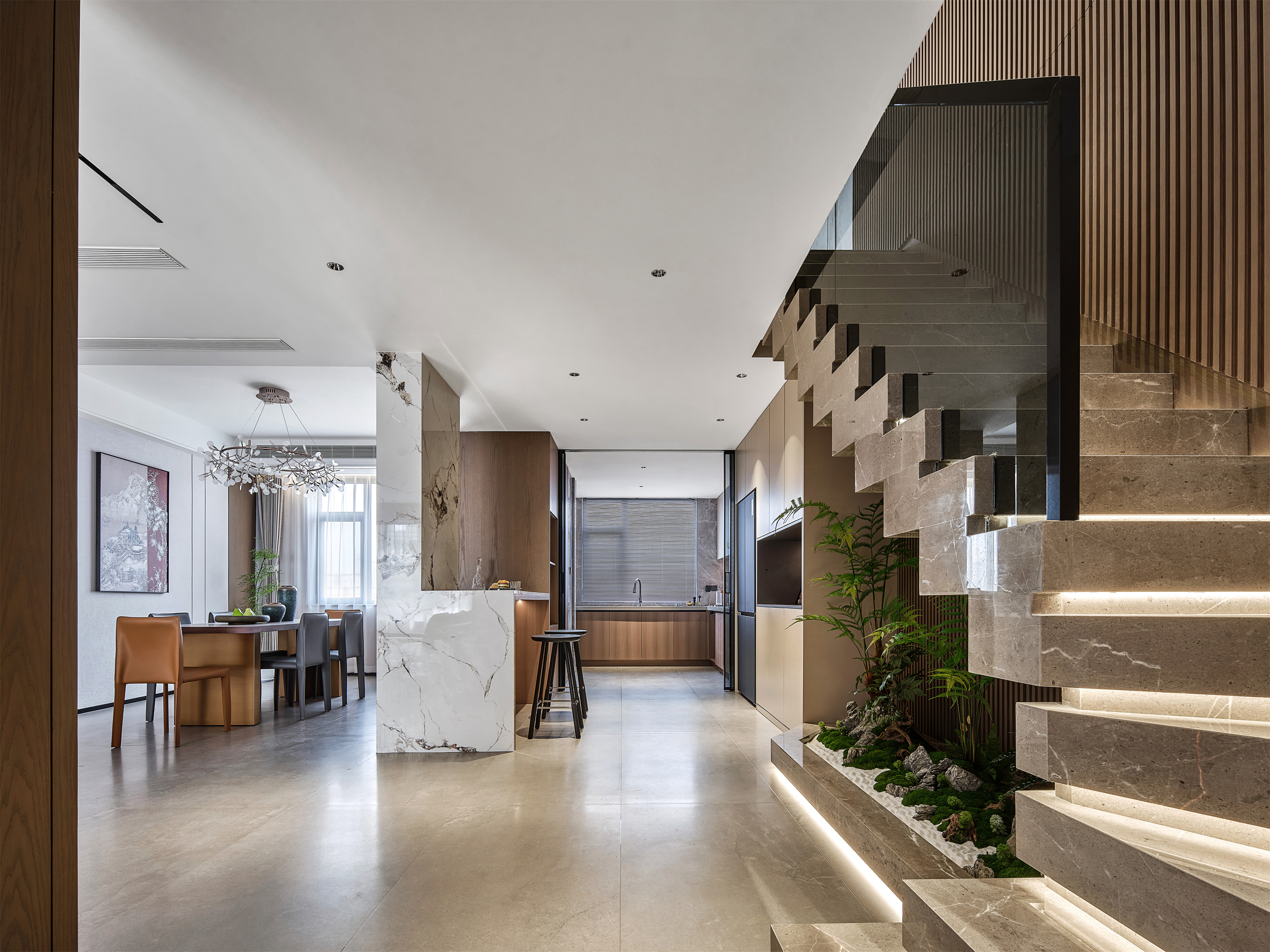 (5)原始入户的楼梯位置没有改动,但是楼梯的整个形态和结构做了重新的设计调整,将直上的一跑楼梯改为折叠楼梯,四叠踏步连接出上下舒适的尺度,楼梯间也被充分利用,一方枯山水,然自然入室。