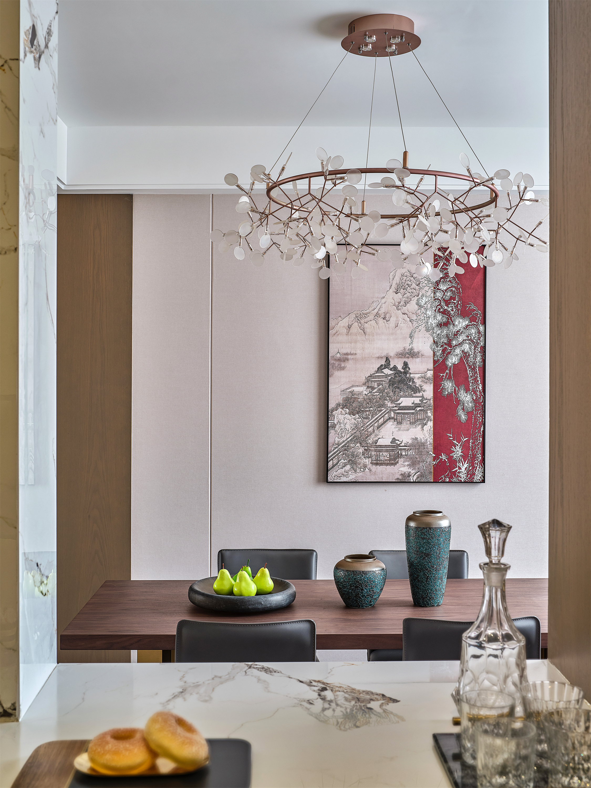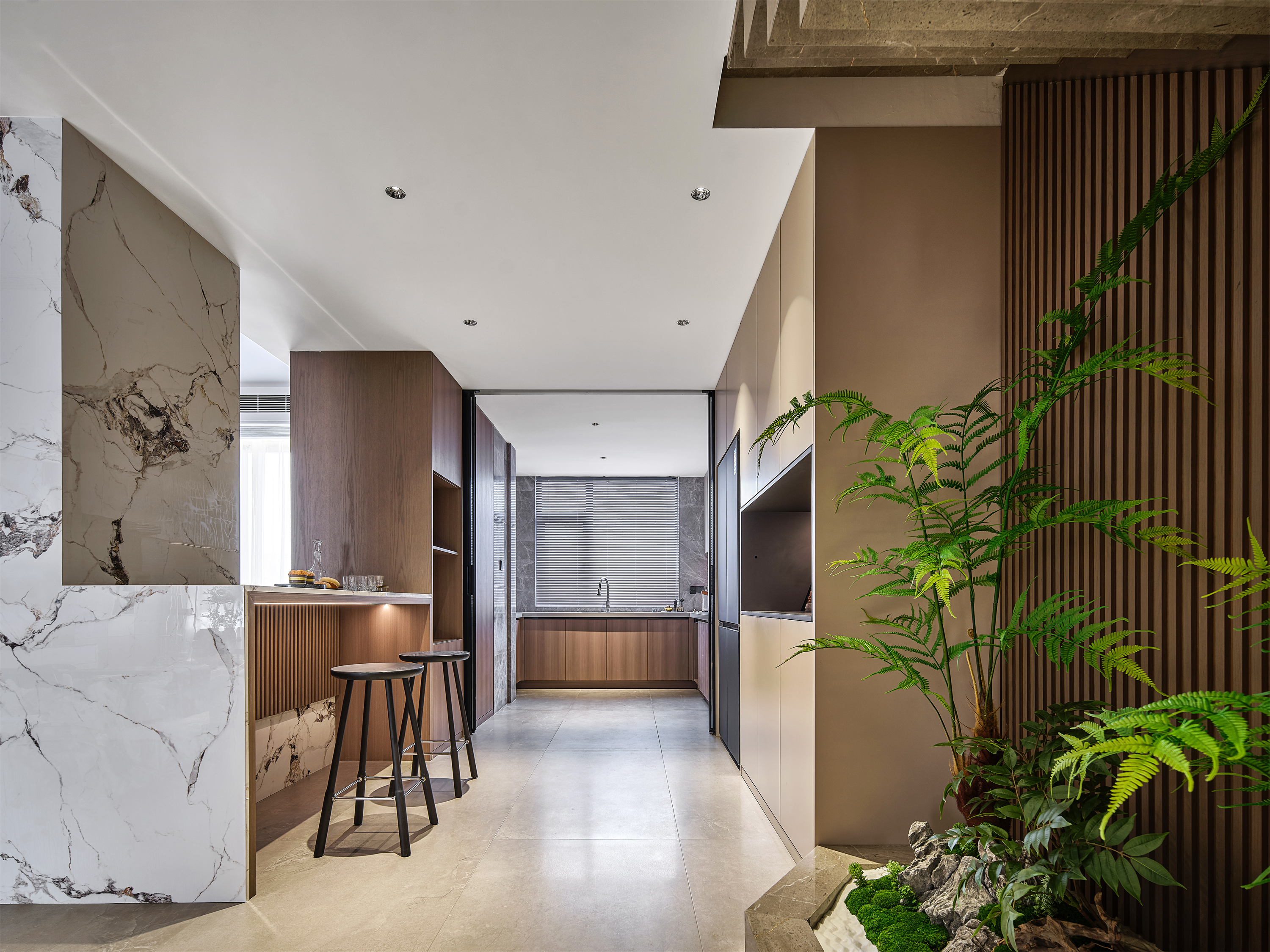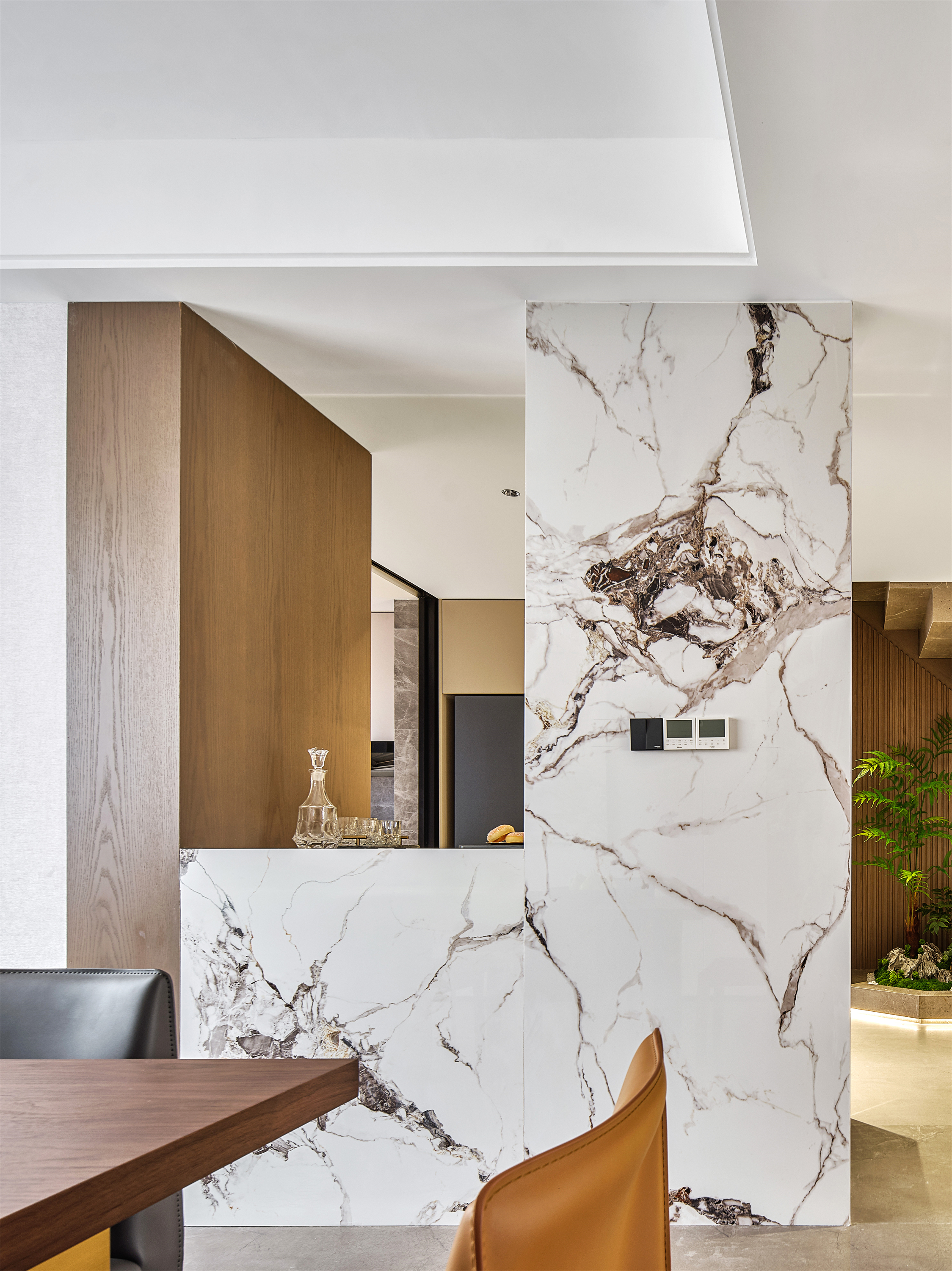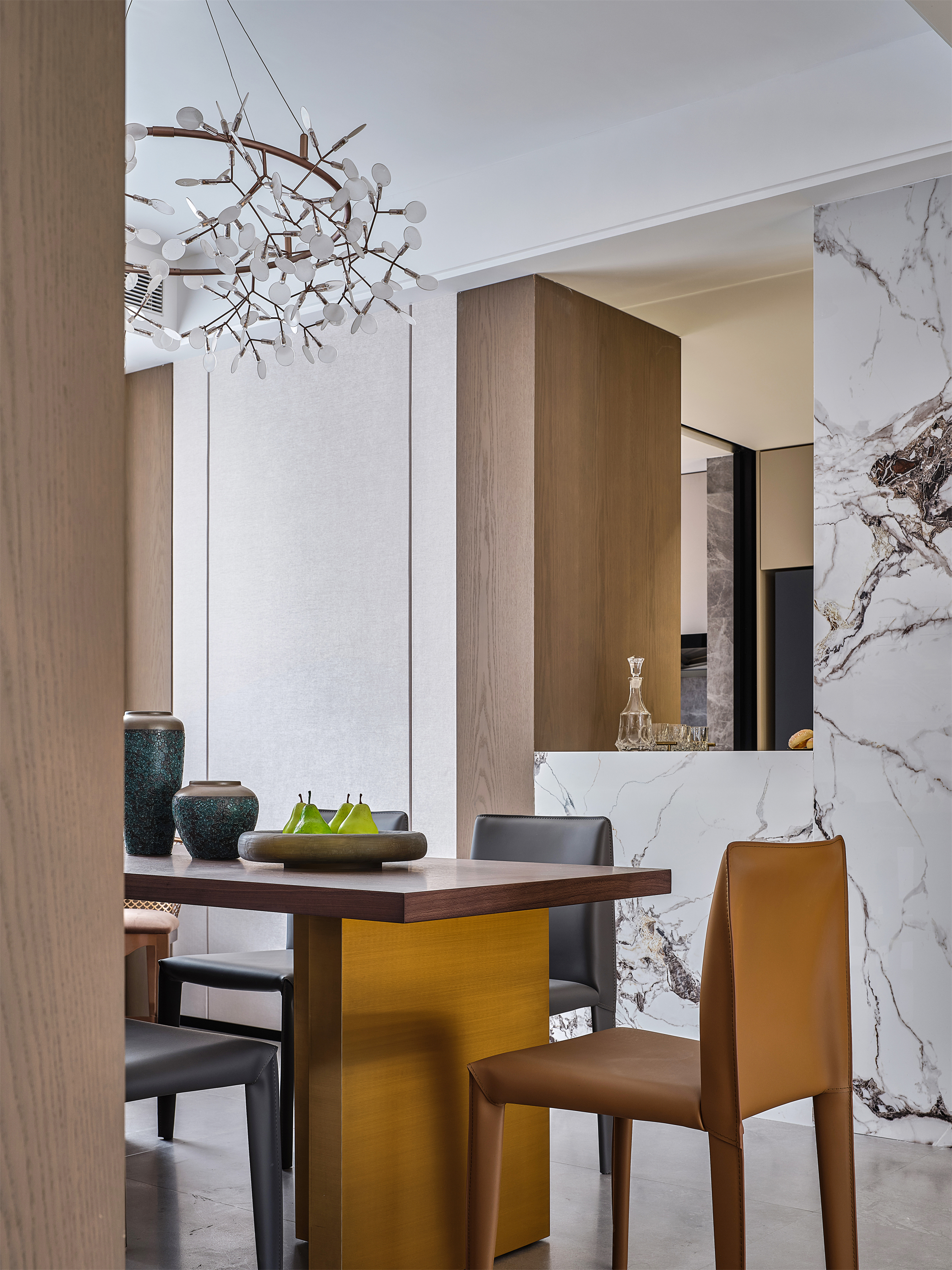 (8)原始的厨房门的位置连接承重柱,设计顺势将之设计成为岛台,门的位置下半区域成为岛台,上半部分开放,厨房区域满足了中西厨的功能,吧台和餐厅也双面互动,早餐或者小酌吧台尽情满足,家庭用餐或友人相聚, 餐厅又完全满足,设计的精妙改造和“变废为宝”让“拥堵”的局面被豁然打开,鸡肋的空间成为高频的功能空间。