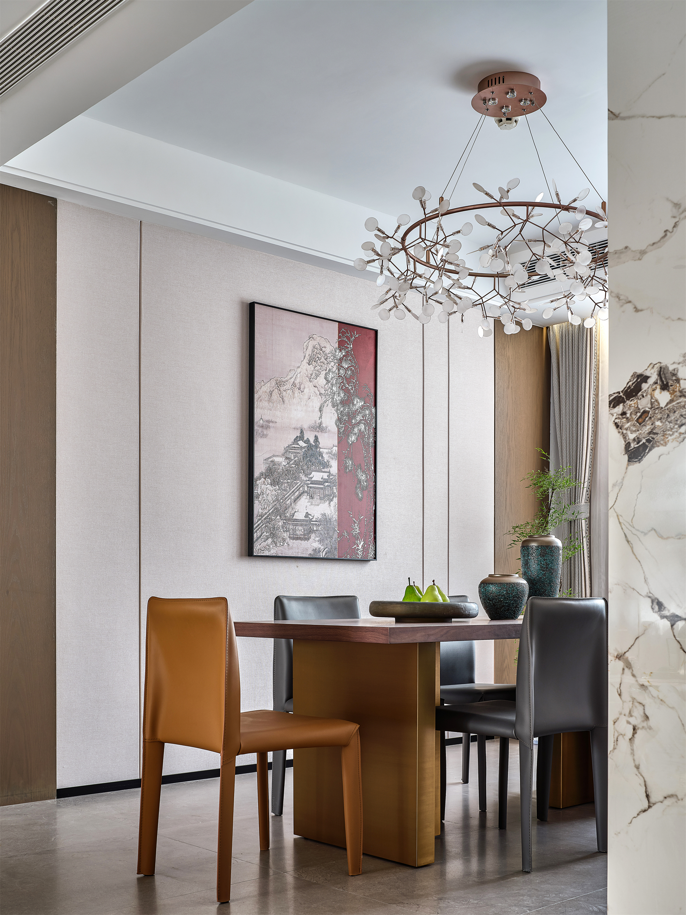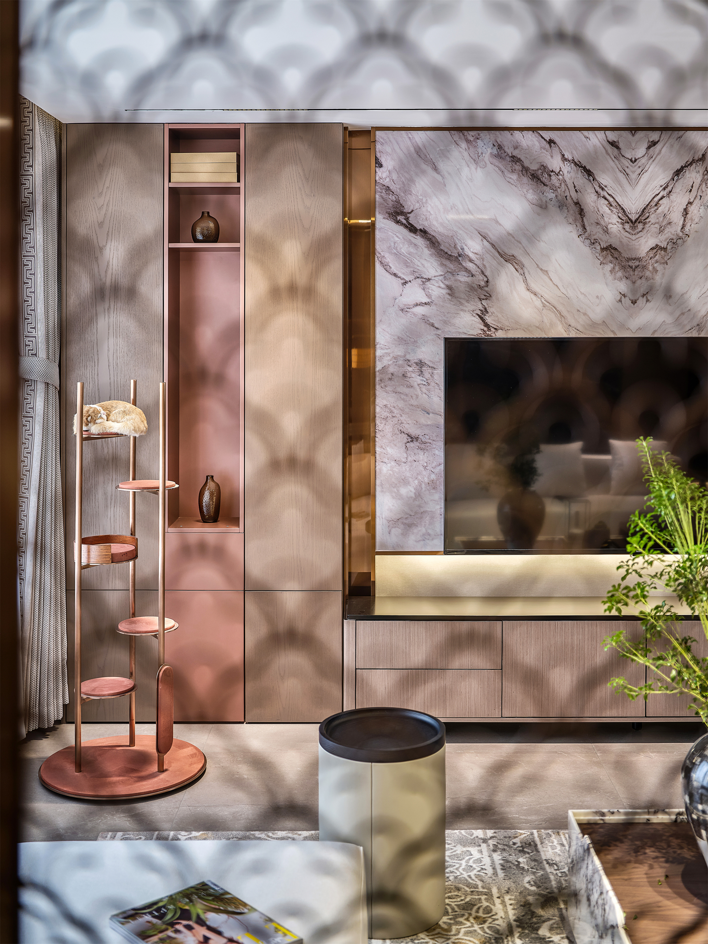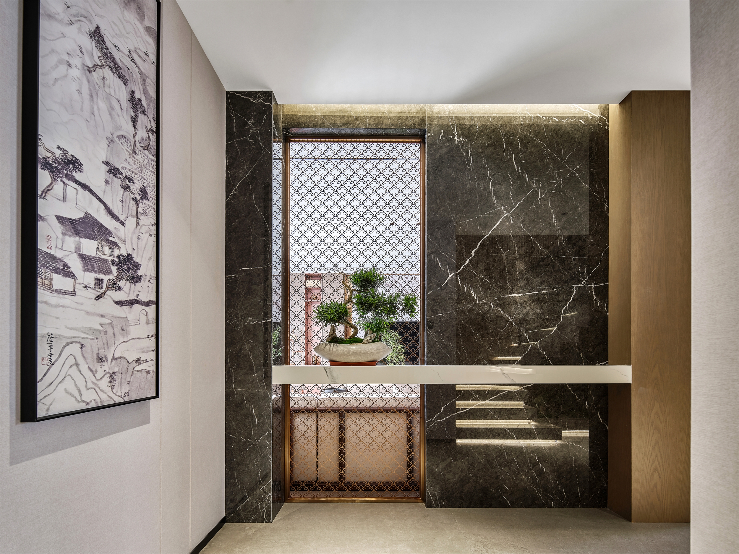 (3)入户设计玄关,中式华纹镂空的金属屏风在透与半透之间尽显新中式的儒雅,透景的功能融合门厅的仪式感,徐徐展开居住的体验。