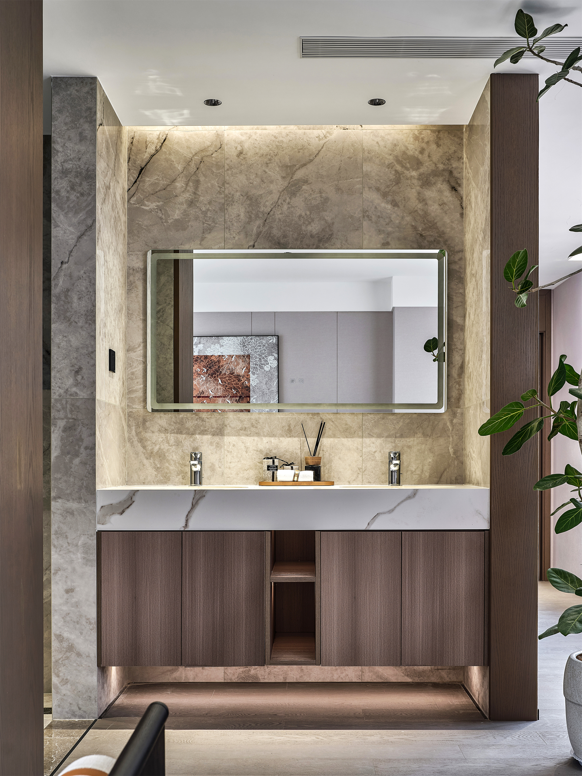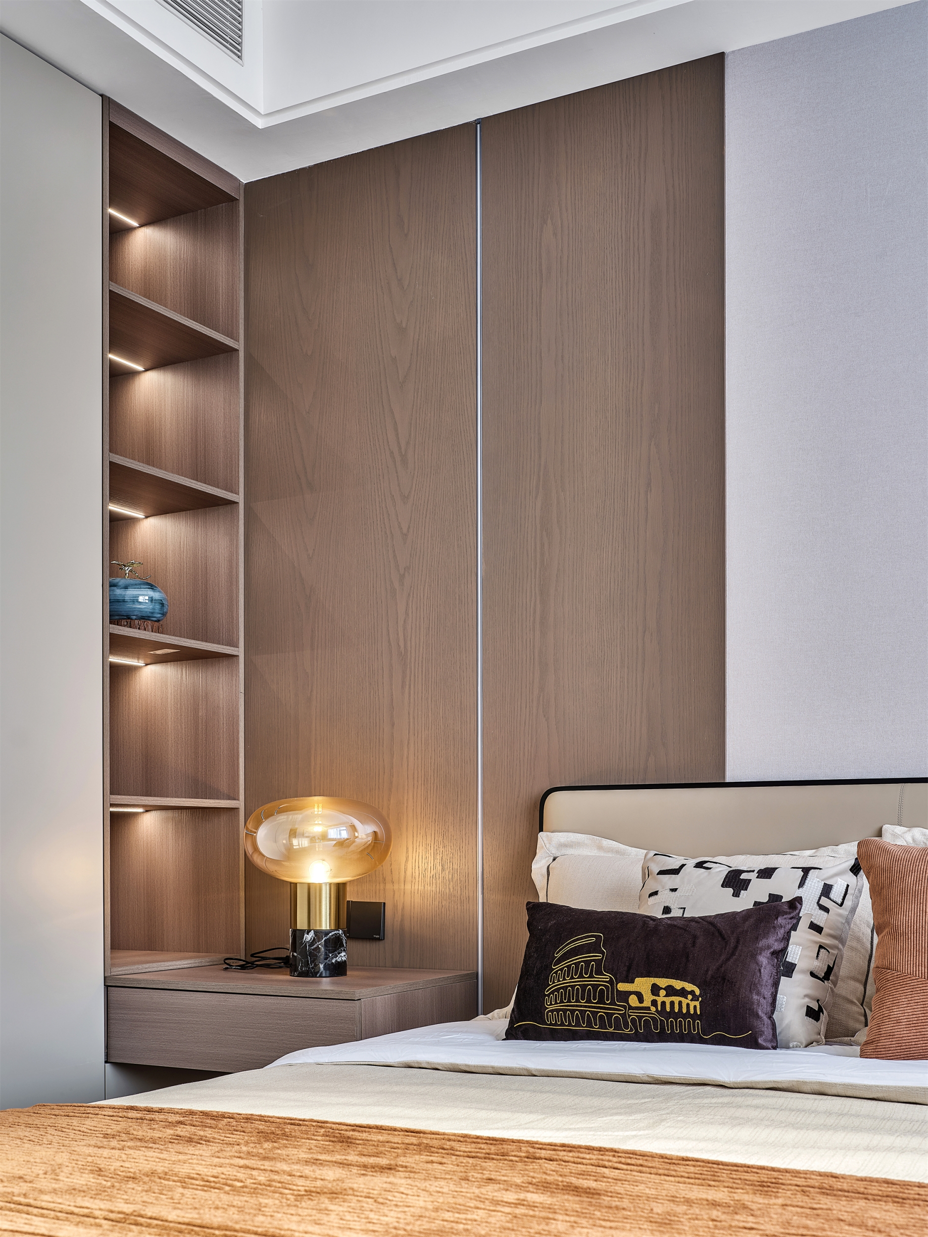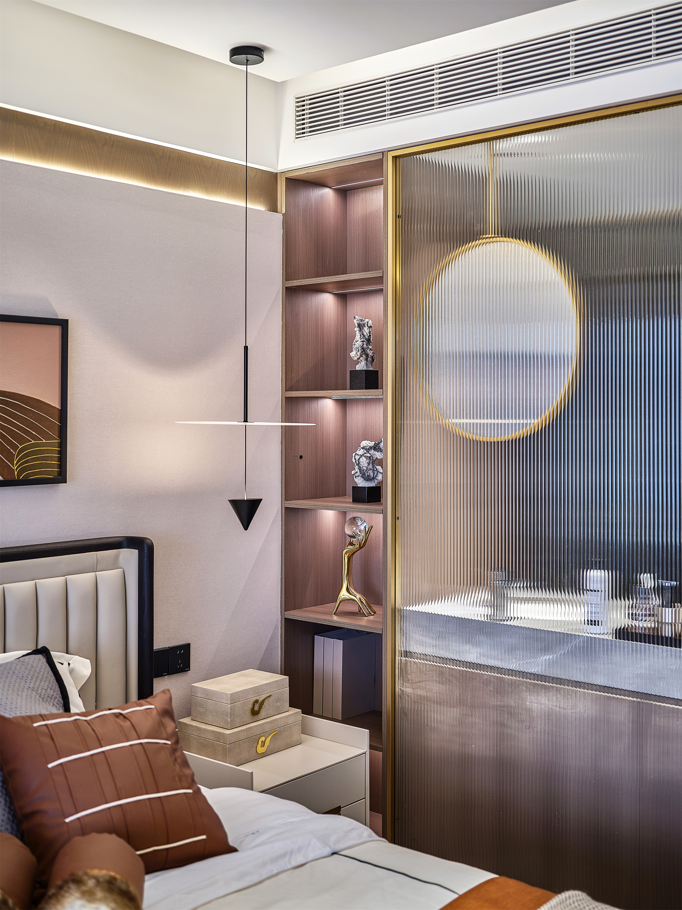 (10)改变原始主卧的入户位置,将交错的廊消隐,打开主卫空间做分离设计,盥洗区和梳妆台合体,分离出来,半透明的夹层玻璃被金属框点,酒店式的便捷和舒适感,墙面齐平的衣帽柜结合书柜有节奏的变幻,没错,这是专属的私人空间。