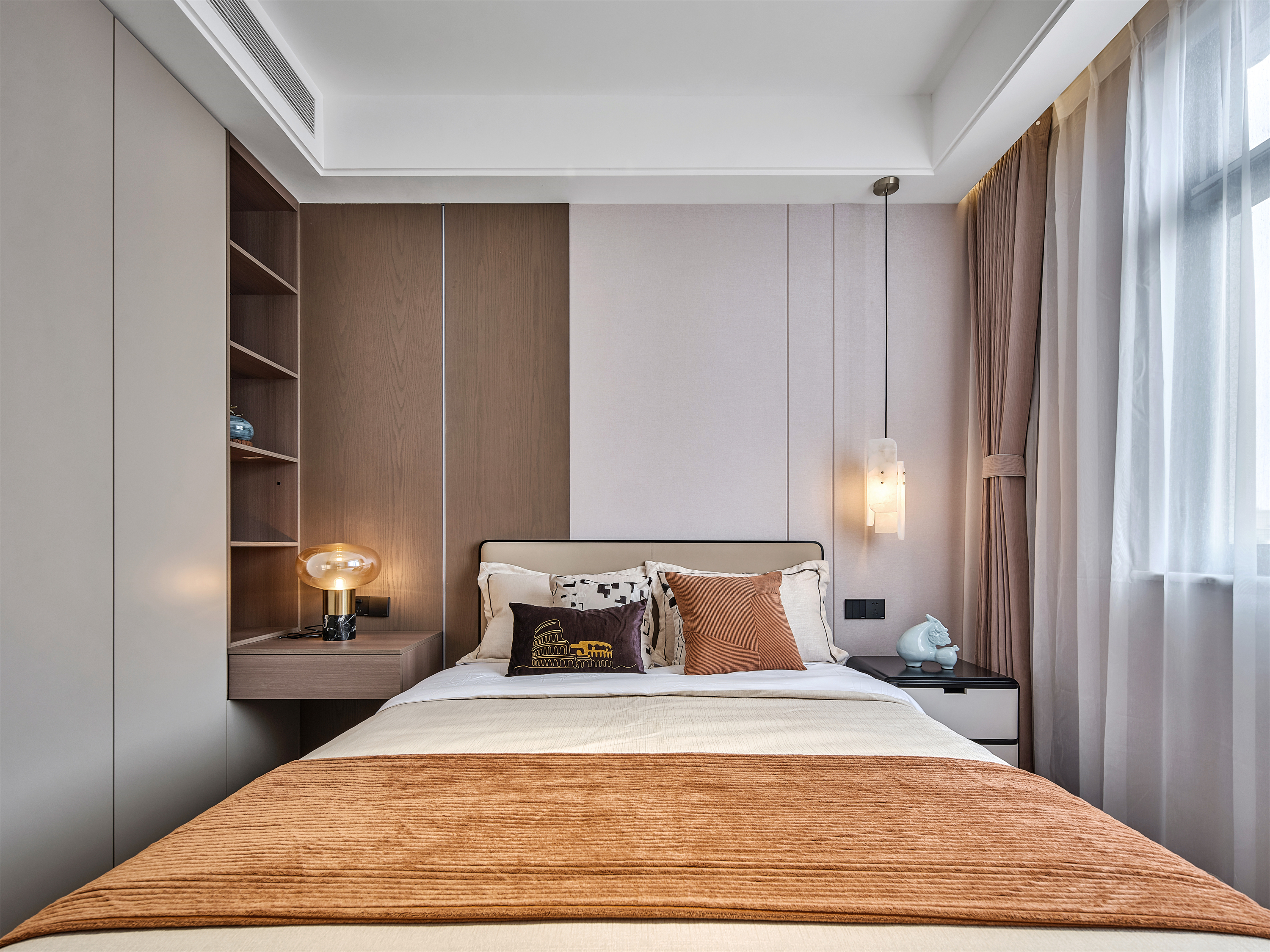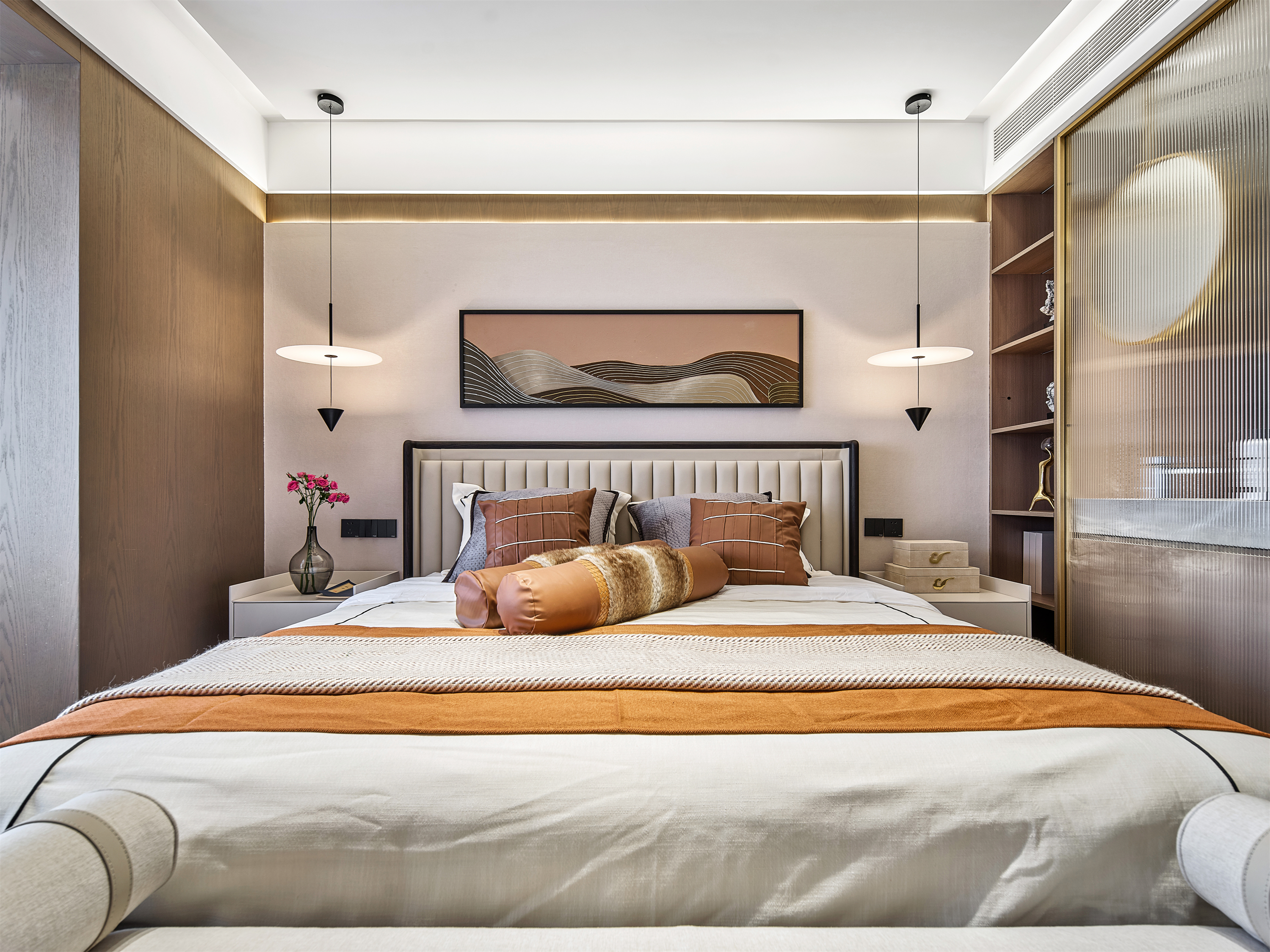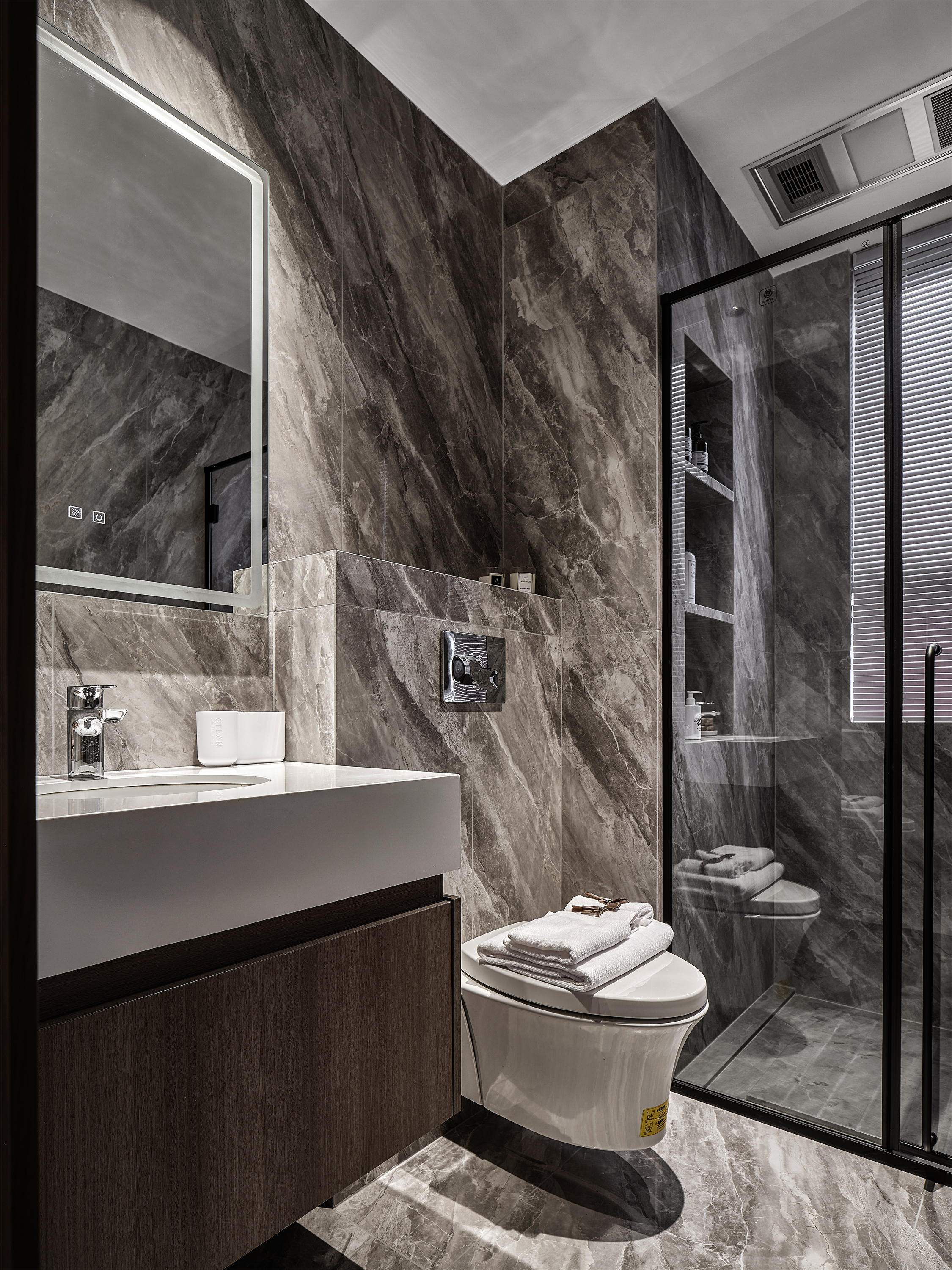 (10)改变原始主卧的入户位置,将交错的廊消隐,打开主卫空间做分离设计,盥洗区和梳妆台合体,分离出来,半透明的夹层玻璃被金属框点,酒店式的便捷和舒适感,墙面齐平的衣帽柜结合书柜有节奏的变幻,没错,这是专属的私人空间。