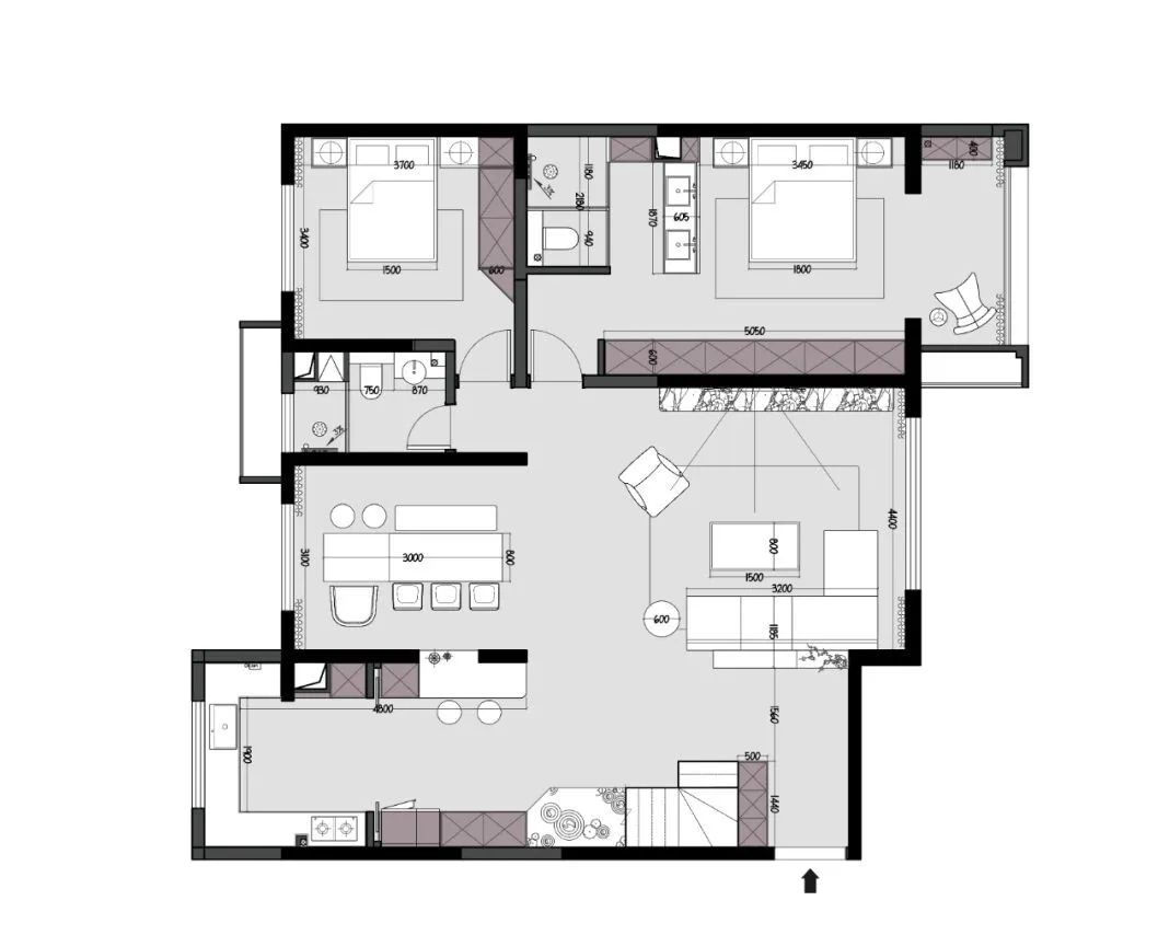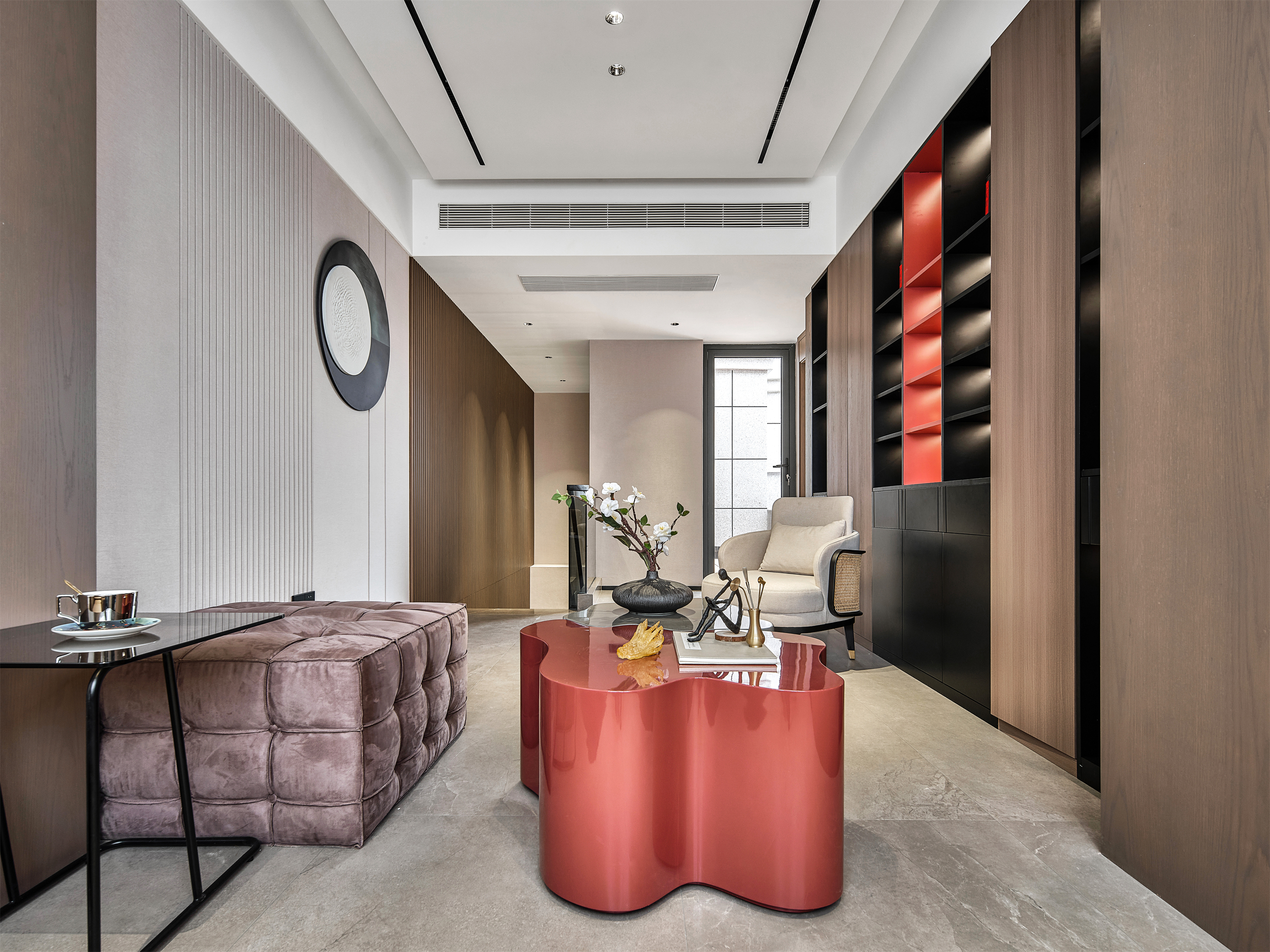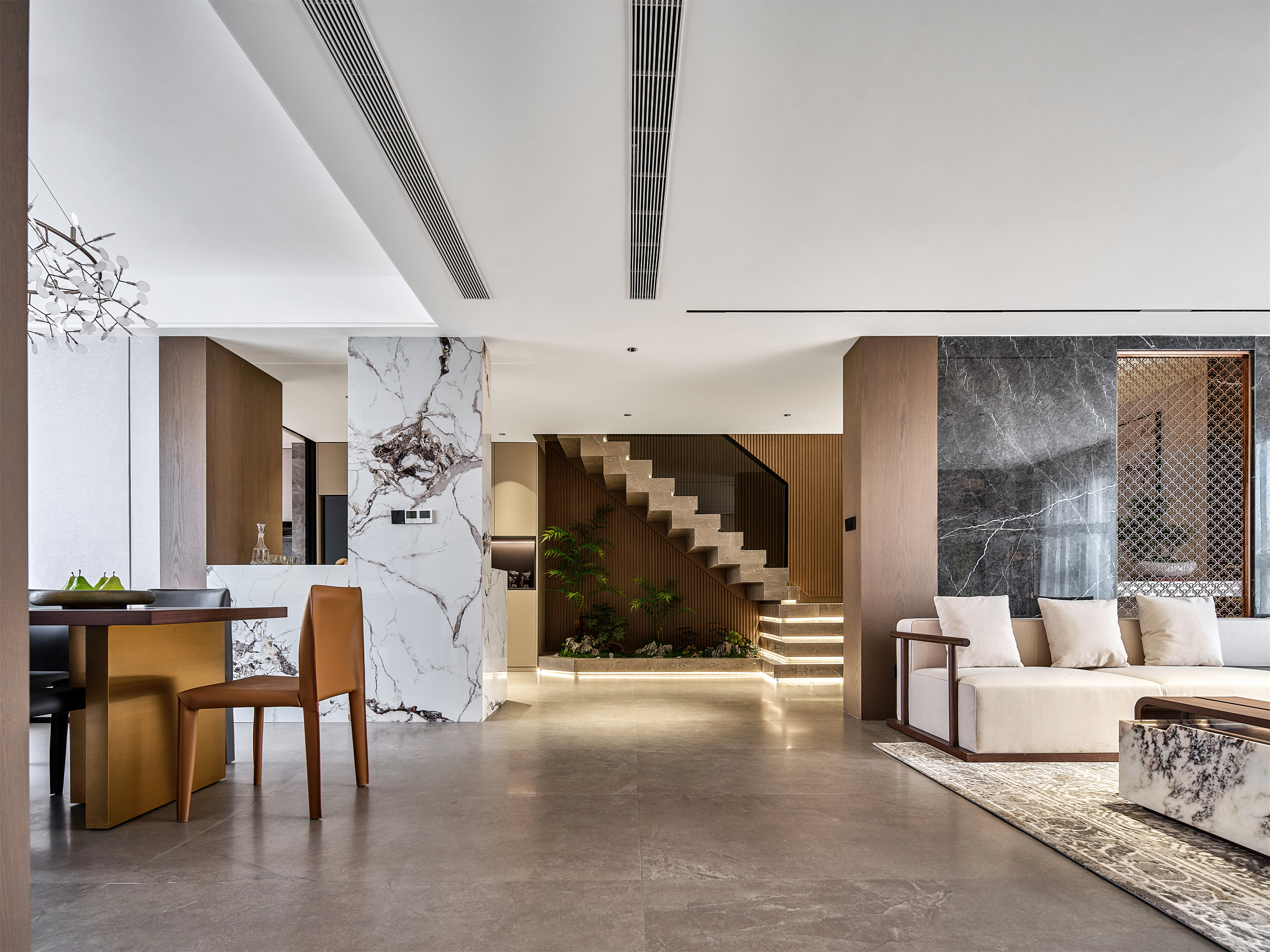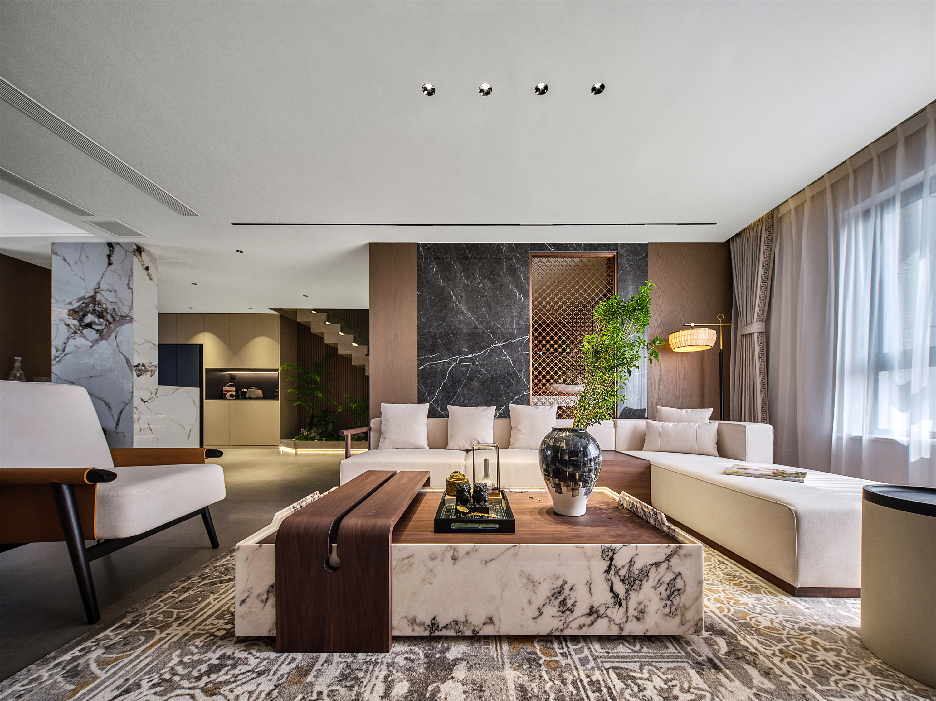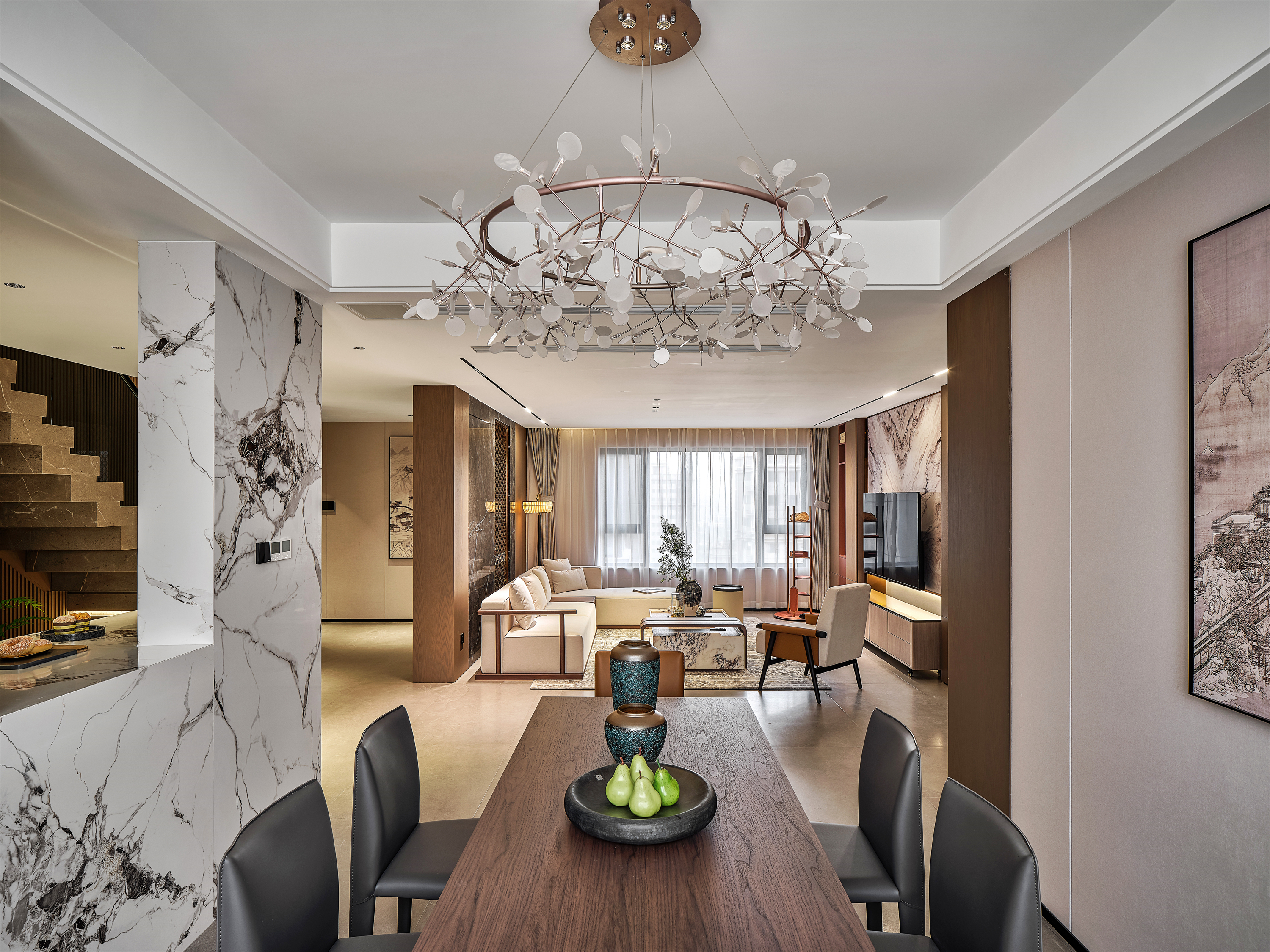 (2)“双拼”后的样板间,总面积为248平方米,户型结构成为复式,封掉上层的入户,一层成为主入口,定位高质量的居住客群,整体的居住氛围以新中式展开;