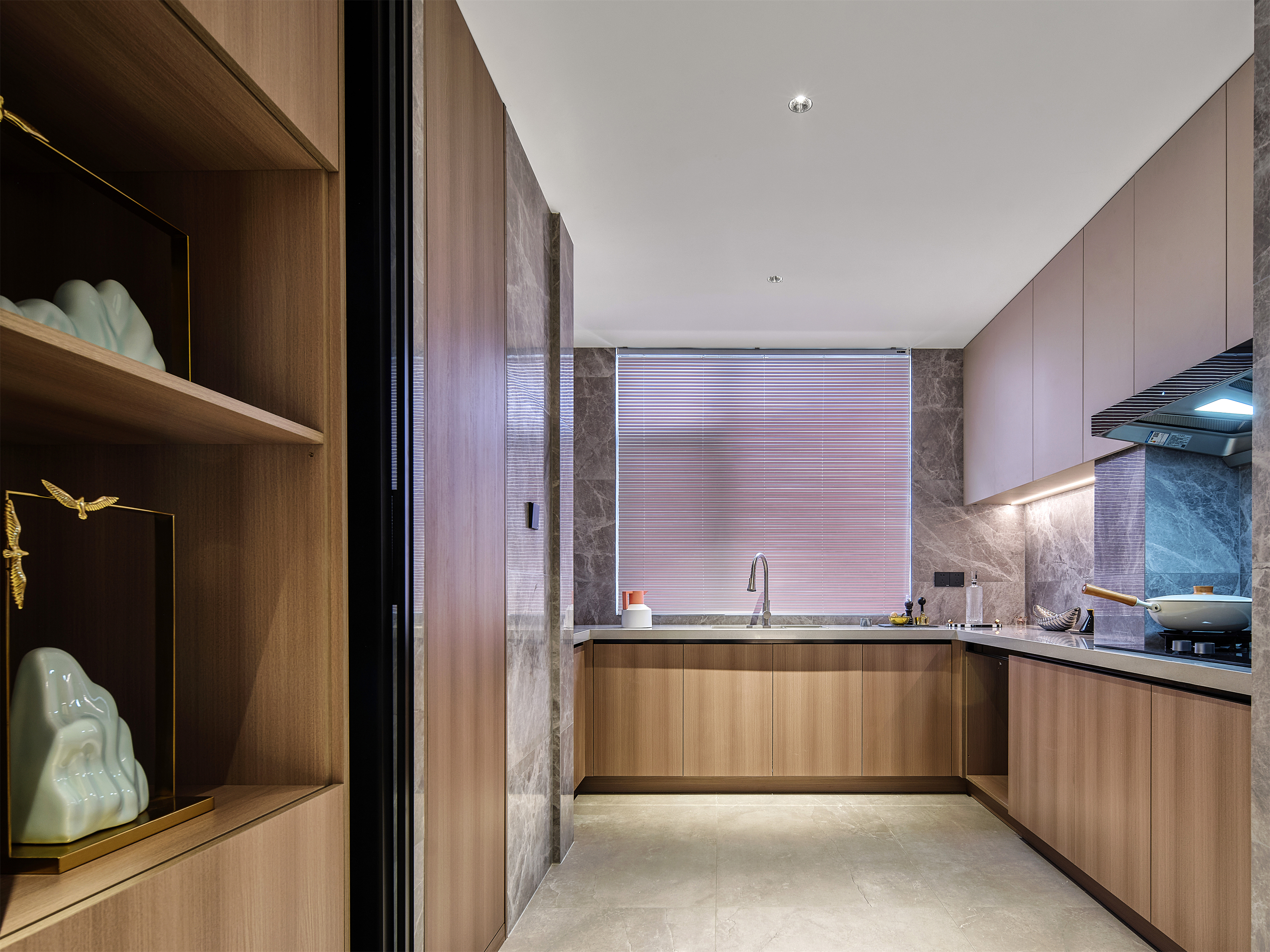 (7)原始的厨房要从餐厅进入,并且非常狭小,项目重新规划定位后,设计师打开一层原始的厨房门位置,将生活阳台也并入厨房的空间范畴,采光充分进入,原木色的橱柜与整体的空间氛围保持一致,打开的厨房满足更多的储纳使用。