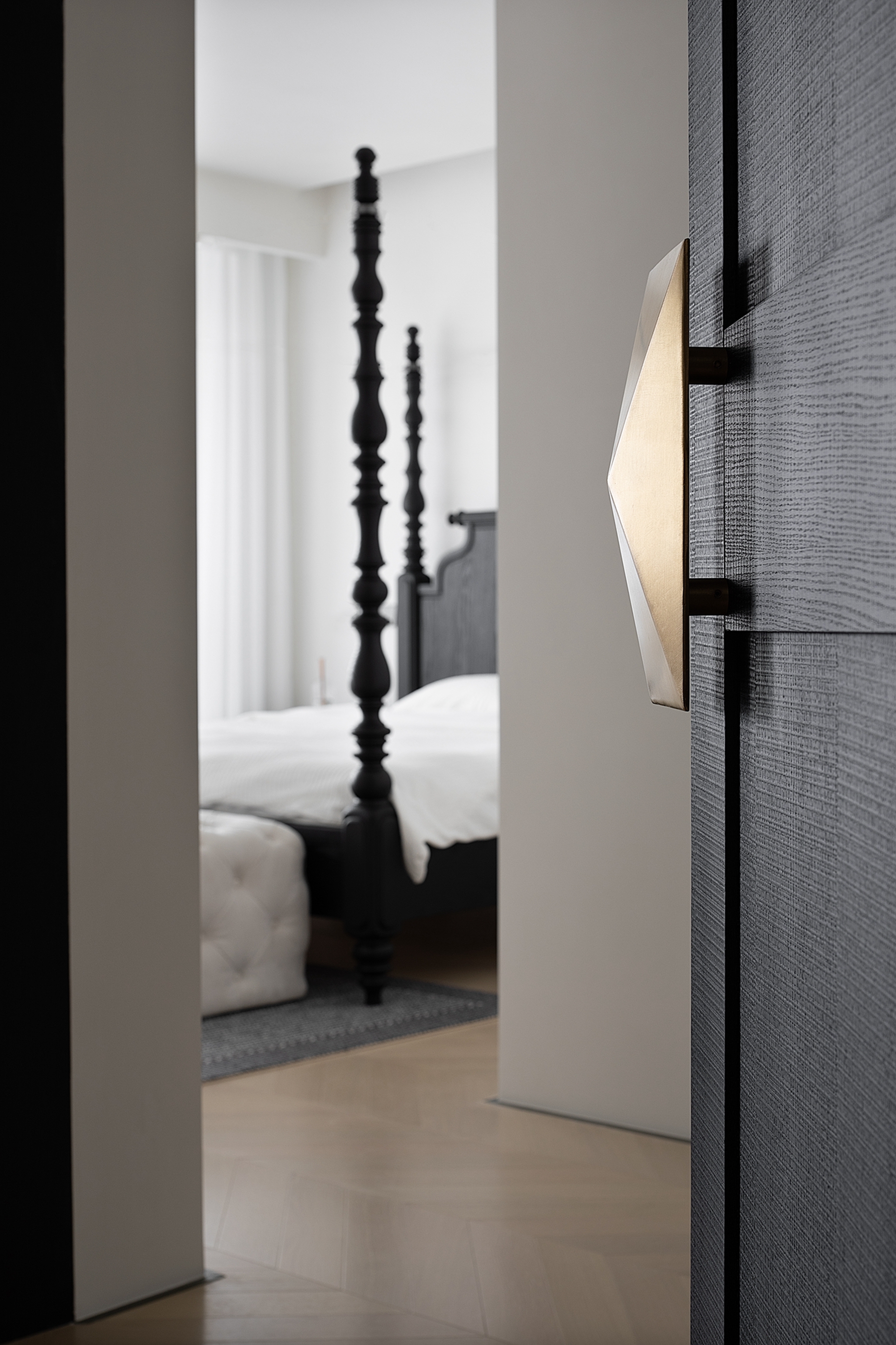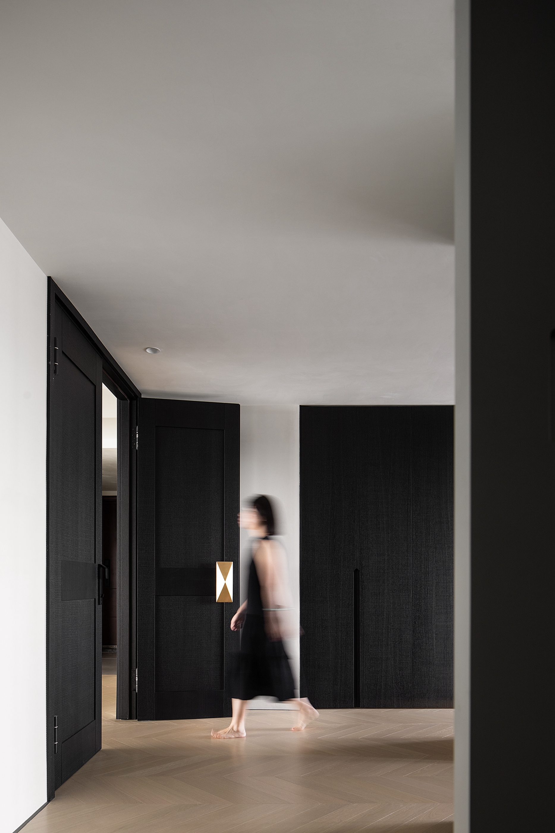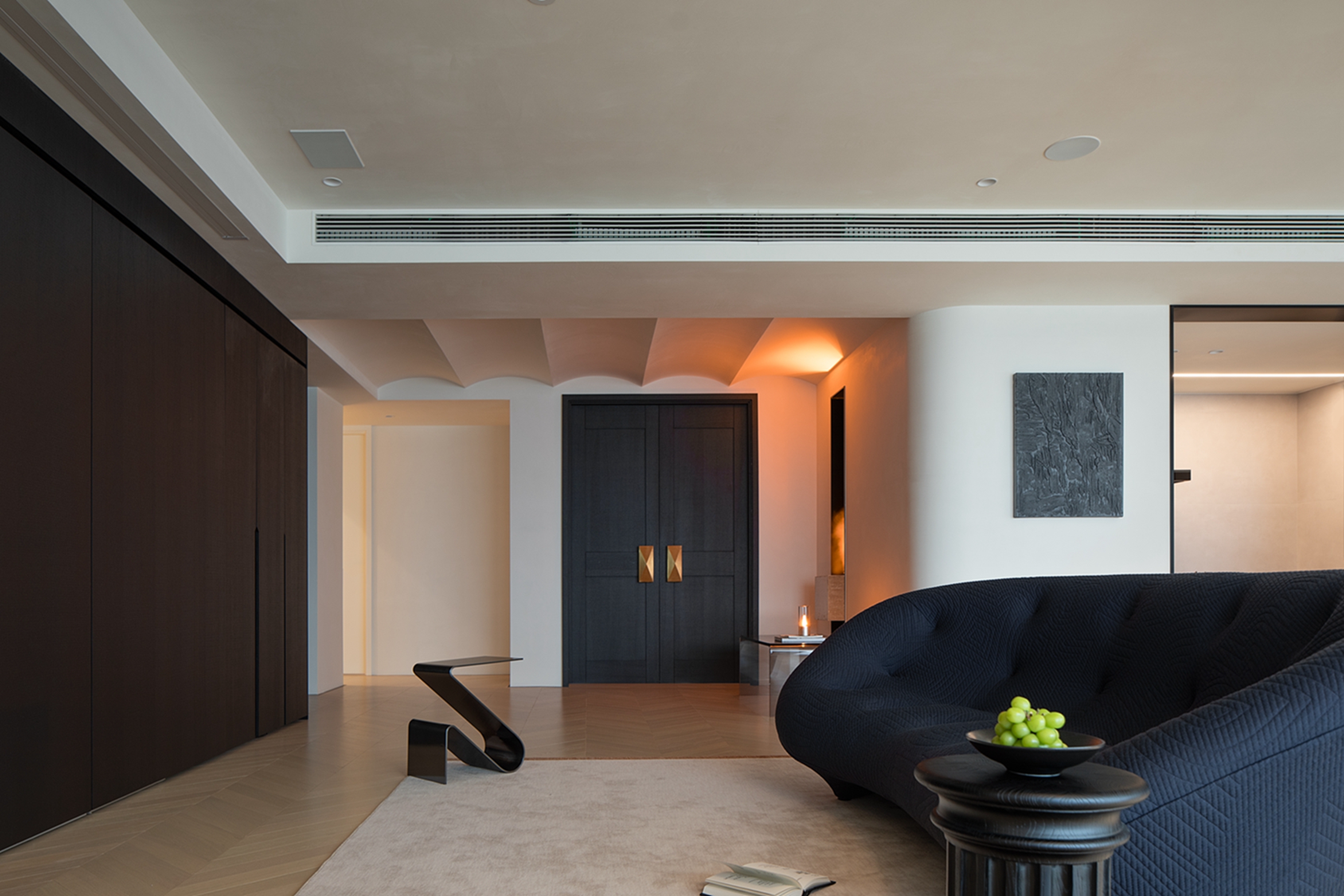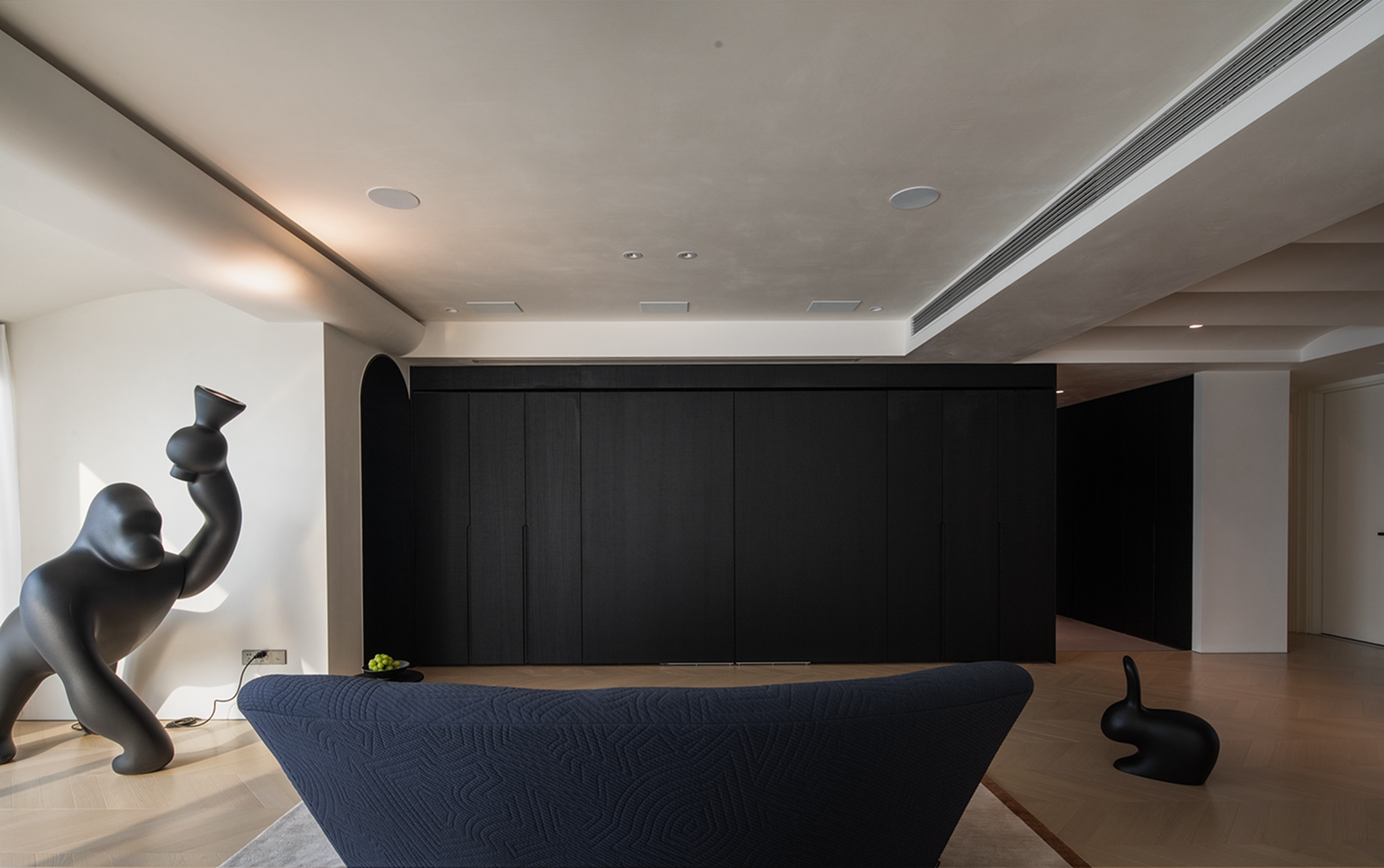 空间布局:迂回的动线让睡眠空间私密而安静。黑白的空间极尽简约,家具的线条是唯一的装饰,凝练几何的优雅灵动与组合变化,以细节打破空间的单调。