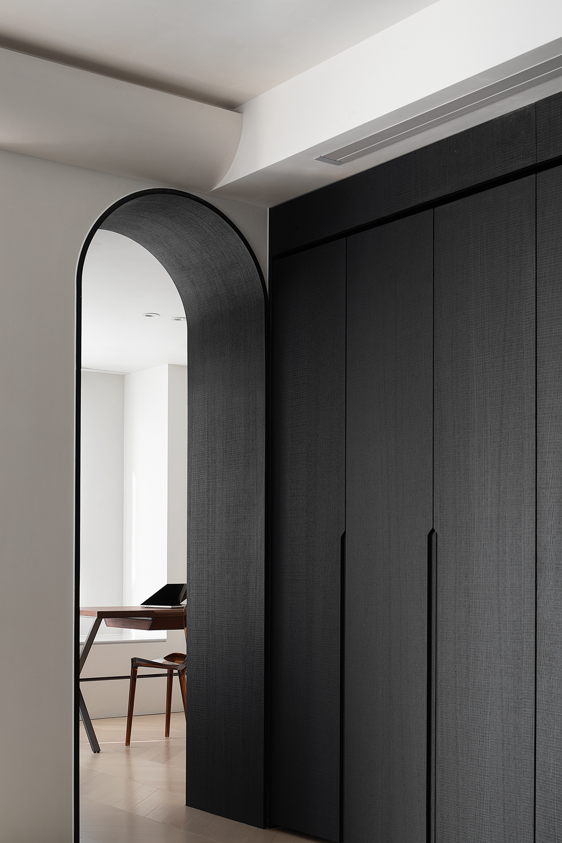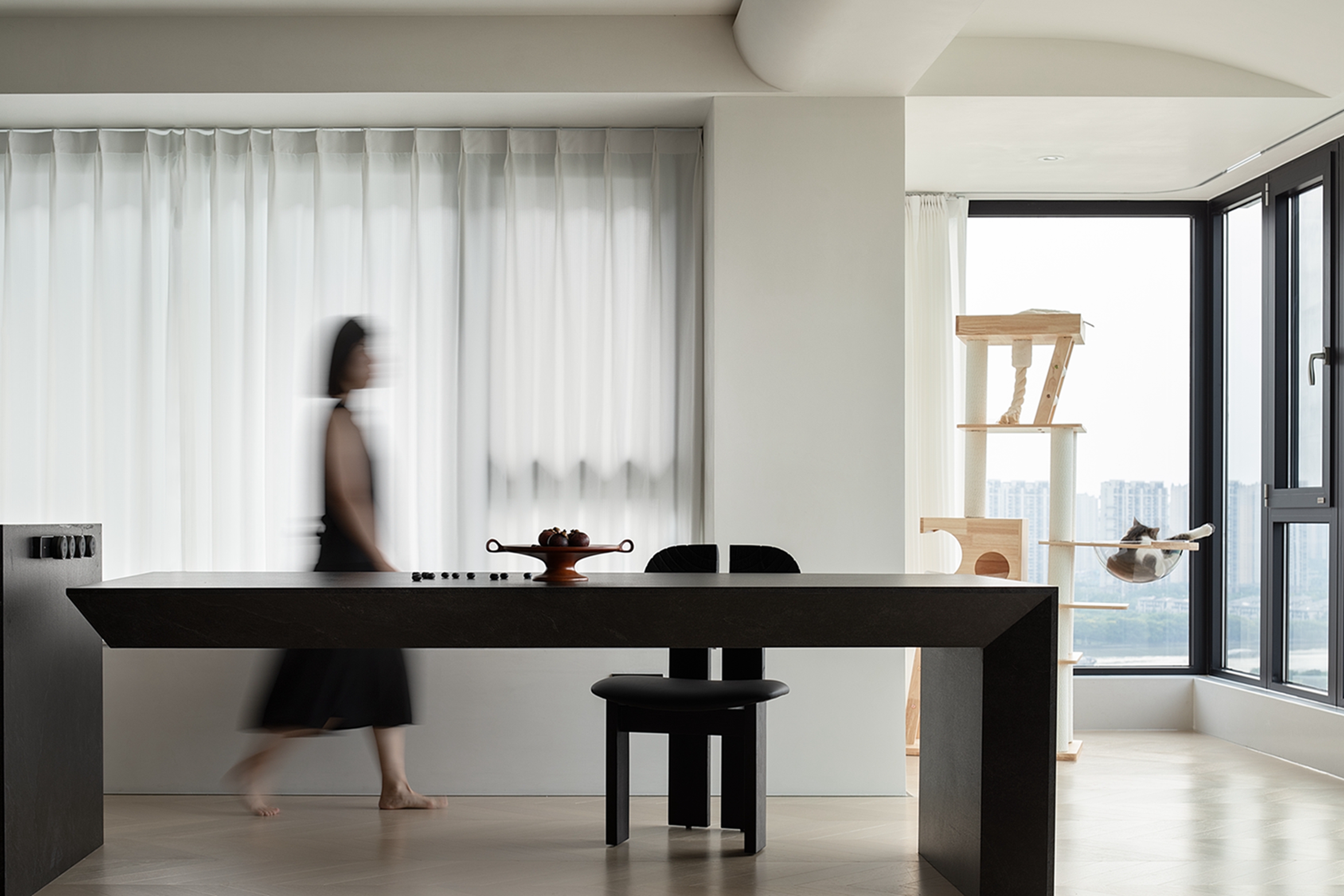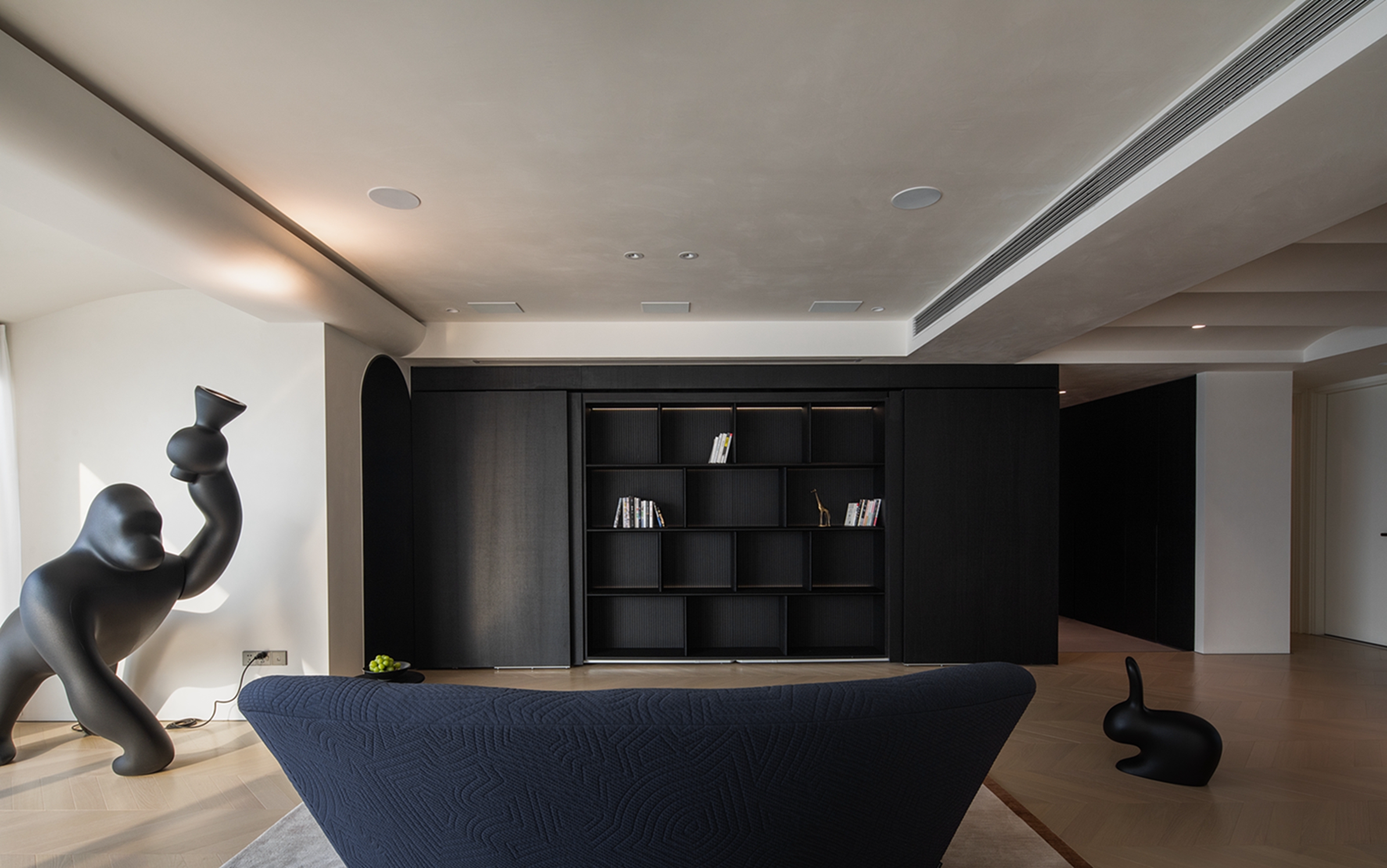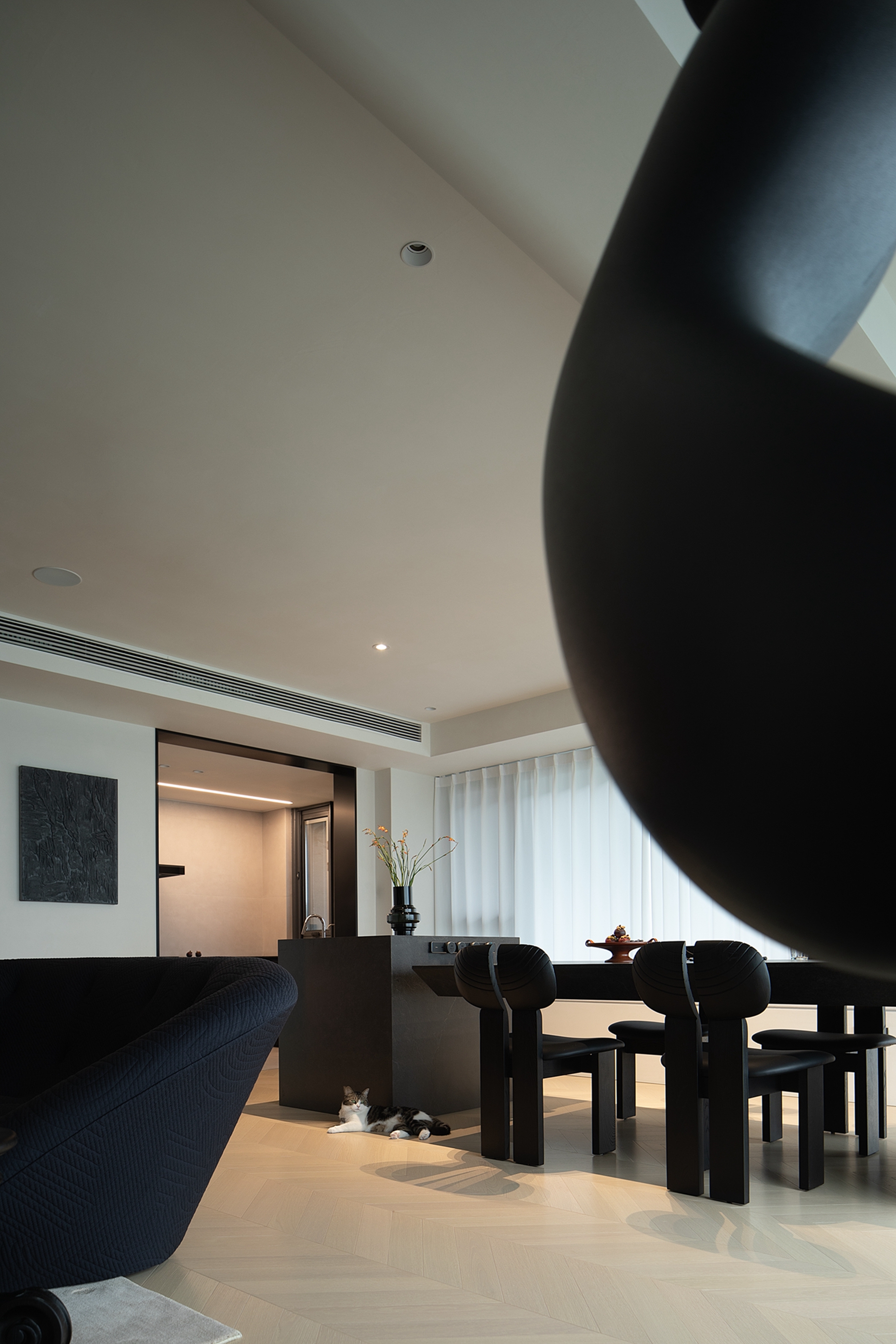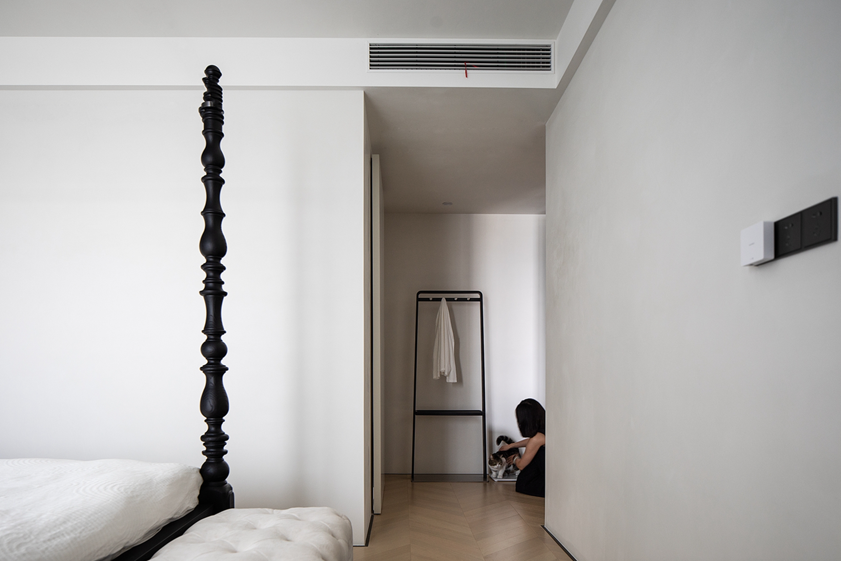 空间布局:迂回的动线让睡眠空间私密而安静。黑白的空间极尽简约,家具的线条是唯一的装饰,凝练几何的优雅灵动与组合变化,以细节打破空间的单调。