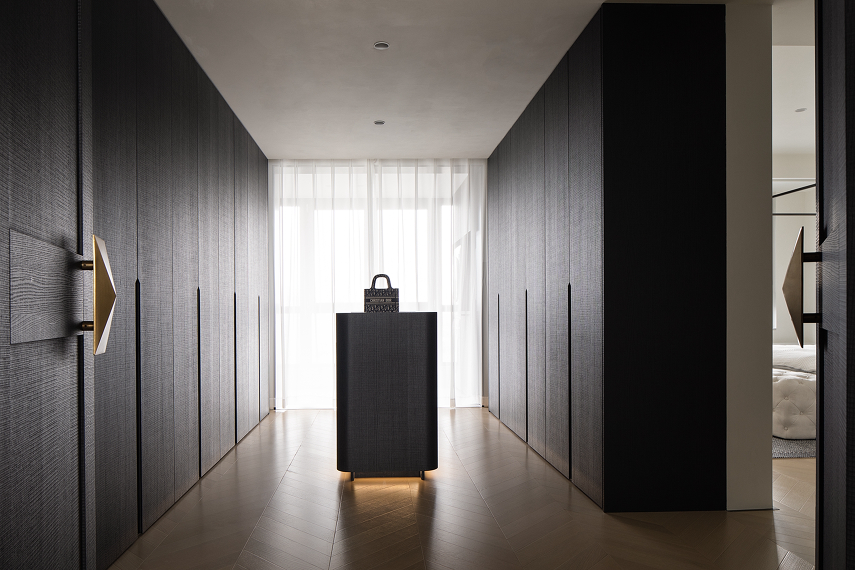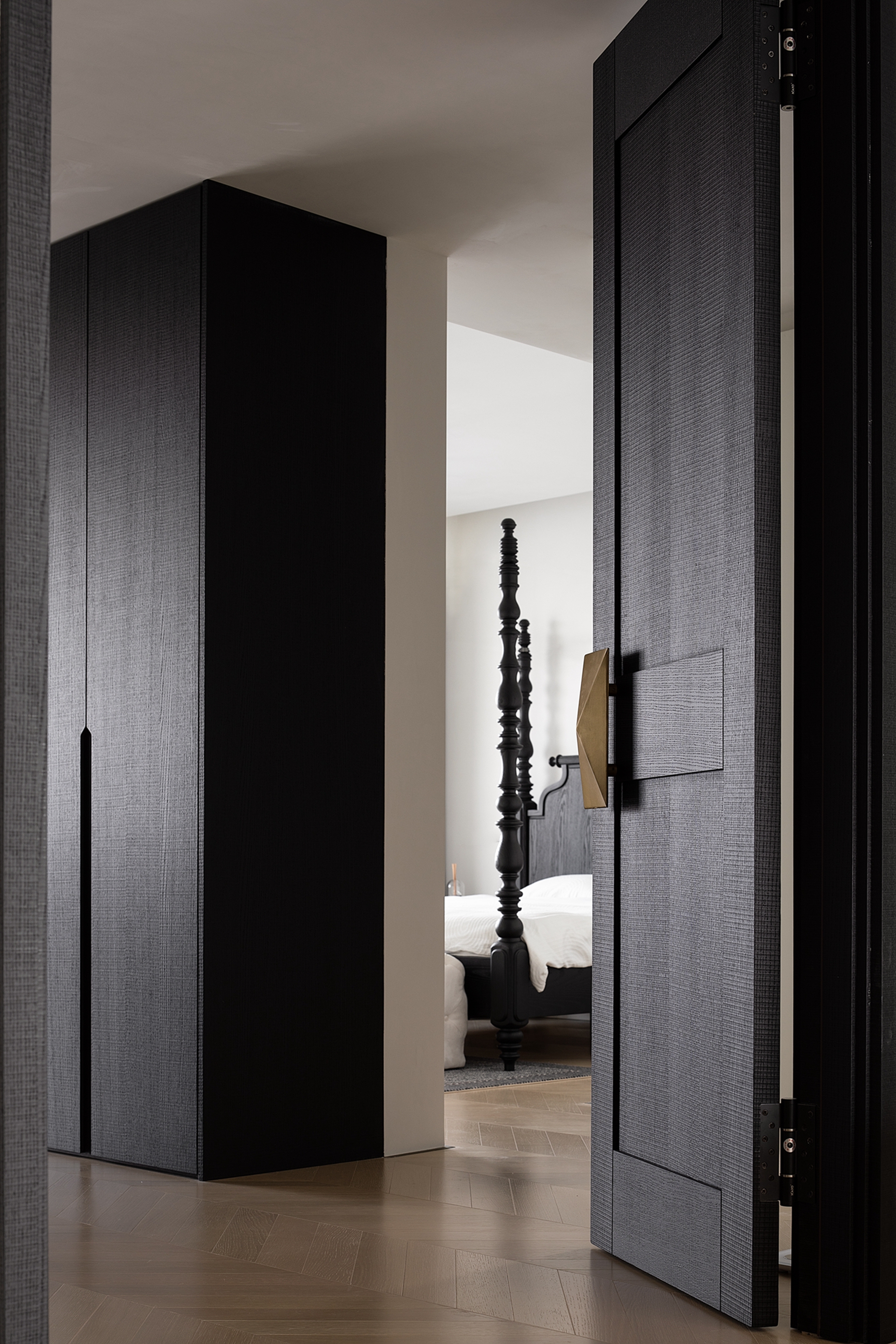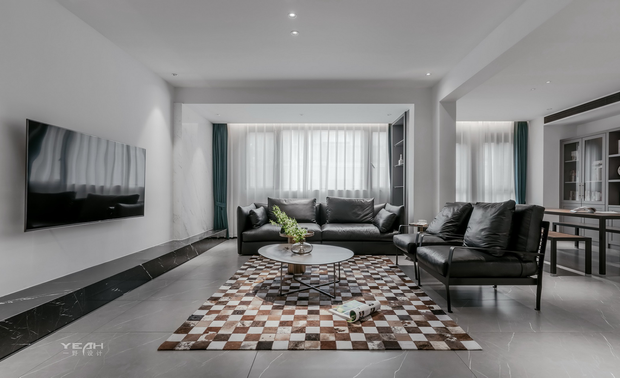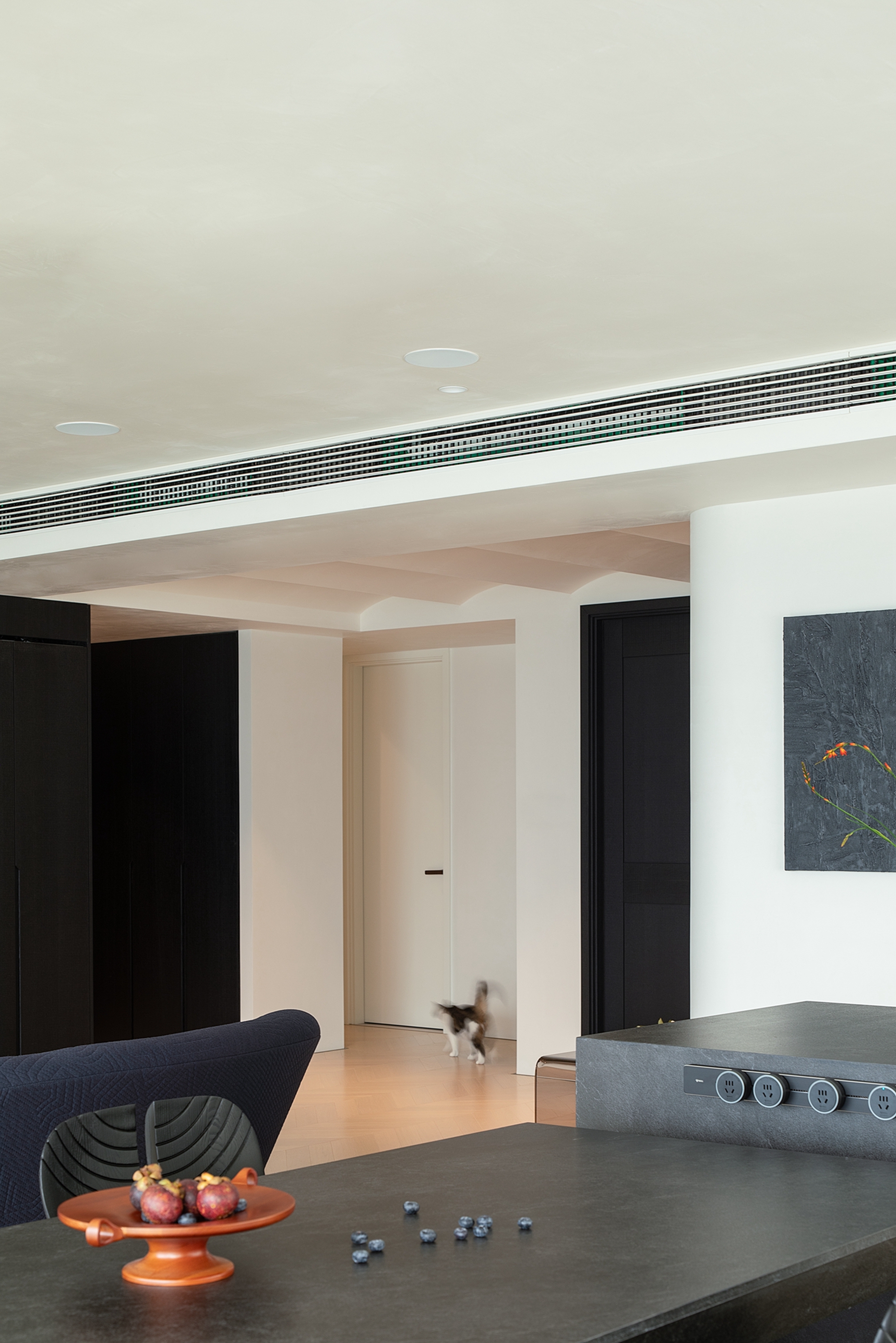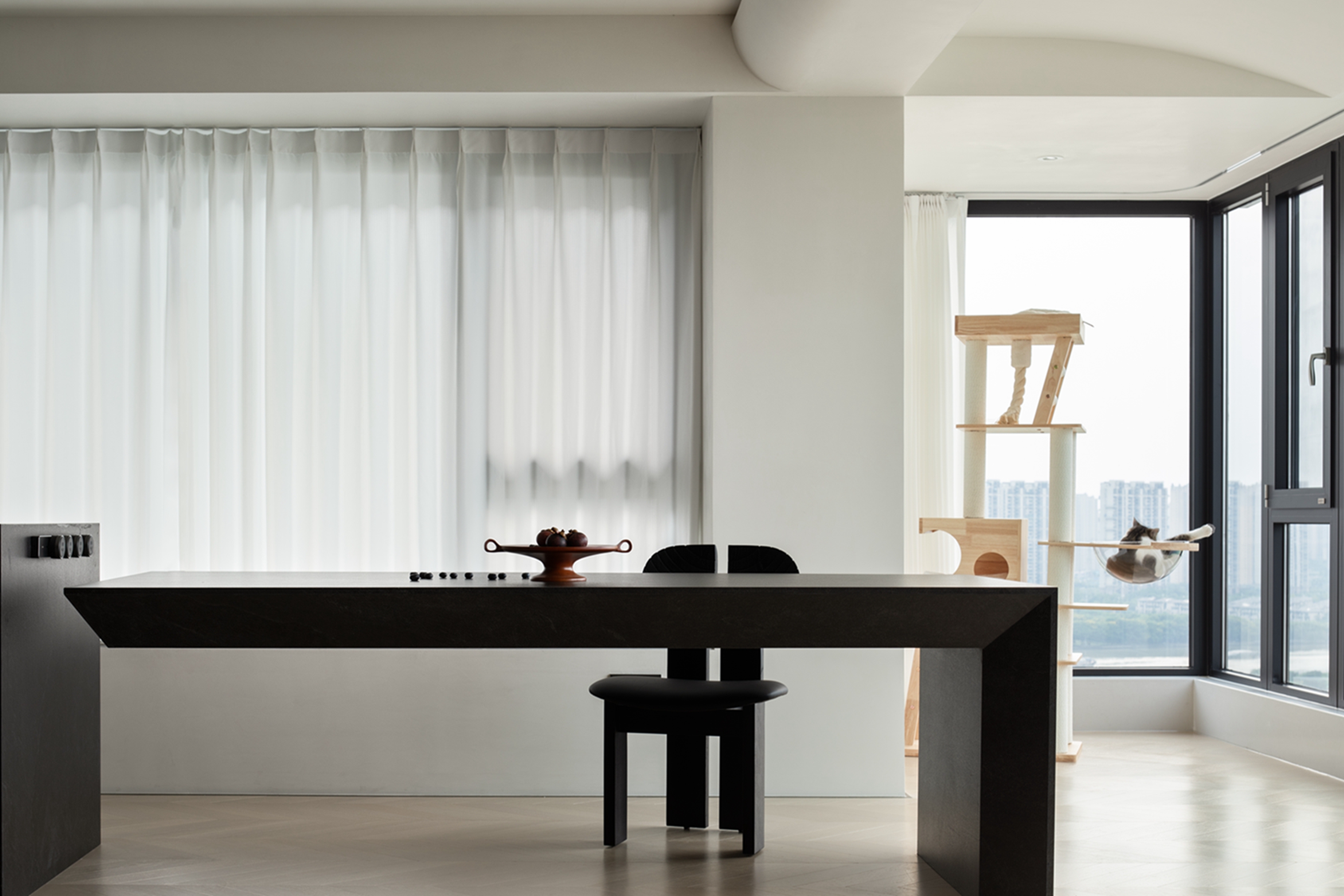 空间布局:迂回的动线让睡眠空间私密而安静。黑白的空间极尽简约,家具的线条是唯一的装饰,凝练几何的优雅灵动与组合变化,以细节打破空间的单调。