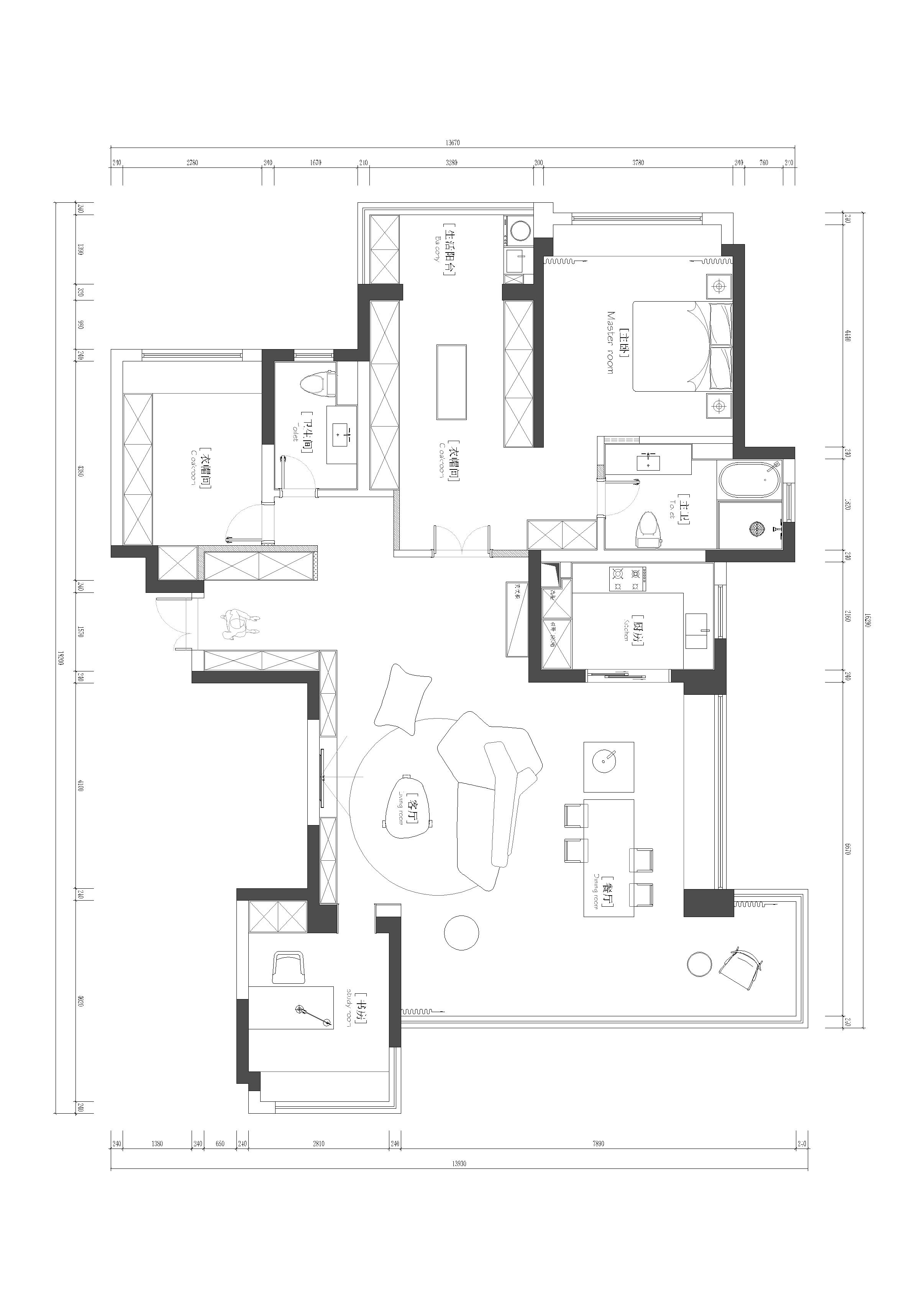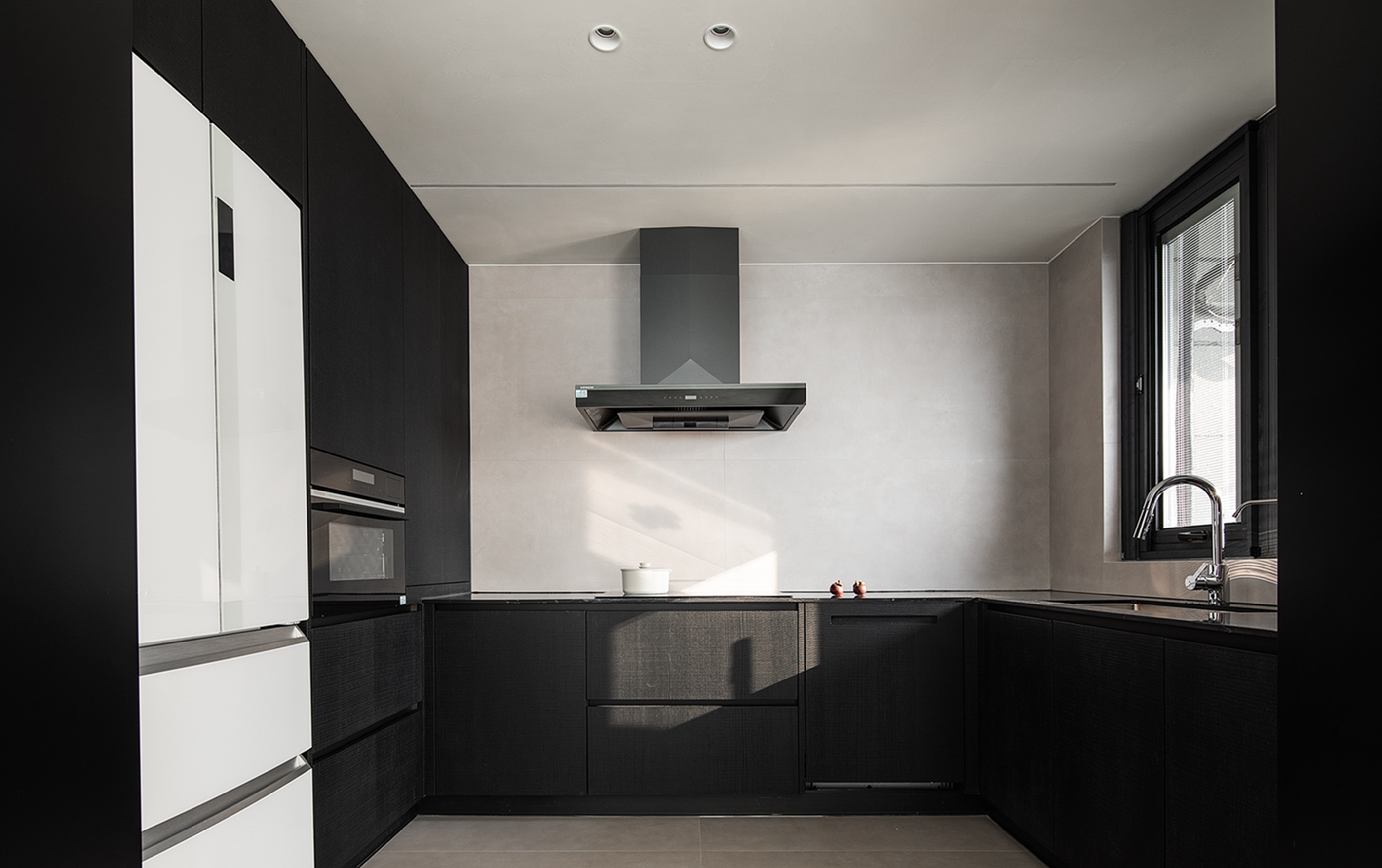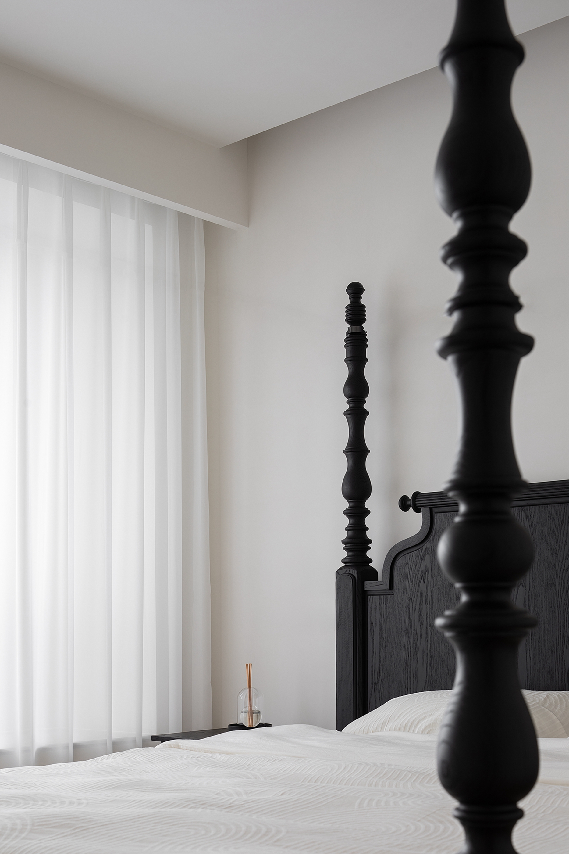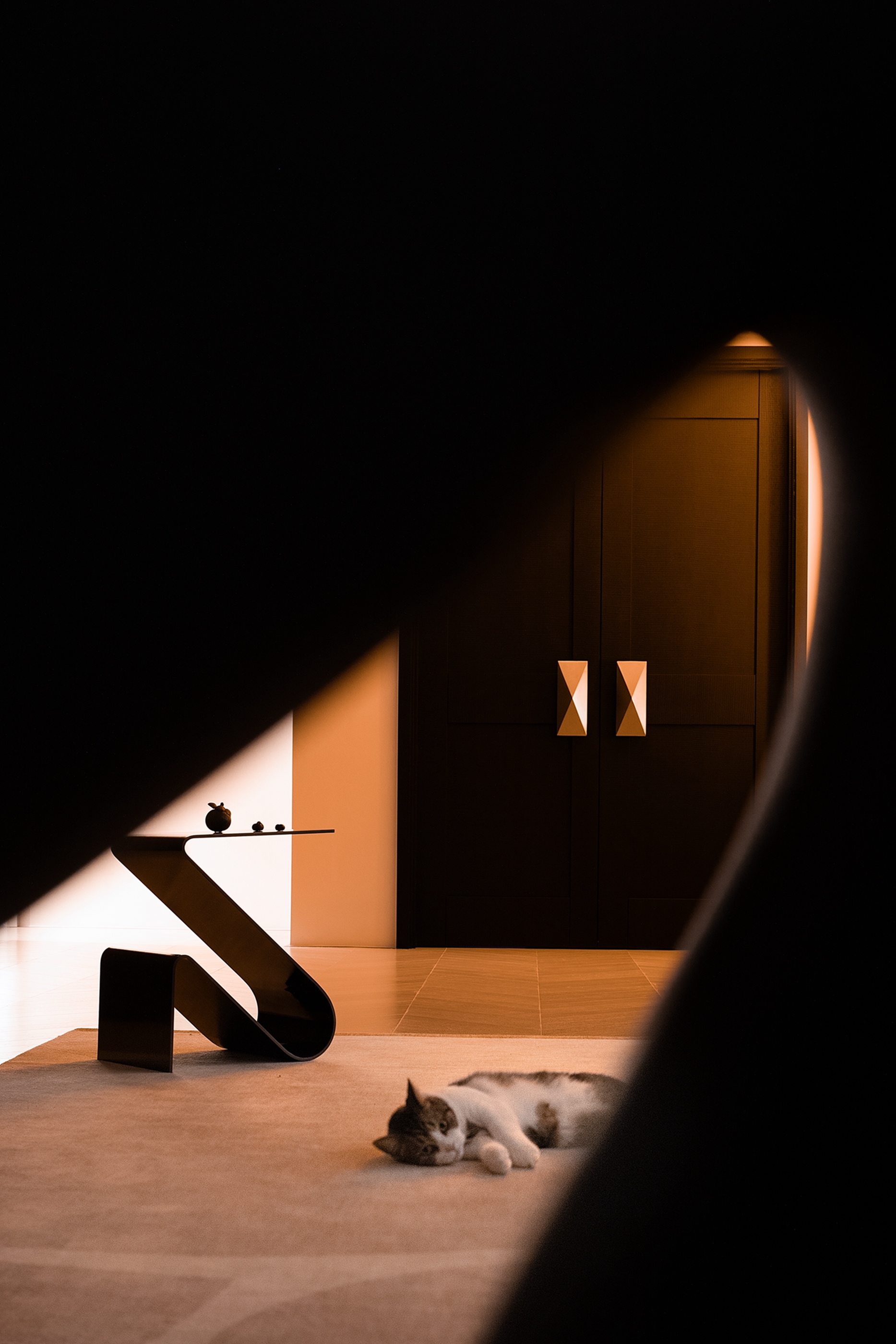 空间布局:迂回的动线让睡眠空间私密而安静。黑白的空间极尽简约,家具的线条是唯一的装饰,凝练几何的优雅灵动与组合变化,以细节打破空间的单调。