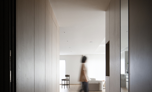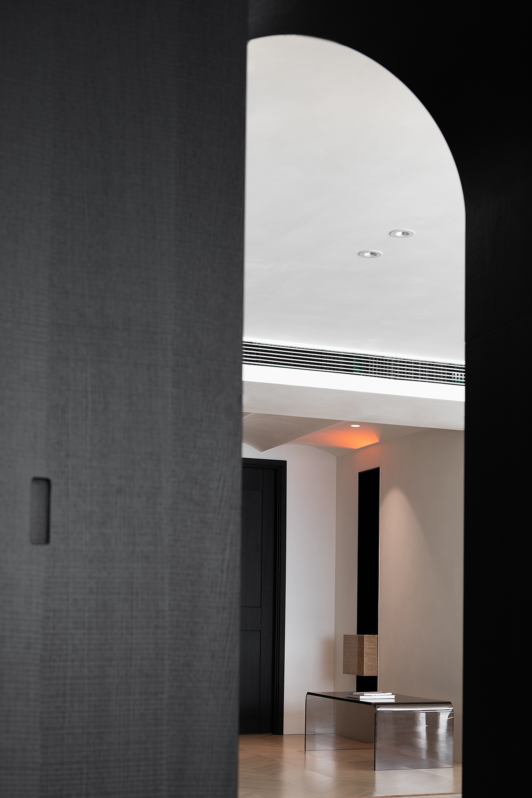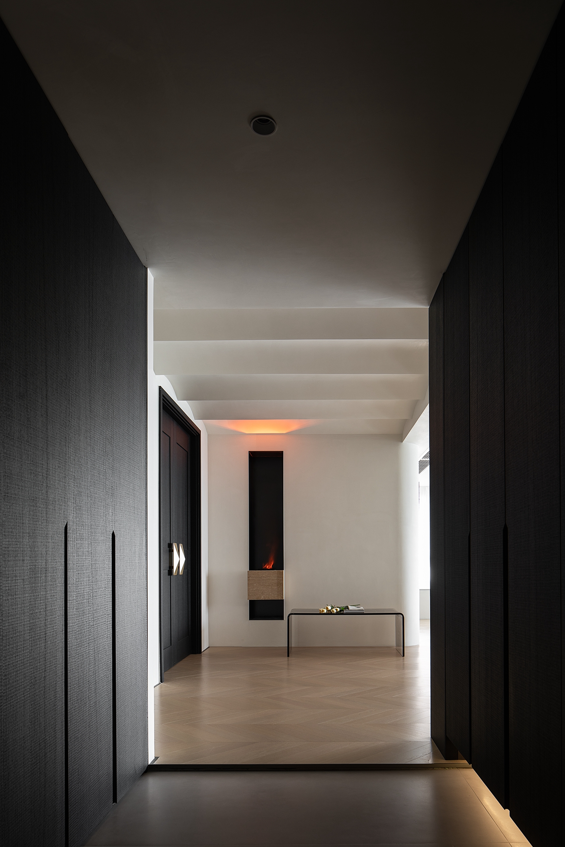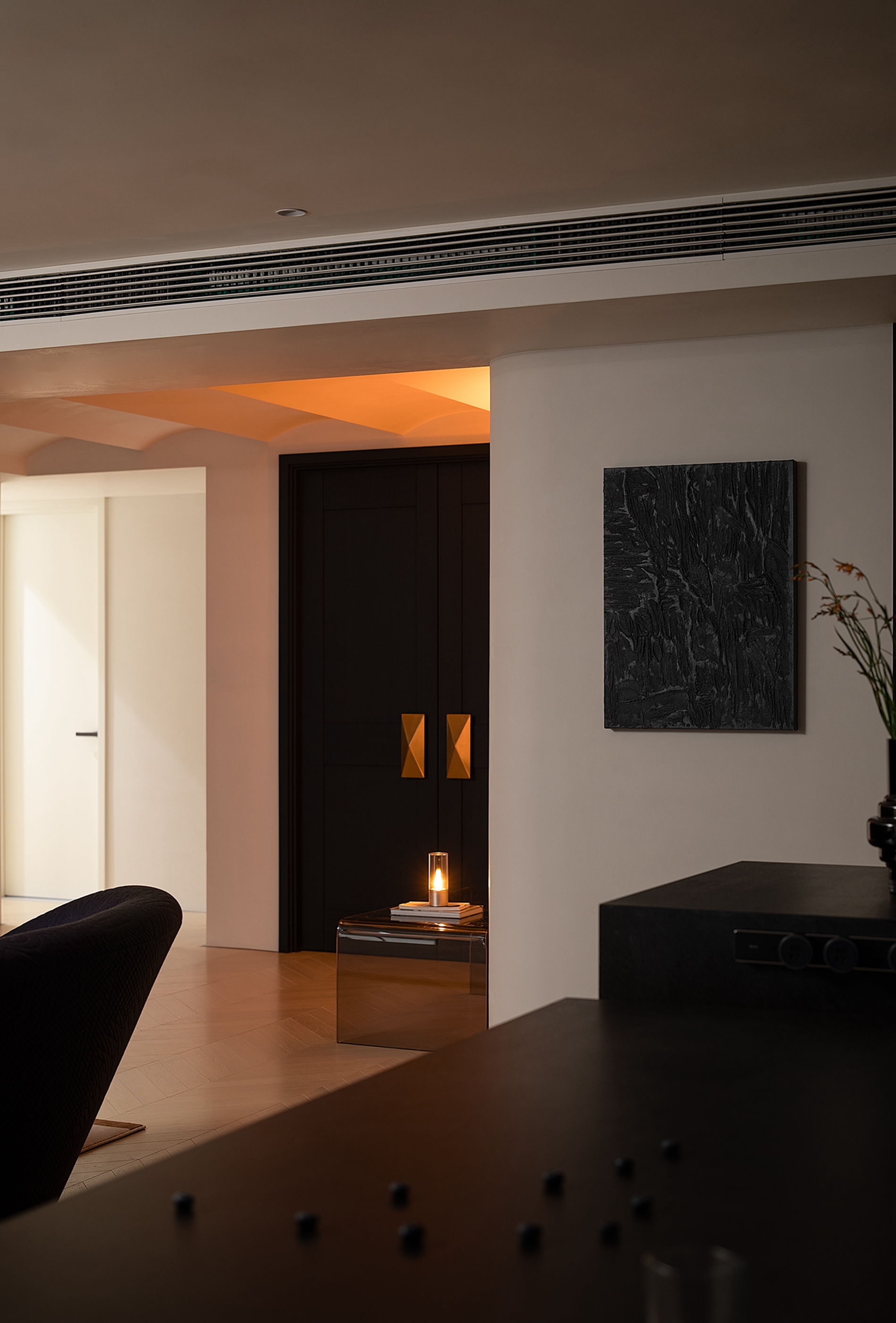 空间意境:入户从功能设计到空间氛围都给予回家最充足的仪式感。一盏散发着暖意的氛围灯,一缕摇曳的火光,与连绵的曲线一起,构筑温馨舒缓的氛围。同时利用走廊建立起充足的收纳空间,满足出入以及日常的多种需求