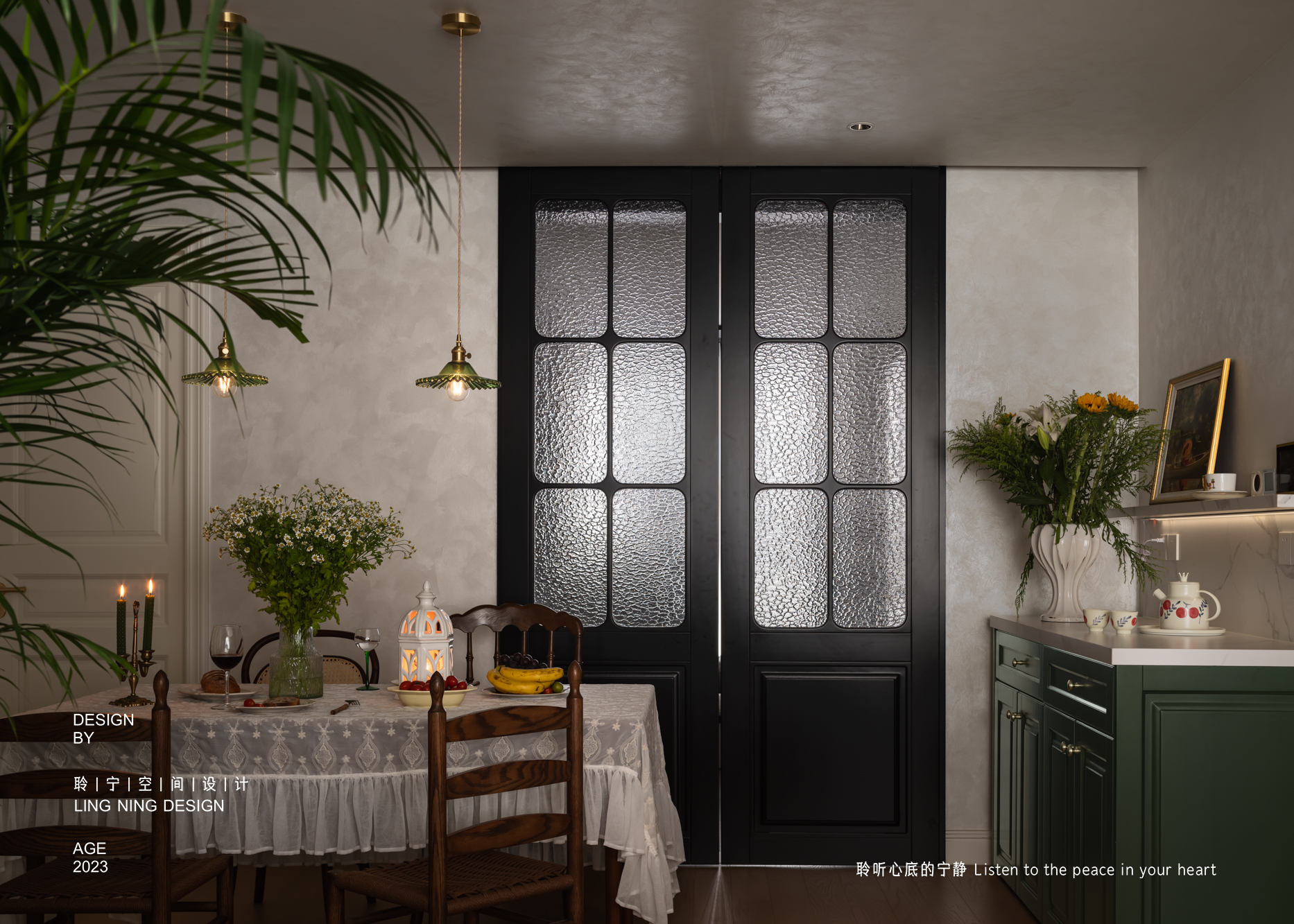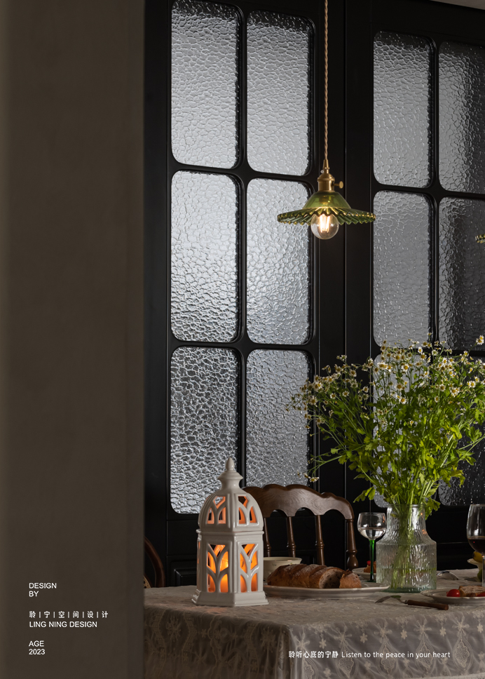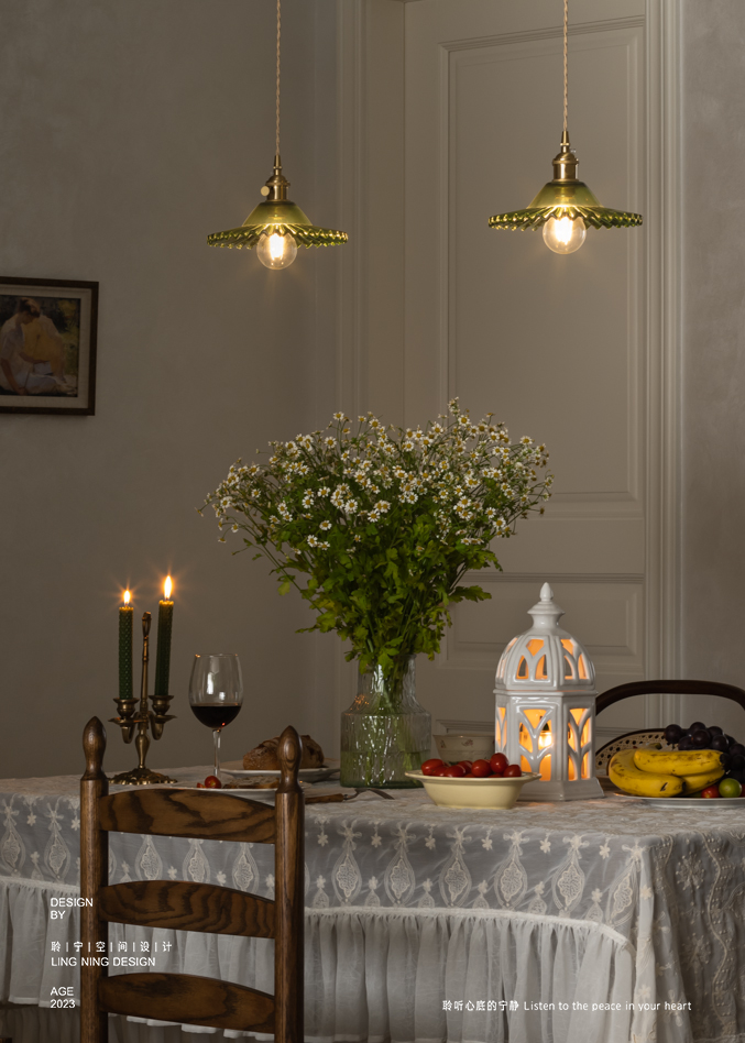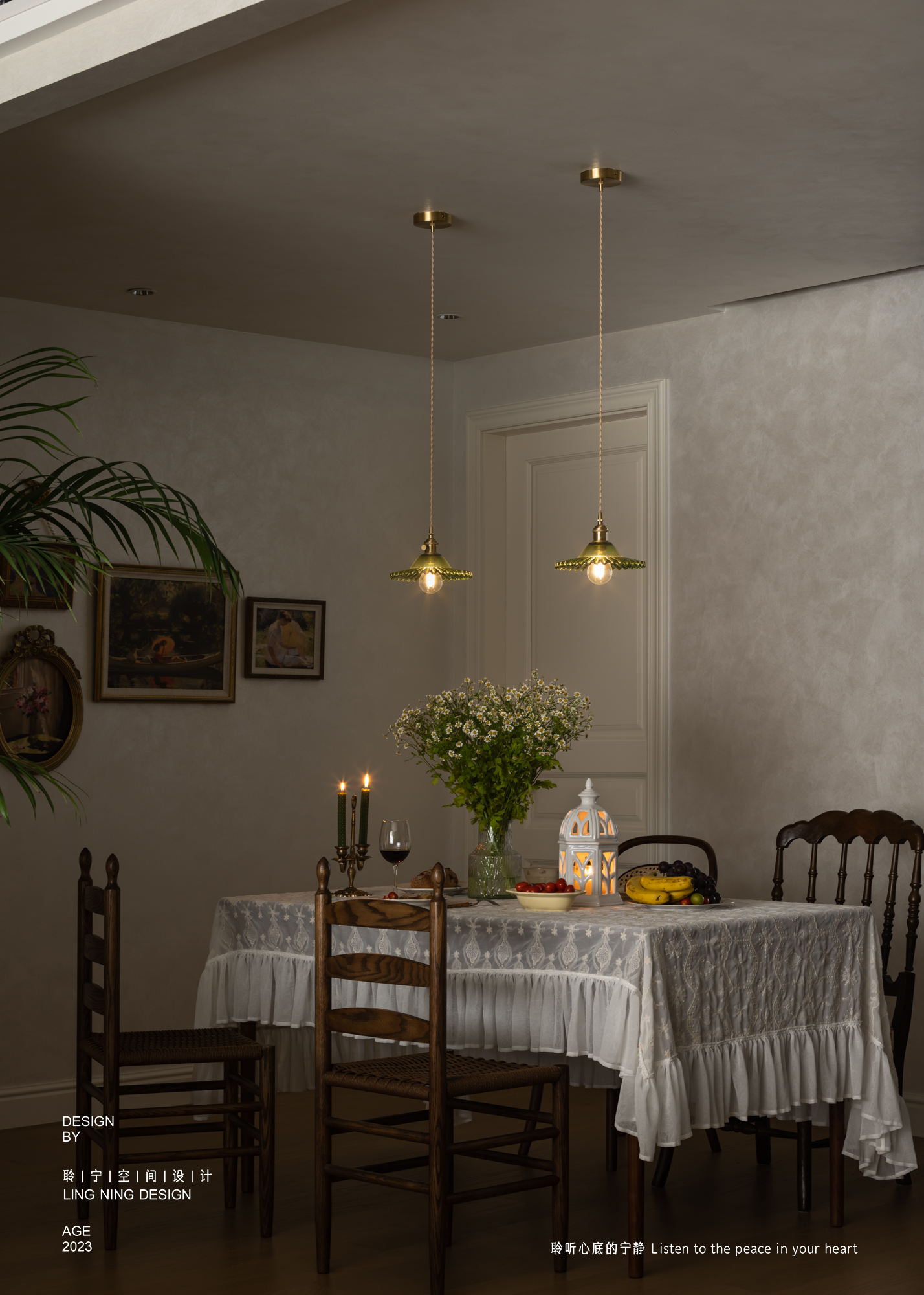 白色蕾丝桌布为餐厅蒙上一张柔情的面纱,软化了灰色系墙面带来的清冷质感。两盏复古琉璃吊灯,将餐厅的精致度拉到另一个层次。 -