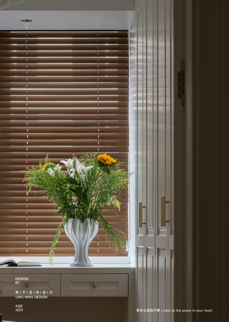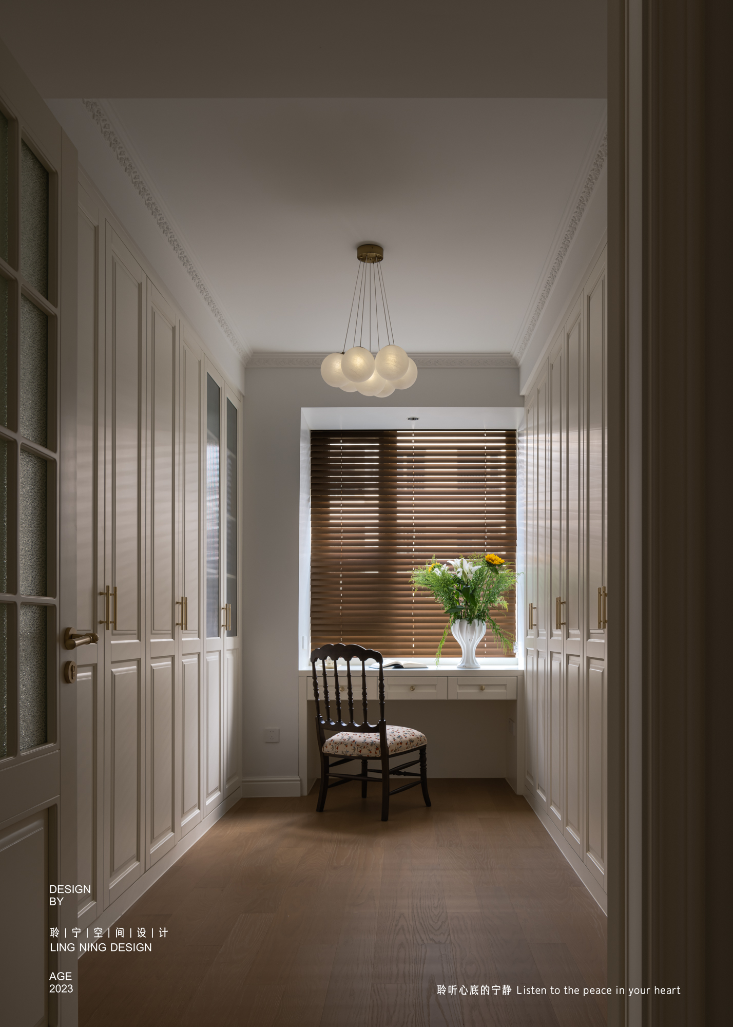 衣帽间两侧的定制柜留足了充分的收纳空间,简约大方,尽头放置梳妆台,木质百叶窗既增添了自然气息又柔和了光线,实现从头到脚的精致。 -