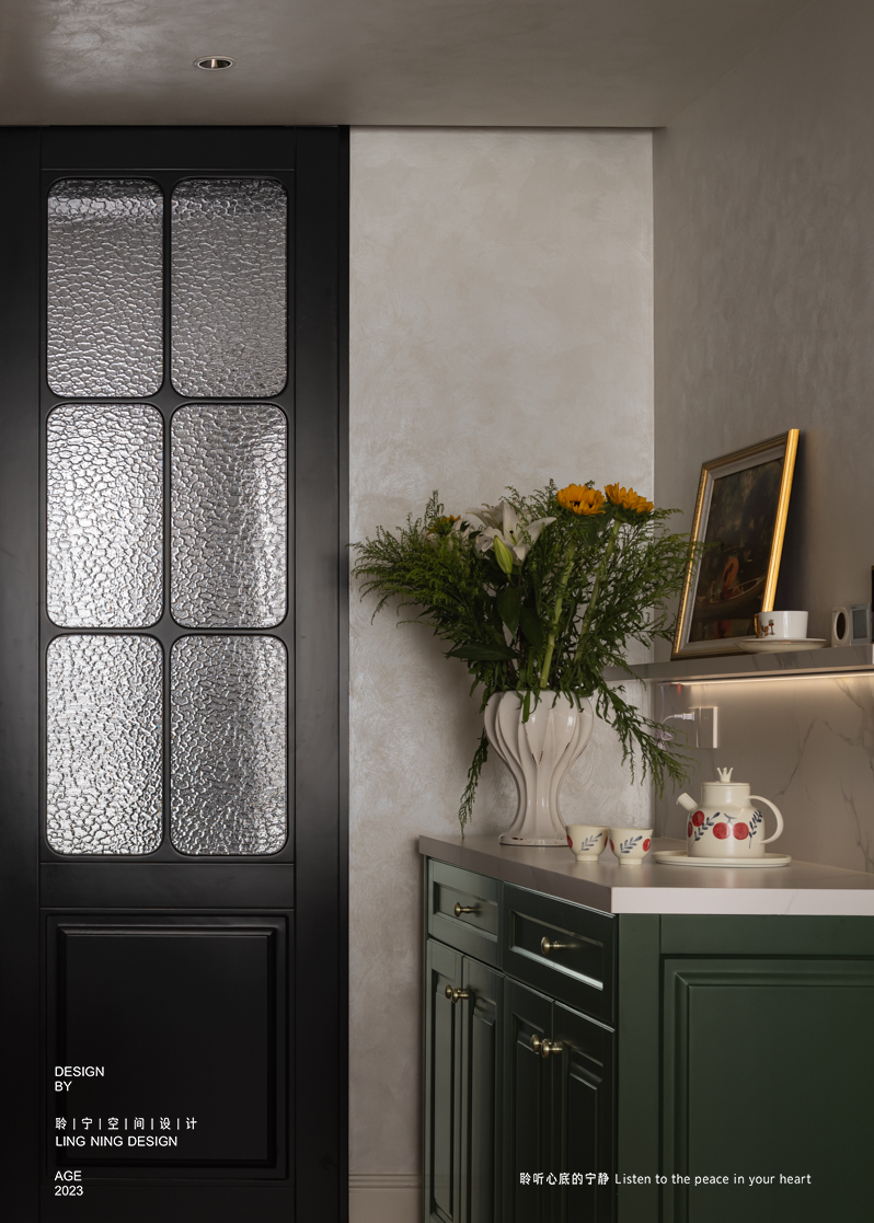 客厅与餐厅之间设计拱形垭口,配合厨房的艺术玻璃门,休闲、就餐,行走之间宛如穿梭于上世纪画廊。
