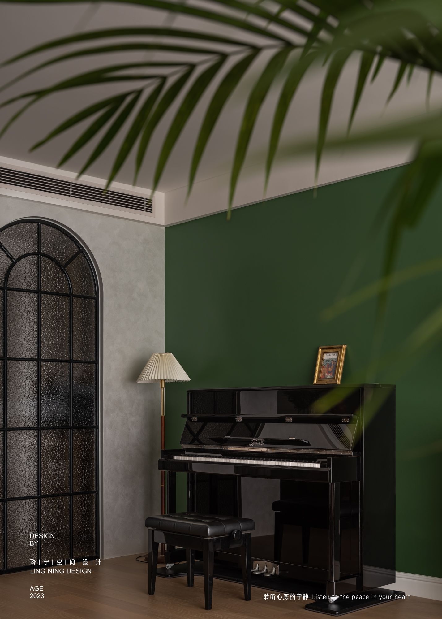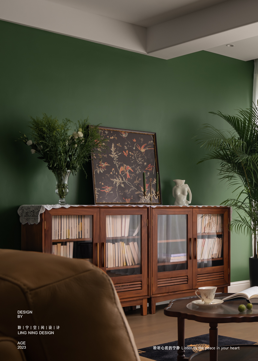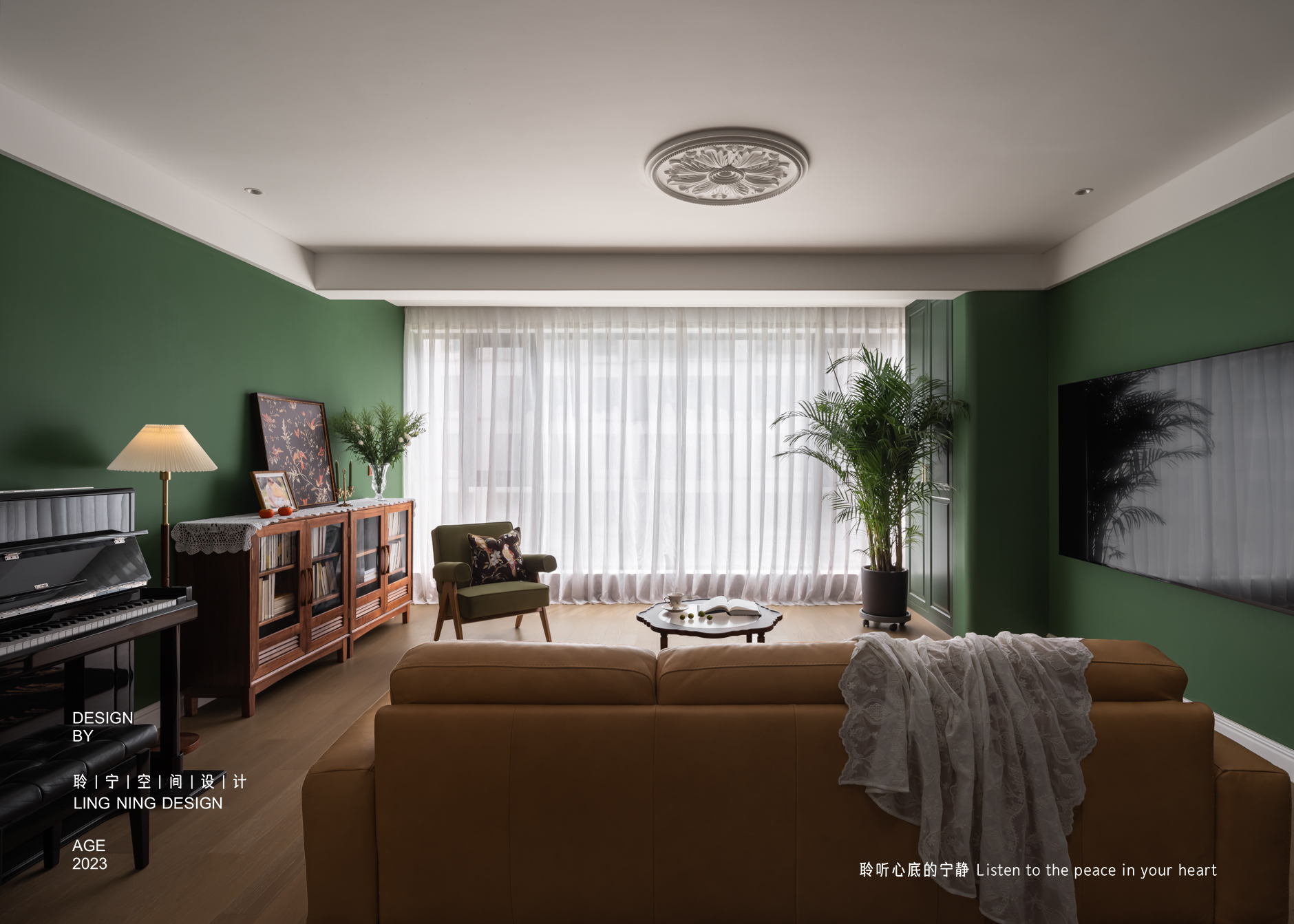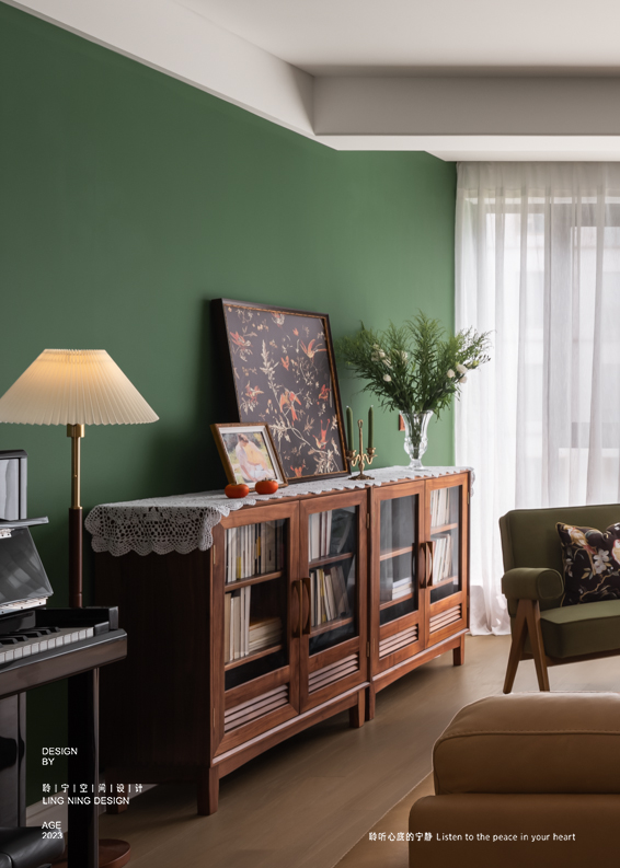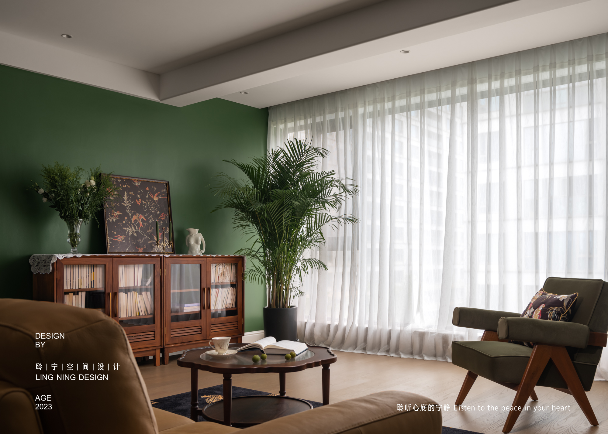 客厅连接阳台,开阔了客厅视野,大型的落地窗让整个空间的自然采光效果拉到了满分,增强了空间的通透感,在复古绿墙之中营造了一方明亮的轻盈空间。