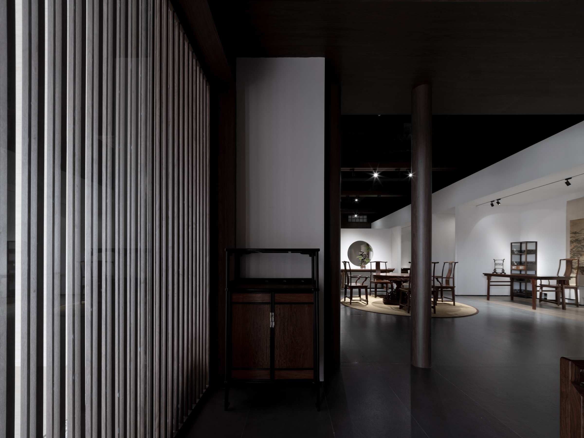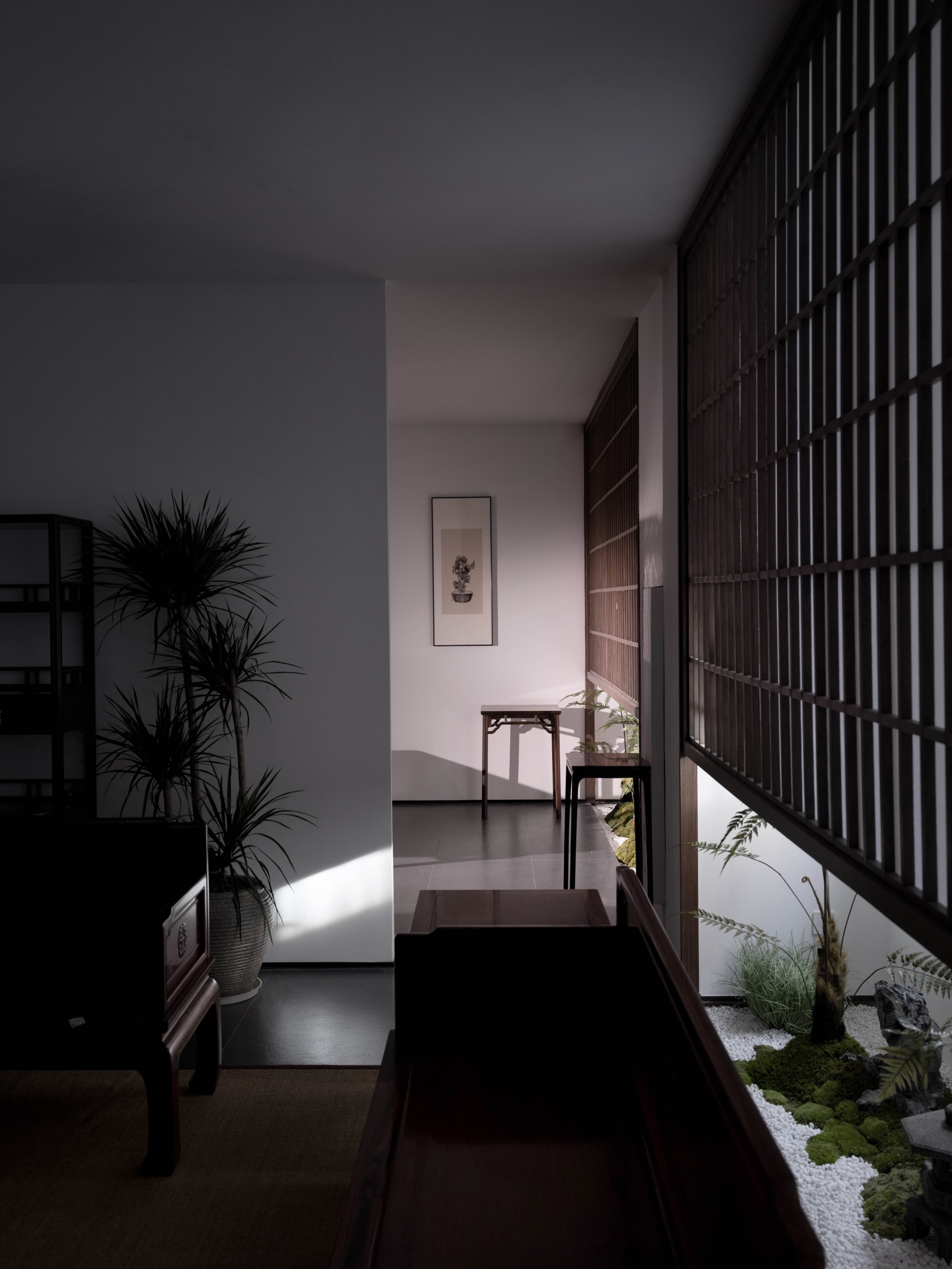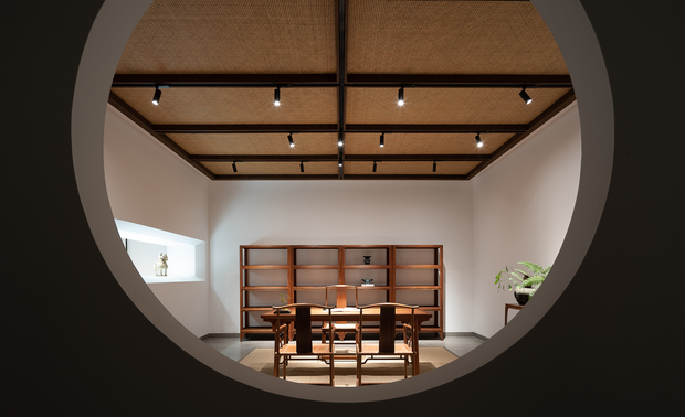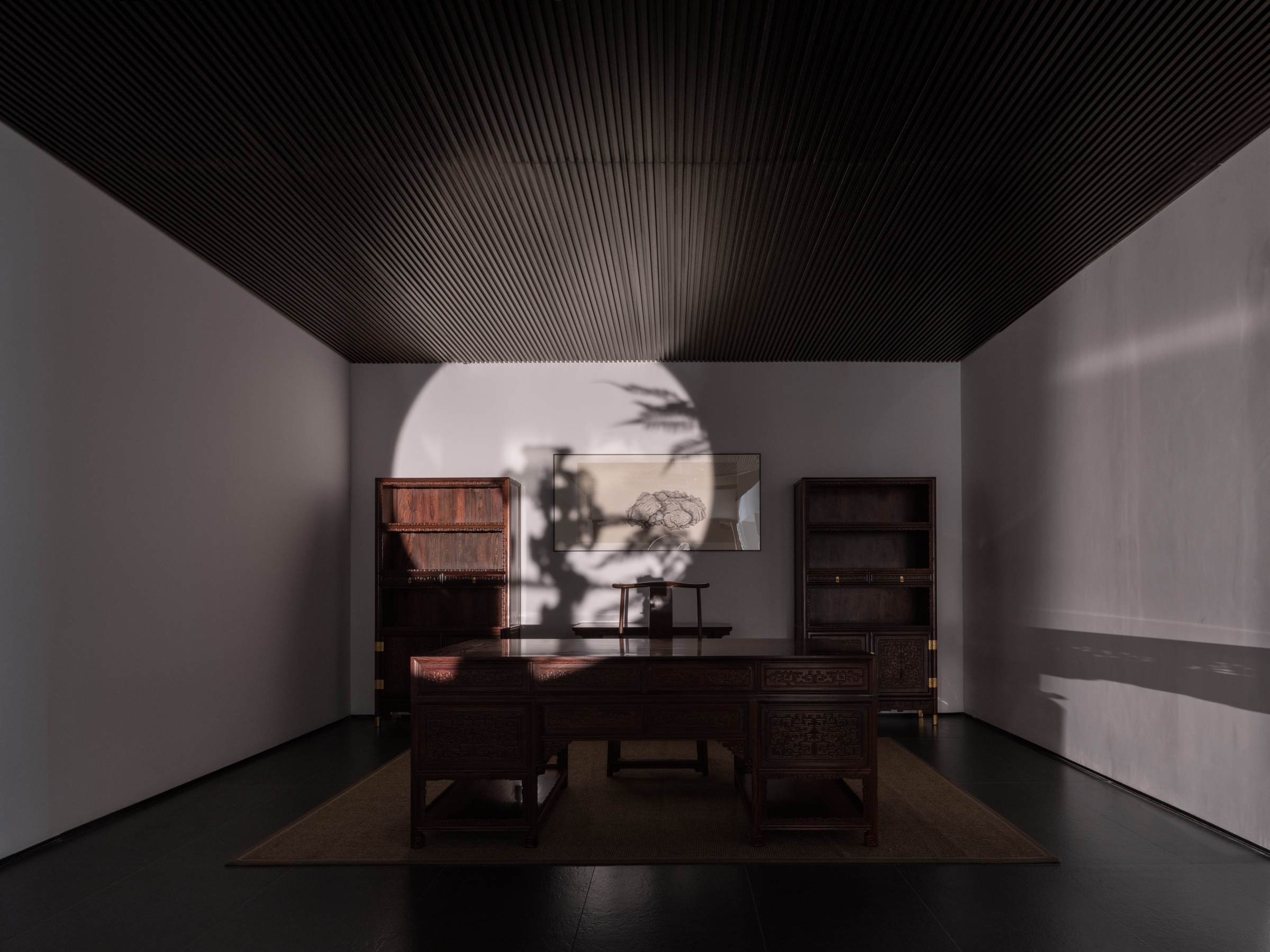 我们根据品牌的调性与高端定位,在展厅设计上,以故宫的平面布局为灵感,奠定空间庄严的基调,塑造秩序之美,体现礼序与尊崇感;同时结合江南园林的围合手法,以小见大,在有限的空间里创造无限的自然气韵,呼应苏作家具诞生地的文脉,以产品背后的文化加深来宾对产品和展厅的理解。