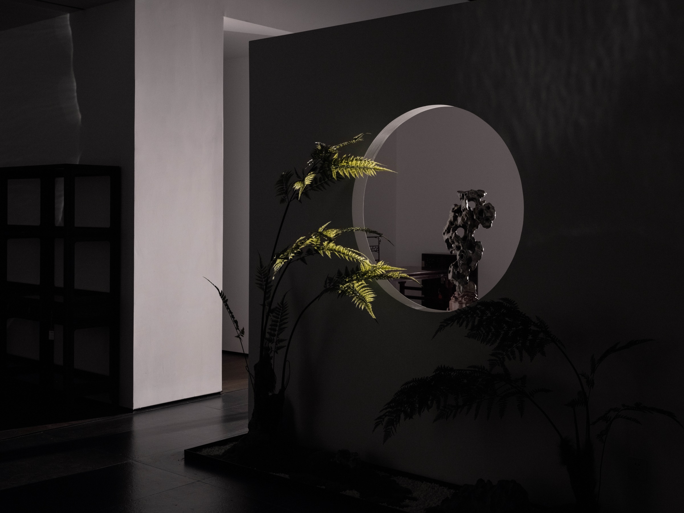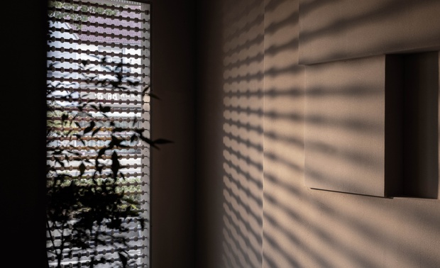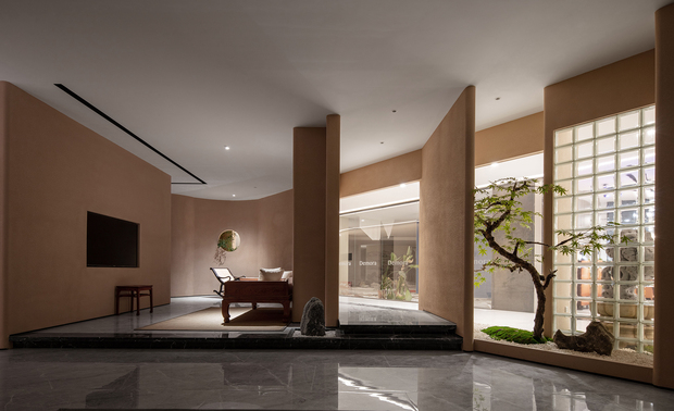 展厅以走廊为中轴,布局上下、左右互为镜像;场景的家具摆放也遵循对称的格局,梳理出空间的秩序,将整个展厅塑造得庄重,彰显品牌骨子里的严谨中正。设计遵循“道法自然”的哲学思维,化韵于境,演绎自然真意。内部墙壁以木格栅搭配半透明玻璃的形式呈现,不阻碍光线的流动。格栅与外墙之间用山石植物造景,下部的空隙与朦胧的玻璃共同营造树影浮动、半明半暗的视觉效果,“犹抱琵琶半遮面“的朦胧意境油然而生。