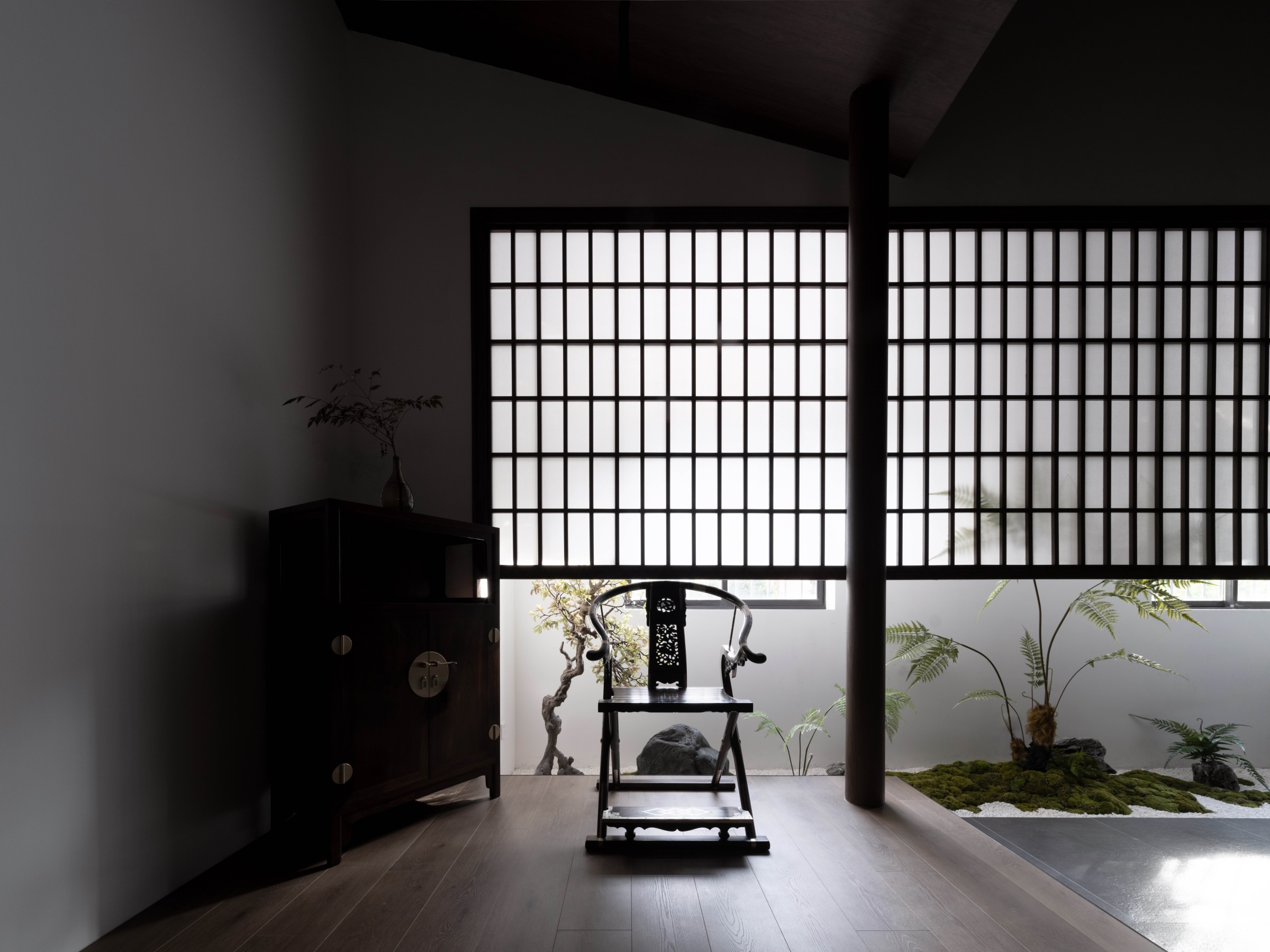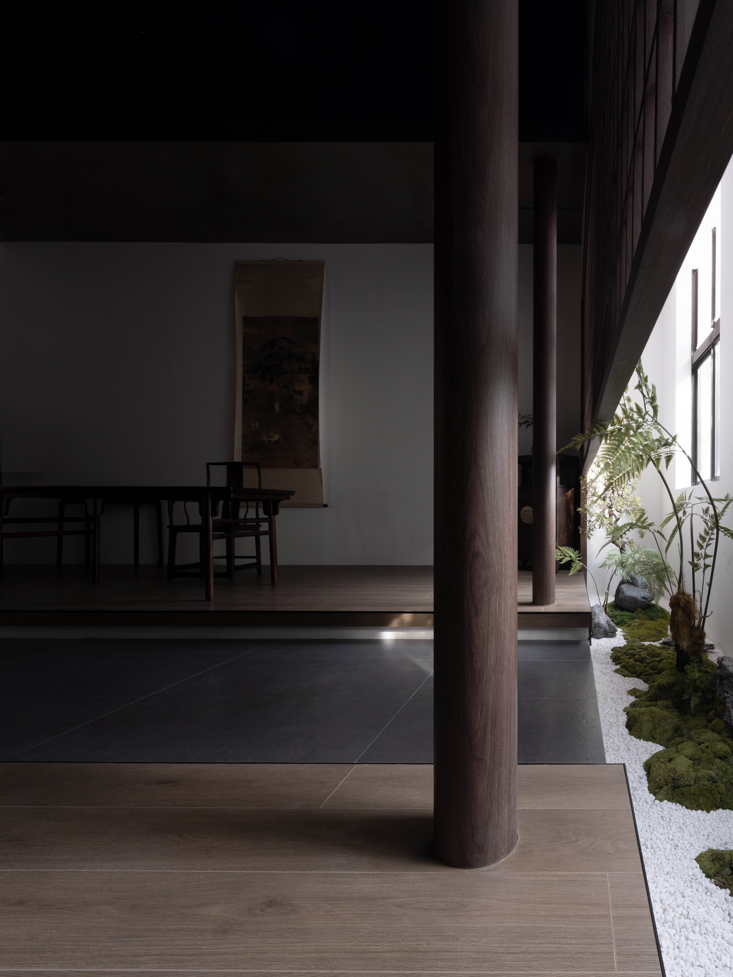 在室内搭建出墙壁、屋檐、亭台,将建筑结构运用在室内,让空间剥离外界环境的干扰,自成一方天地。漫步其中,廊腰缦回,亭台有序排列,宛如一个完整的小园林,视觉效果统一,淋漓尽致地演绎园林的意境和精神气场。我们在空间搭建假梁,并在内部设计灯光,解决空间的照明问题。序列重复的梁柱同时装饰空间,让室内的结构更趋于完整。门窗是园林设计的一种重要表达手法,代表视野、格局的变化,用简约的几何线条塑造丰富的景深,让空间移步换景,互为映衬。未入空间,先见其景,意境之外更多了一丝神秘感。
