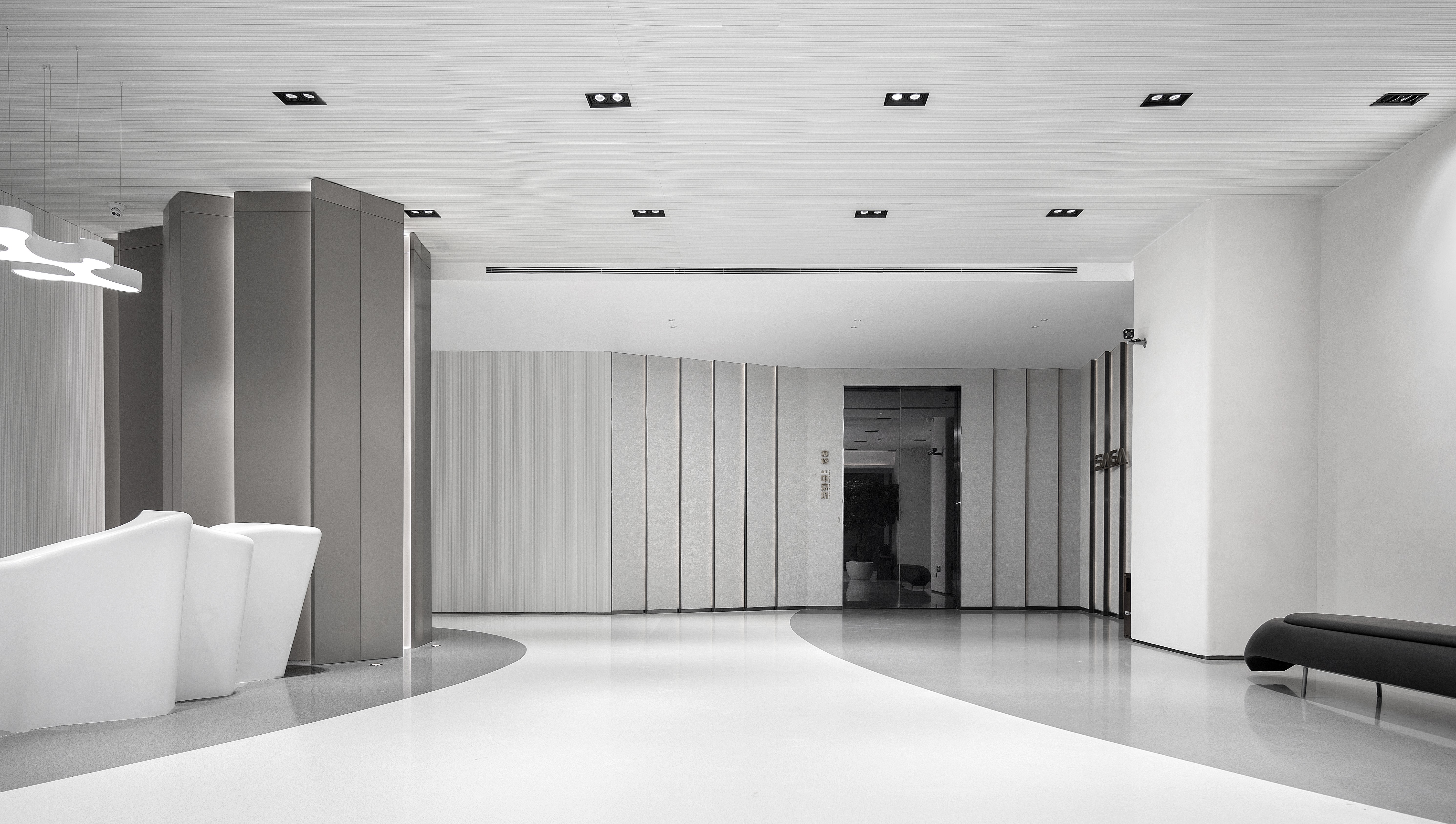 在地面选材上,呼应空间调性,选用新型金磨石材料,其优点是绿色环保再生,整体无缝,基本能做到与建筑同寿命,是一种极能展现现代艺术风格的地面材料。