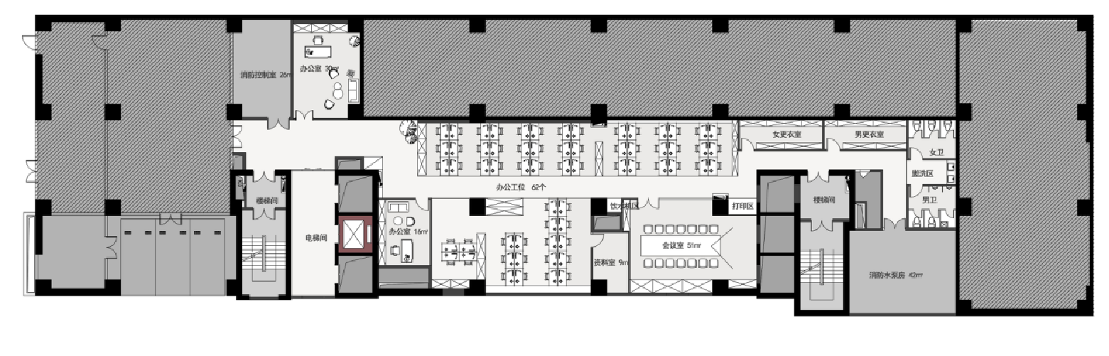 -1F 办公室、会议室、男更衣室、女更衣室、 资料室、公共卫生间