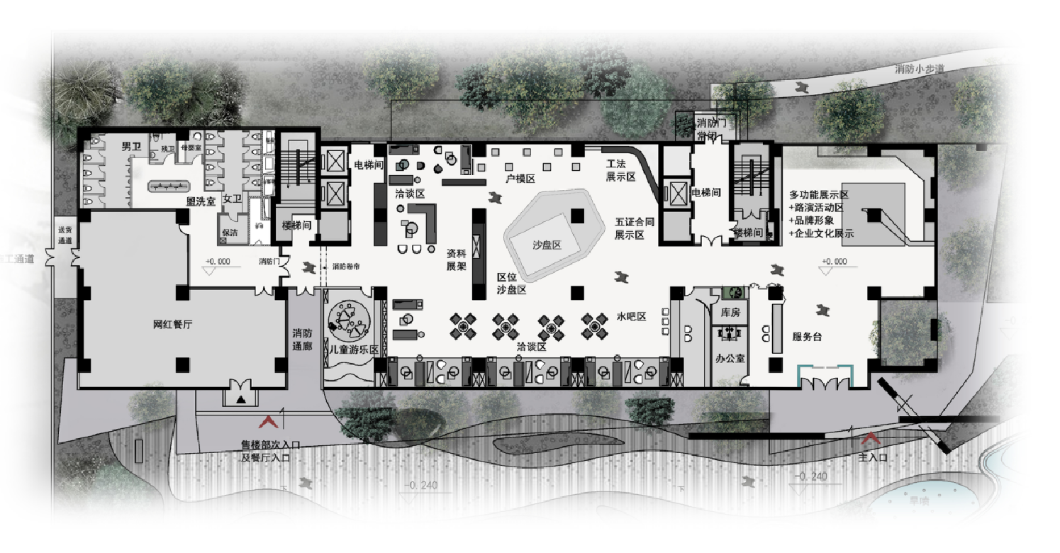 1F 多功能展示体验区、服务台、水吧台、 沙盘区、洽谈区、儿童活动区、 网红餐厅、公共卫生间