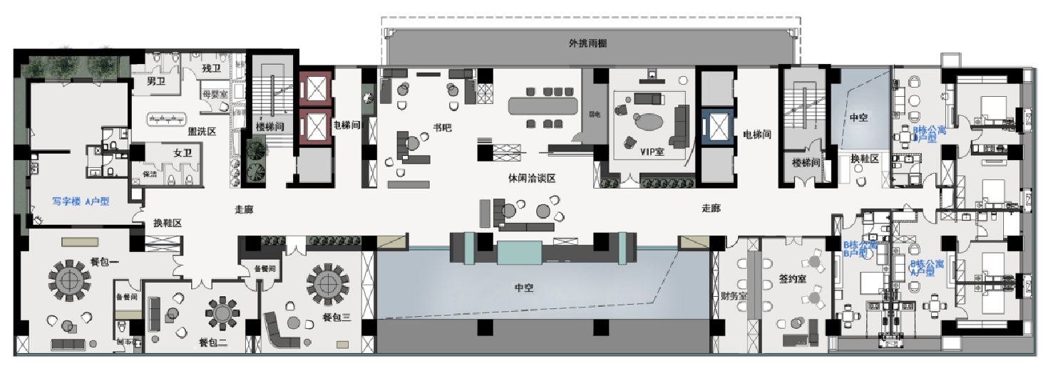 2F B栋公寓、写字楼样板间、书吧、 休闲洽谈区、VIP室、餐包、 签约室、财务室、公共卫生间