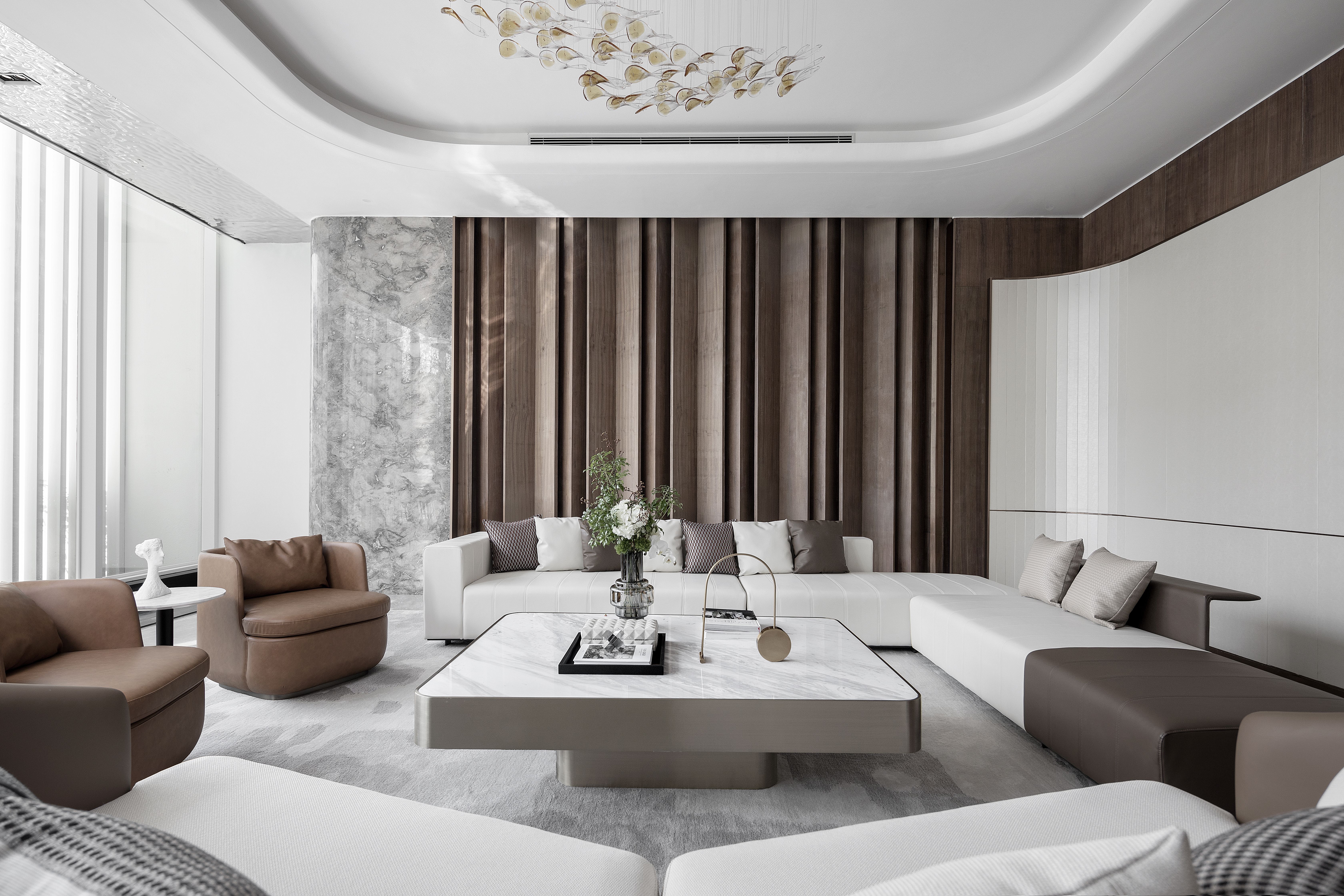 设计选材:空间形成了一种现代简约永恒的风格调性,至精至简,美润温和。