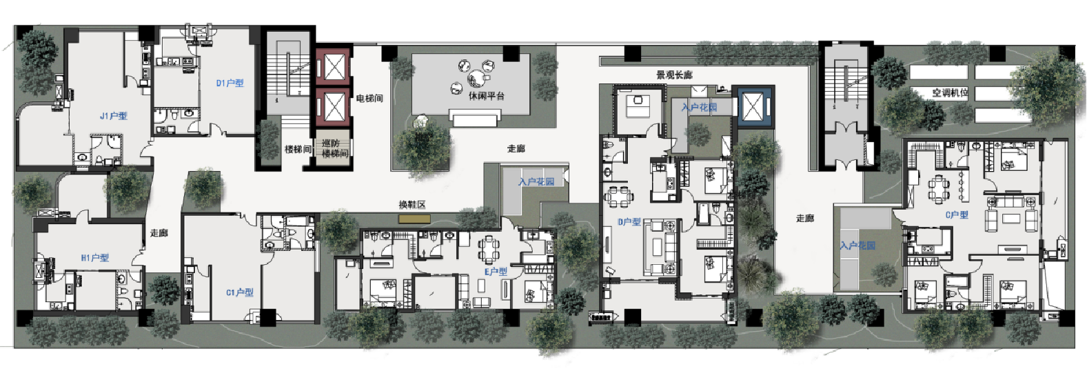 3F A栋公寓、ABCD座住宅样板间、 休闲平台、景观走廊
