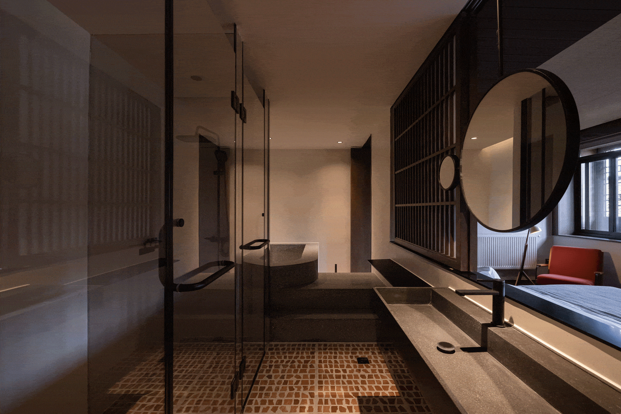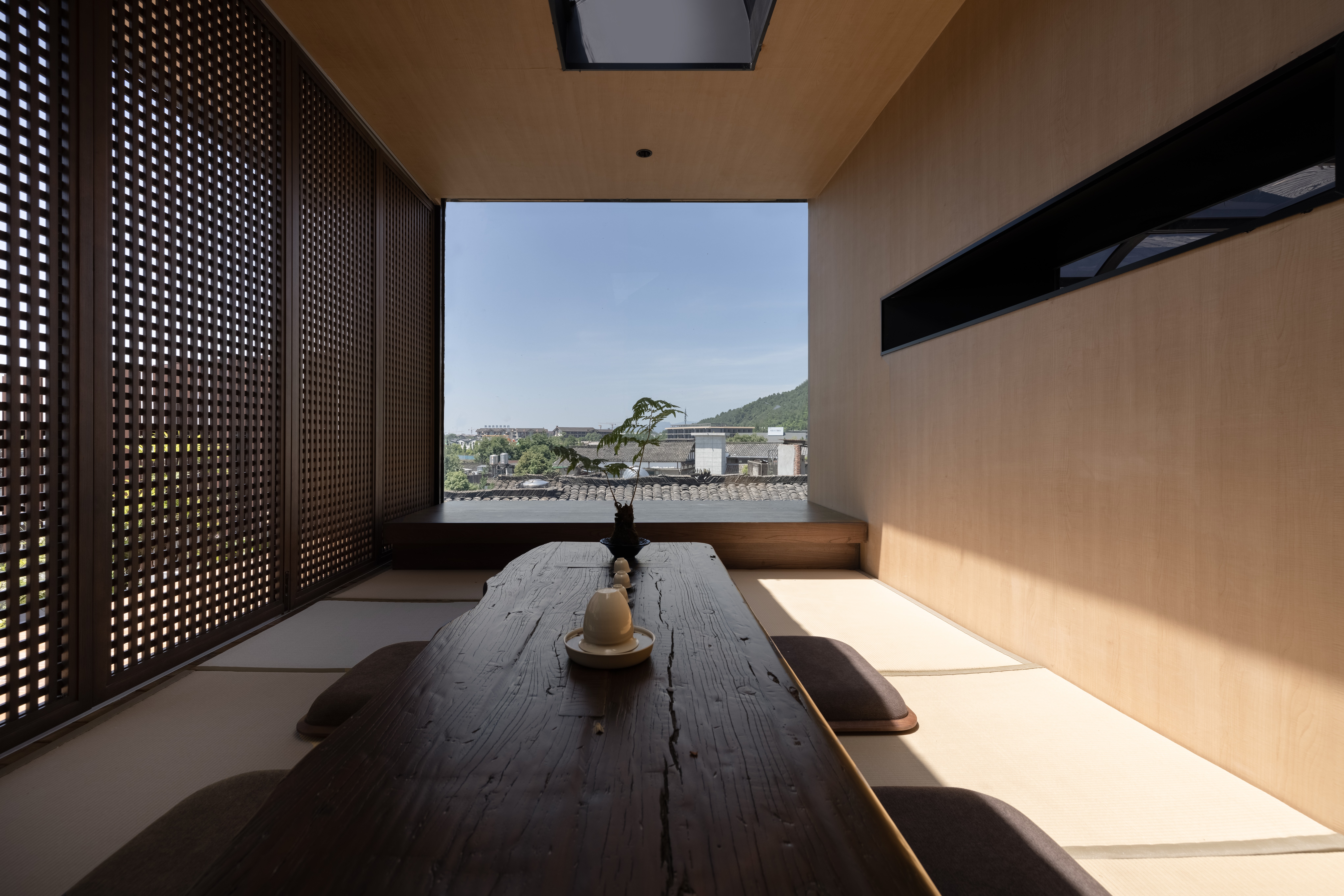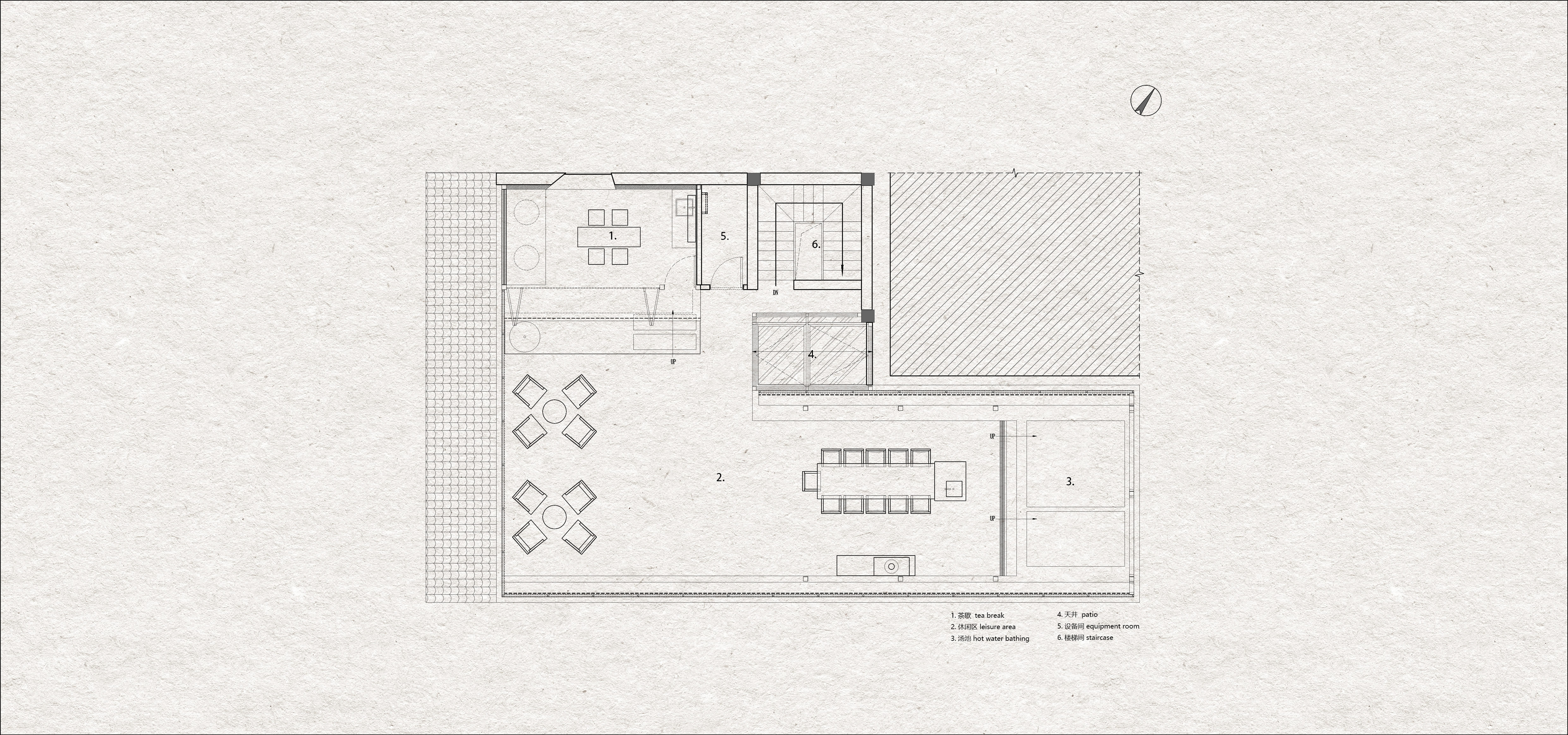 原建筑三层带屋顶且临古镇街道,具有一定的视线优势,为了保留此优势并提升住客的多维度体验,在屋顶增设具有茶歇、泡汤、聚会等休闲娱乐功能,俯瞰古镇街道风貌。