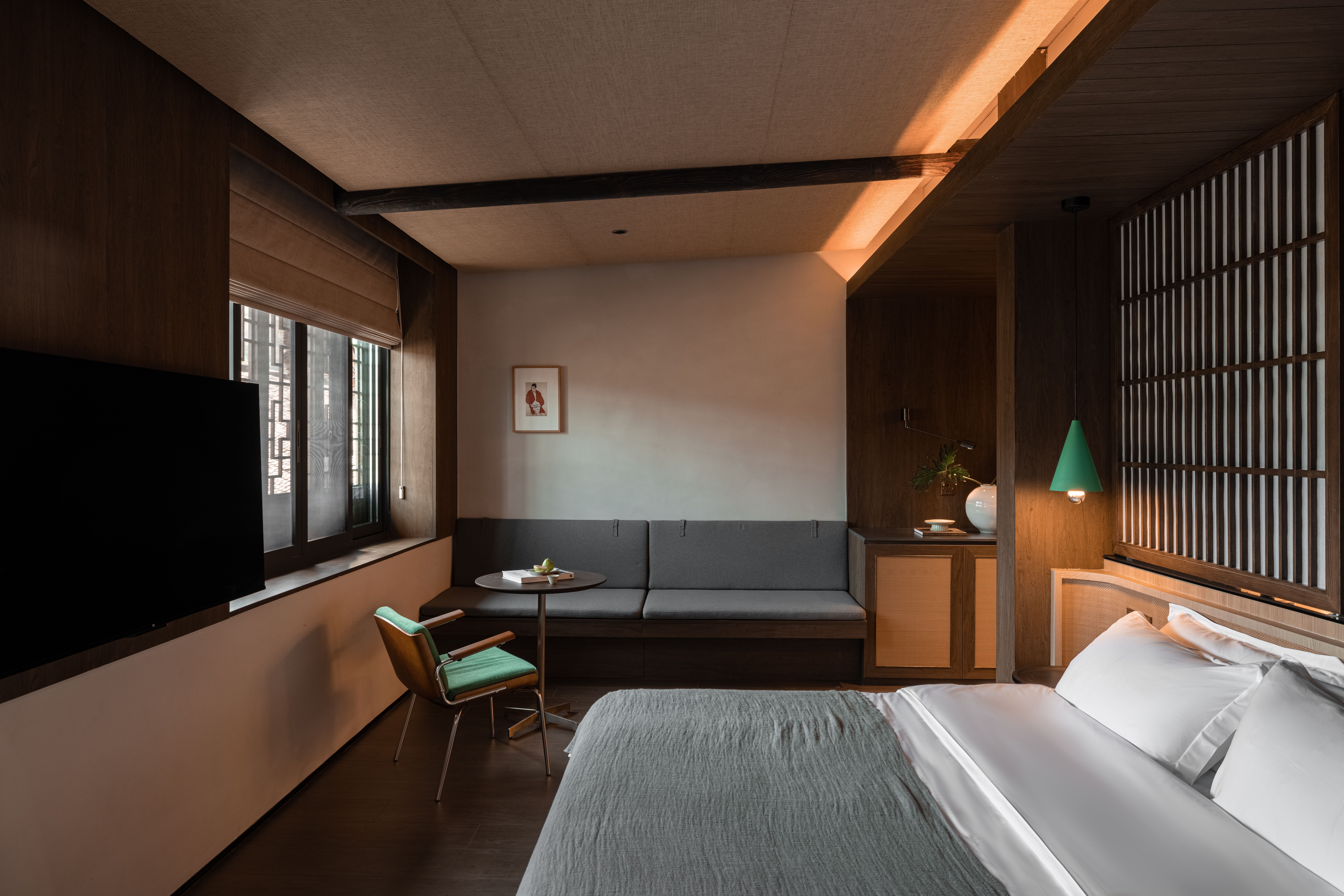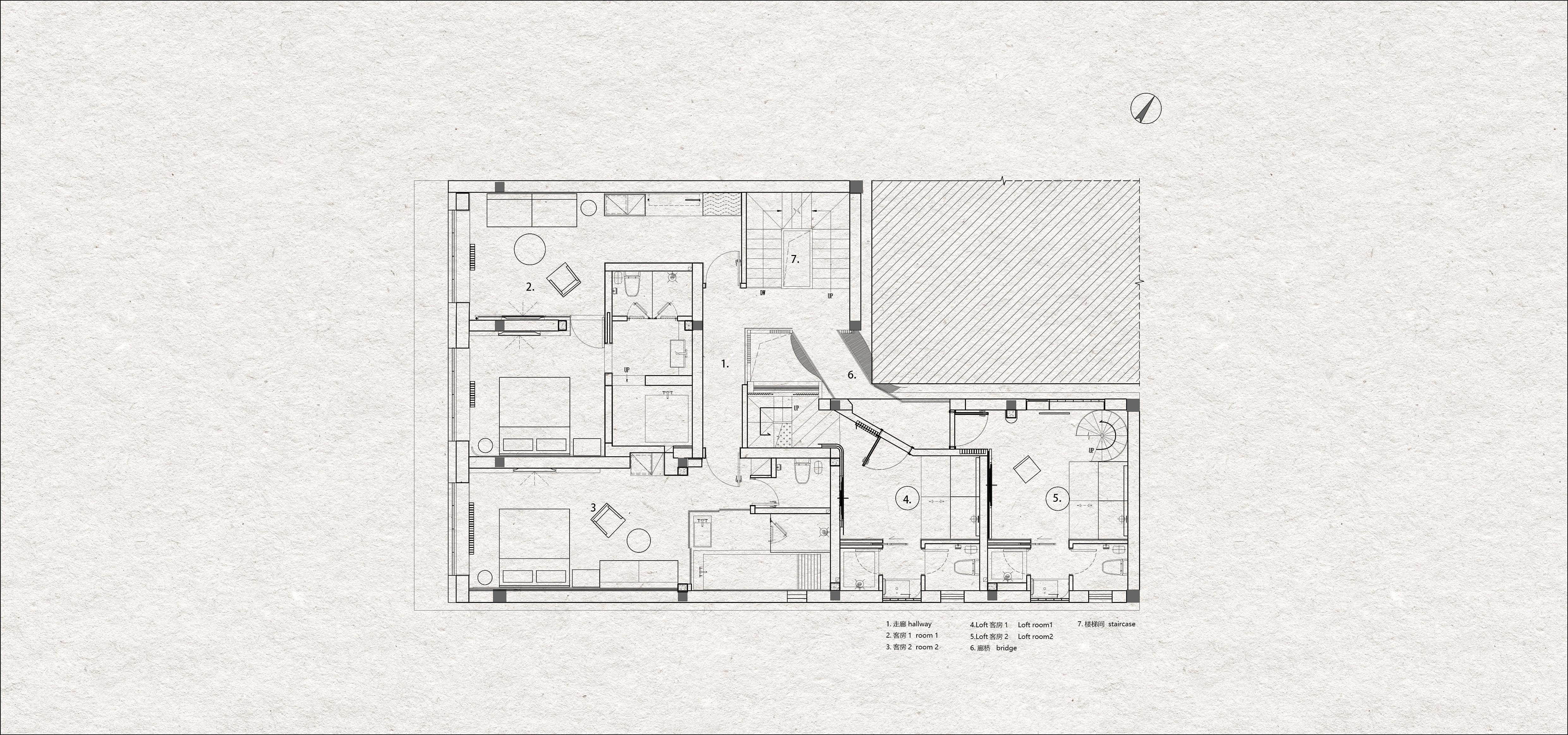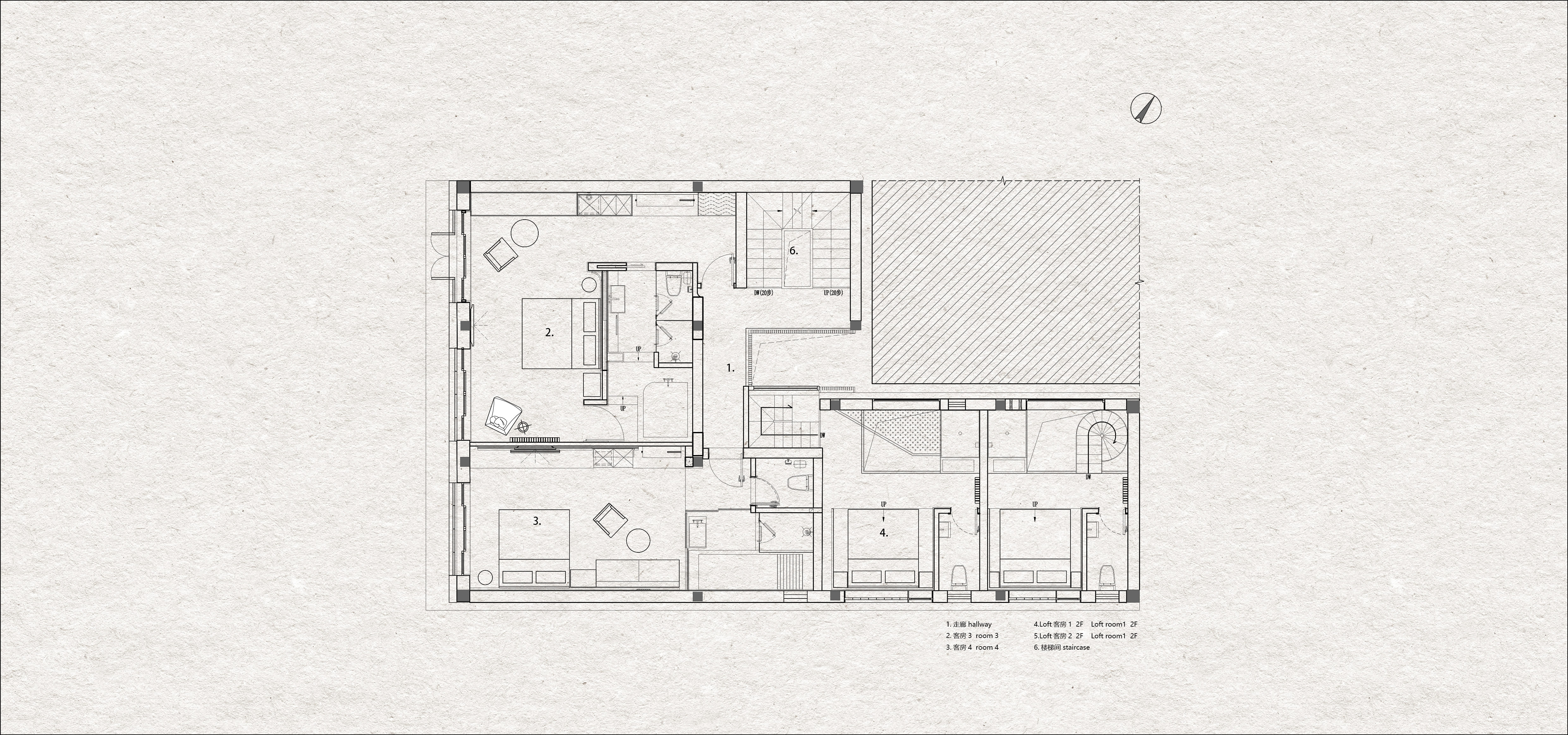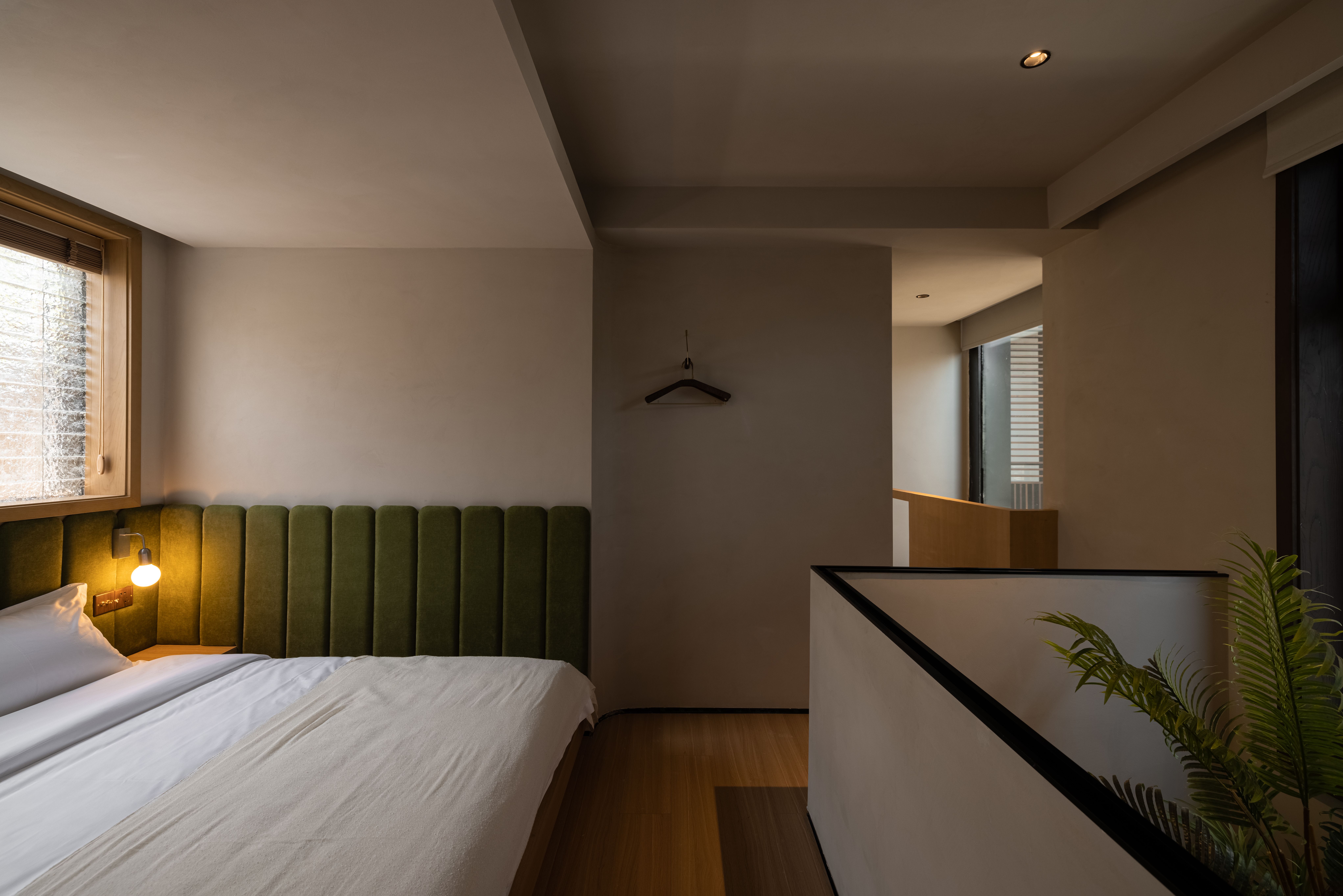 原建筑西南房间与西北房间的客人动线交汇,导致居住体验不佳,为了解决动线上相互干扰的问题,将2层与3层间的楼板打开,使其纵向贯通,并分割成上下贯通的两间“Loft”房型。如此一来,内部动线通畅的同时,也给予住客更多样的房型选择。