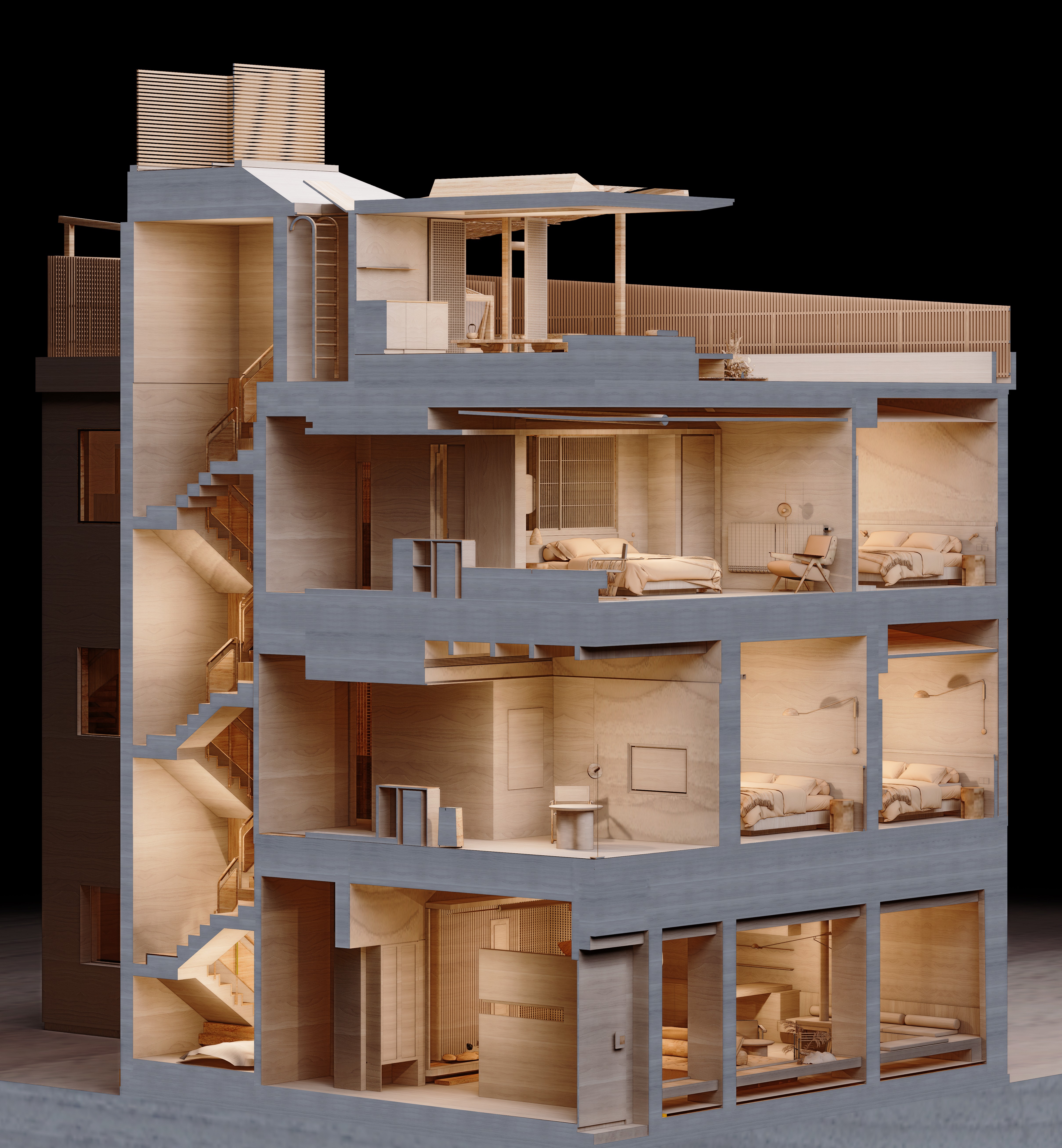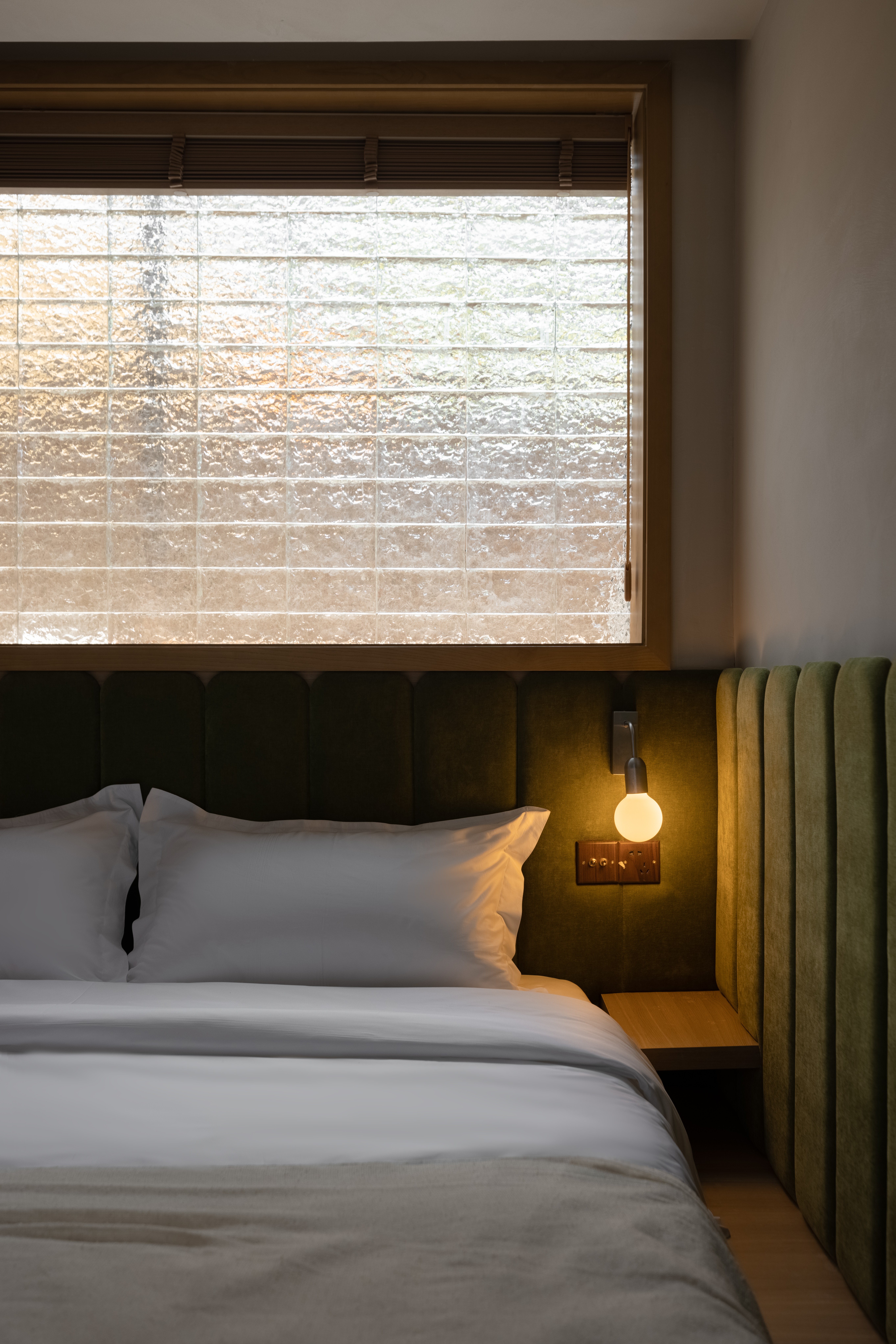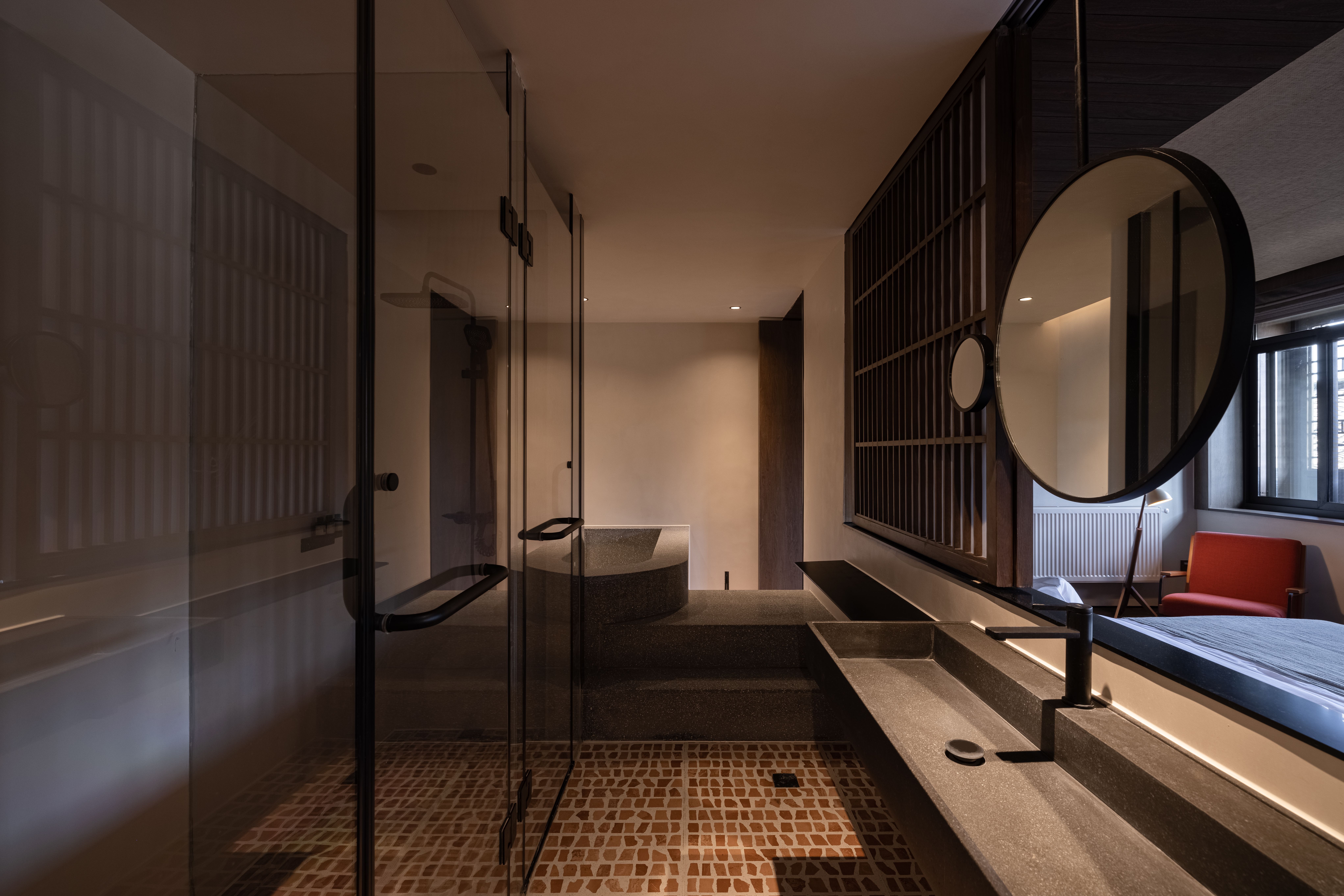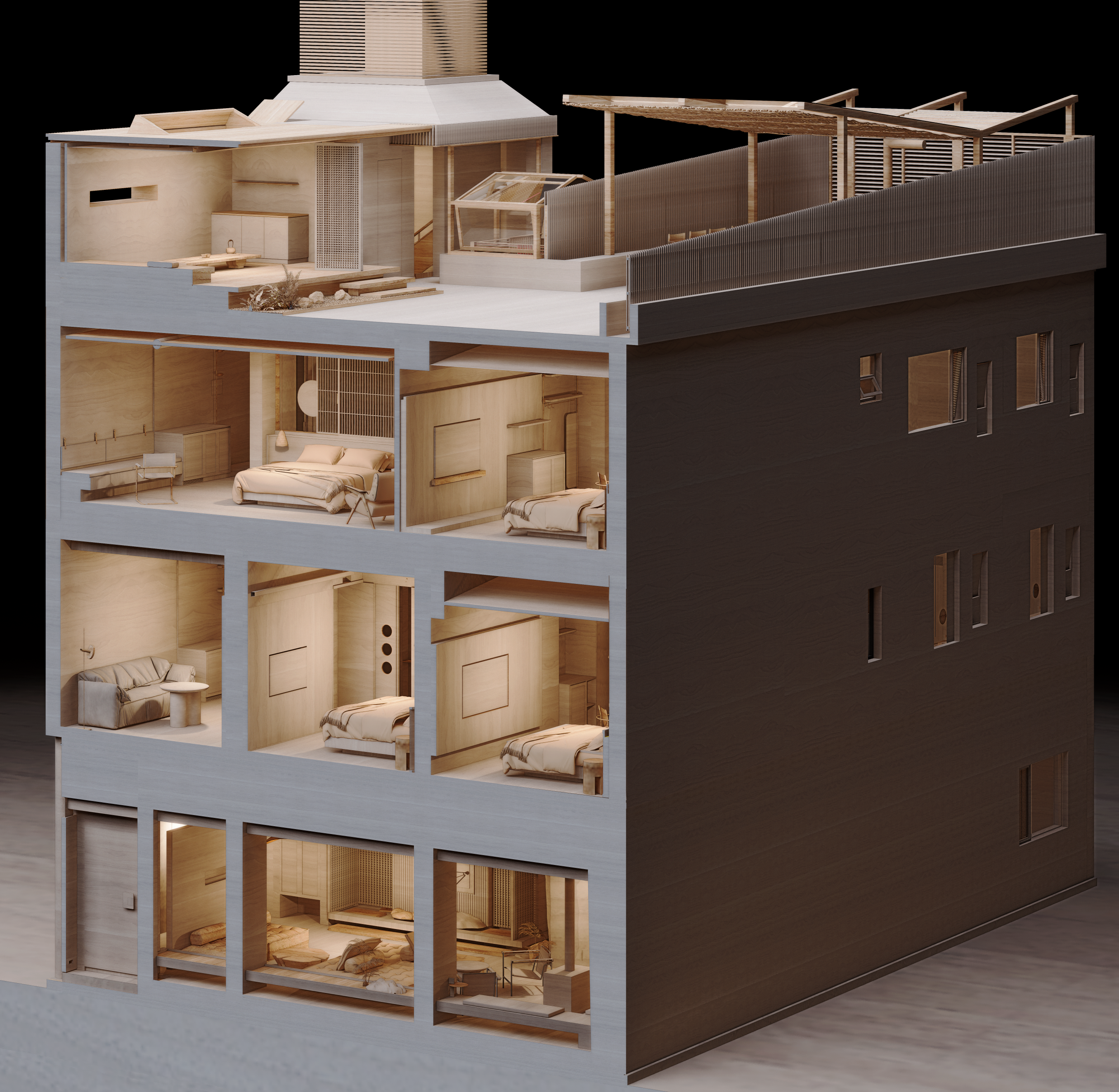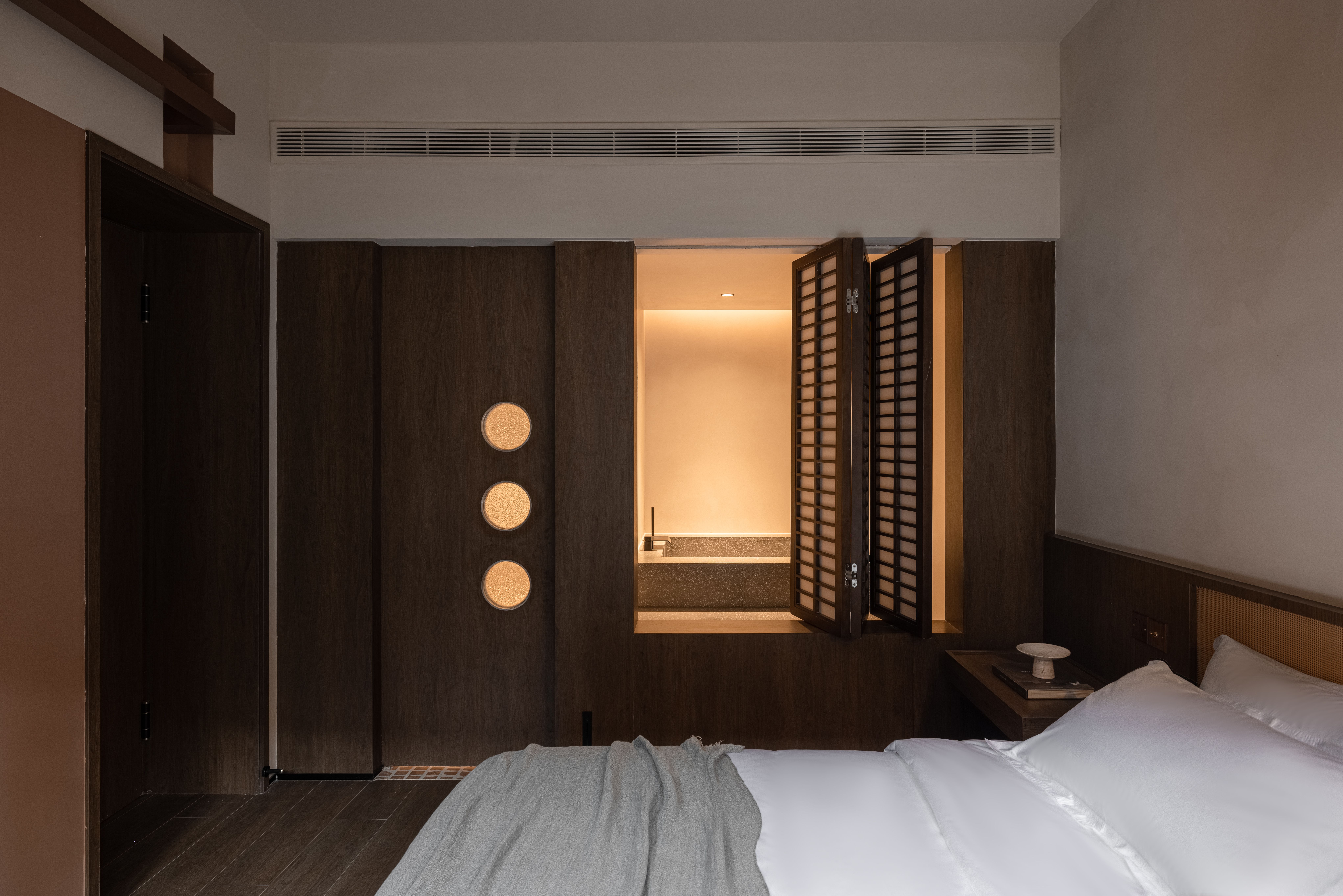 原建筑西南房间与西北房间的客人动线交汇,导致居住体验不佳,为了解决动线上相互干扰的问题,将2层与3层间的楼板打开,使其纵向贯通,并分割成上下贯通的两间“Loft”房型。如此一来,内部动线通畅的同时,也给予住客更多样的房型选择。