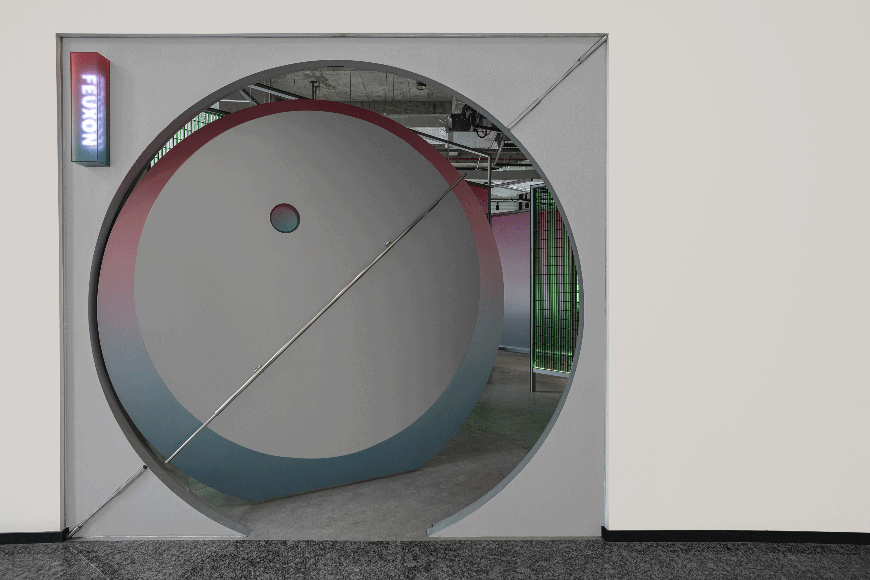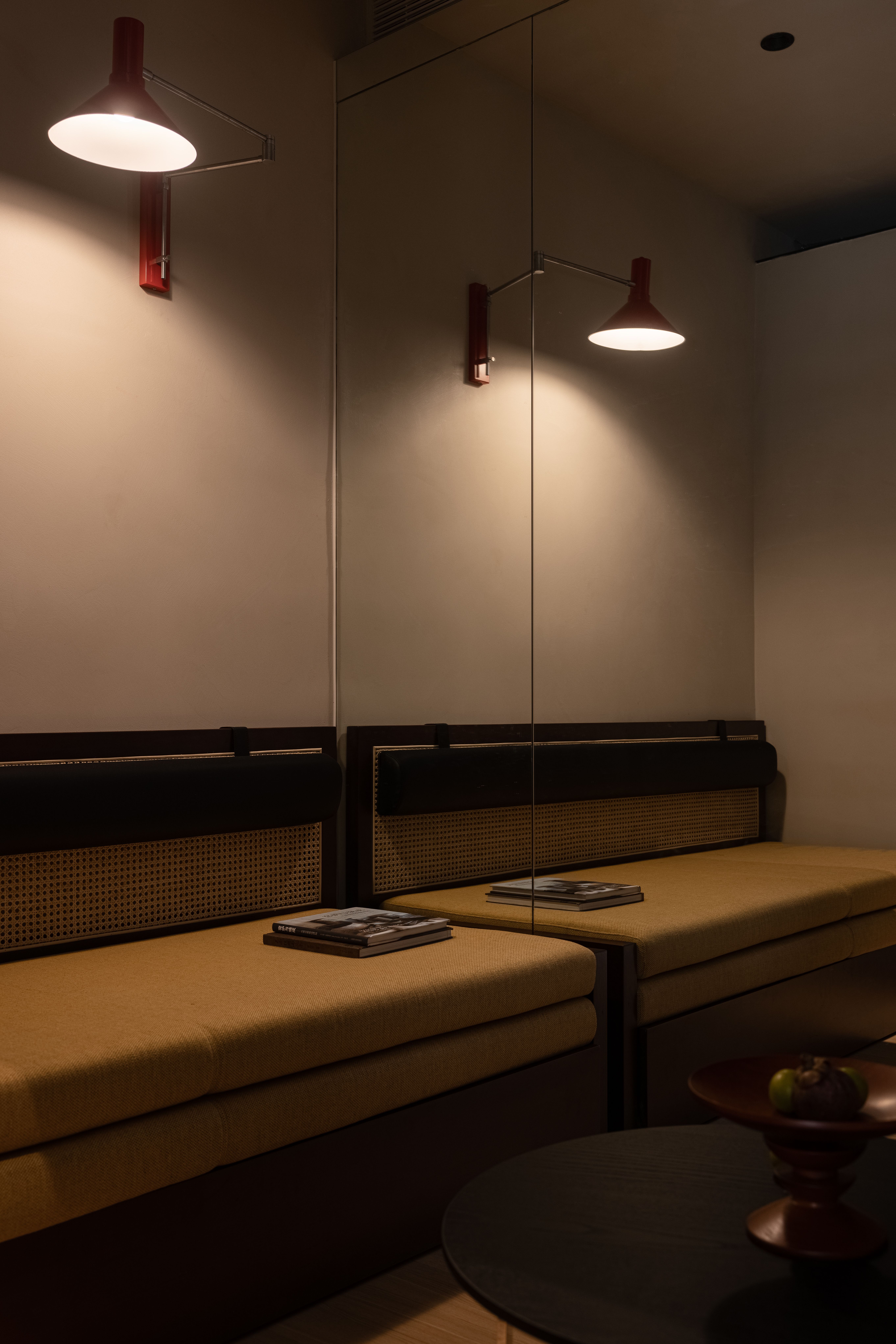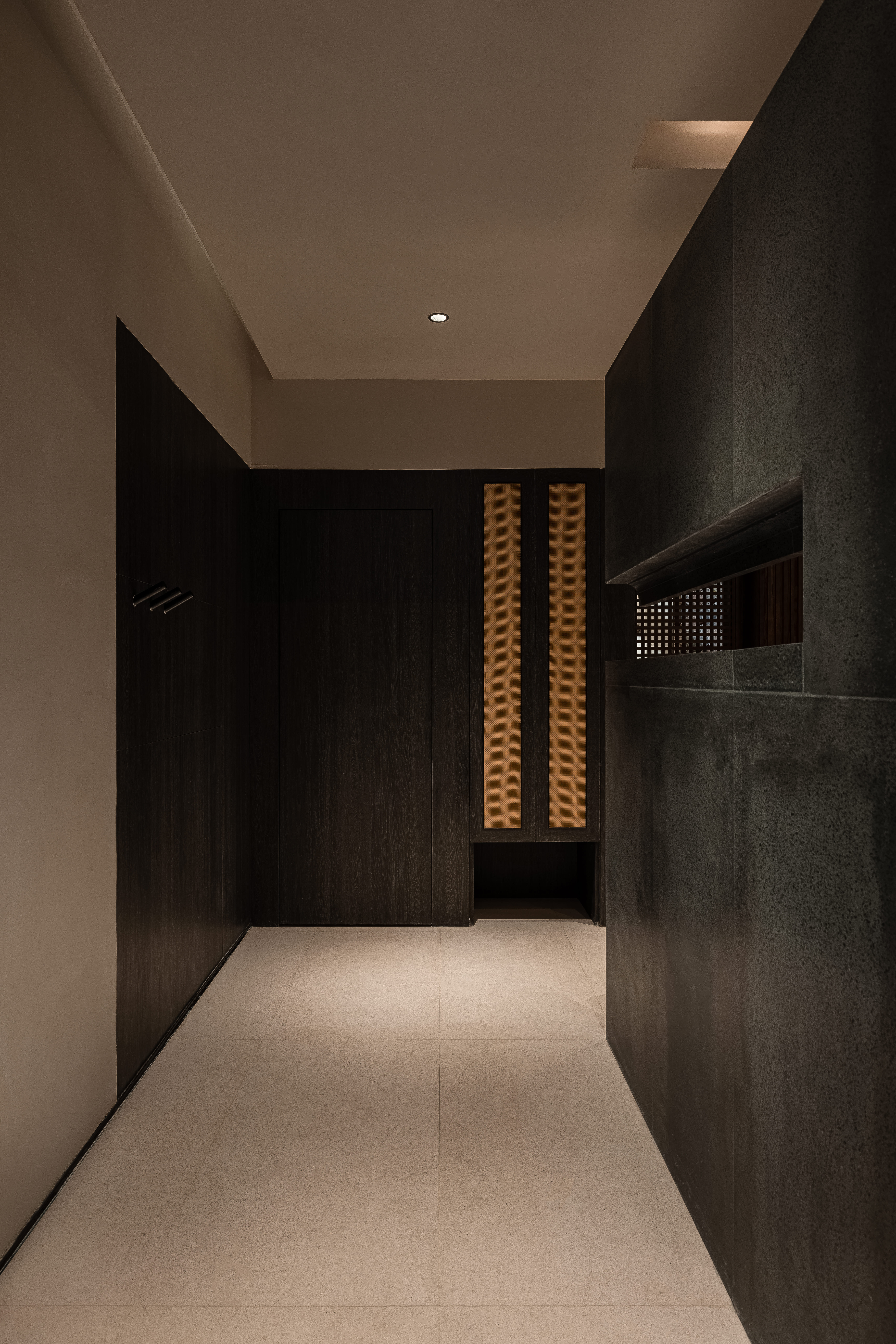 场地三面均被周边建筑包围,视野狭促,环境嘈杂。如何在这样的场地既能避免周边的干扰又能打造一个高品质的内部体验空间是个难点,用一扇“门”界定内外,向内作文章,将喧闹的街道与视线隔绝,屏蔽噪杂。将所有空间包藏于内,营造一个内在的世界。