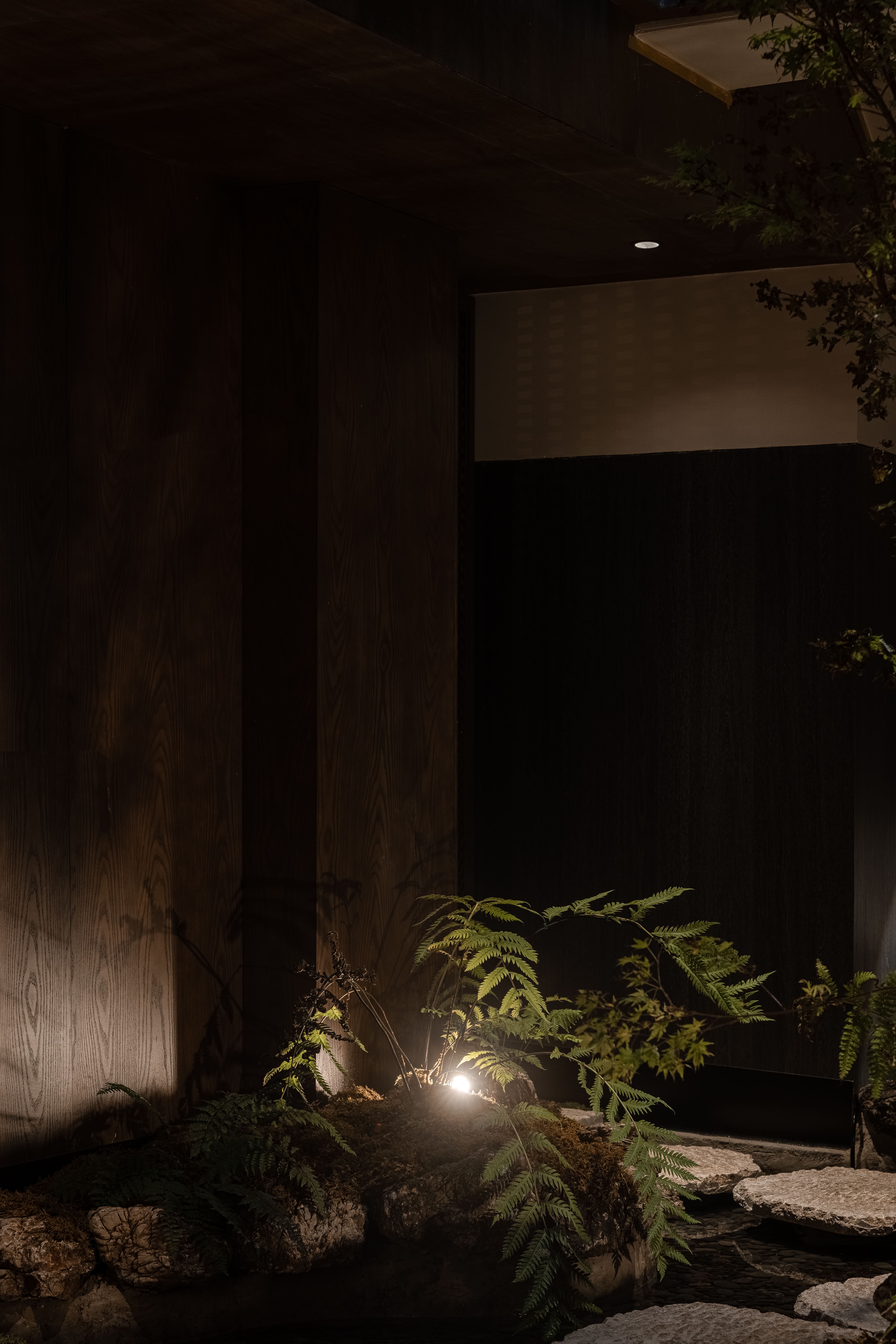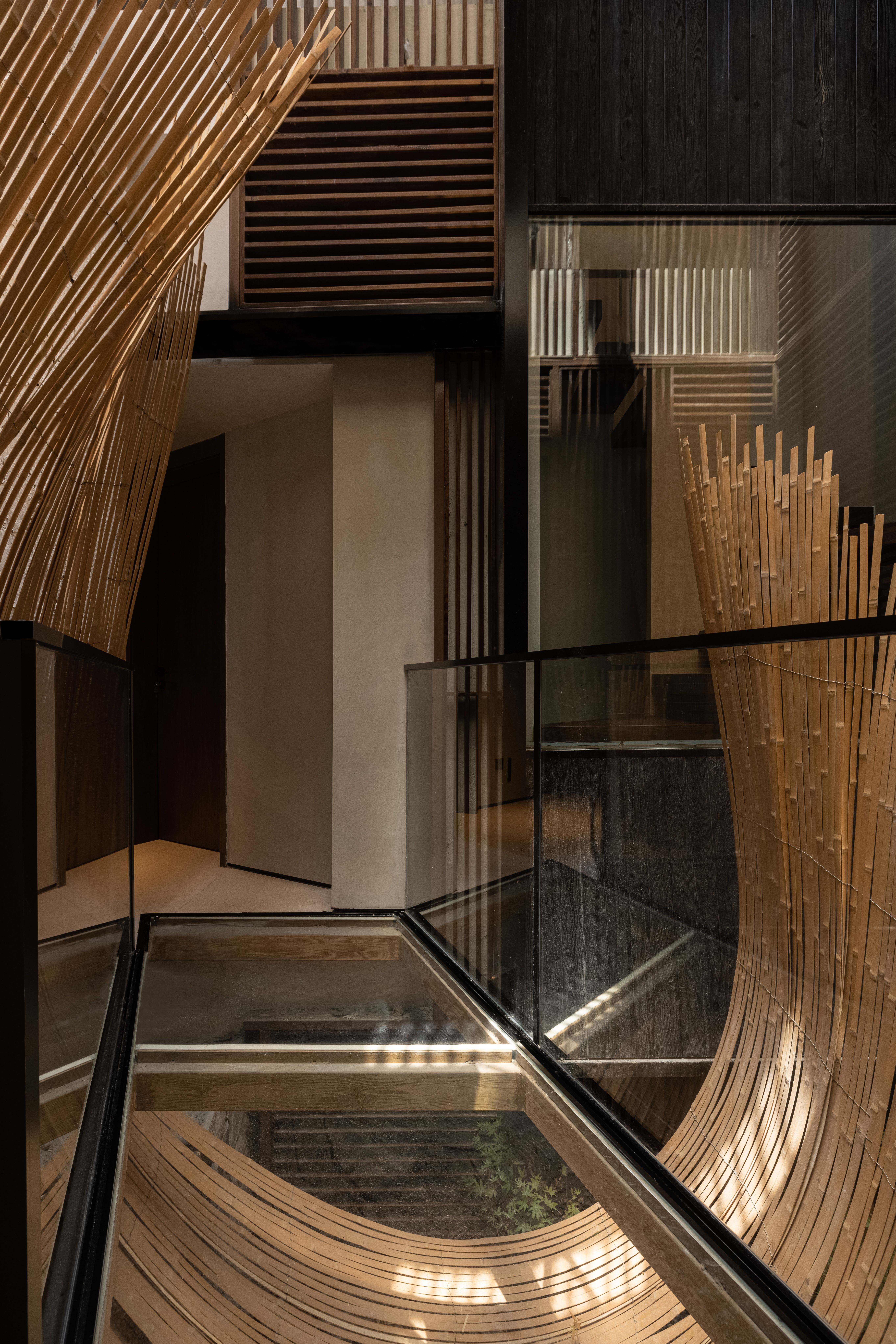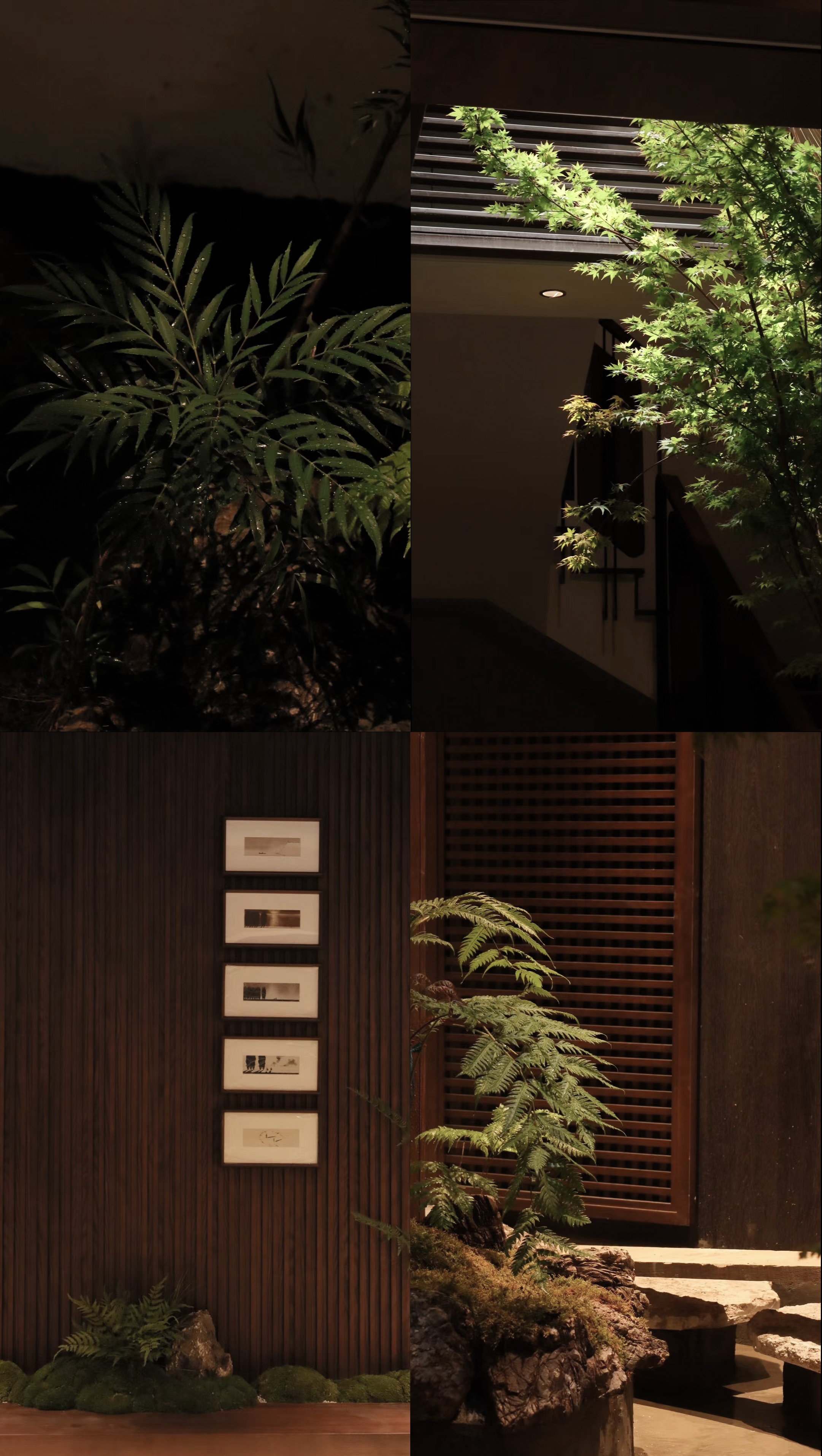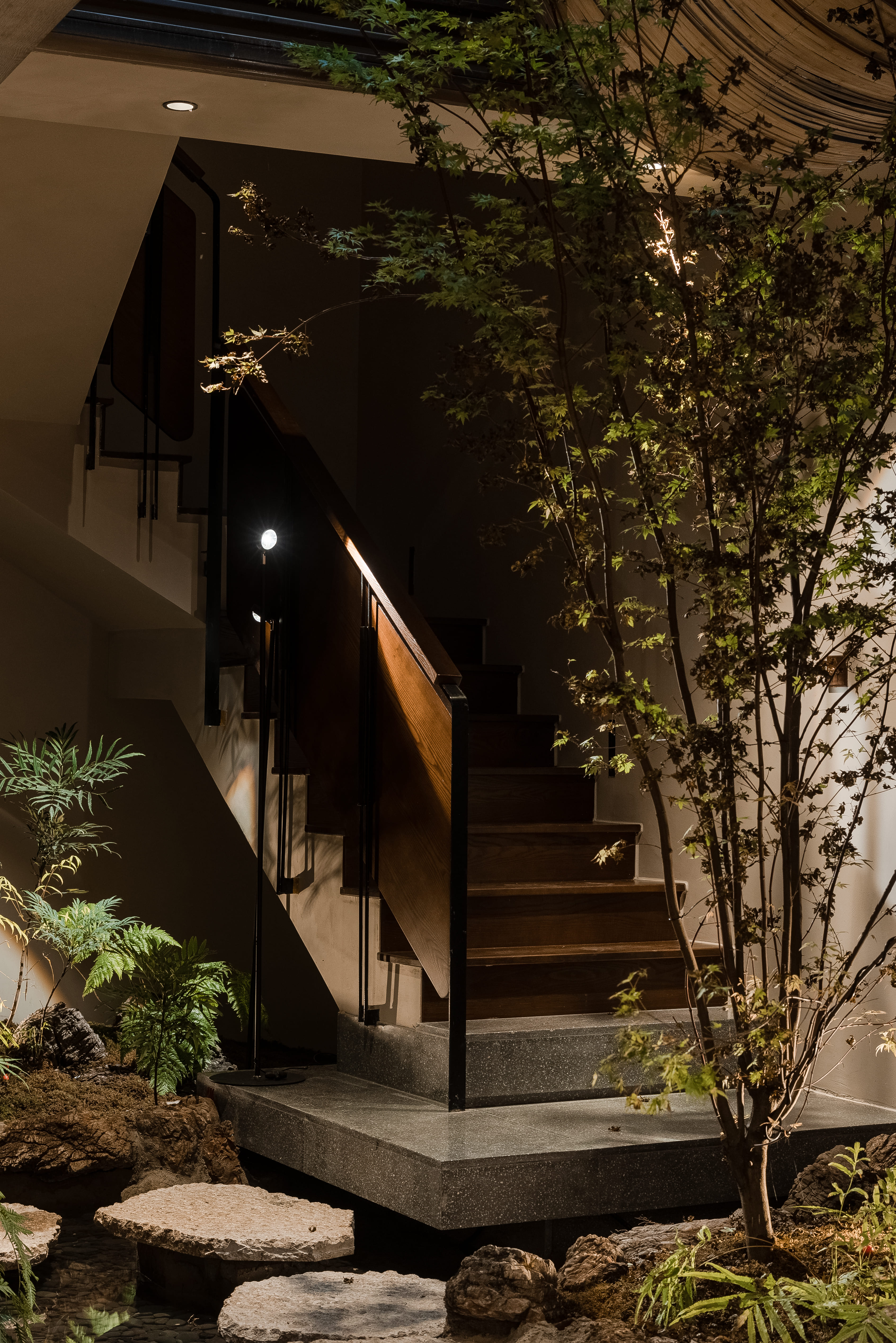 扶梯而下,庭中下布苔石步岩,上有绿枝垂探。感官带来湿润的触觉与知觉,抵达自然绿植的生命场力。