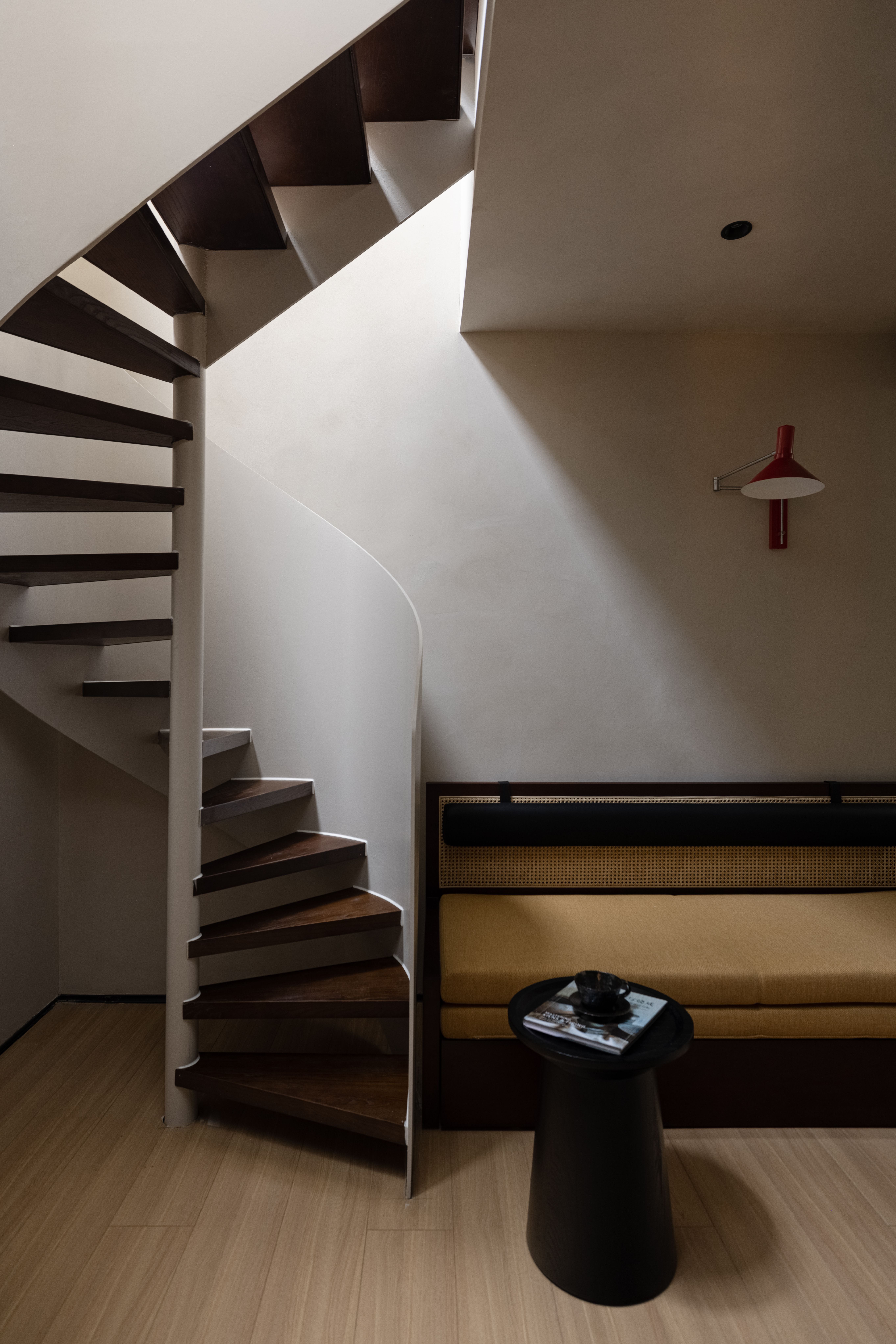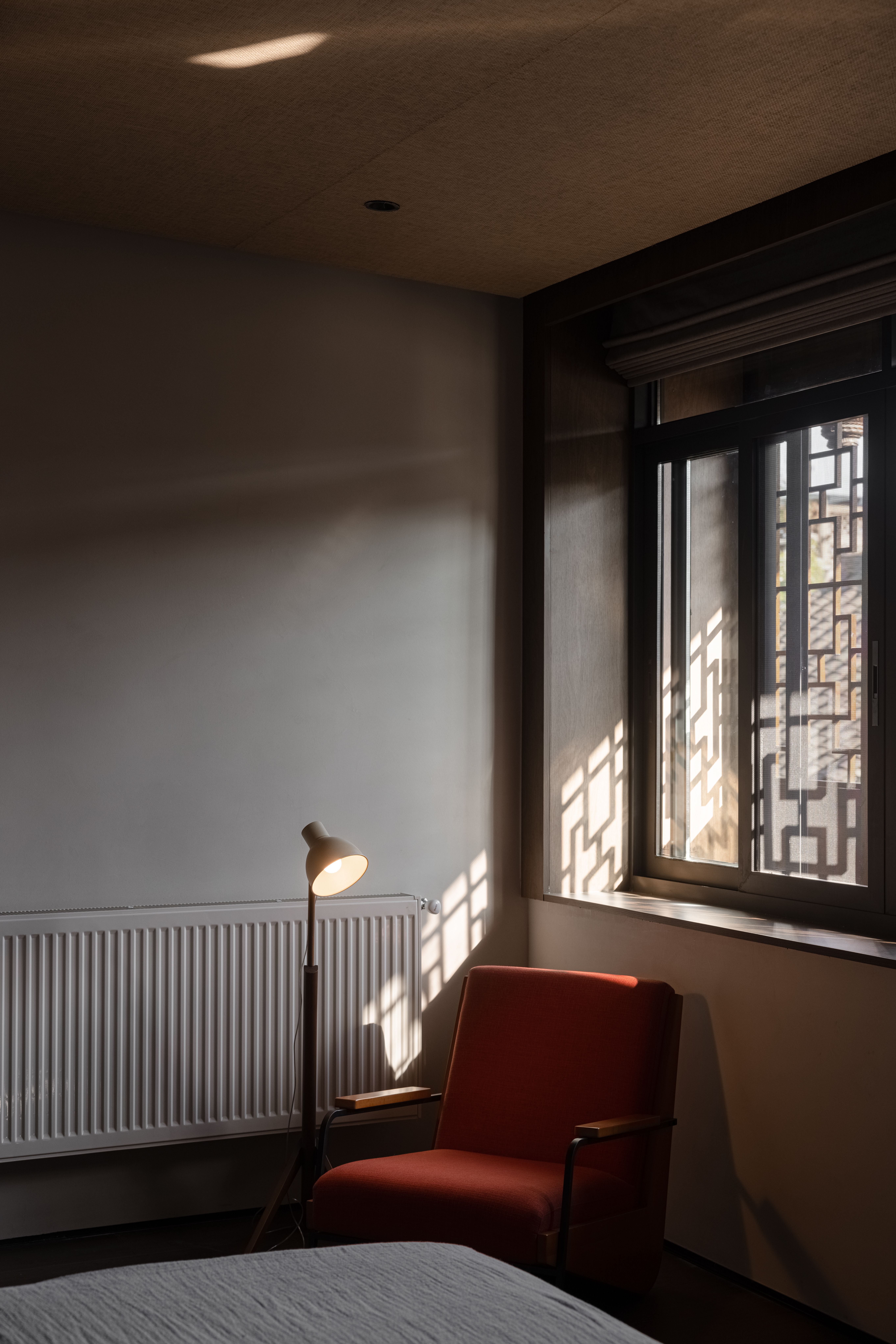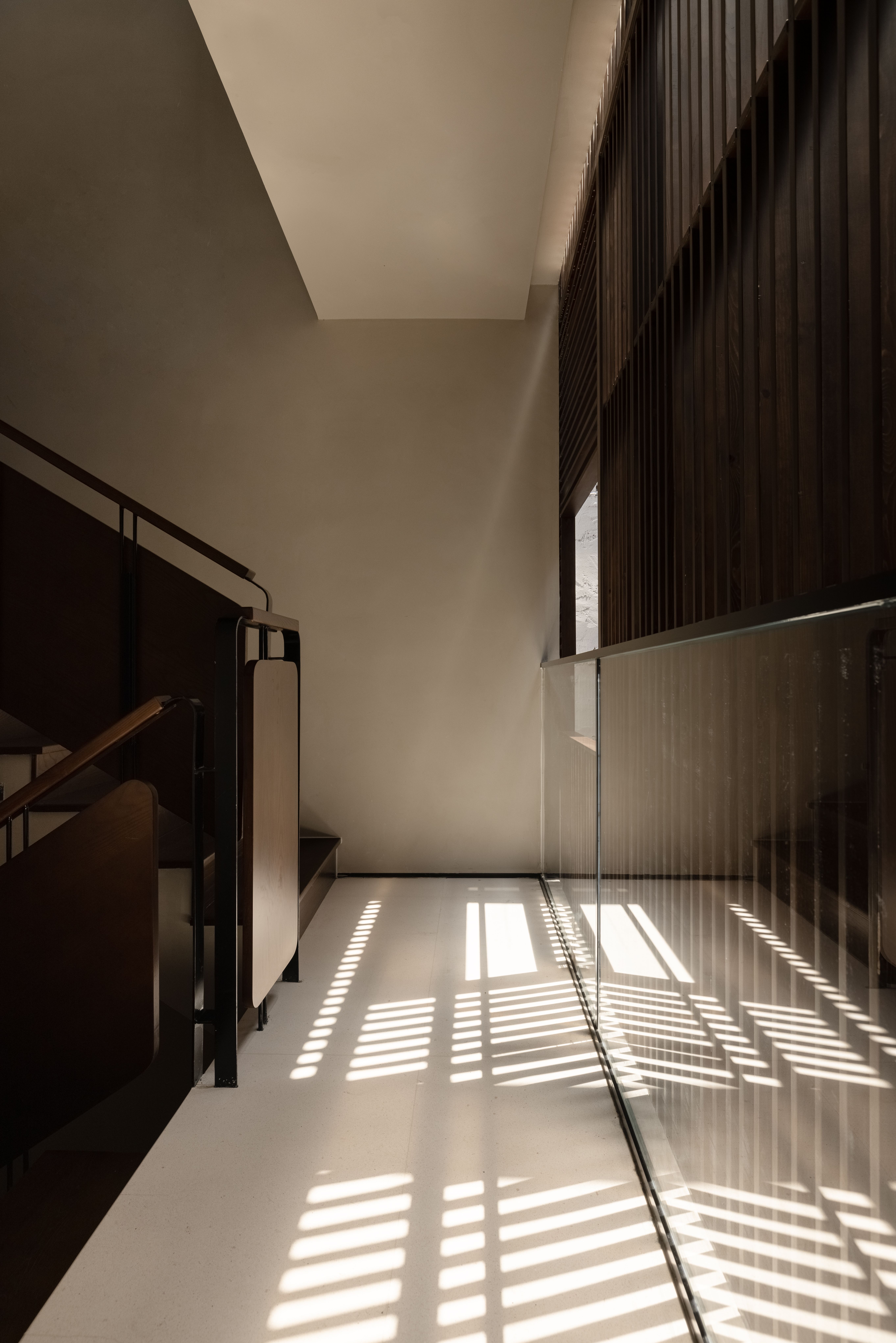 内部中置内天井,将西南、西北朝向的房间通过中置的内天井,悬架了一座“桥”,以此开辟一组新动线,这种理性而克制的处理,意外地让建筑内部的空间体验变得更加丰富。