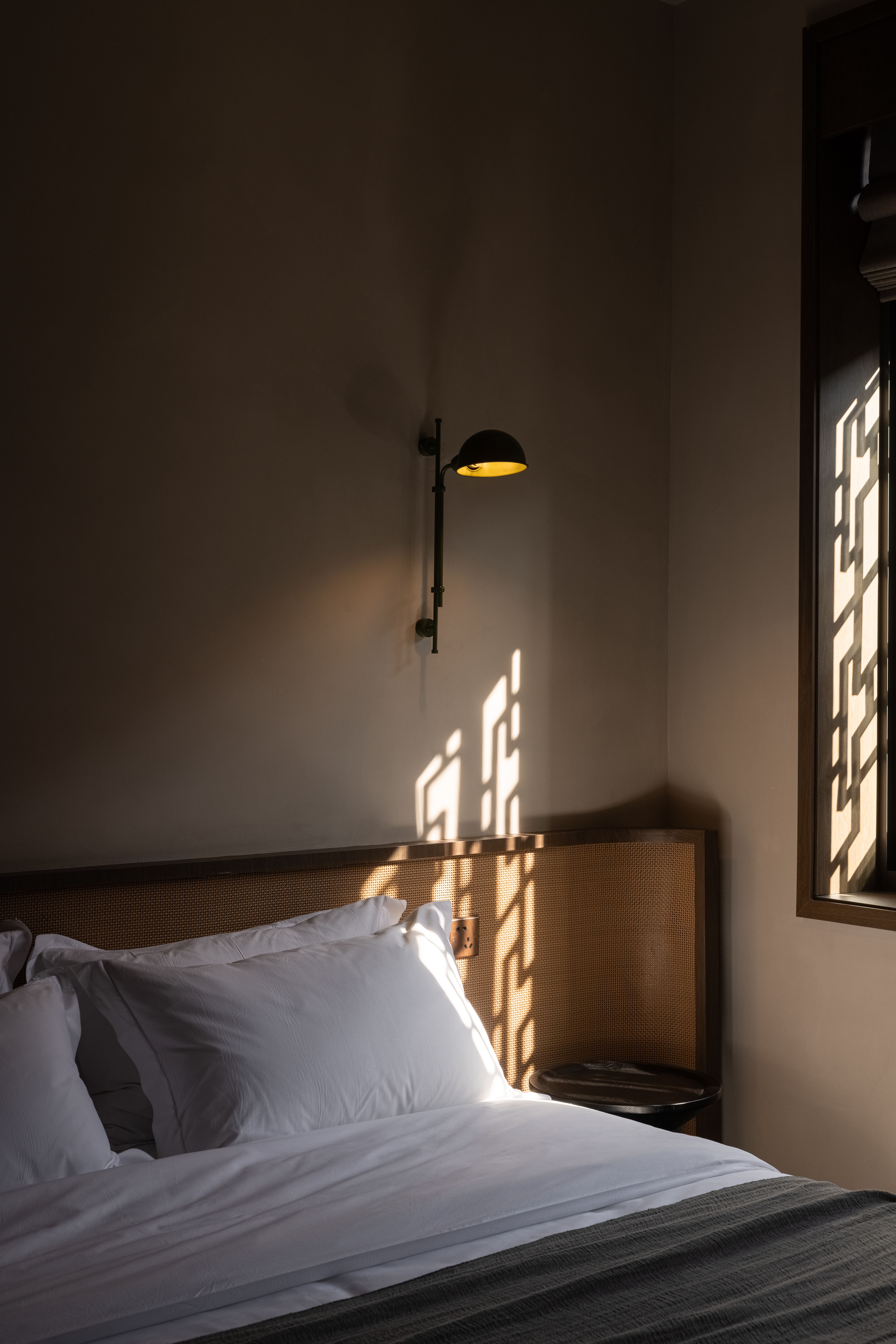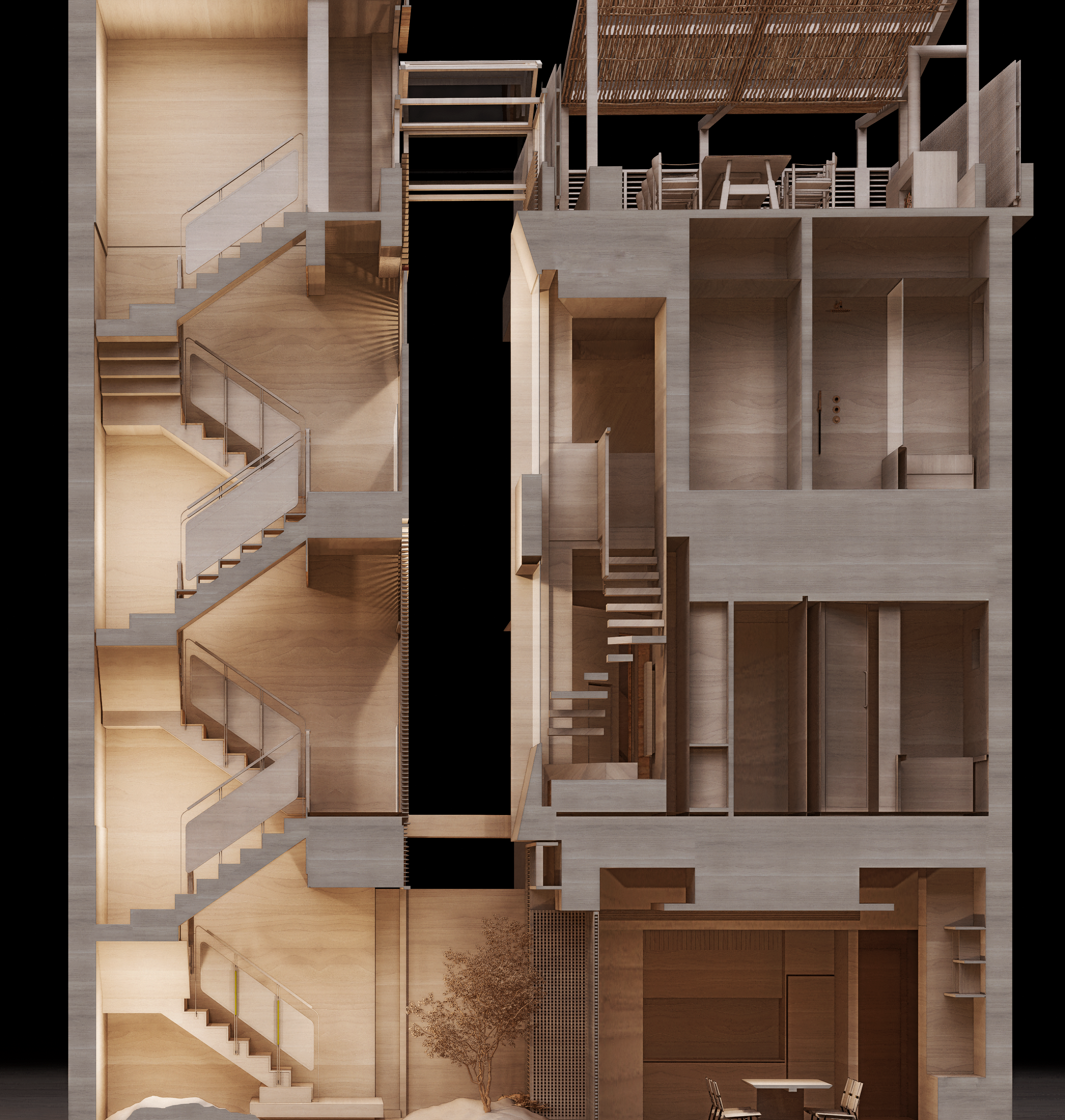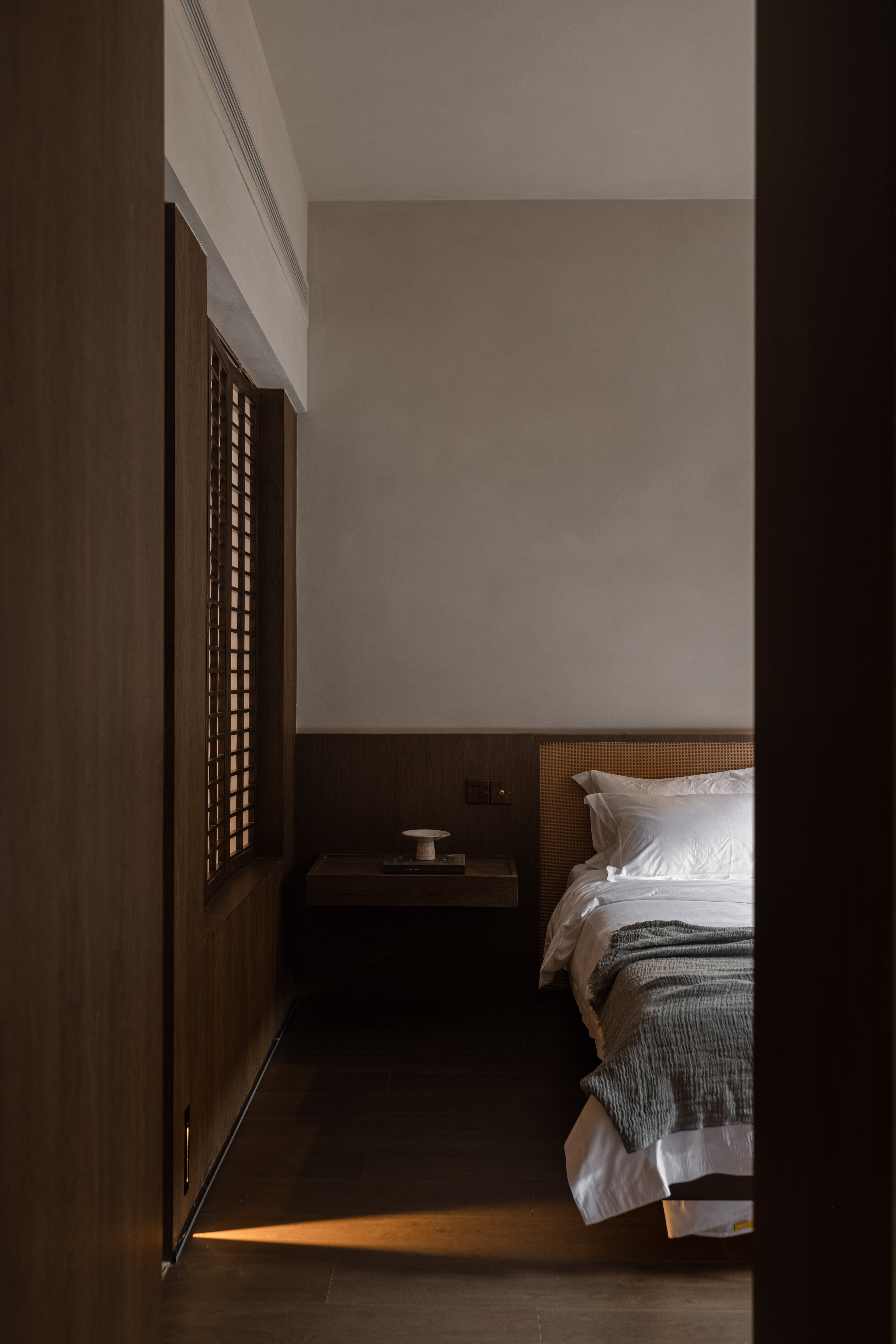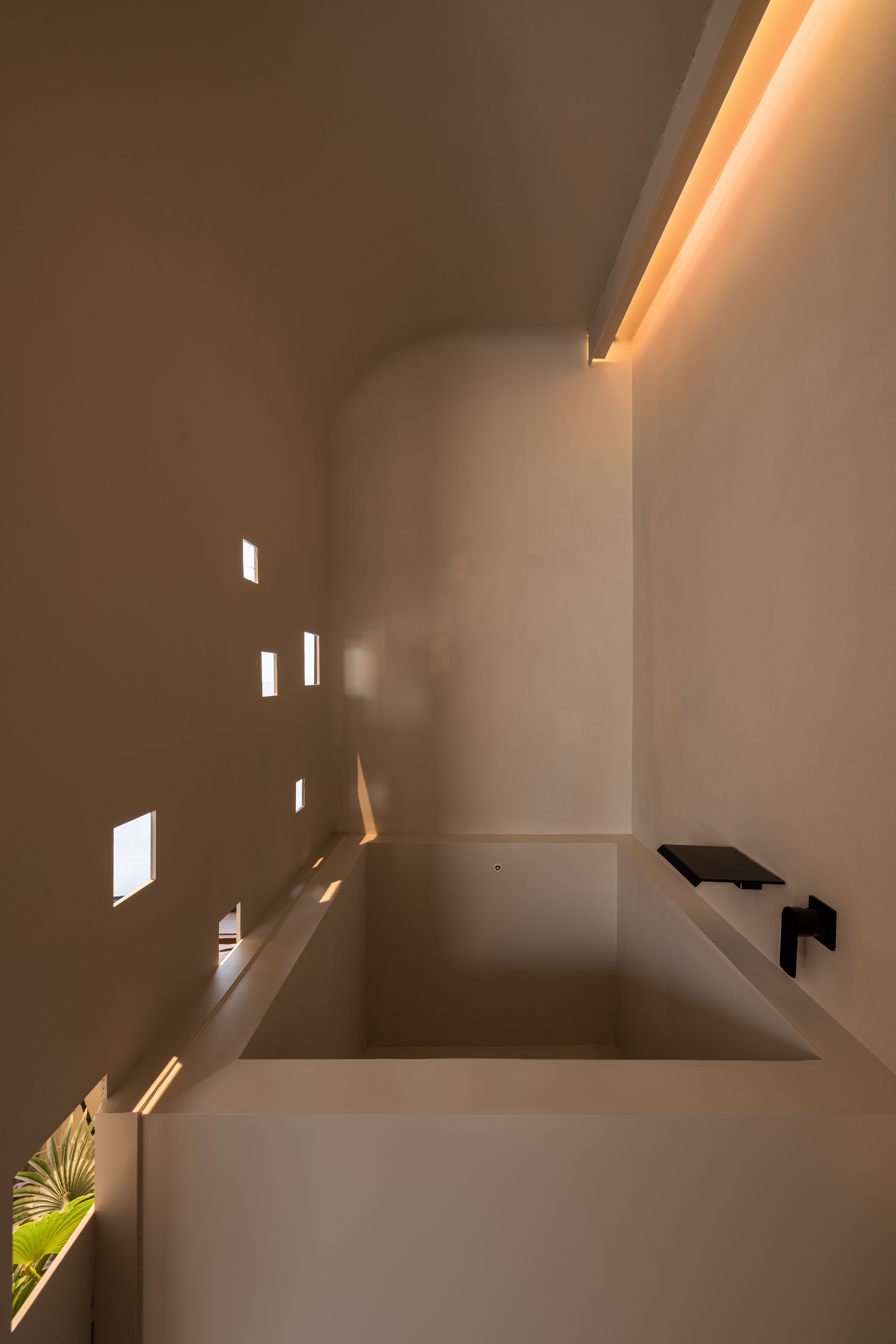 内部中置内天井,将西南、西北朝向的房间通过中置的内天井,悬架了一座“桥”,以此开辟一组新动线,这种理性而克制的处理,意外地让建筑内部的空间体验变得更加丰富。