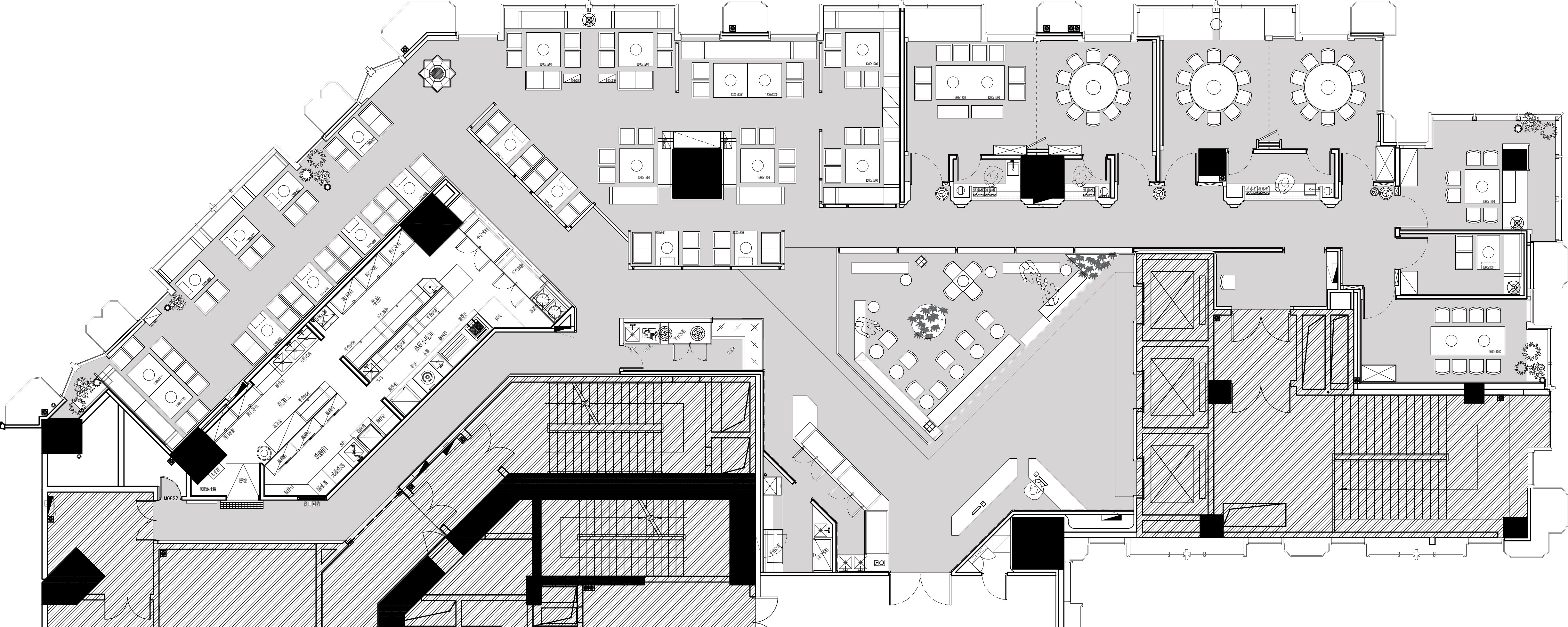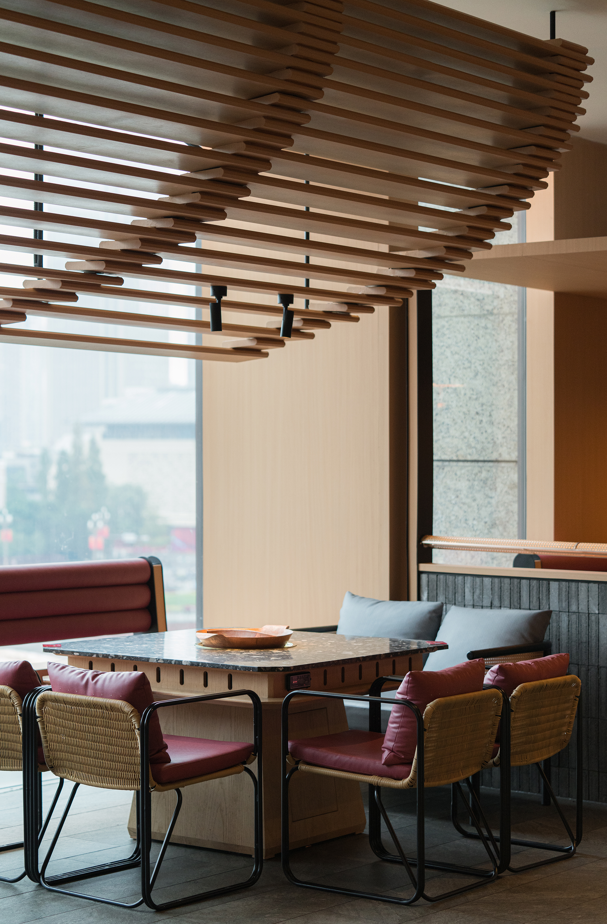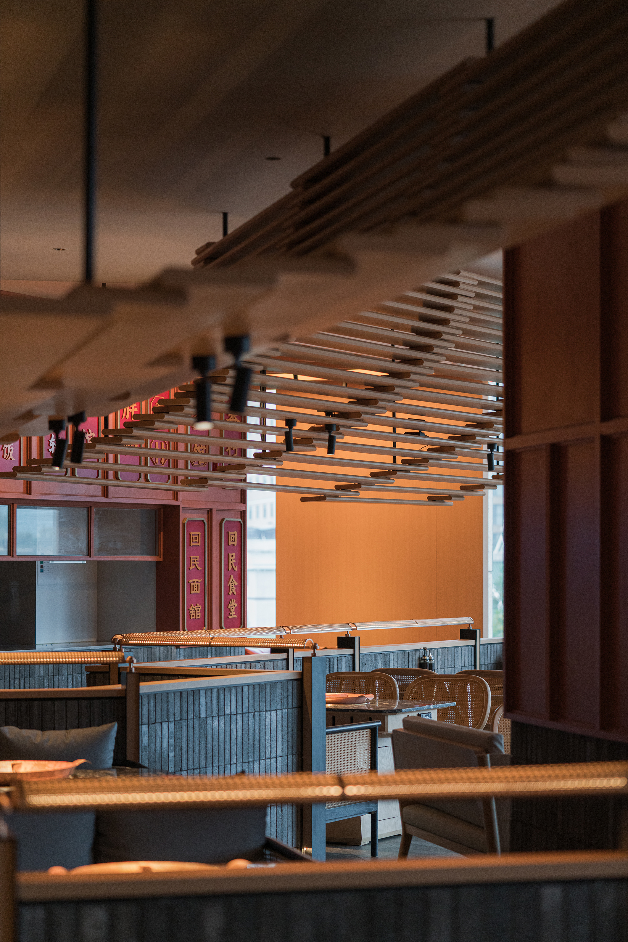 2.以动线规划空间:相对方正的大空间,如何破局,让空间灵动而有层次。破局后又如何重组动线,让客用空间有氛围,出餐回餐高效,是设计中要解决的难题。 -