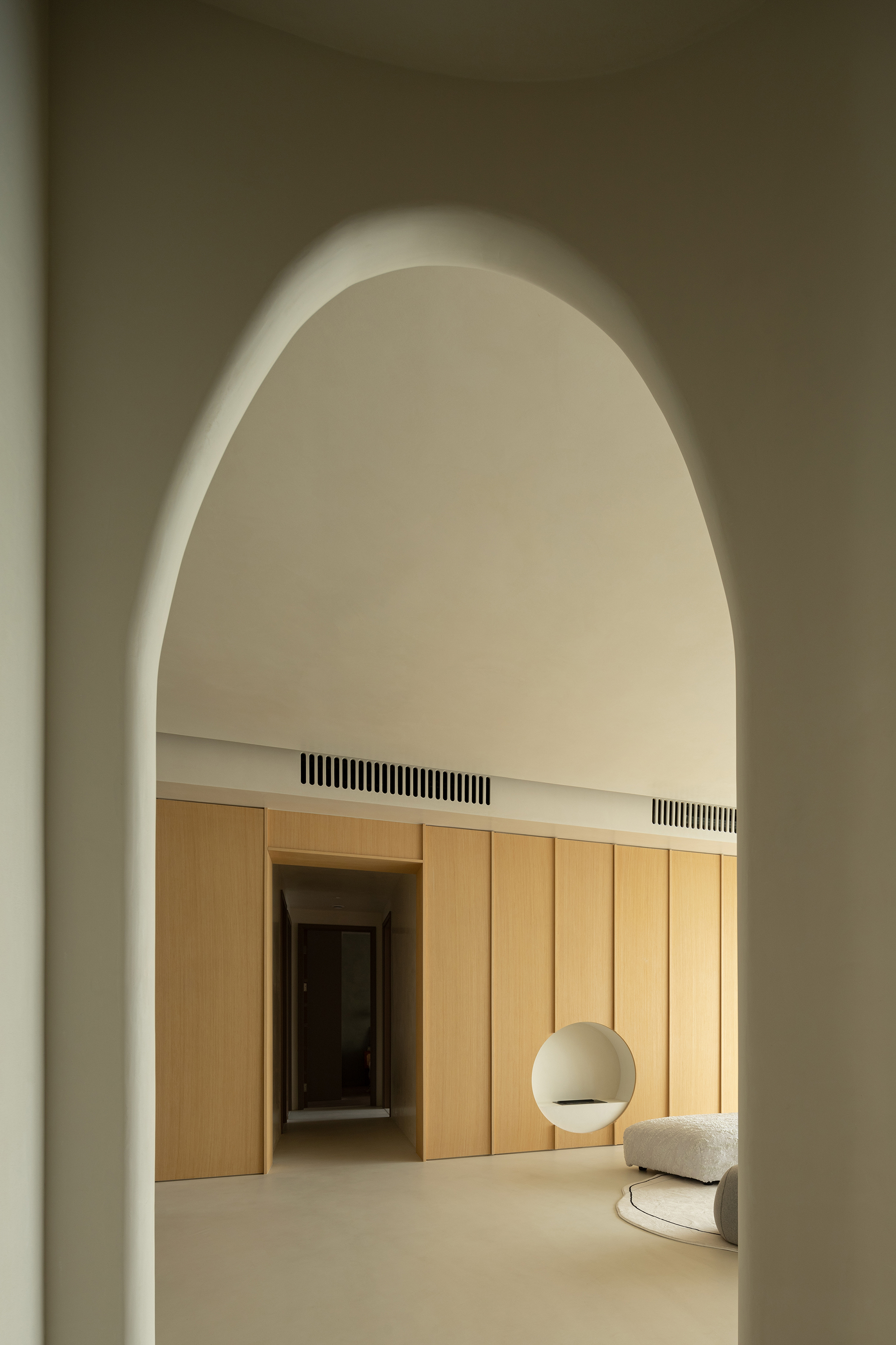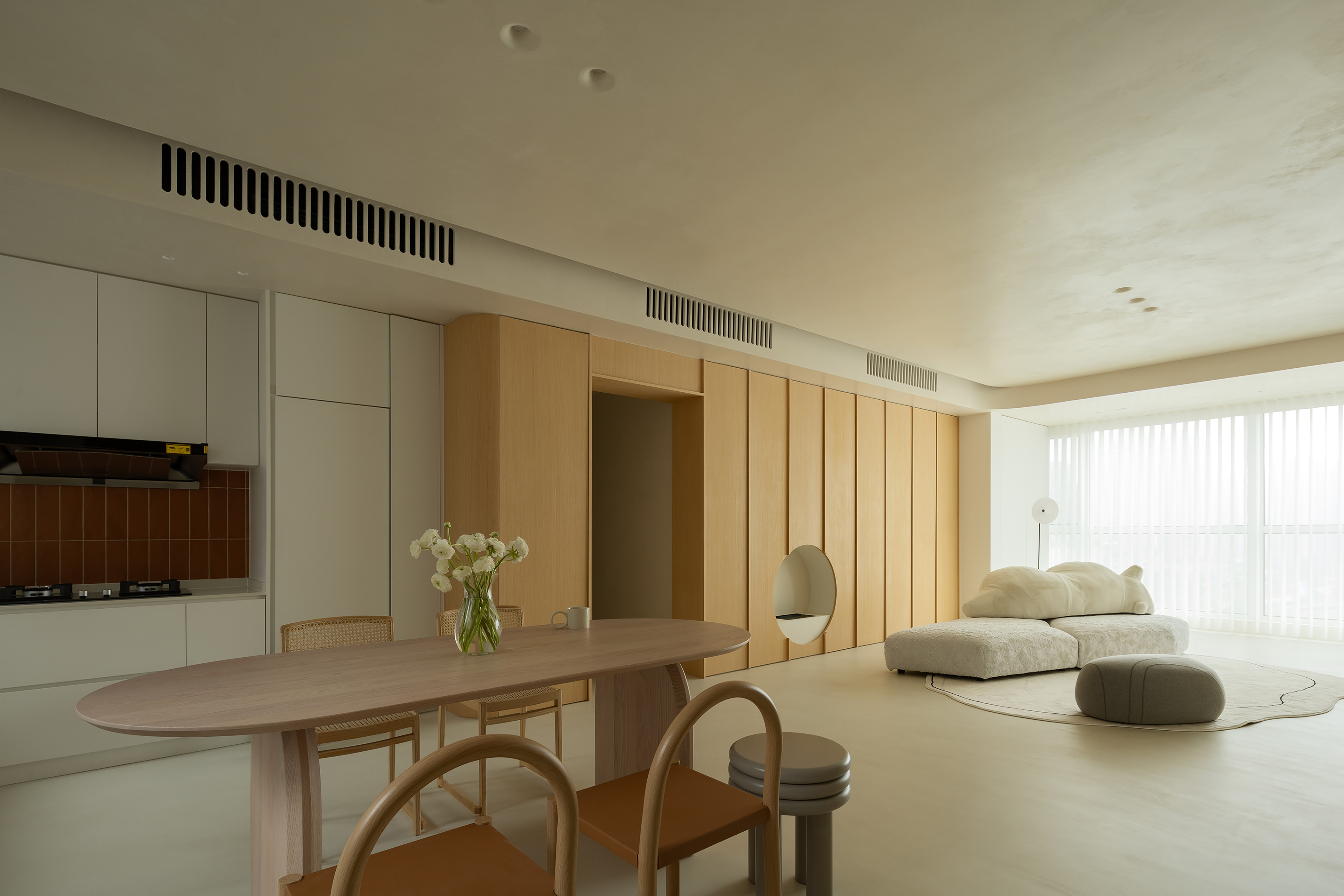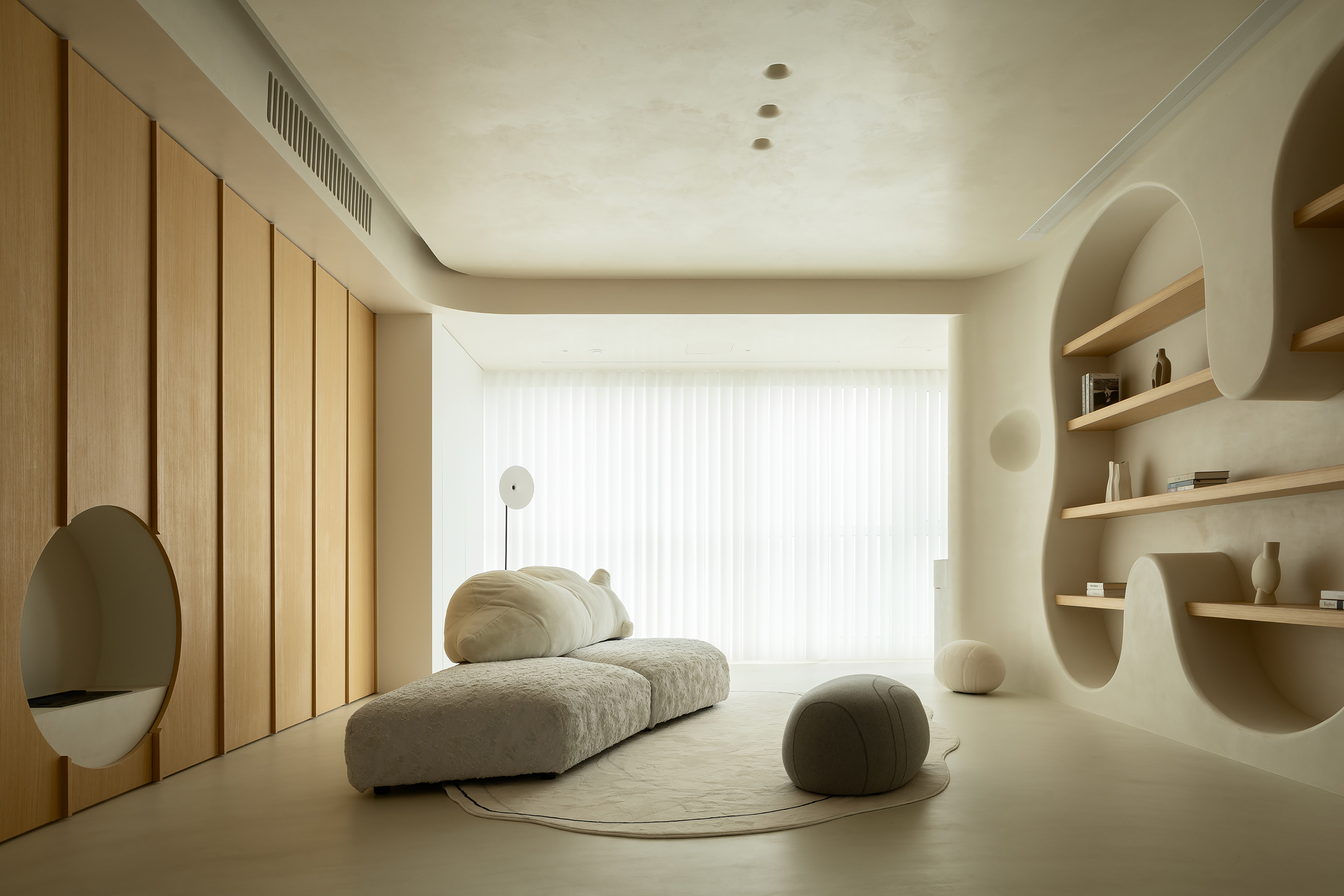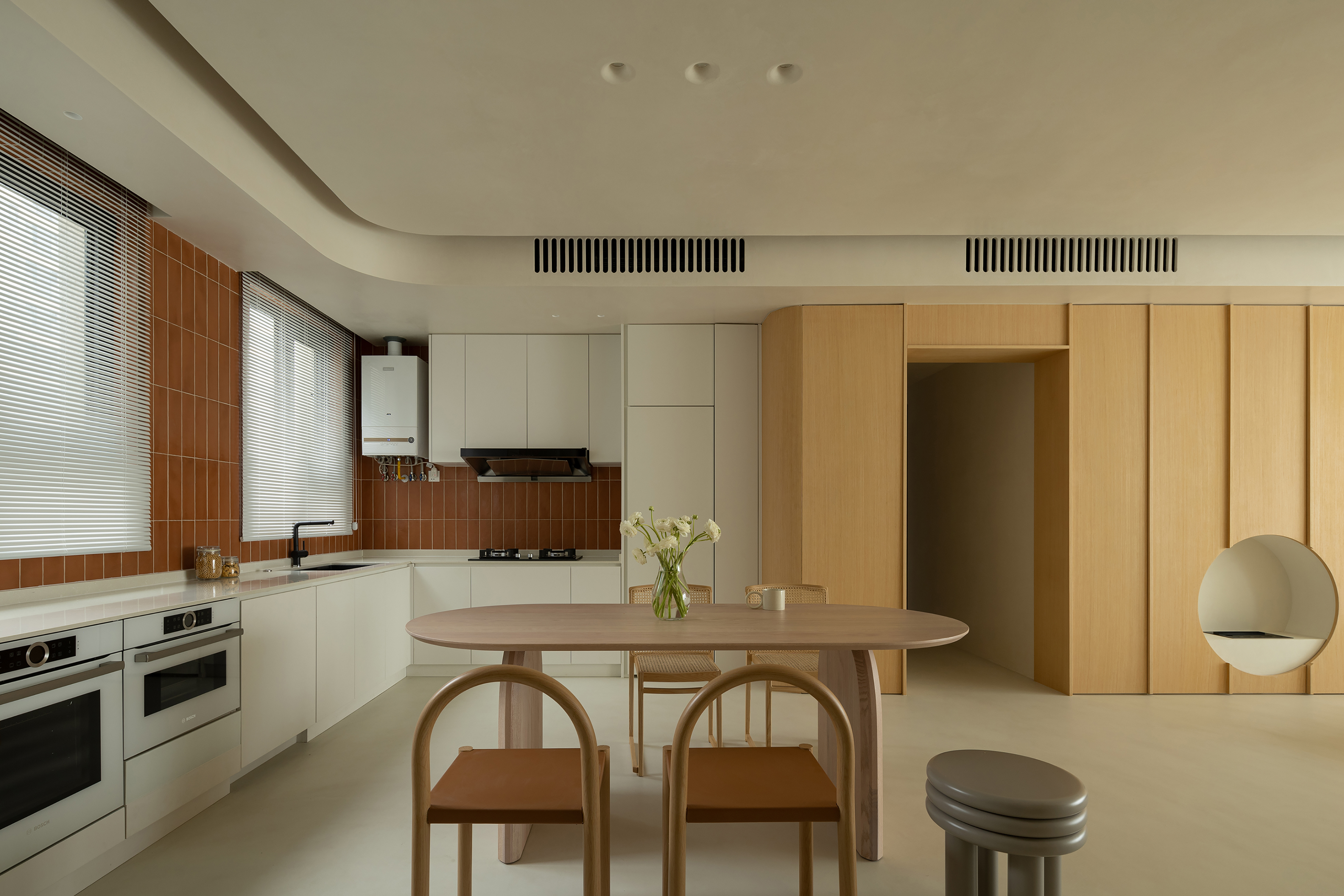 拆除原有阳台移门,将阳台纳入客厅空间。洗衣机、烘干机与清洁工具都收纳于阳台高柜中,吊顶内置隐形晾衣架,让阳台落地窗前的视野更加开阔通透。客厅以沙发为中心形成洄游动线,取消了茶几的摆放,用投影取代电视,这里可以是亲子阅读区,也可以是投影观影区,更是一家人增进情感交流与陪伴的互动空间。柜门内凹圆形壁炉造型,也增加了空间的观赏性。