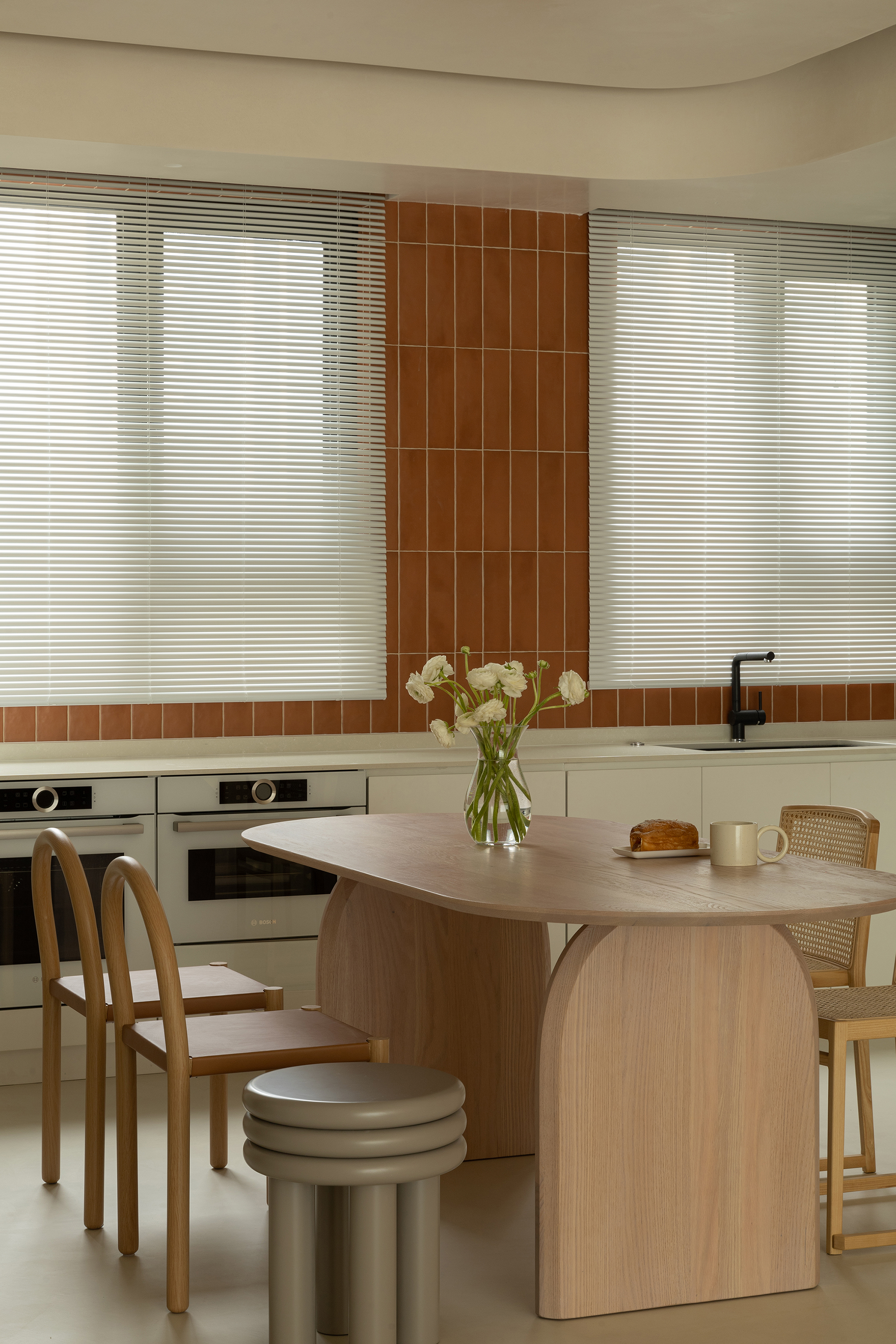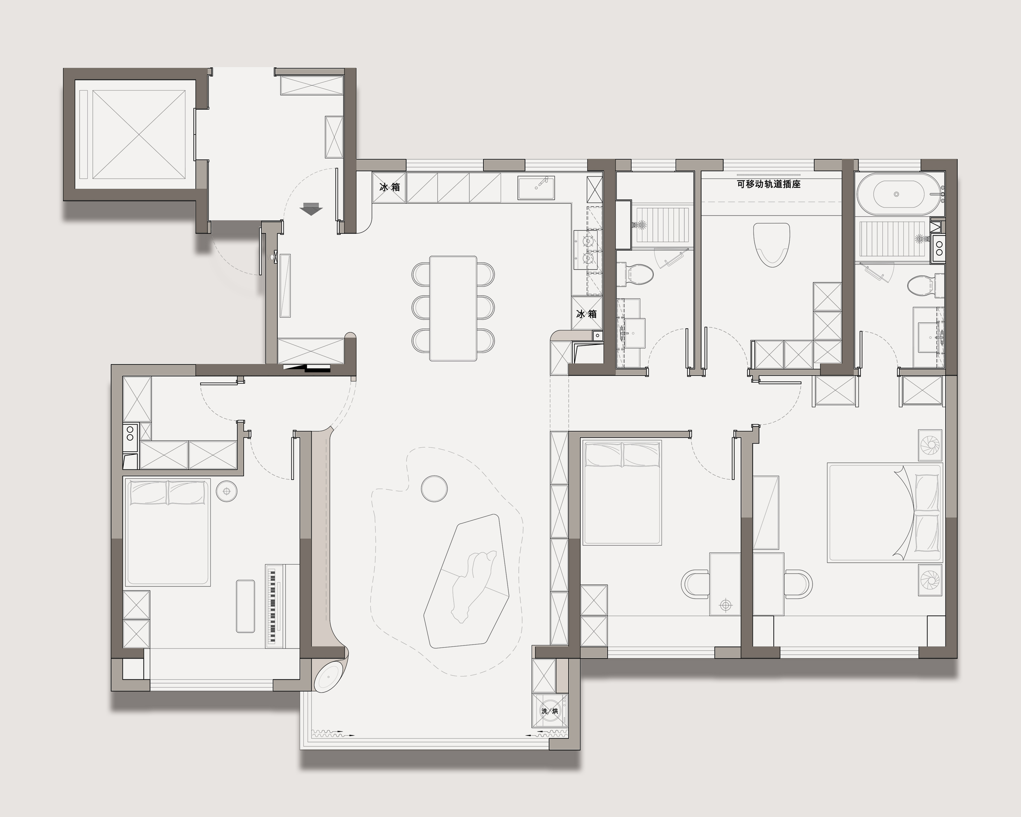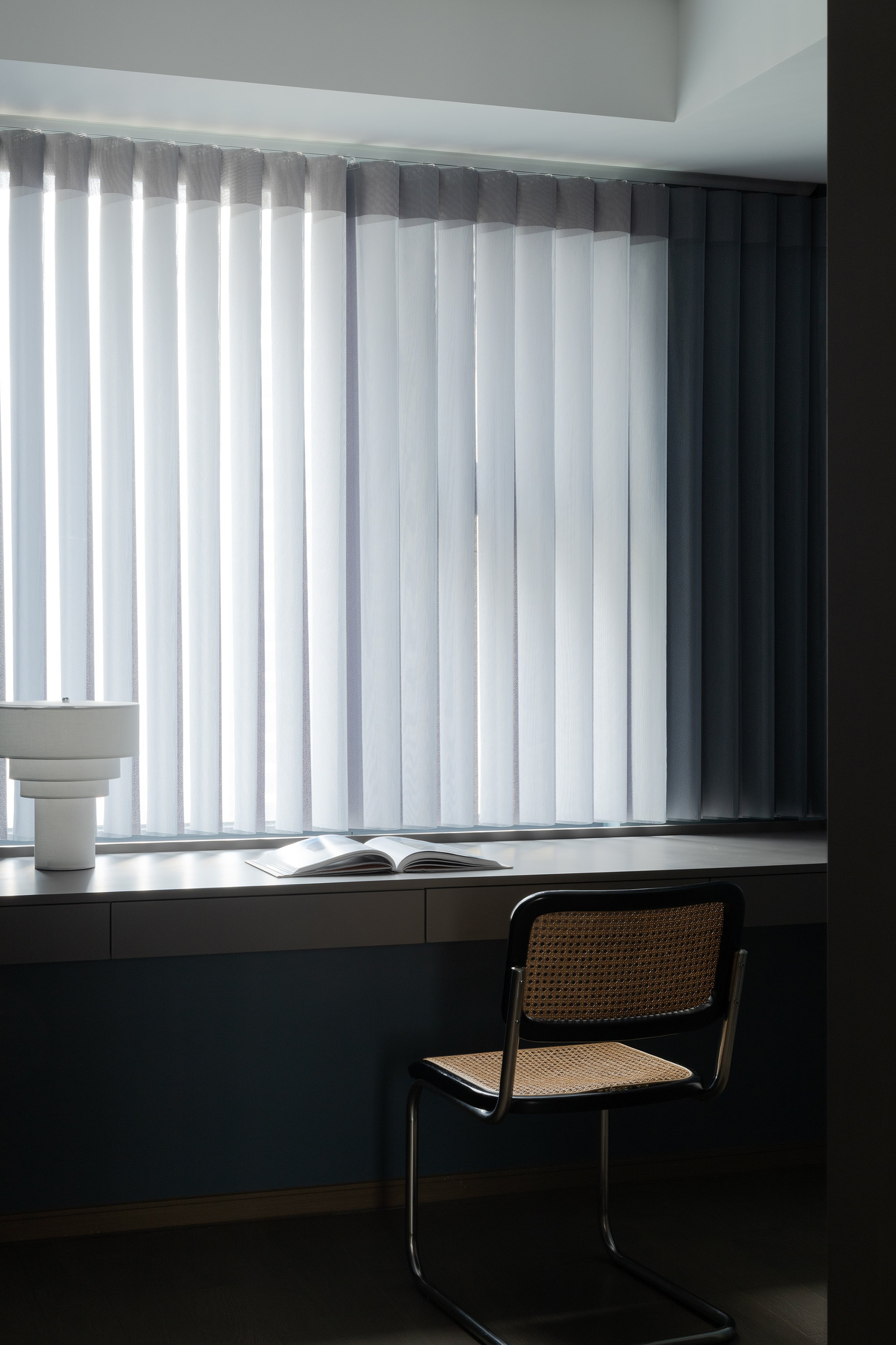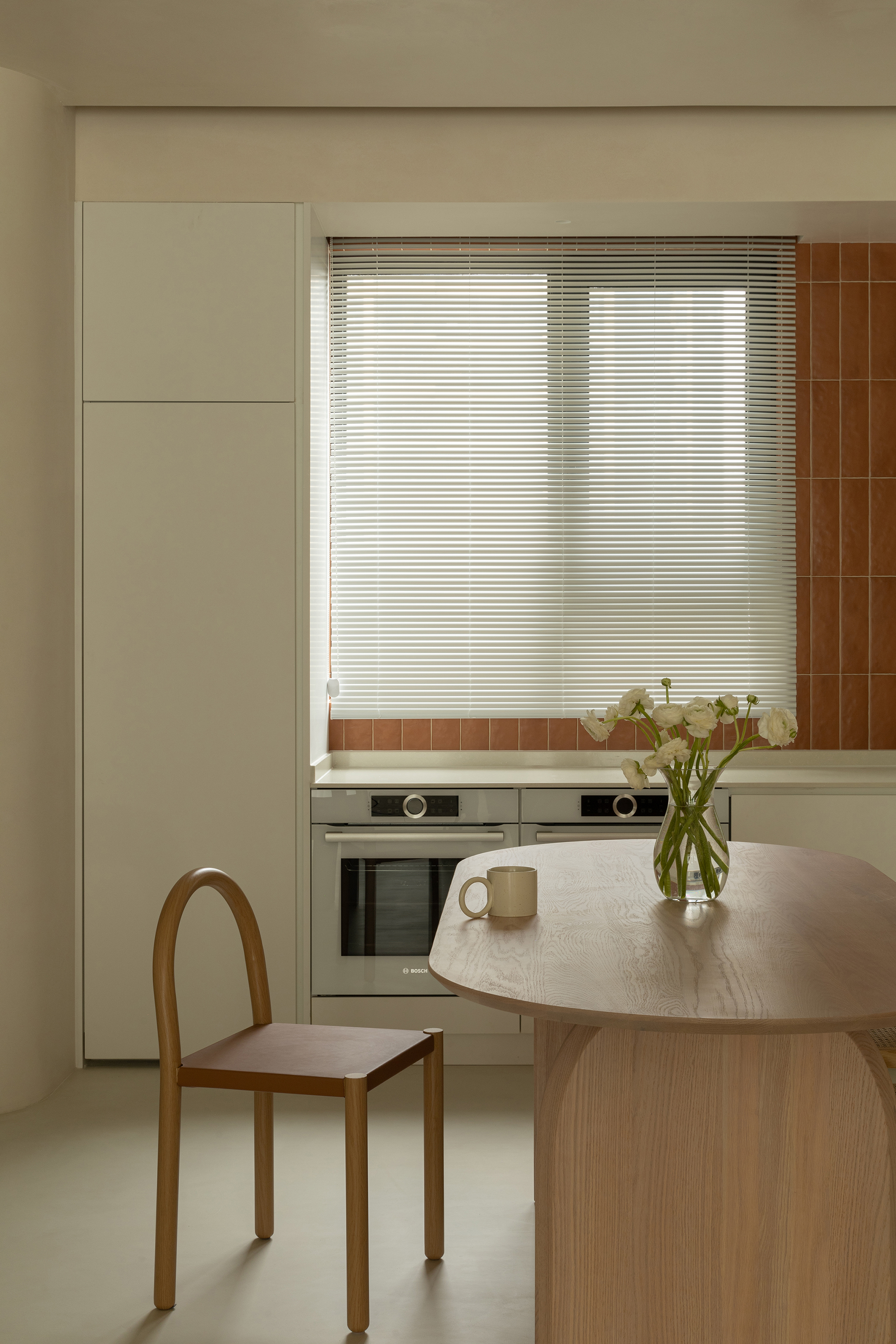拆除原有阳台移门,将阳台纳入客厅空间。洗衣机、烘干机与清洁工具都收纳于阳台高柜中,吊顶内置隐形晾衣架,让阳台落地窗前的视野更加开阔通透。客厅以沙发为中心形成洄游动线,取消了茶几的摆放,用投影取代电视,这里可以是亲子阅读区,也可以是投影观影区,更是一家人增进情感交流与陪伴的互动空间。柜门内凹圆形壁炉造型,也增加了空间的观赏性。
