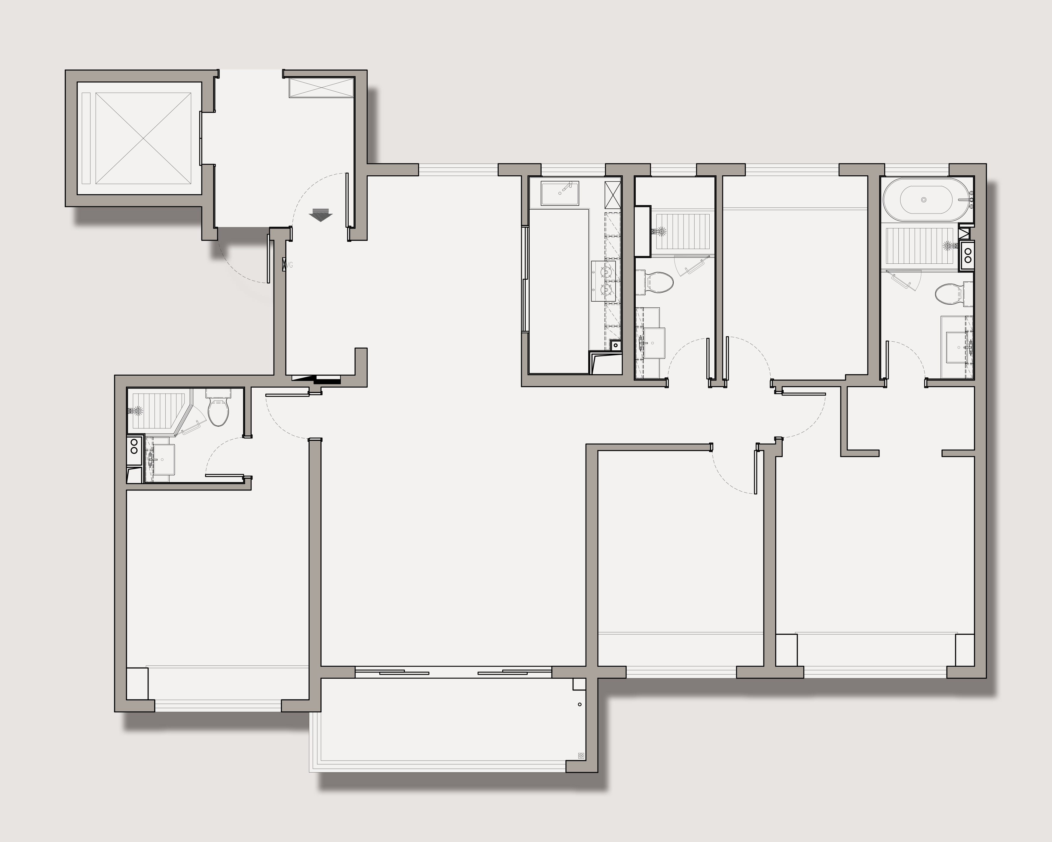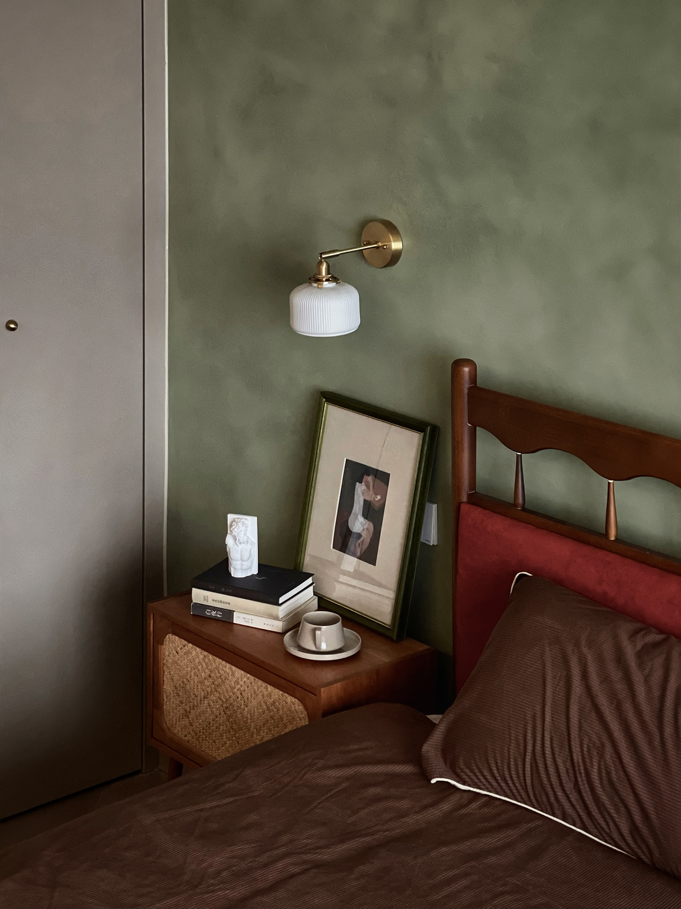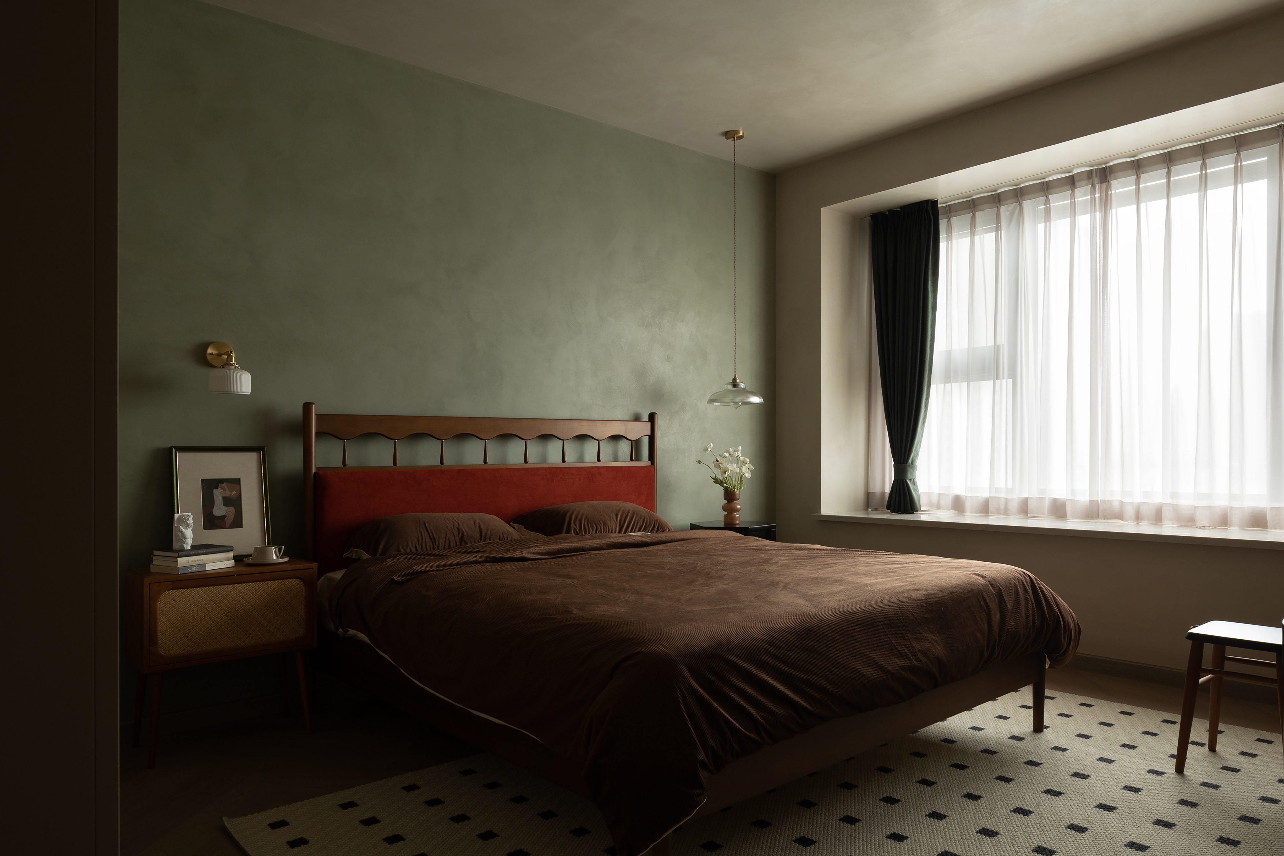 拆除原有精装交付预留的衣帽间隔墙,靠主卫一侧墙面定制柜体,让进入房间的动线更加顺畅。同时改造原有顶面复杂的石膏造型,无需过多的修饰,艺术涂料墙顶通刷,营造出安静细腻的温馨感。
