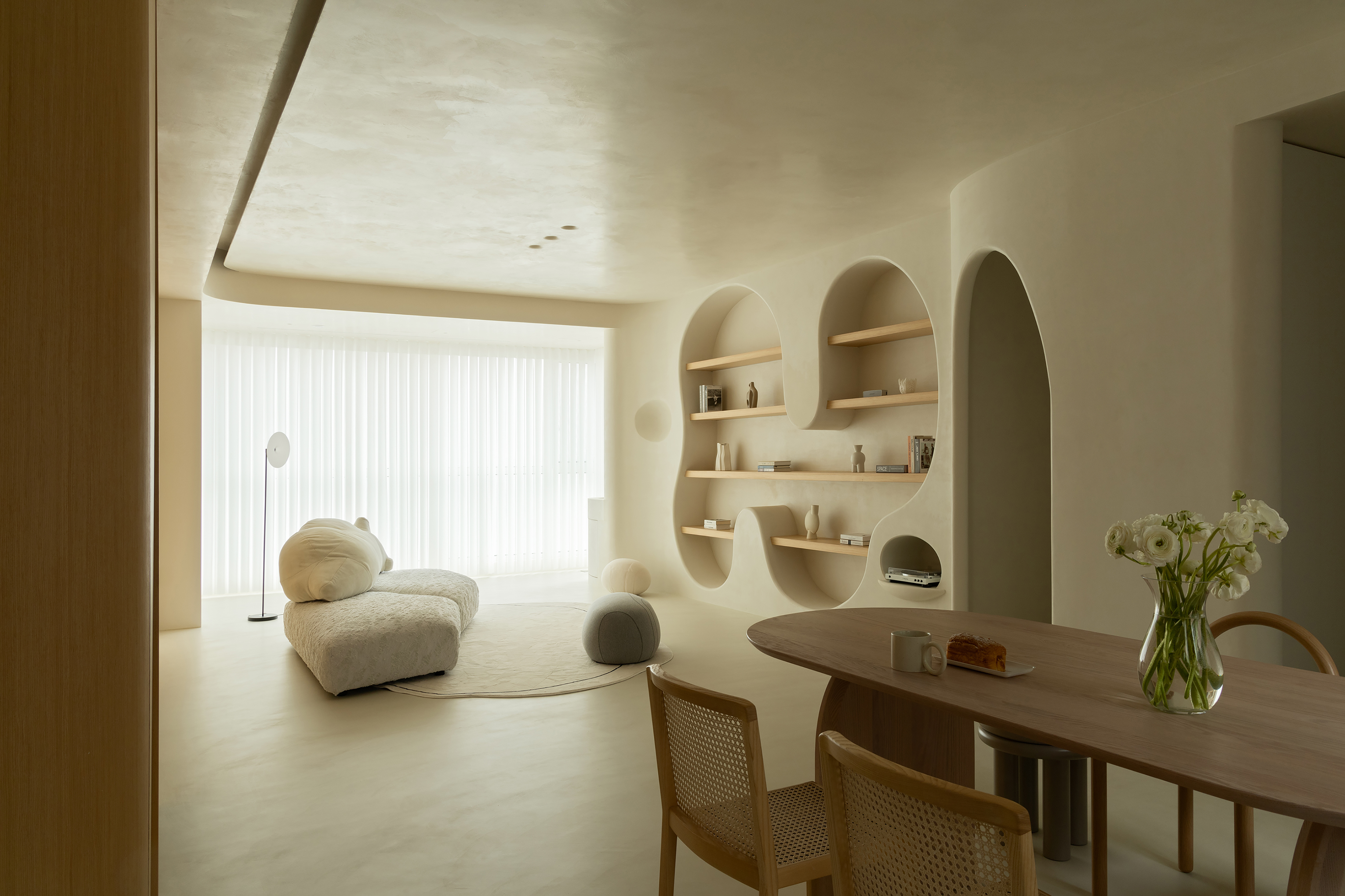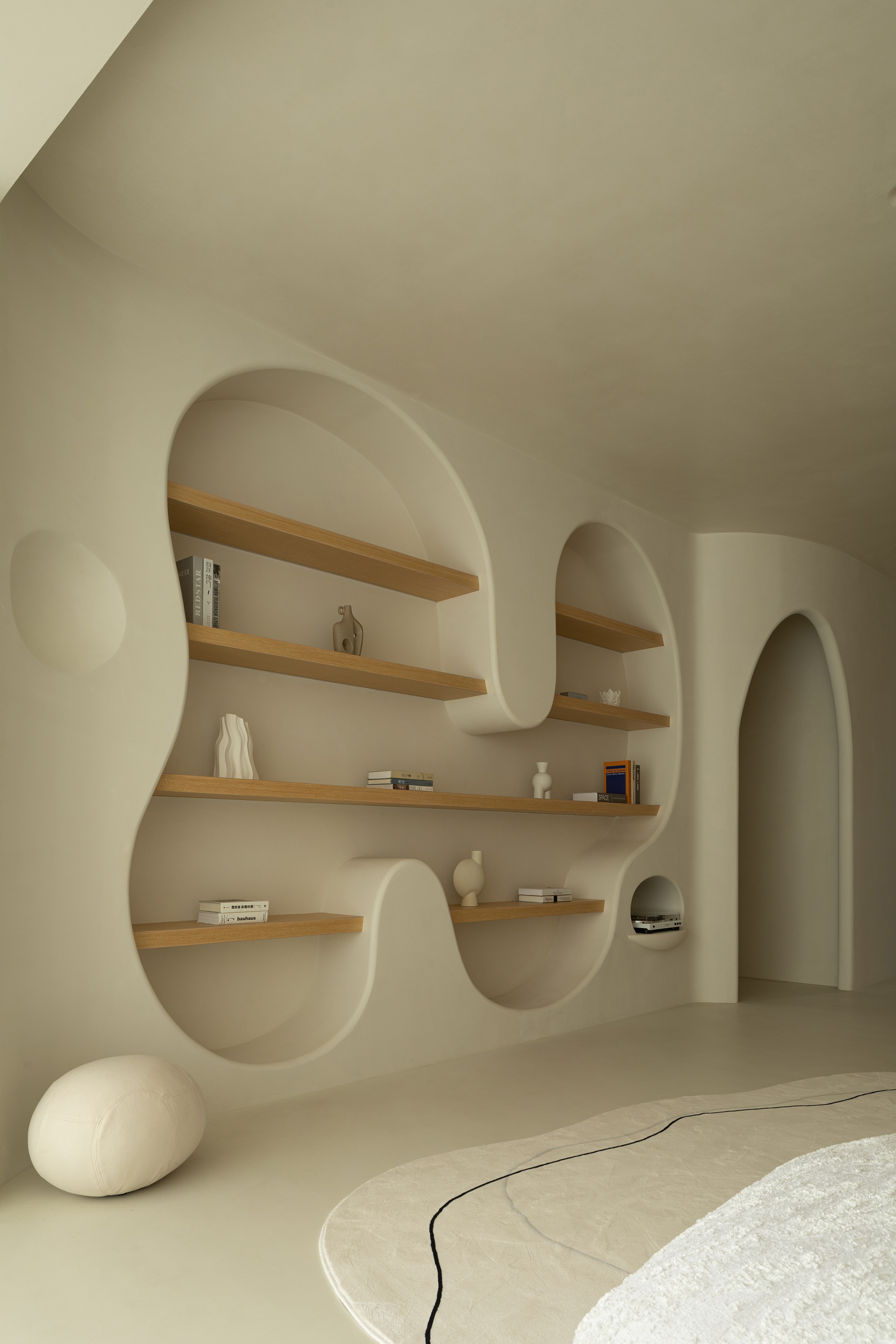 空间意境:现场制作的异形书架自带满满的艺术感,让它成为客厅的一大亮点。
