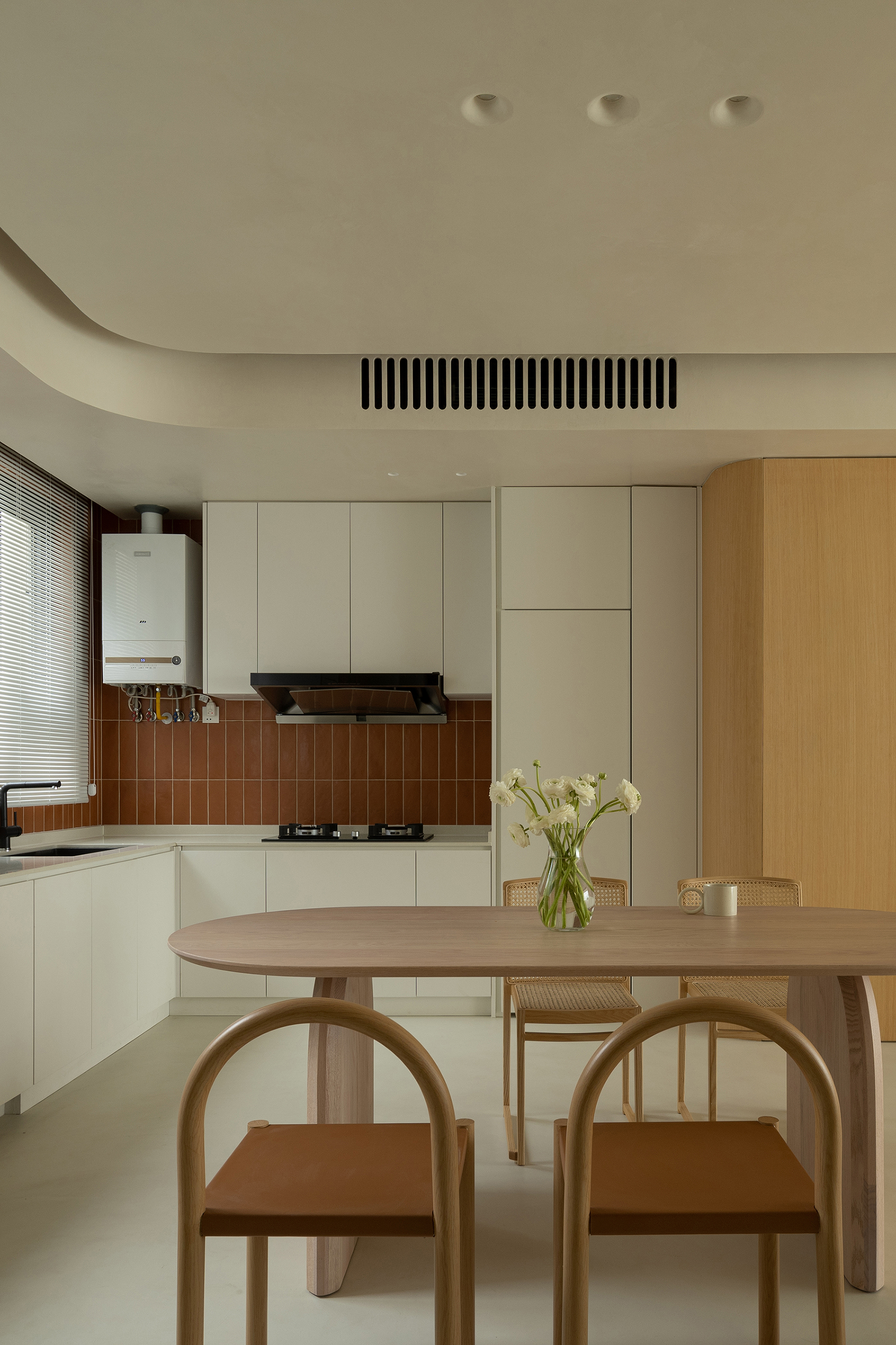 对面墙面满墙定制造型柜体,满足业主大量书籍的收藏需求。靠餐厅一侧弧形的设计,削弱了柜体自身的厚重感,同时也弱化了客餐厅的空间过渡。