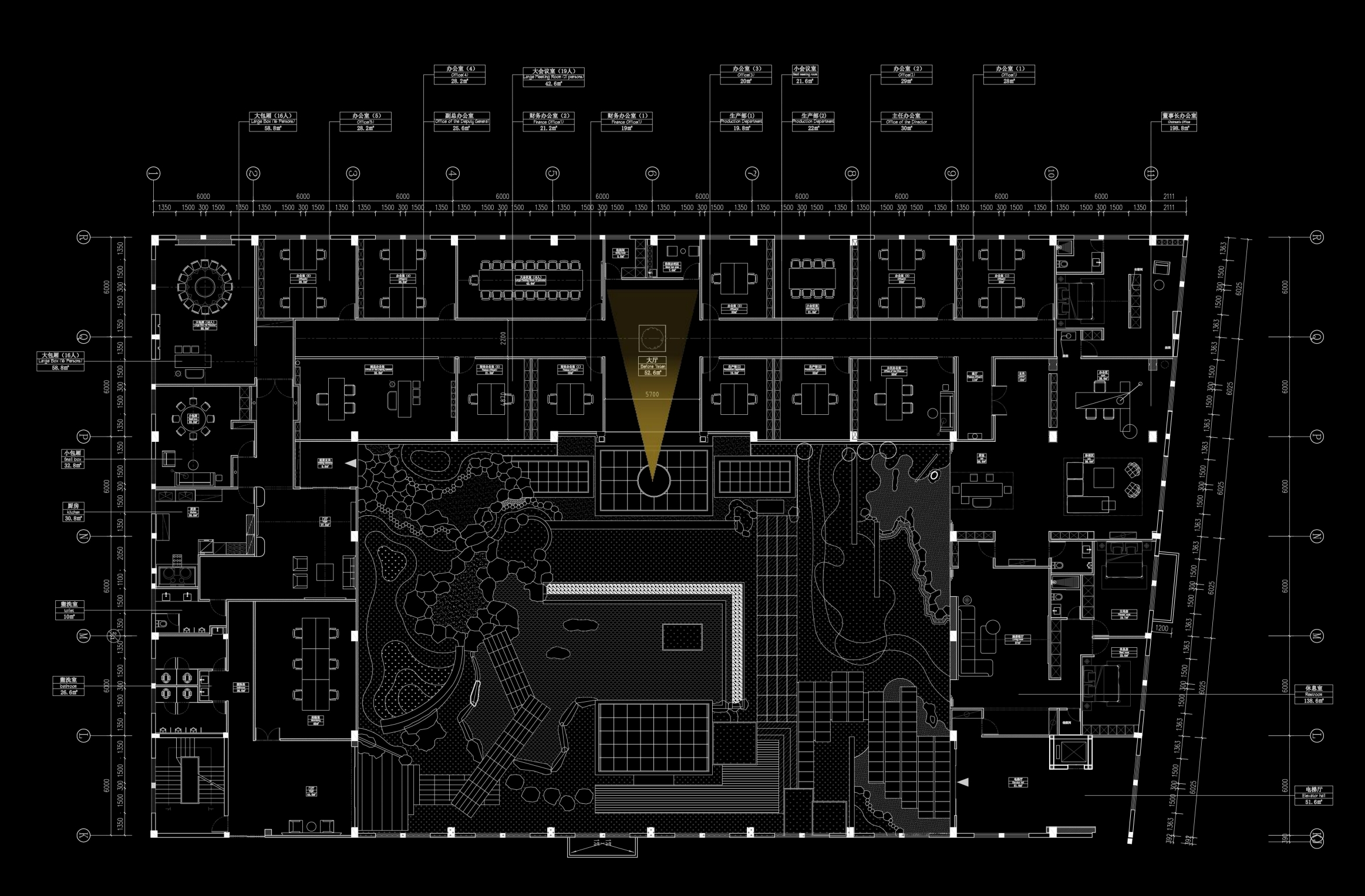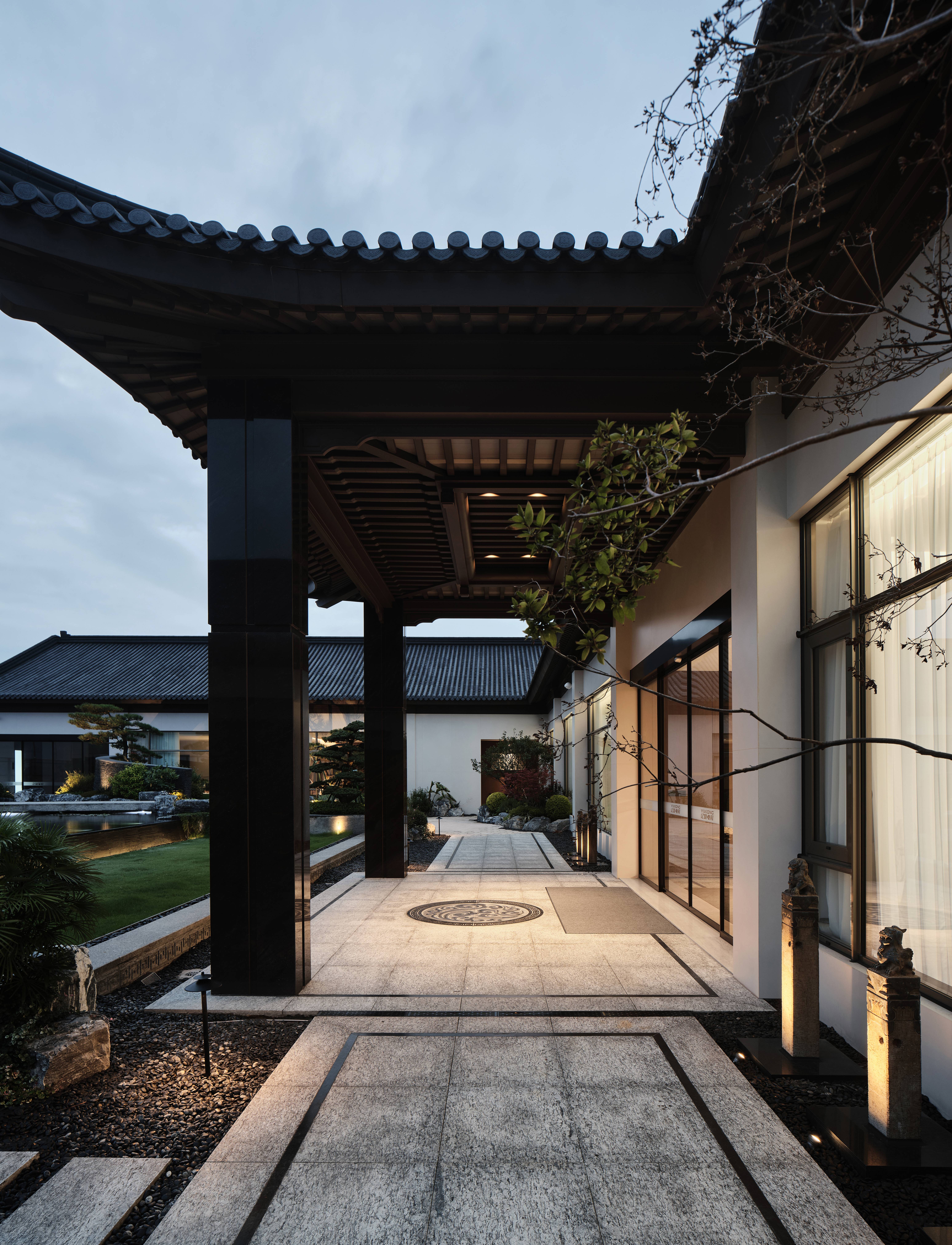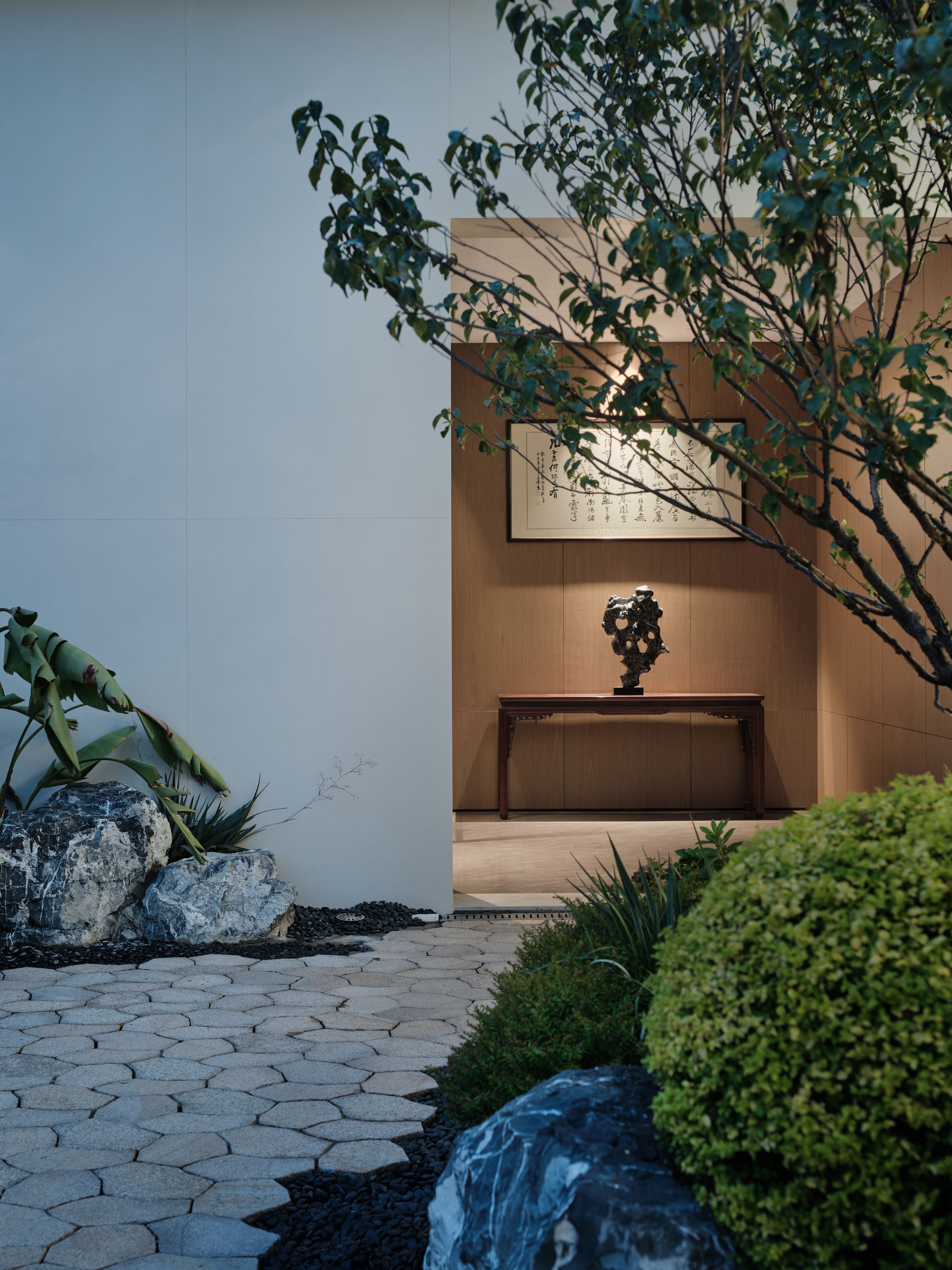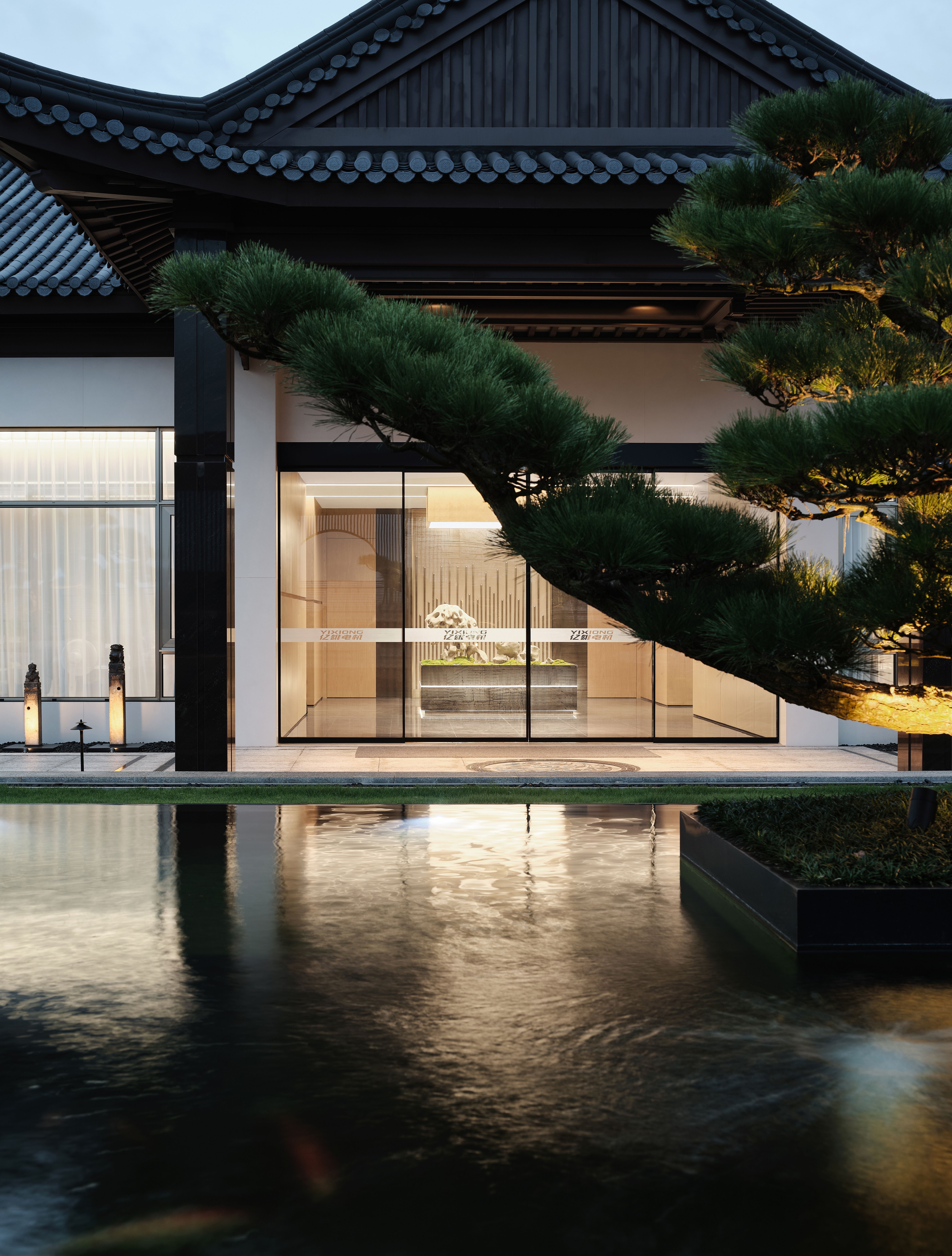 草木有情,流水有意。在进入公司顶层之前,描绘出一幅美妙的中式园林画,将人带回旧时光景。流水也蕴含着【财】意,入口的水系庭院,潋滟婆娑,照映琉璃砖瓦和苍松绿枝。聚集投射于此的目光,在晨昏明暗中倾诉源远流长的古韵。